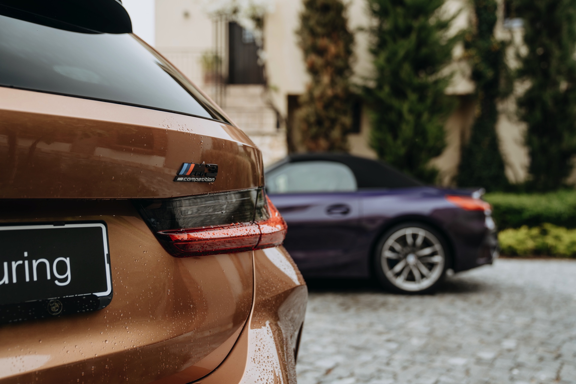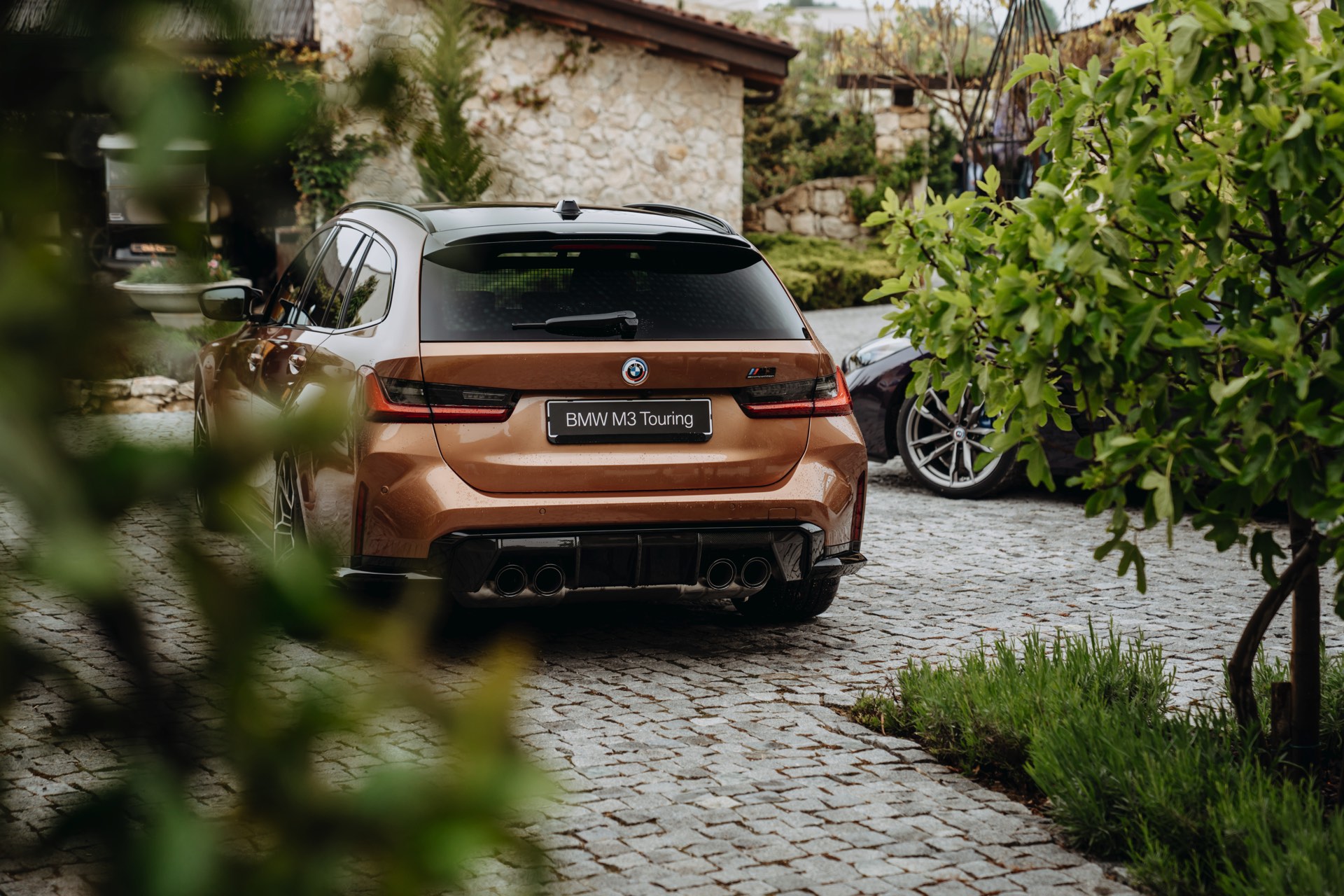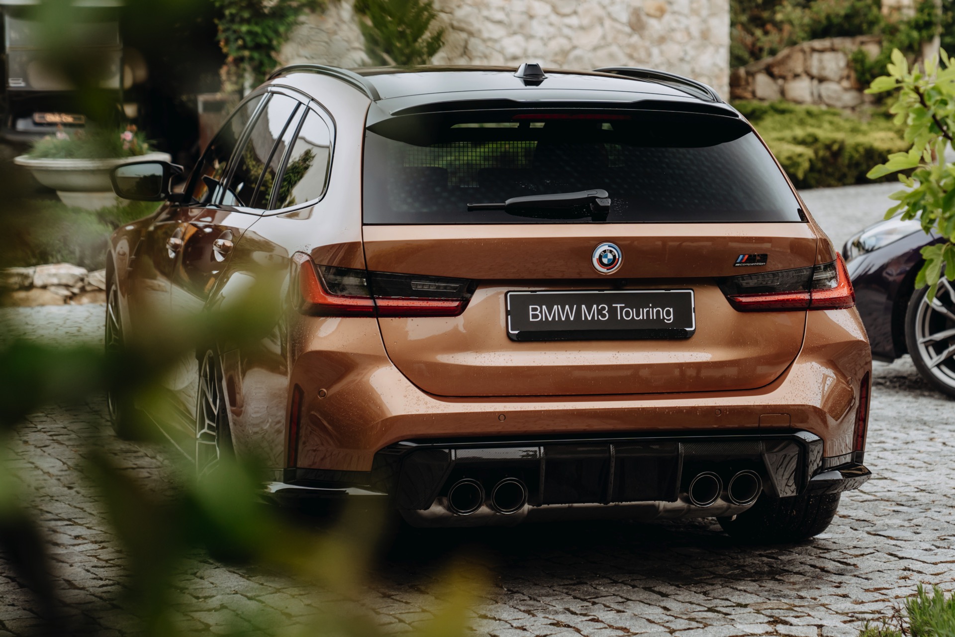 Während der Roadster schon häufiger mit der vor allem vom 2er Coupé bekannten Farbe zu sehen war, besitzen die Aufnahmen des BMW M3 Touring in Zanzibar echten Neuigkeits-Wert. Für dunkle Akzente sorgen das serienmäßig in Hochglanz-Schwarz lackierte Dach, die Carbon-Außenspiegel, die am unteren Rand des Fahrzeugs umlaufenden Elemente in Schwarz, die Sonnenschutzverglasung ab der B-Säule und die tiefergelegenen Flächen der vorne 19 und hinten 20 Zoll großen Schmiederäder Doppelspeiche 825 M Bicolor. Hinter den Felgen lassen sich die großen Bremsscheiben und die blauen Sättel der Bremsanlage erahnen. "