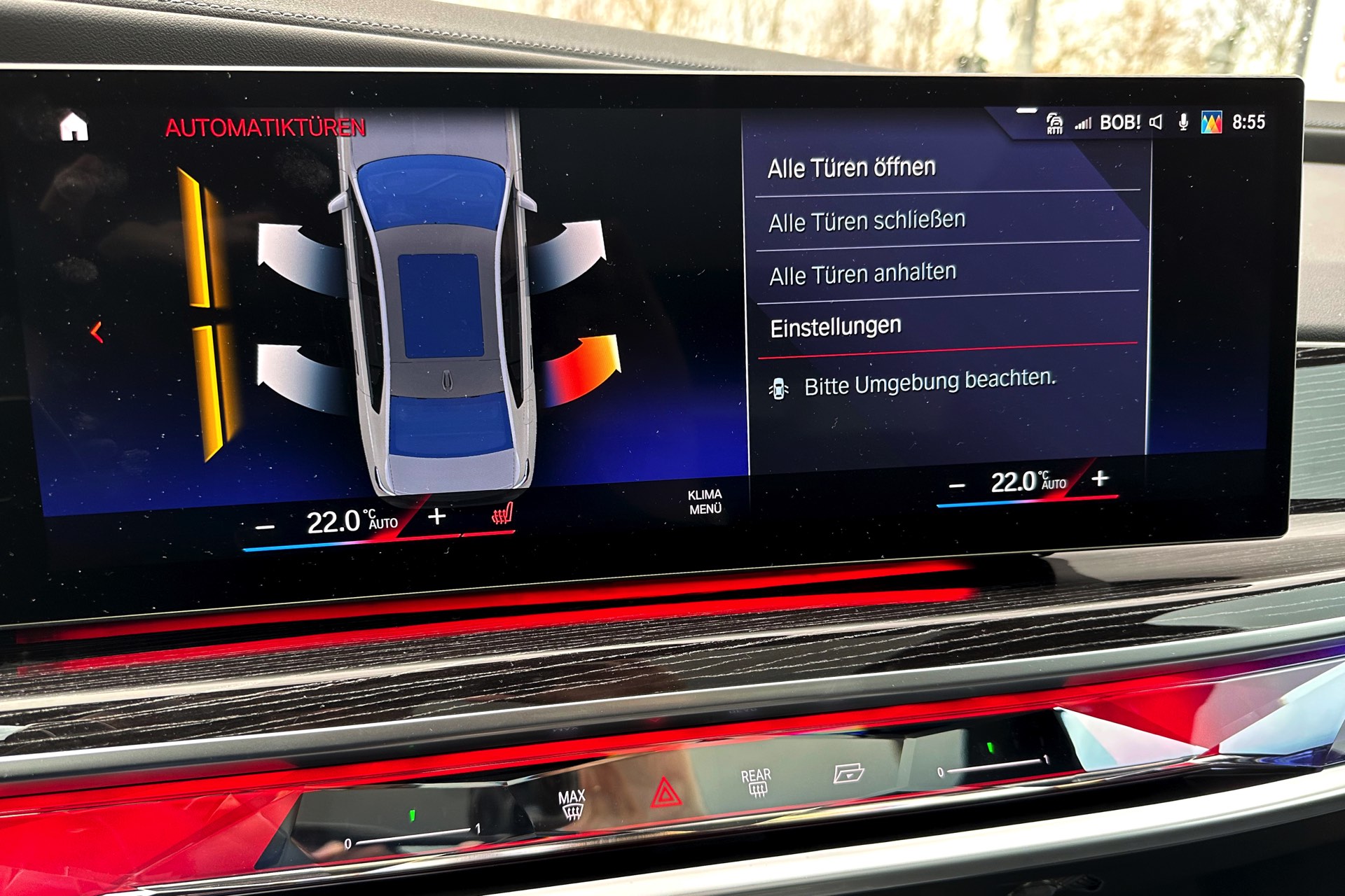 Weiter geht die Zukunfts-Show beim Einsteigen: Über den iDrive-Controller lässt sich bequem konfigurieren, welche Türen beim Druck auf den Schlüssel elektrisch öffnen sollen. Wer seinen 7er-Schlüssel also einmal passend eingestellt hat, kann von nun an immer wieder für staunende Blicke sorgen, wenn sich beispielsweise die Fond-Tür der Beifahrerseite wie von Zauberhand im richtigen Moment öffnet. Gleich danach dürfte das dort vorhandene Raumangebot für erneutes Staunen sorgen, denn im Fond der Luxuslimousine ist Platz wahrlich keine Mangelware. Kein Wunder, schließlich überragt der aktuelle 7er selbst die Langversion des Vorgängers um volle 13 Zentimeter.