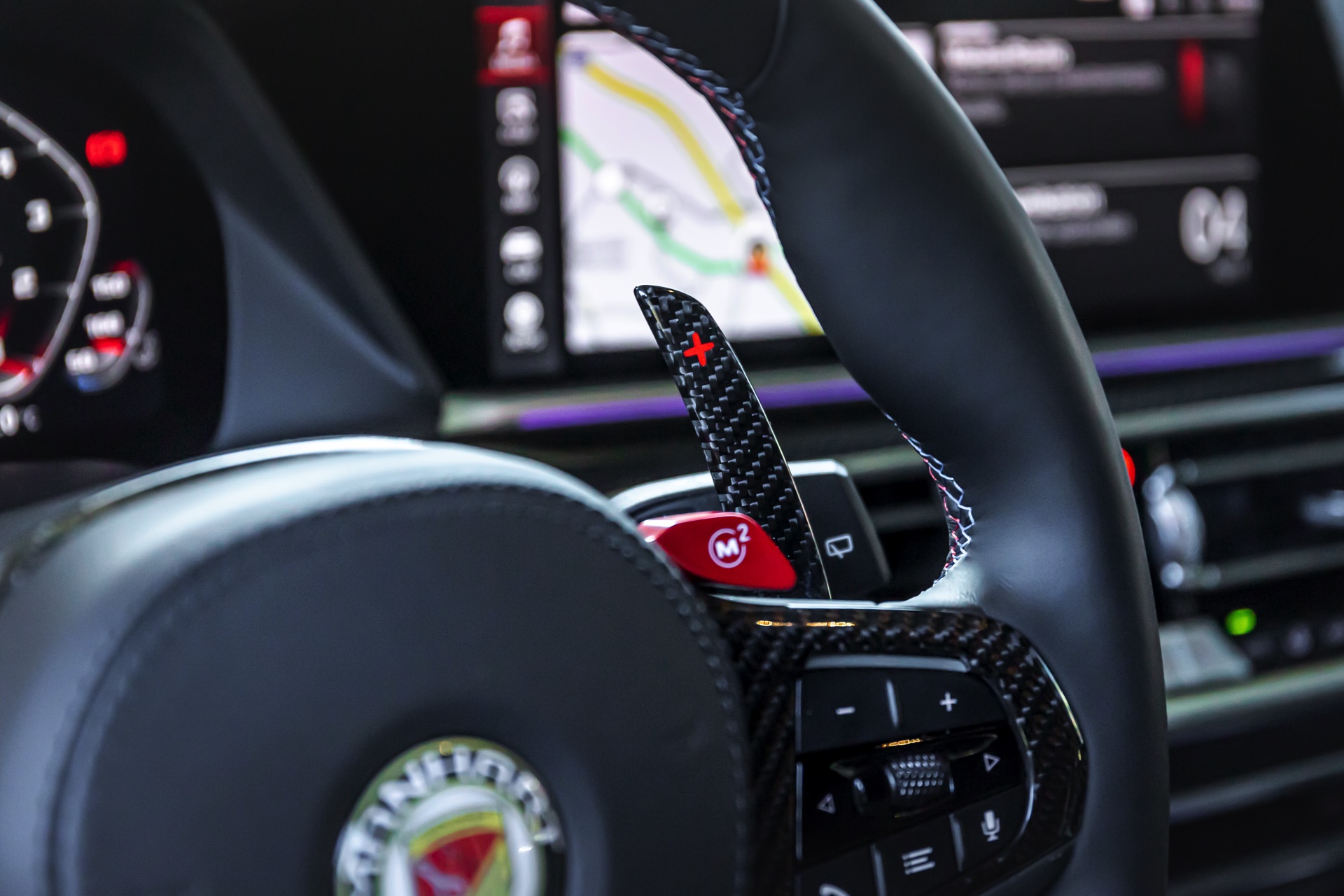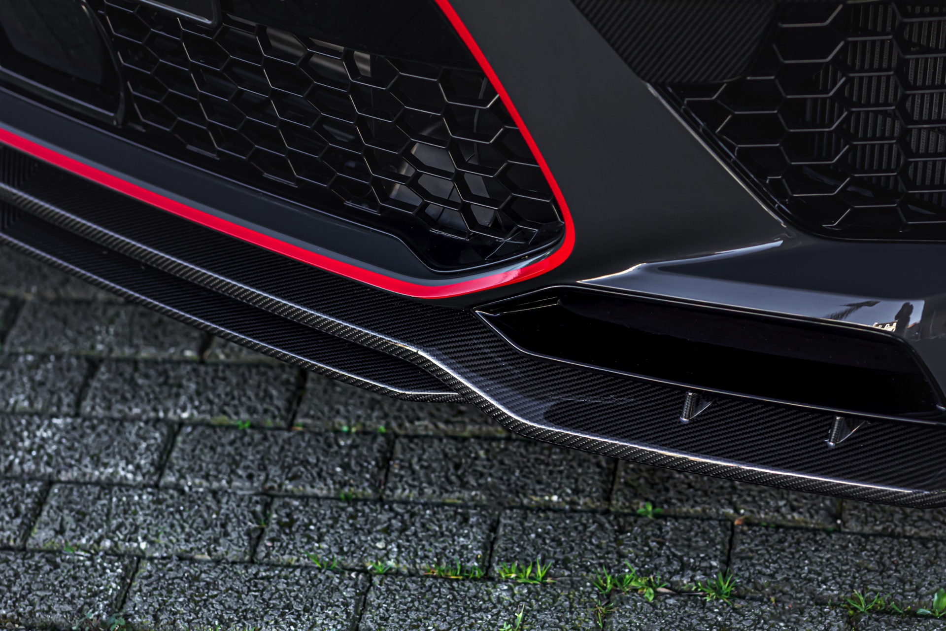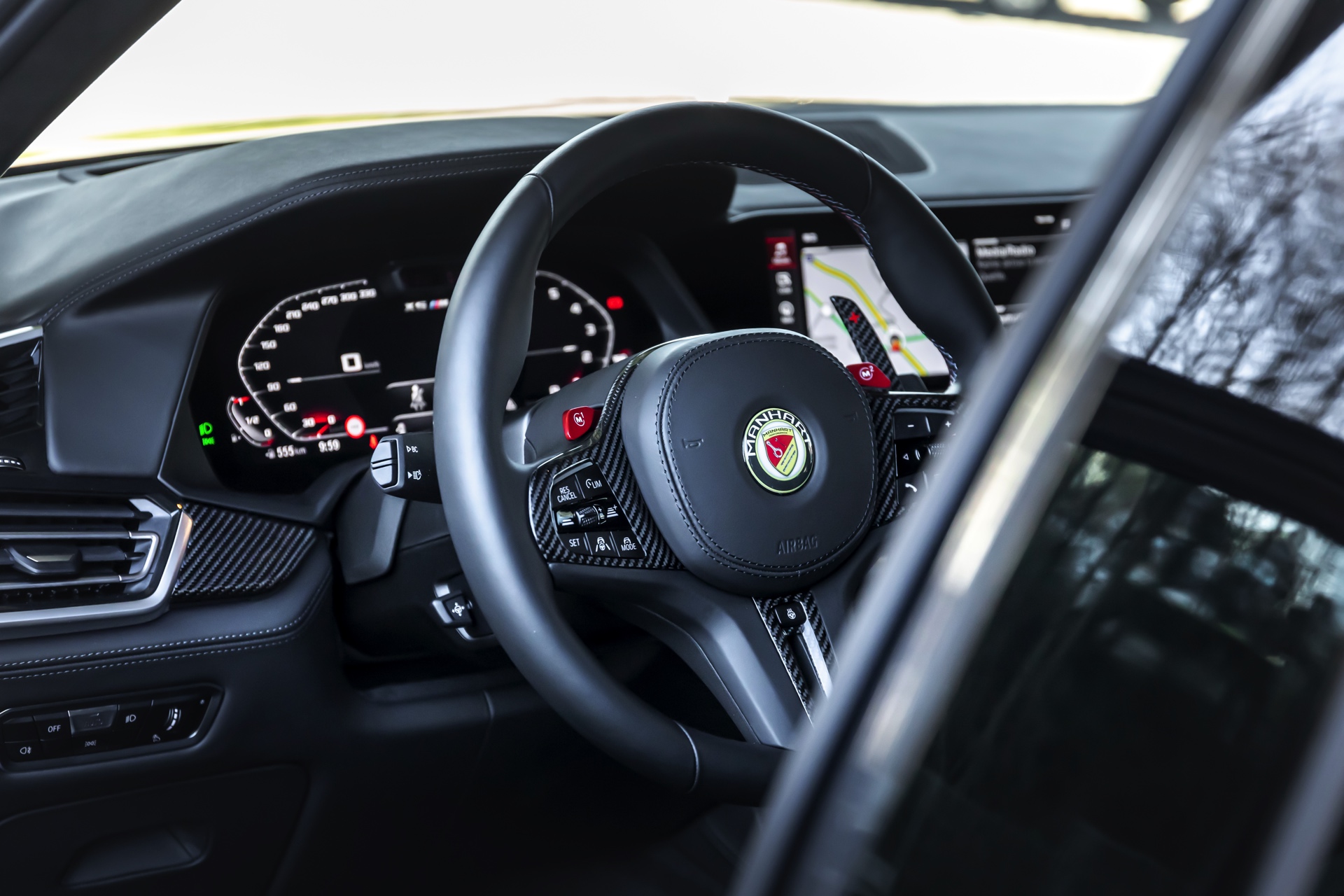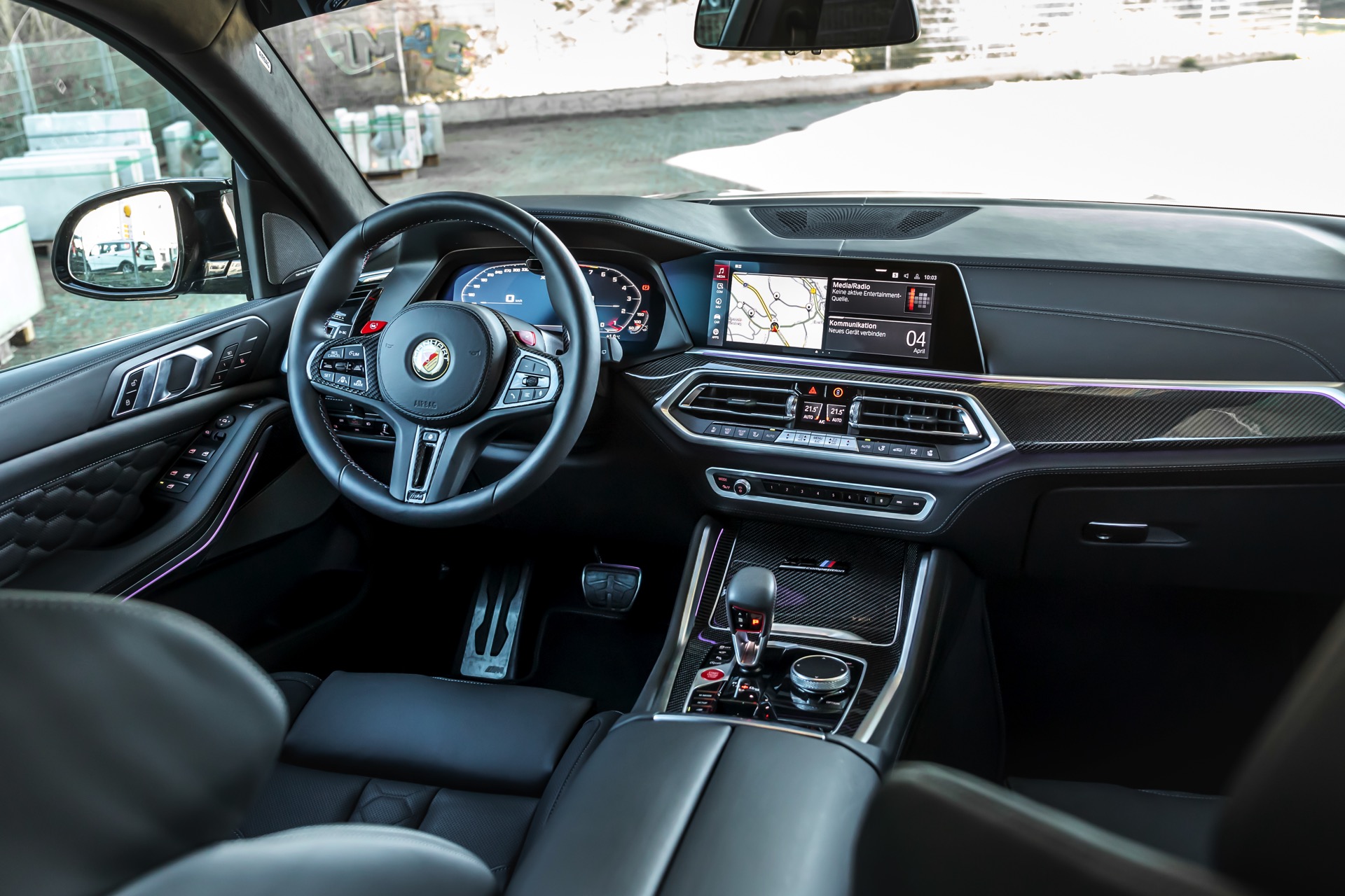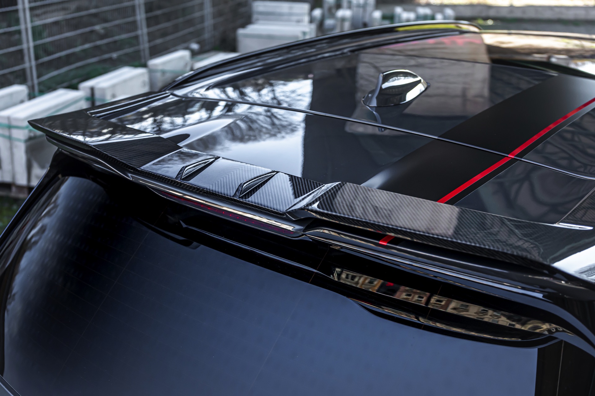 In den Radhäusern des Power-SUV sehen wir 23 Zoll große Y-Speichen-Felgen aus der Manhart Classic Line, auf ihnen kommen rundum 315 Millimeter breite Reifen zum Einsatz. Federbeine von KW erlauben eine dezente Tieferlegung und lassen die Felgen noch besser zur Geltung kommen. Das übrige Exterieur erhält nicht nur rote Akzente, sondern auch Frontsplitter-Aufsatz, Lufteinlass-Blenden, Nieren-Einfassungen, Seitenschweller-Aufsätze, Dachkanten-Spoiler und Diffusor-Einsatz aus Carbon.