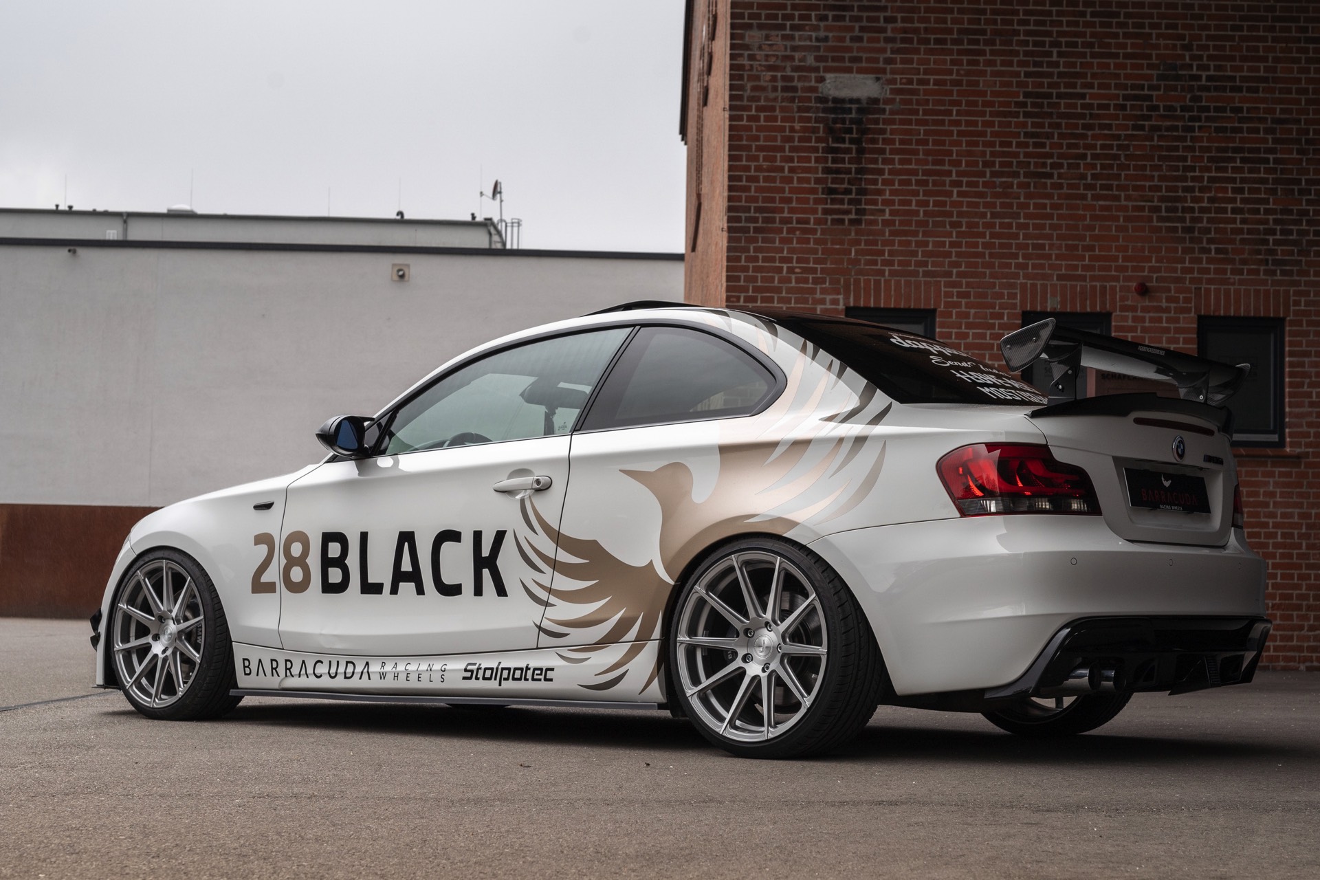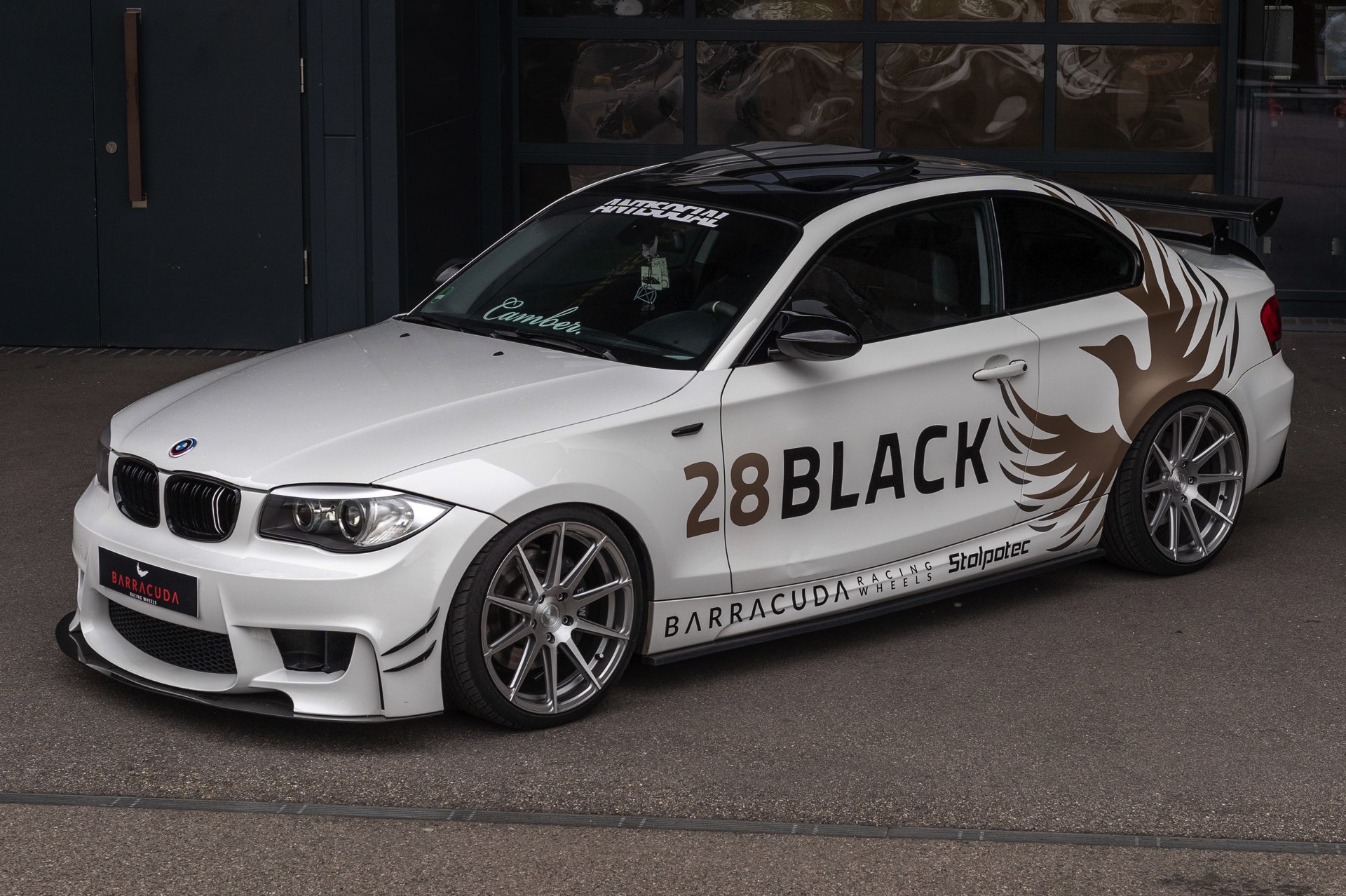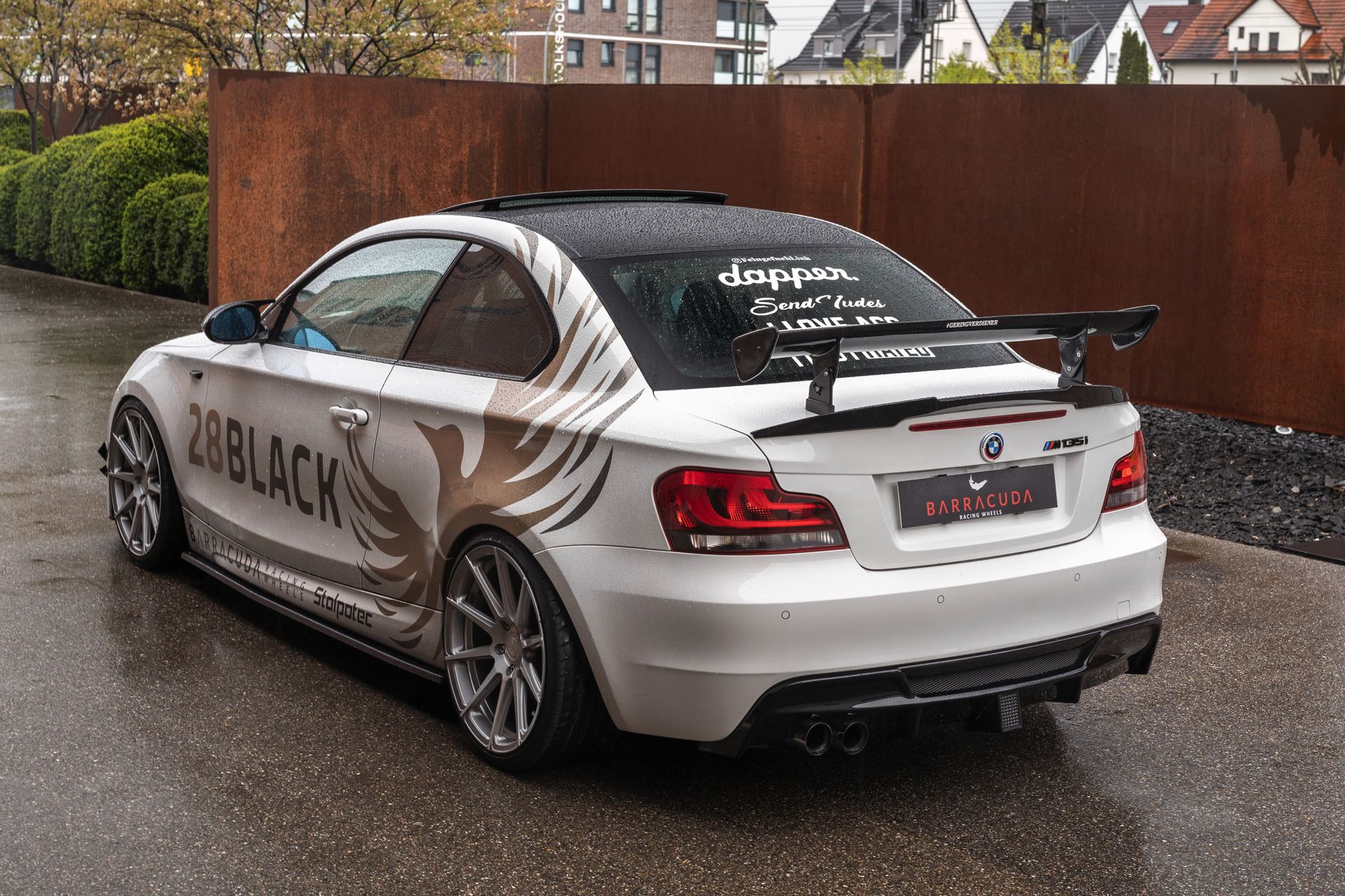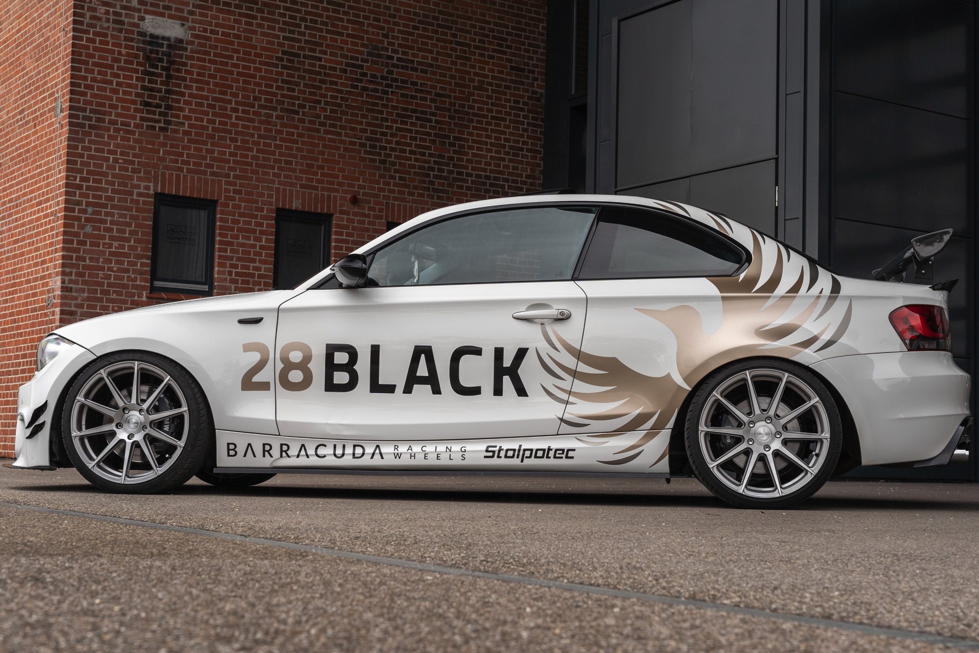 In der Seitenansicht ziehen neben dem Heckfügel vor allem die 19 Zoll großen Project 2.0-Felgen aus der Ultralight-Series von Barracuda Racing Wheels Blicke auf sich. Die im 10-Speichen-Design gestalteten Räder werden im Flow Forged-Verfahren hergestellt und haben anschließend ein Finish in Brushed Silver erhalten. Dank Eibach-Federn ist das 1er Coupé vorne 35 und hinten 30 Millimeter tiefer, weshalb die Radhäuser noch satter ausgefüllt werden. Komplettiert wird der Tuning-Look von einer Folierung im Stil des Energy Drinks 28 Black.