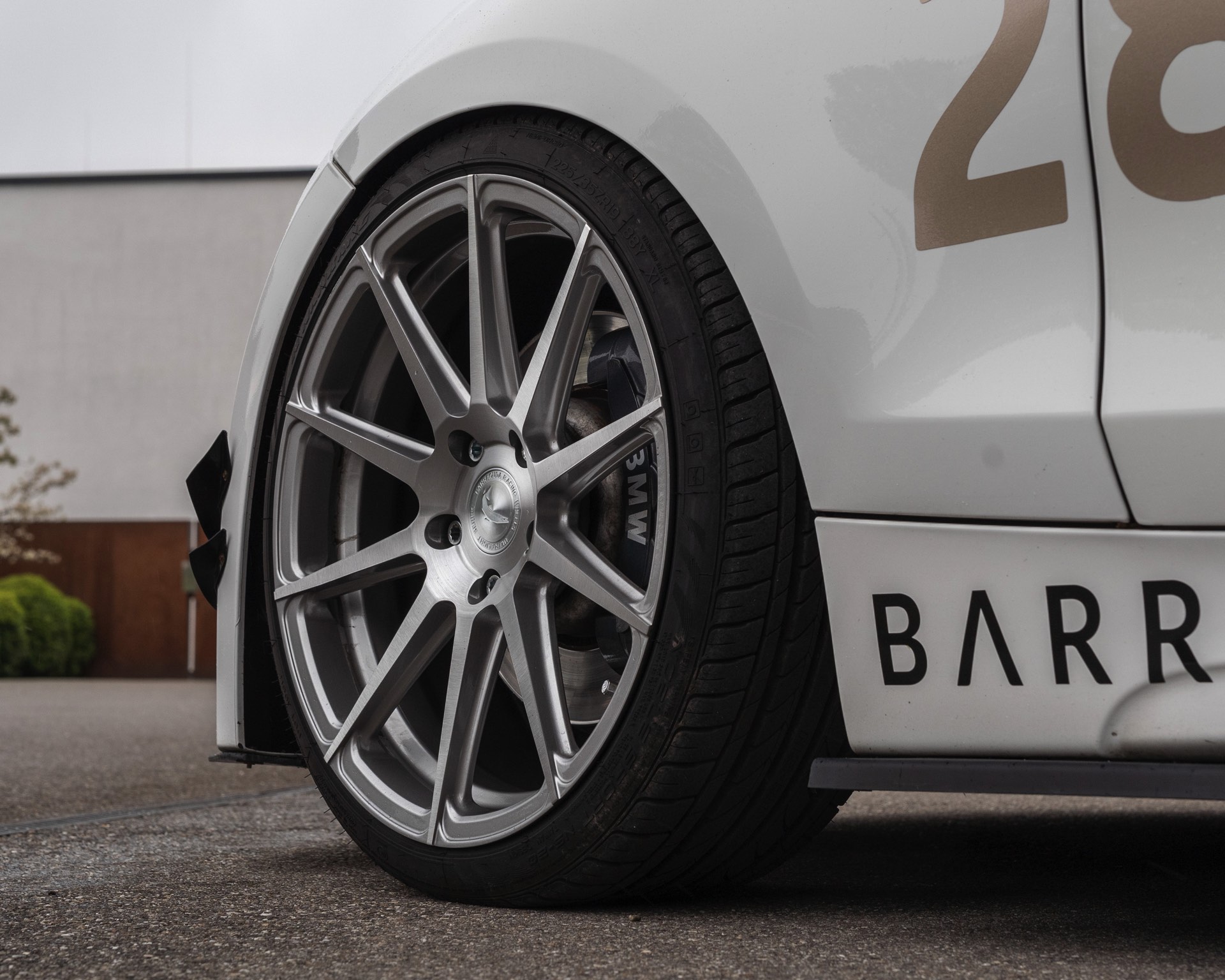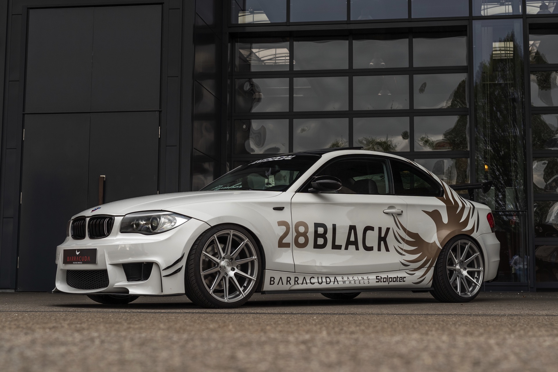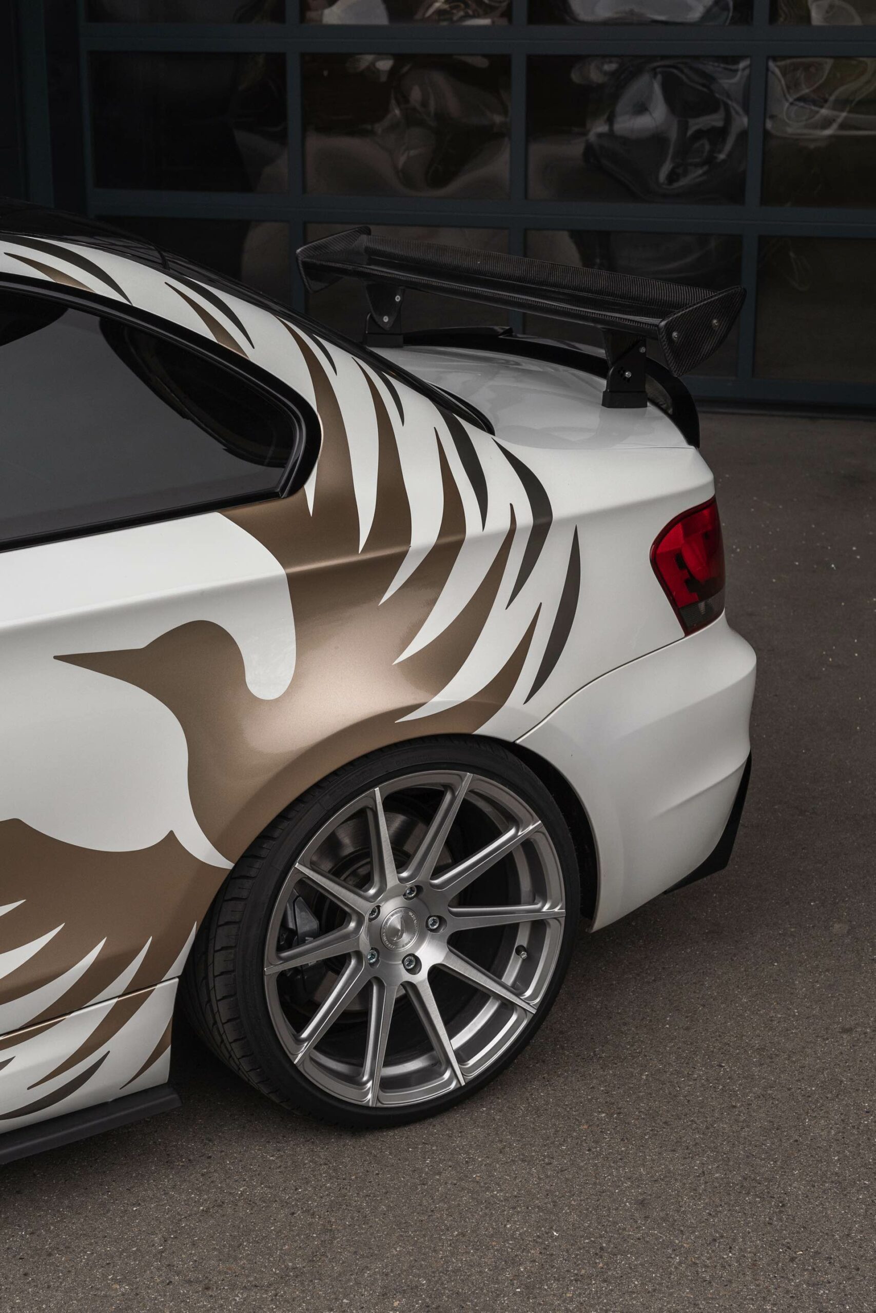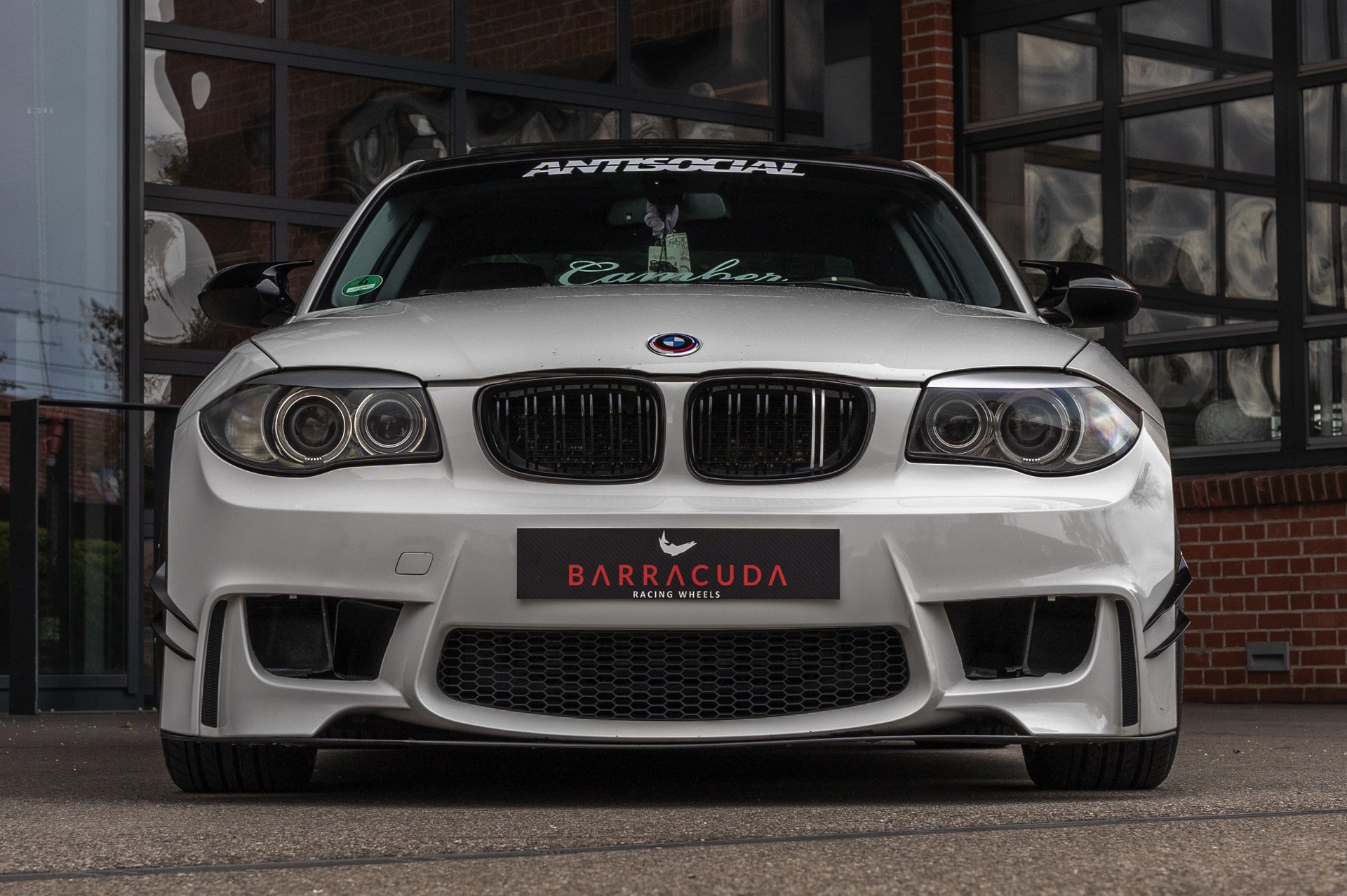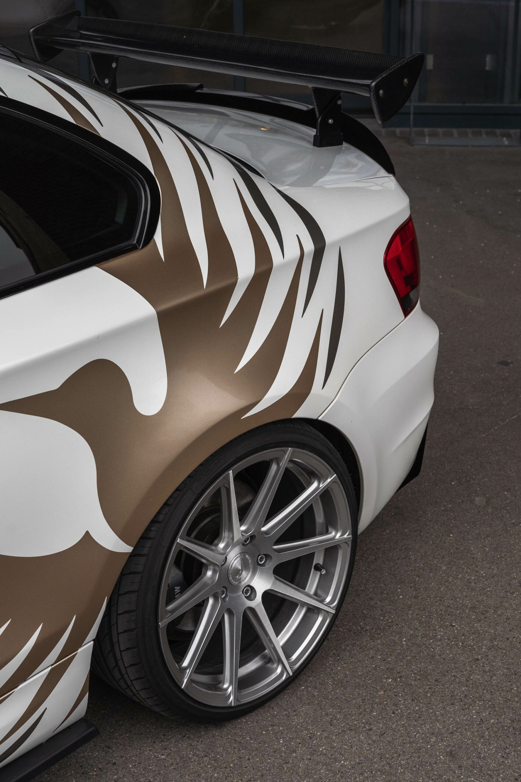 In der Seitenansicht ziehen neben dem Heckfügel vor allem die 19 Zoll großen Project 2.0-Felgen aus der Ultralight-Series von Barracuda Racing Wheels Blicke auf sich. Die im 10-Speichen-Design gestalteten Räder werden im Flow Forged-Verfahren hergestellt und haben anschließend ein Finish in Brushed Silver erhalten. Dank Eibach-Federn ist das 1er Coupé vorne 35 und hinten 30 Millimeter tiefer, weshalb die Radhäuser noch satter ausgefüllt werden. Komplettiert wird der Tuning-Look von einer Folierung im Stil des Energy Drinks 28 Black.