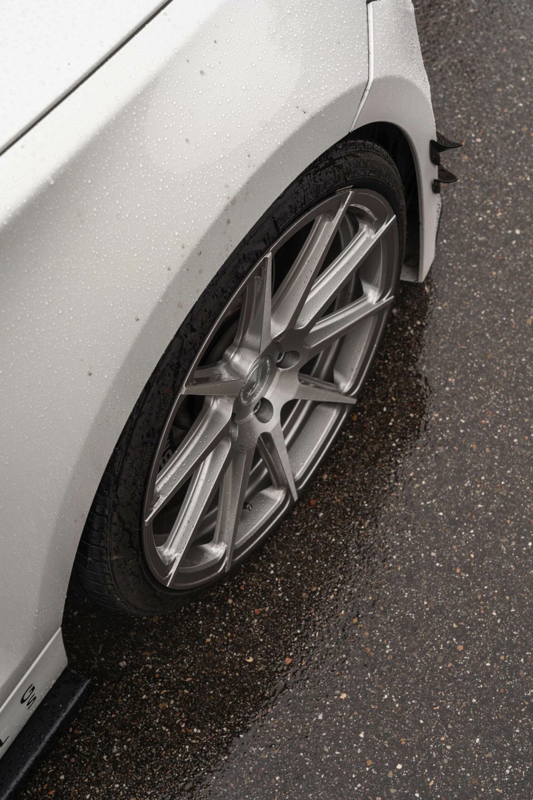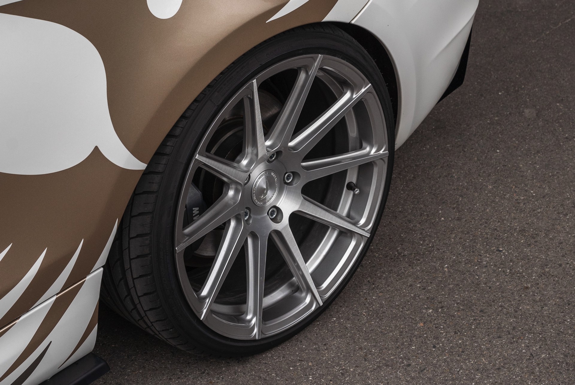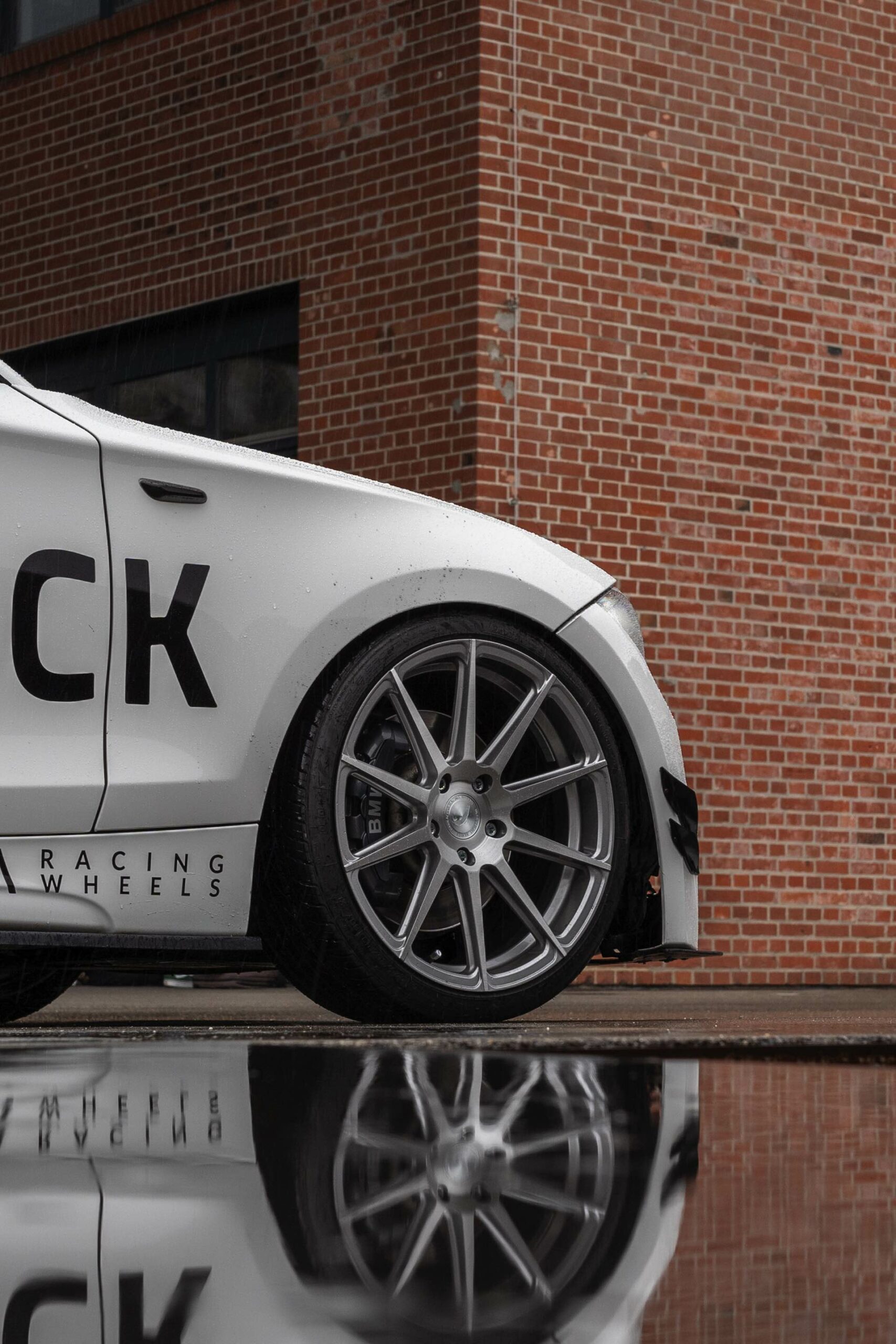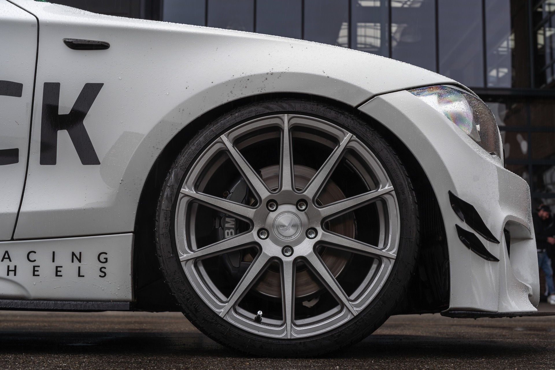 In der Seitenansicht ziehen neben dem Heckfügel vor allem die 19 Zoll großen Project 2.0-Felgen aus der Ultralight-Series von Barracuda Racing Wheels Blicke auf sich. Die im 10-Speichen-Design gestalteten Räder werden im Flow Forged-Verfahren hergestellt und haben anschließend ein Finish in Brushed Silver erhalten. Dank Eibach-Federn ist das 1er Coupé vorne 35 und hinten 30 Millimeter tiefer, weshalb die Radhäuser noch satter ausgefüllt werden. Komplettiert wird der Tuning-Look von einer Folierung im Stil des Energy Drinks 28 Black.