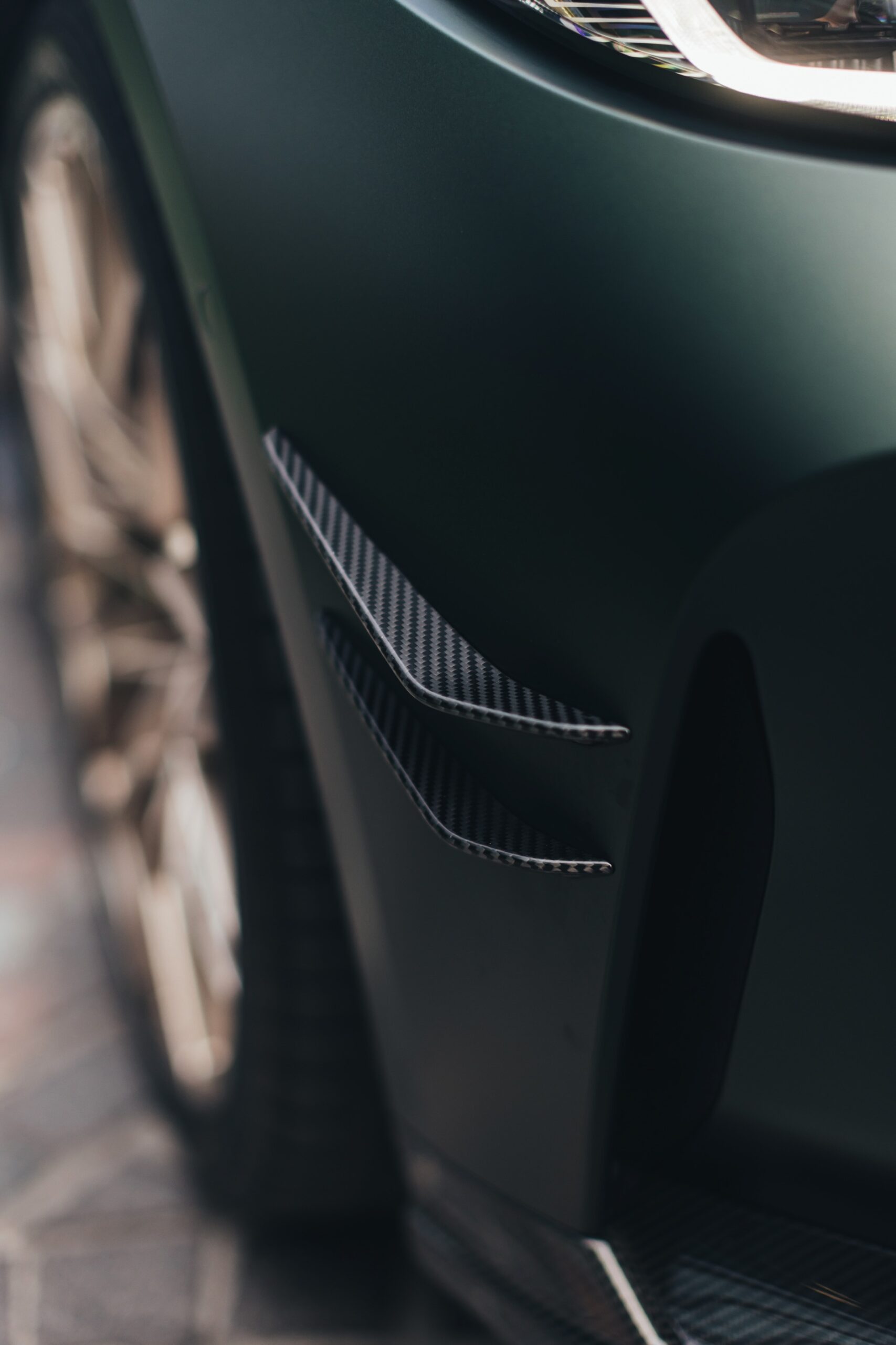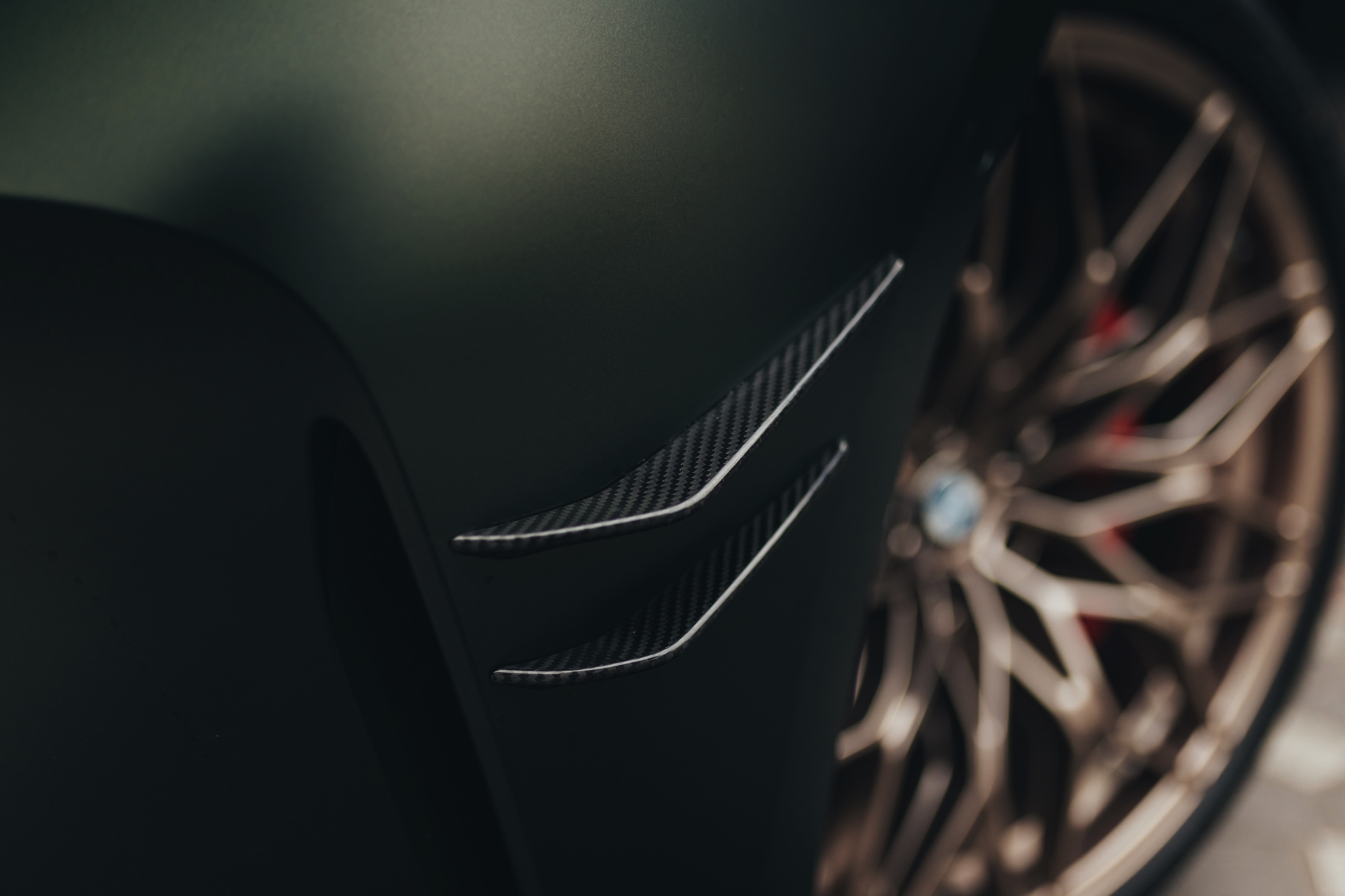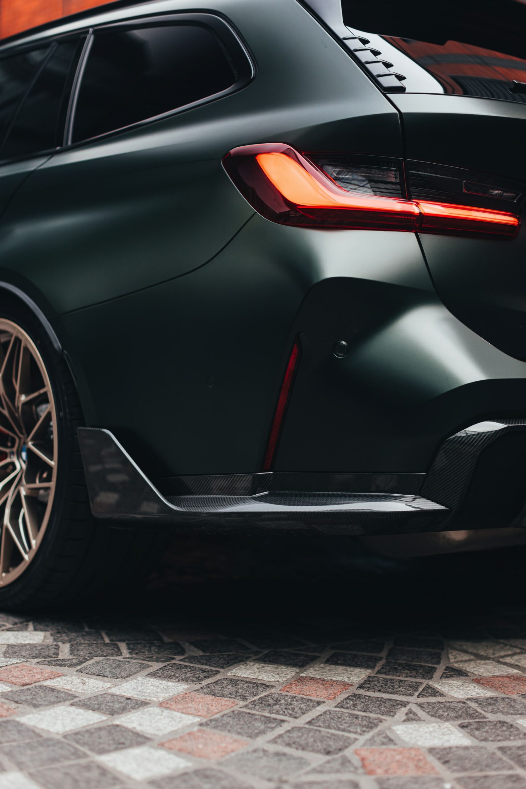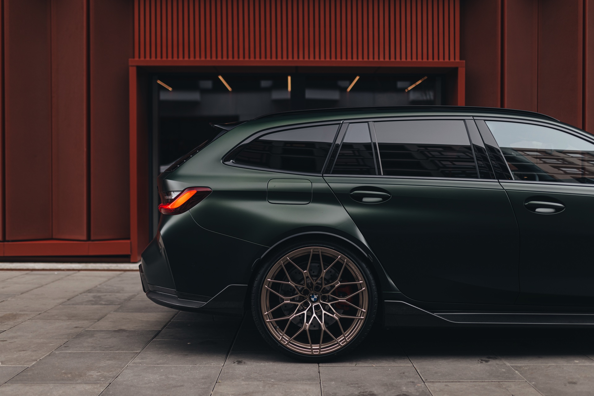 Die aktuellen Fotos zeigen den Power-Kombi nicht nur mit der exklusiven Matt-Lackierung in tiefem Dunkelgrün, sondern auch mit sehr speziellen Design-Akzenten. Besonders markant sind dabei die M Performance-Felgen im Design Kreuzspeiche 1000, die die Seitenansicht mit ihrem Finish in Goldbronze matt noch spezieller machen. An der Vorderachse kommt dabei das 20-Zoll-Format zum Einsatz, an der Hinterachse sehen wir sogar 21-Zöller. Für weitere sportliche Akzente sorgen diverse Carbon-Bauteile aus dem M Performance-Programm, angefangen von Frontsplitter über Aero-Flaps vor den Vorderrädern, Kiemen und passende Seitenschweller-Aufsätze bis hin zum Diffusor-Einsatz für die Heckschürze. "