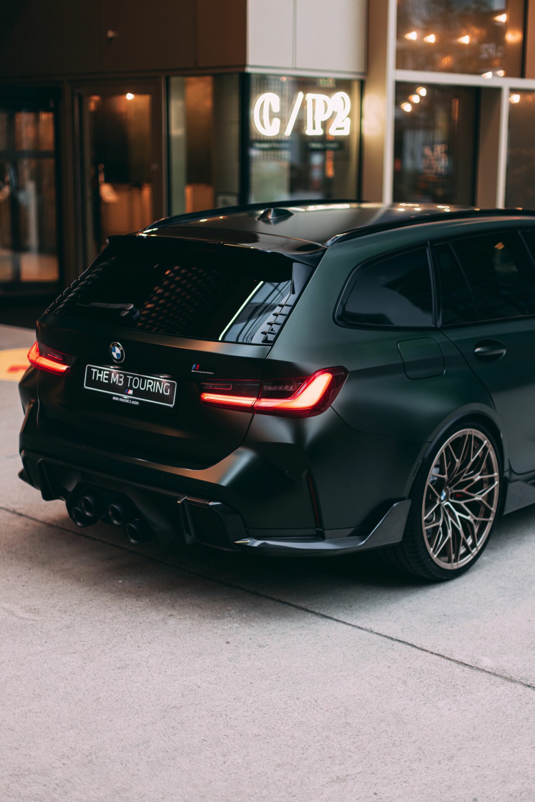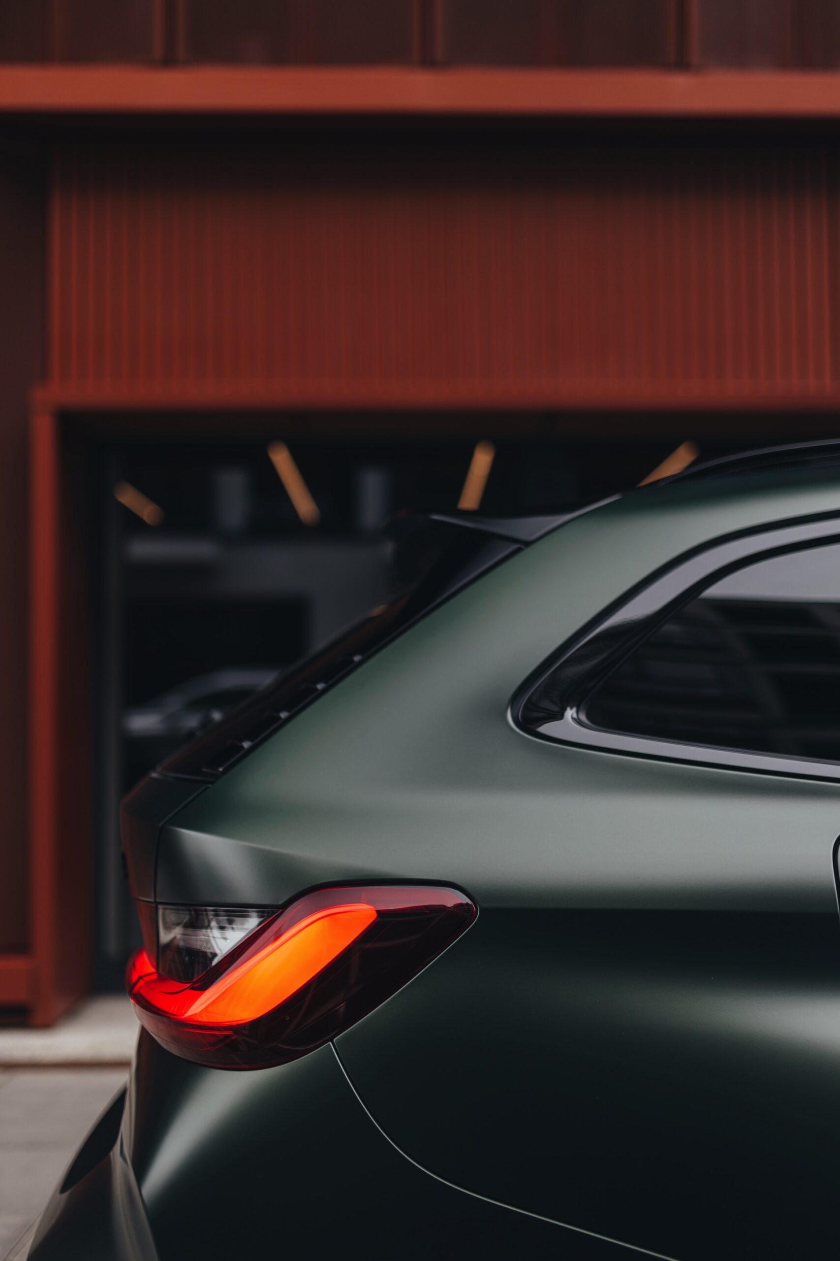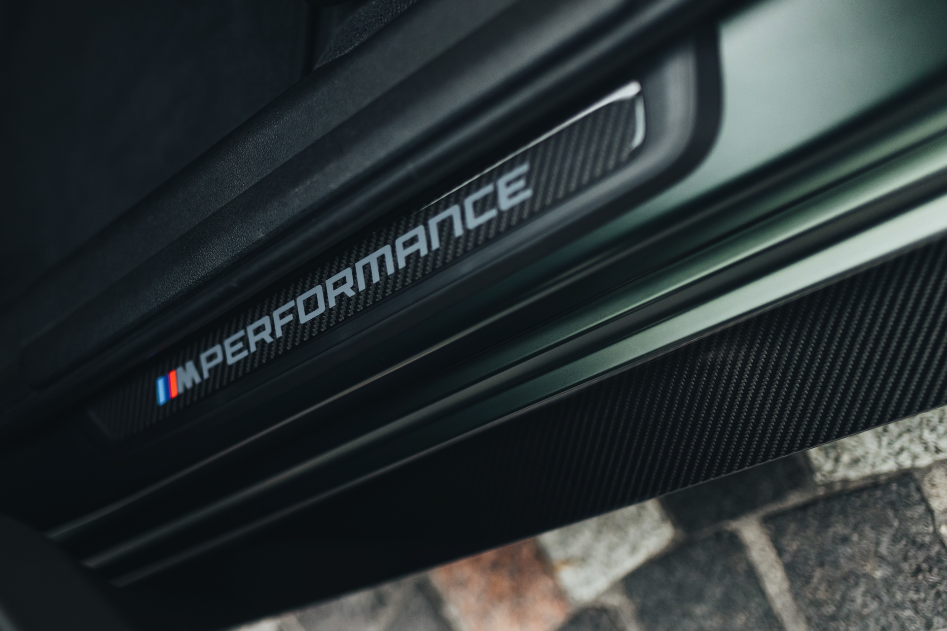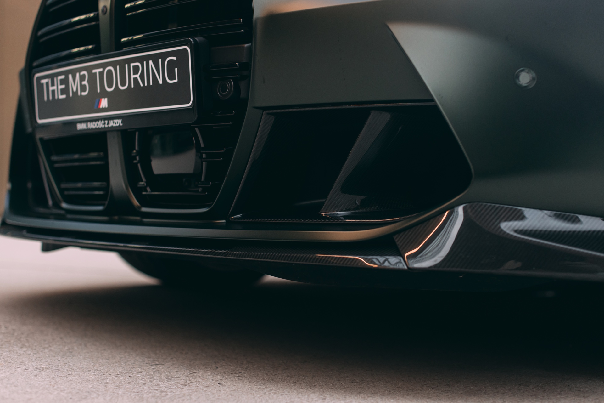 Die aktuellen Fotos zeigen den Power-Kombi nicht nur mit der exklusiven Matt-Lackierung in tiefem Dunkelgrün, sondern auch mit sehr speziellen Design-Akzenten. Besonders markant sind dabei die M Performance-Felgen im Design Kreuzspeiche 1000, die die Seitenansicht mit ihrem Finish in Goldbronze matt noch spezieller machen. An der Vorderachse kommt dabei das 20-Zoll-Format zum Einsatz, an der Hinterachse sehen wir sogar 21-Zöller. Für weitere sportliche Akzente sorgen diverse Carbon-Bauteile aus dem M Performance-Programm, angefangen von Frontsplitter über Aero-Flaps vor den Vorderrädern, Kiemen und passende Seitenschweller-Aufsätze bis hin zum Diffusor-Einsatz für die Heckschürze. "