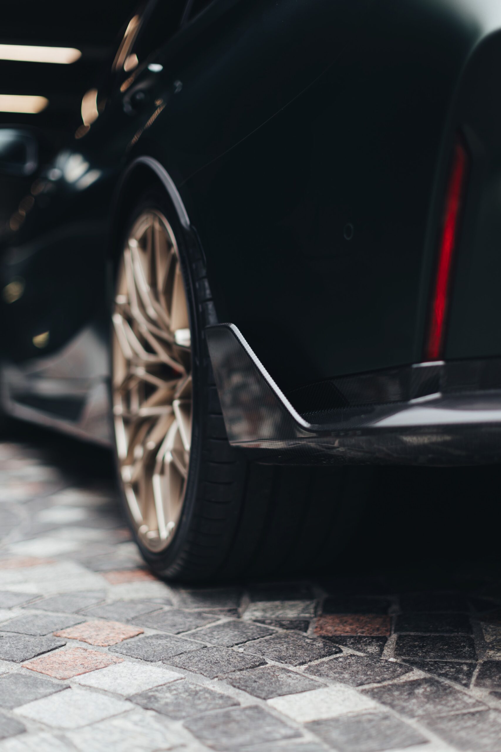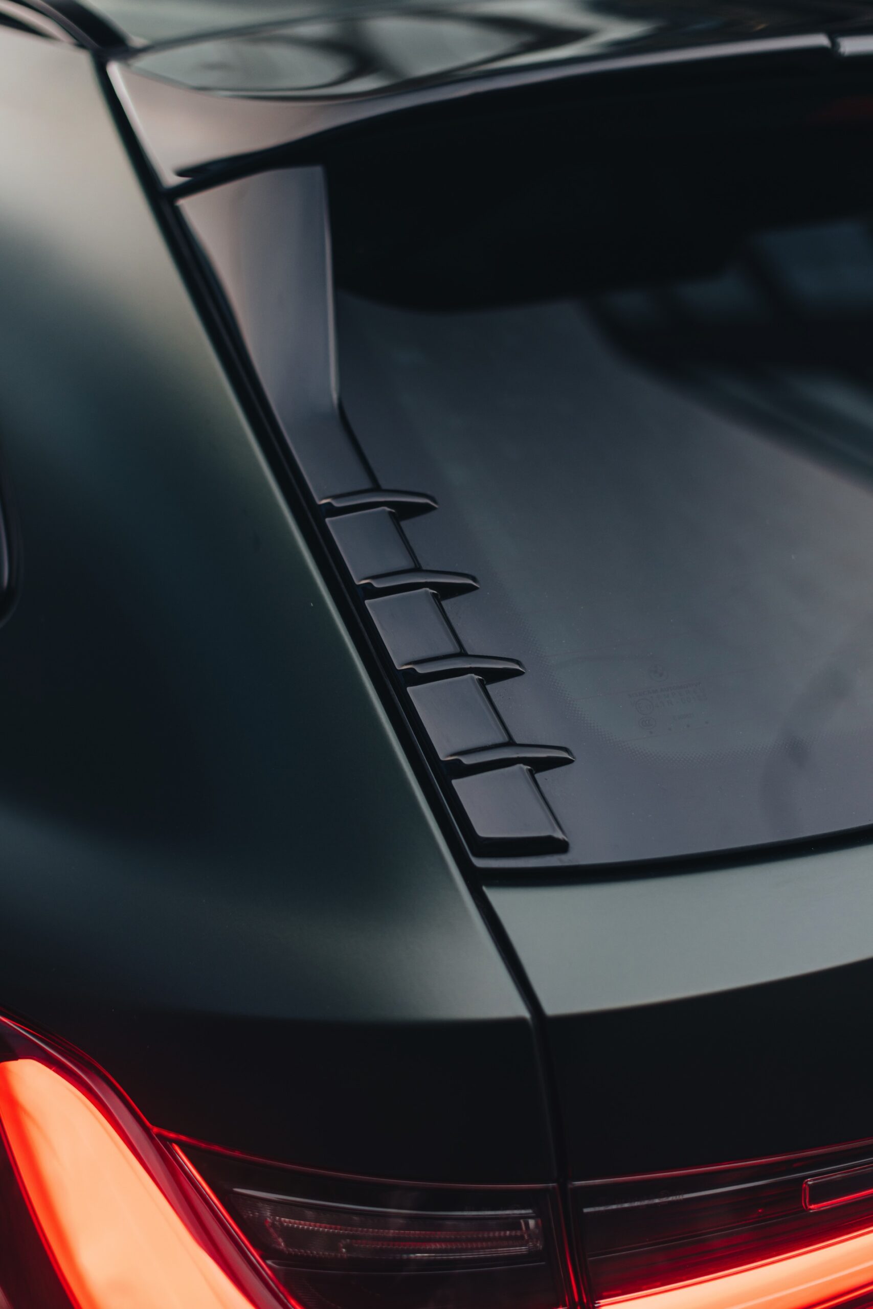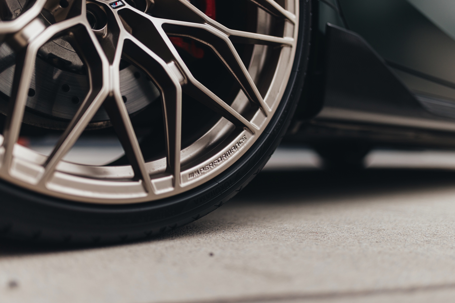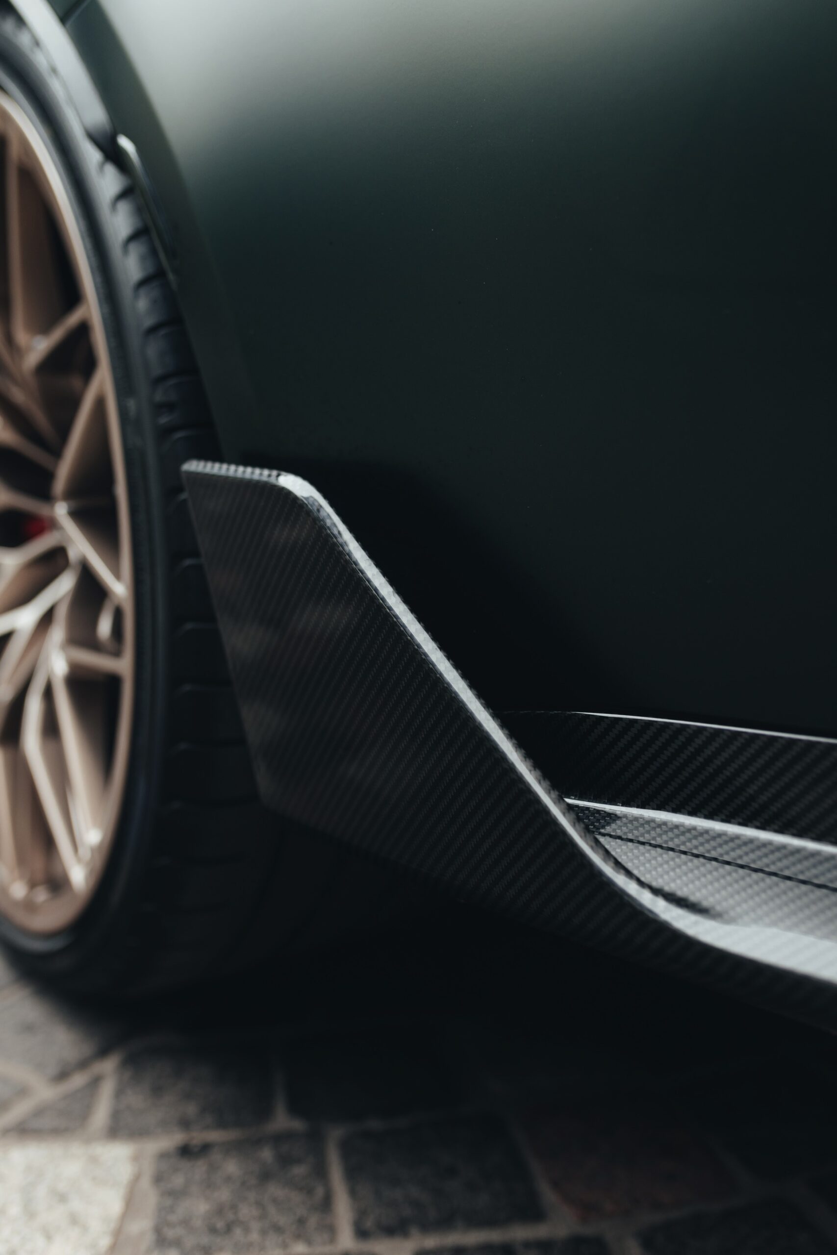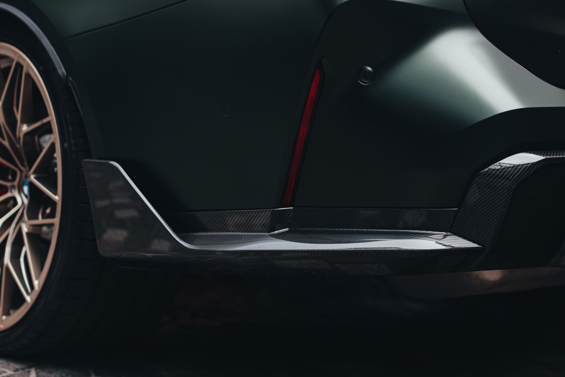 Die aktuellen Fotos zeigen den Power-Kombi nicht nur mit der exklusiven Matt-Lackierung in tiefem Dunkelgrün, sondern auch mit sehr speziellen Design-Akzenten. Besonders markant sind dabei die M Performance-Felgen im Design Kreuzspeiche 1000, die die Seitenansicht mit ihrem Finish in Goldbronze matt noch spezieller machen. An der Vorderachse kommt dabei das 20-Zoll-Format zum Einsatz, an der Hinterachse sehen wir sogar 21-Zöller. Für weitere sportliche Akzente sorgen diverse Carbon-Bauteile aus dem M Performance-Programm, angefangen von Frontsplitter über Aero-Flaps vor den Vorderrädern, Kiemen und passende Seitenschweller-Aufsätze bis hin zum Diffusor-Einsatz für die Heckschürze. "