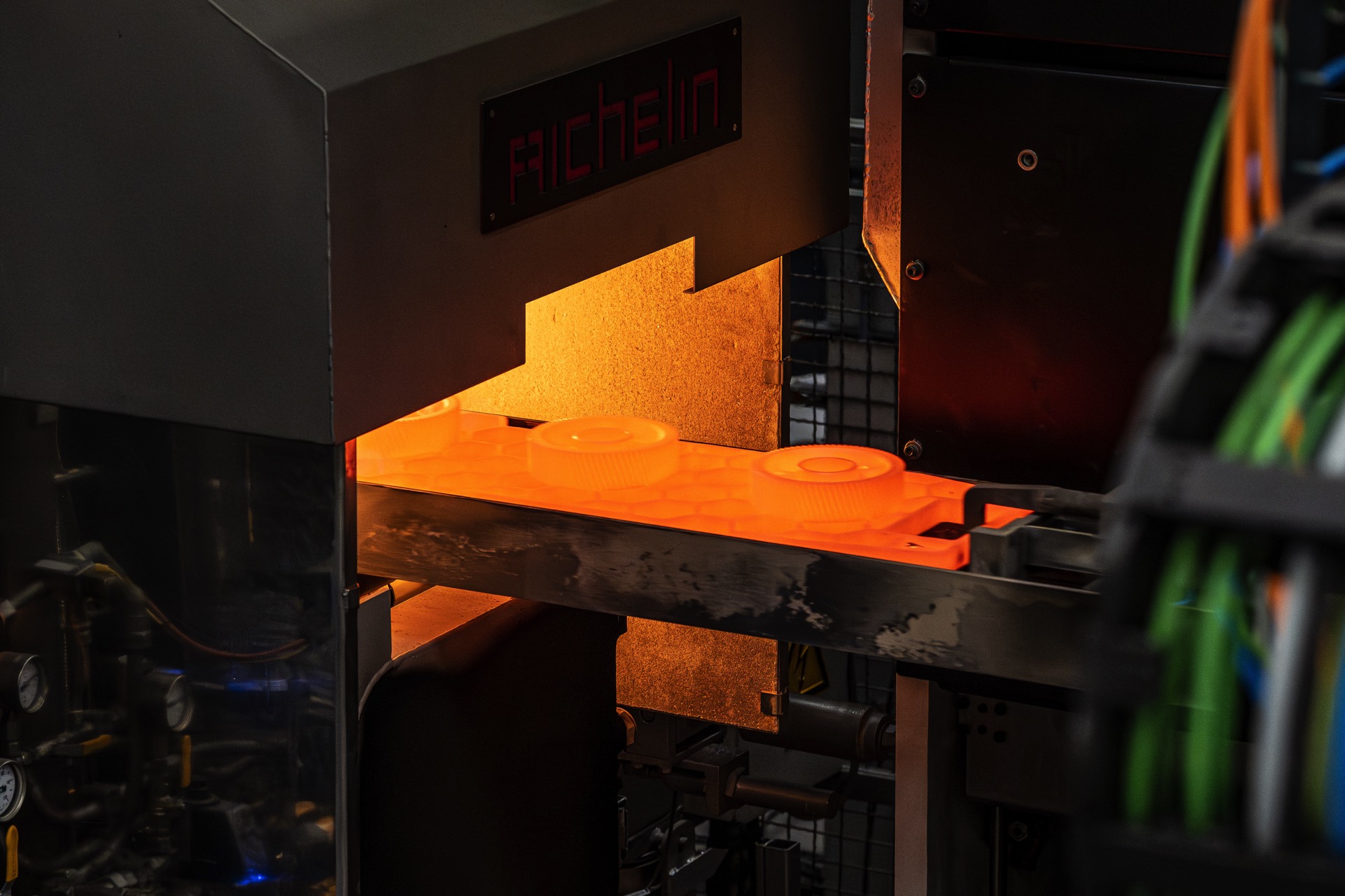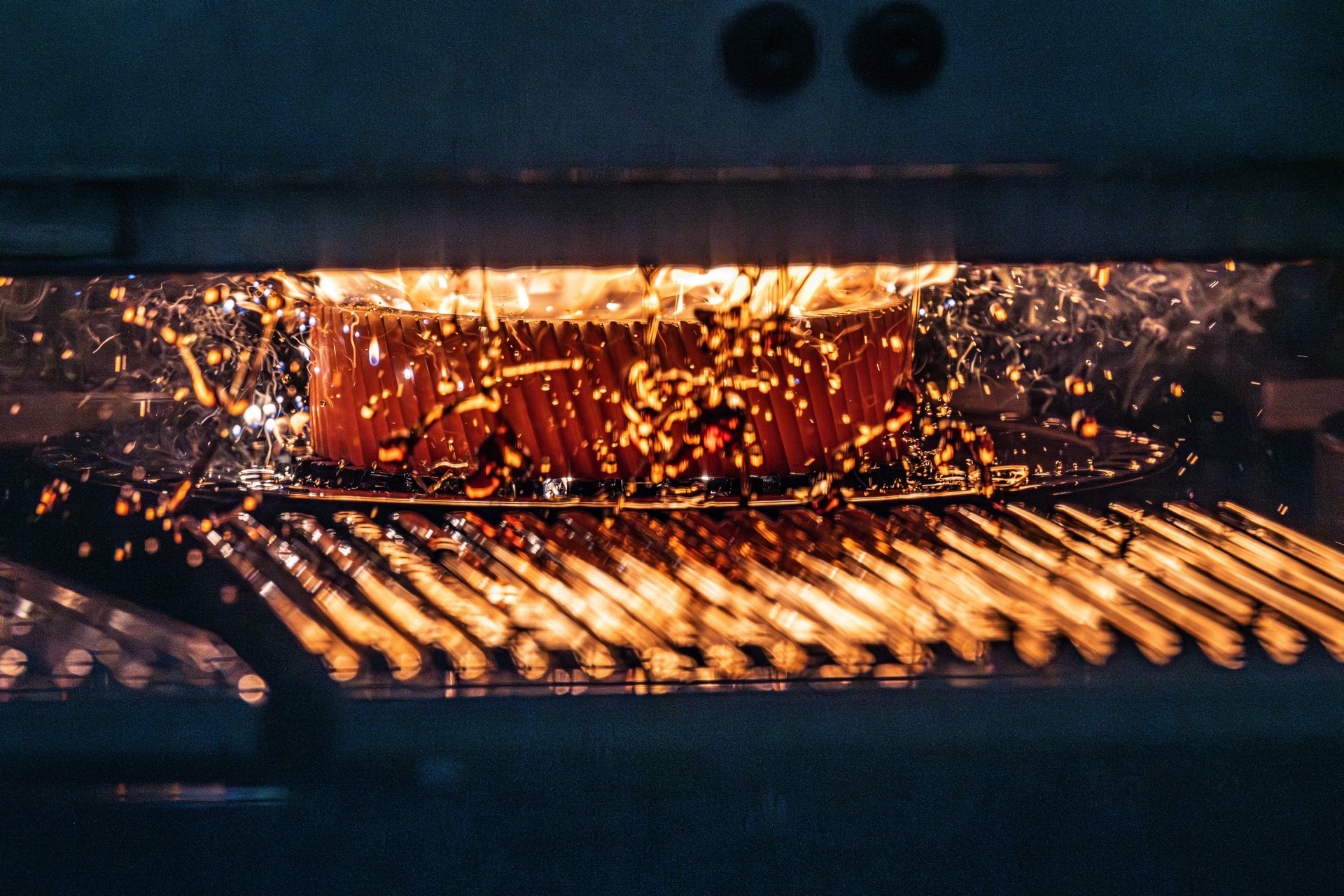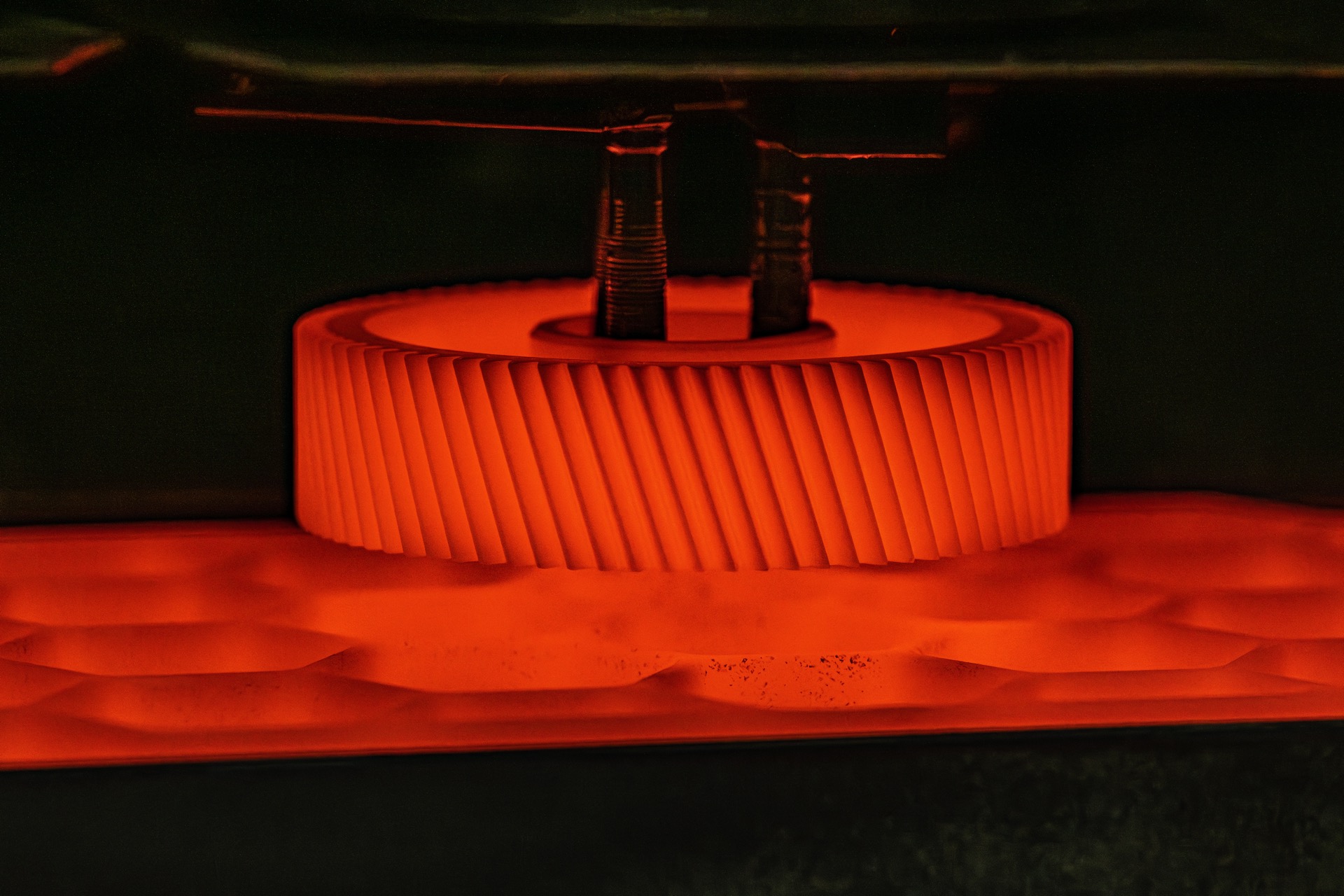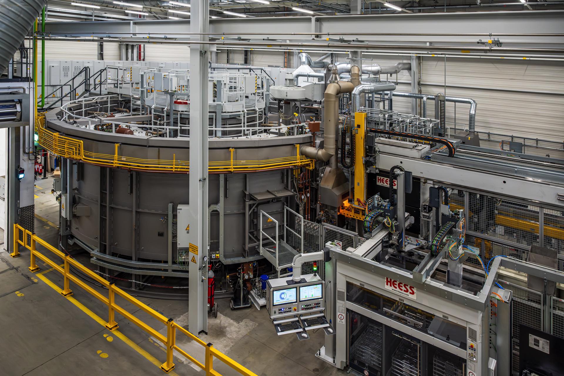 Im Härteofen werden Fahrwerks- und Antriebs-Komponenten durch eine Wärmebehandlung zusätzlich gehärtet, was vor Verschleiß schützt und ihre Lebensdauer deutlich verlängert. Die neue Ringherdofenanlage ist speziell für die Zahnräder von E-Getrieben gedacht, die angesichts von Elektromotoren mit vielen hundert Newtonmeter Drehmoment enormen Belastungen standhalten müssen. 33 elektrische Heizelemente bringen das Innere des Ofens auf über 900 Grad Celsius, ohne das kleinste bisschen Erdgas zu verfeuern. Pro Jahr können 960.000 Stirnräder den neuen Elektro-Härteofen durchlaufen.