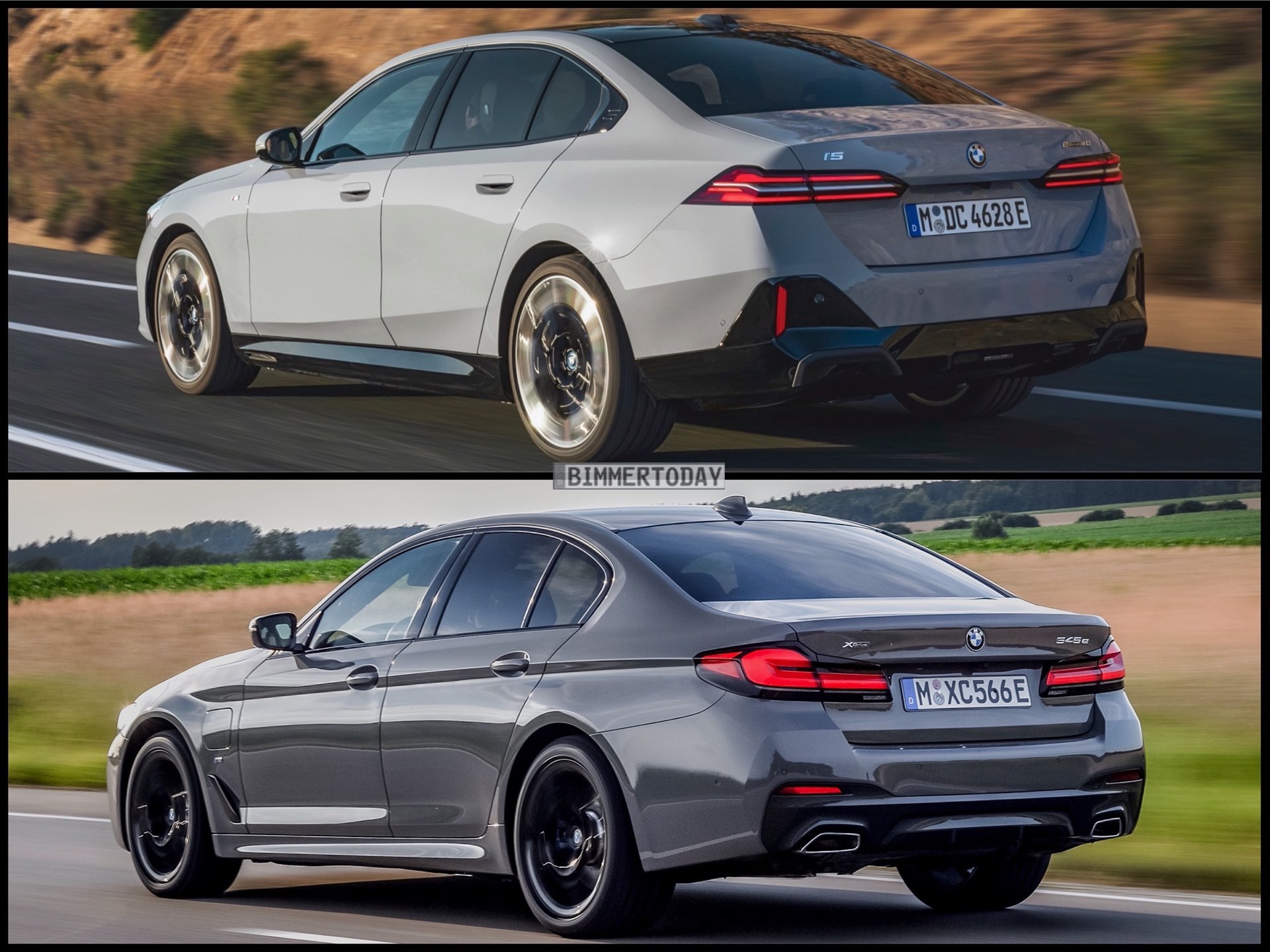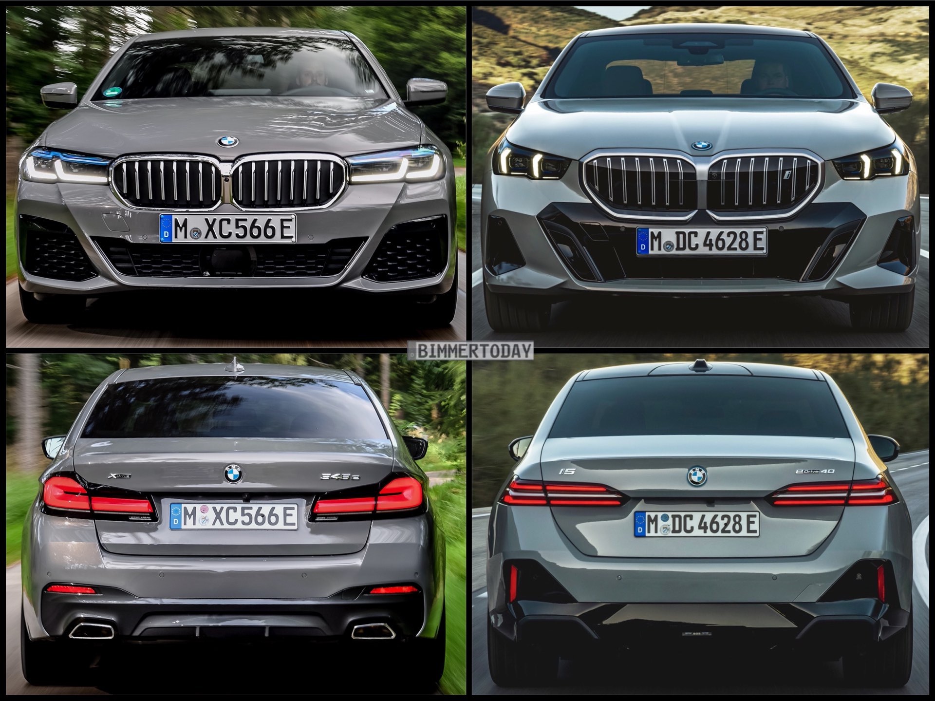 Eher ein Zufall und im Fall der 5er-Reihe – anders als beispielsweise bei Mercedes E-Klasse und EQE – auch eher eine Nebensache ist, dass beide Modelle über einen elektrifizierten Antrieb verfügen: Der gezeigte BMW 5er (G30 LCI) ist ein 545e xDrive mit Plug-in-Hybrid-Antrieb, der neue 5er (G60) ist streng genommen ein BMW i5 eDrive40. Da es zwischen einem konventionell angetriebenen 5er und dem elektrischen i5 allerdings keine relevanten Design-Unterschiede gibt, ist dieser Aspekt ziemlich nebensächlich. Wichtigster Unterschied zwischen neuem 5er und i5 ist die Niere, denn diese trägt im Fall des i5 ein i-Logo und ist bei genauerem Hinsehen beinahe vollständig geschlossen.