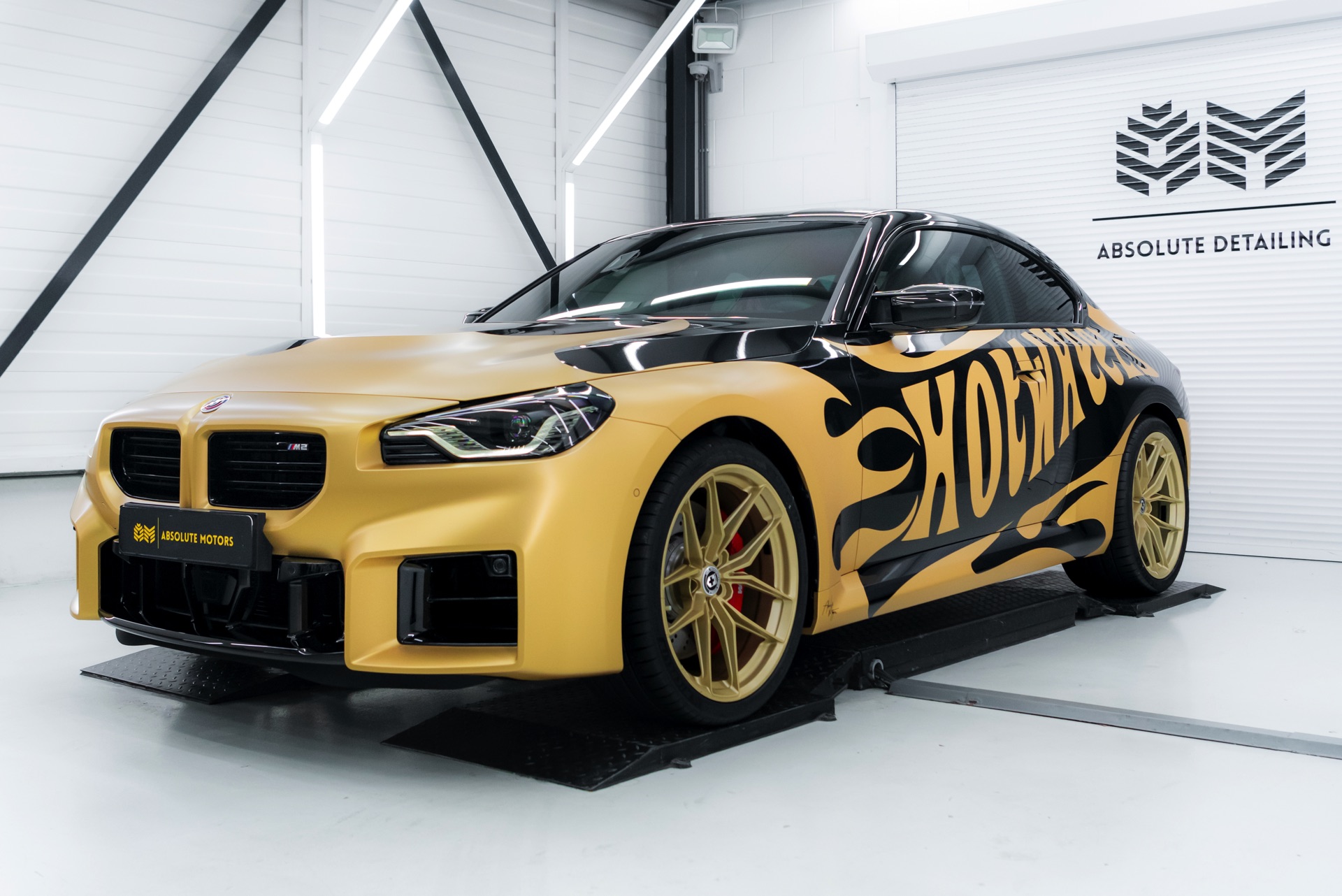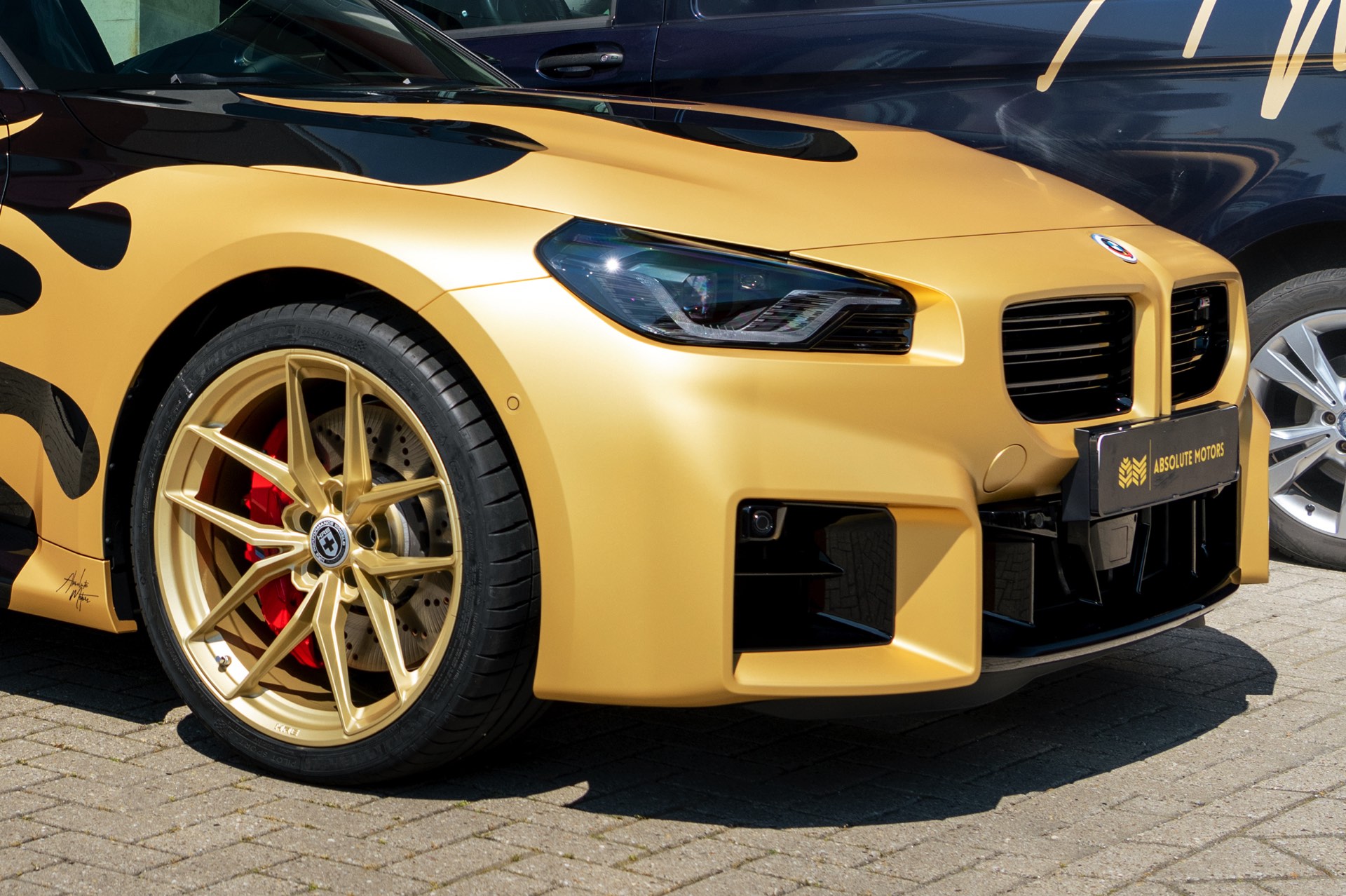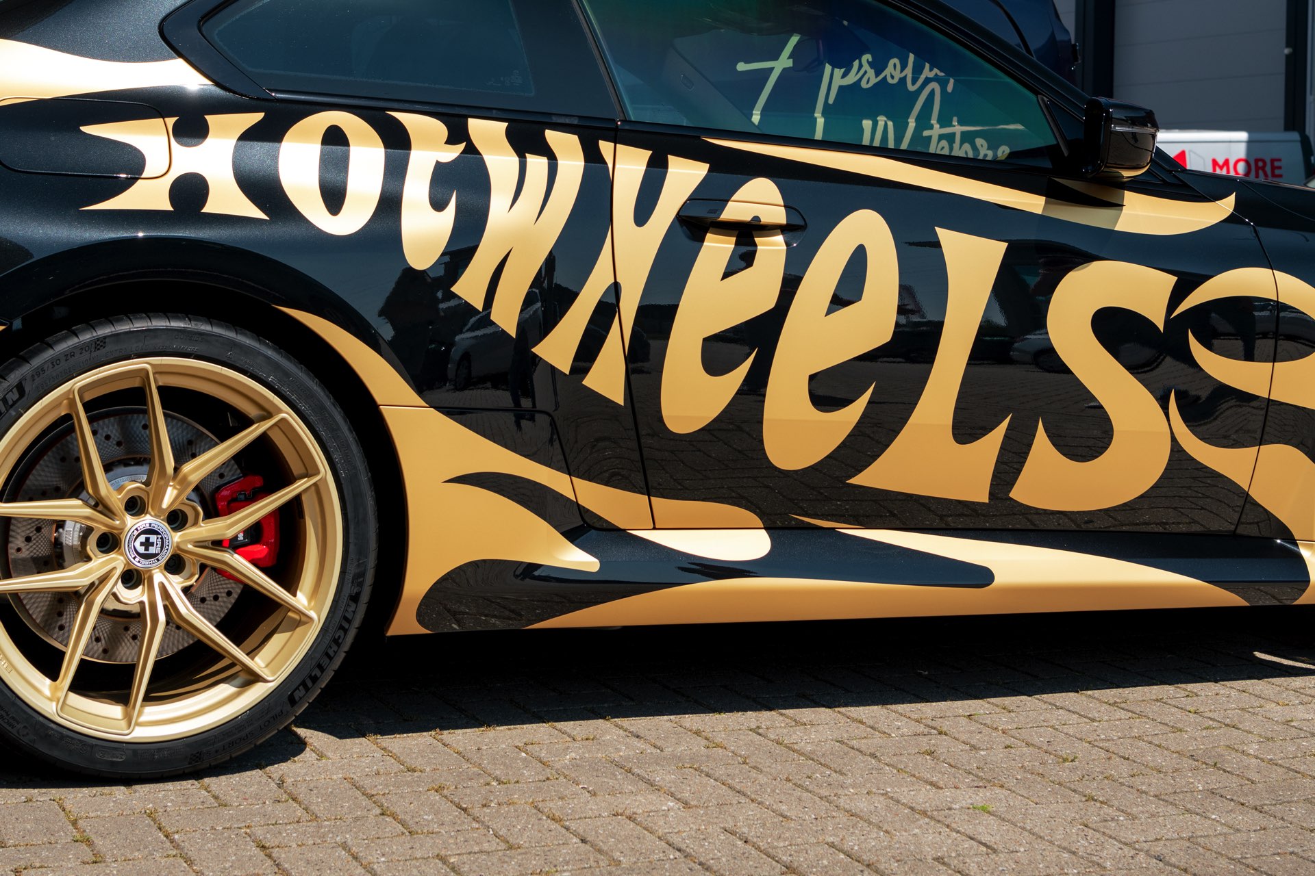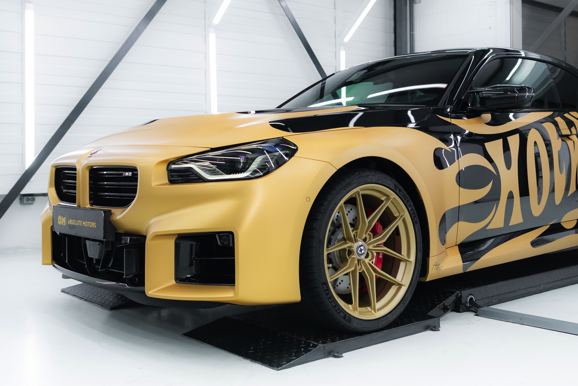 Realisiert wurde der “Hot Wheels”-M2 mit Hilfe einer Teil-Folierung in ‘Matt Pyrite Gold’, die für einen scharfen Kontrast zur Lackierung in Saphirschwarz sorgt und erstklassig zu den im wahrsten Sinne “heißen Rädern” des Fahrzeugs passt: In den Radhäusern sehen wir die vorne und hinten 20 Zoll großen HRE FlowForm Monoblock-Felgen im Design FF21. Für die Tuning-Felgen von HRE Performance Wheels stehen direkt ab Werk verschiedene Lackierung zur Wahl, darunter Gloss Gold und das hier gezeigte Satin Gold mit seidenmattem Finish.