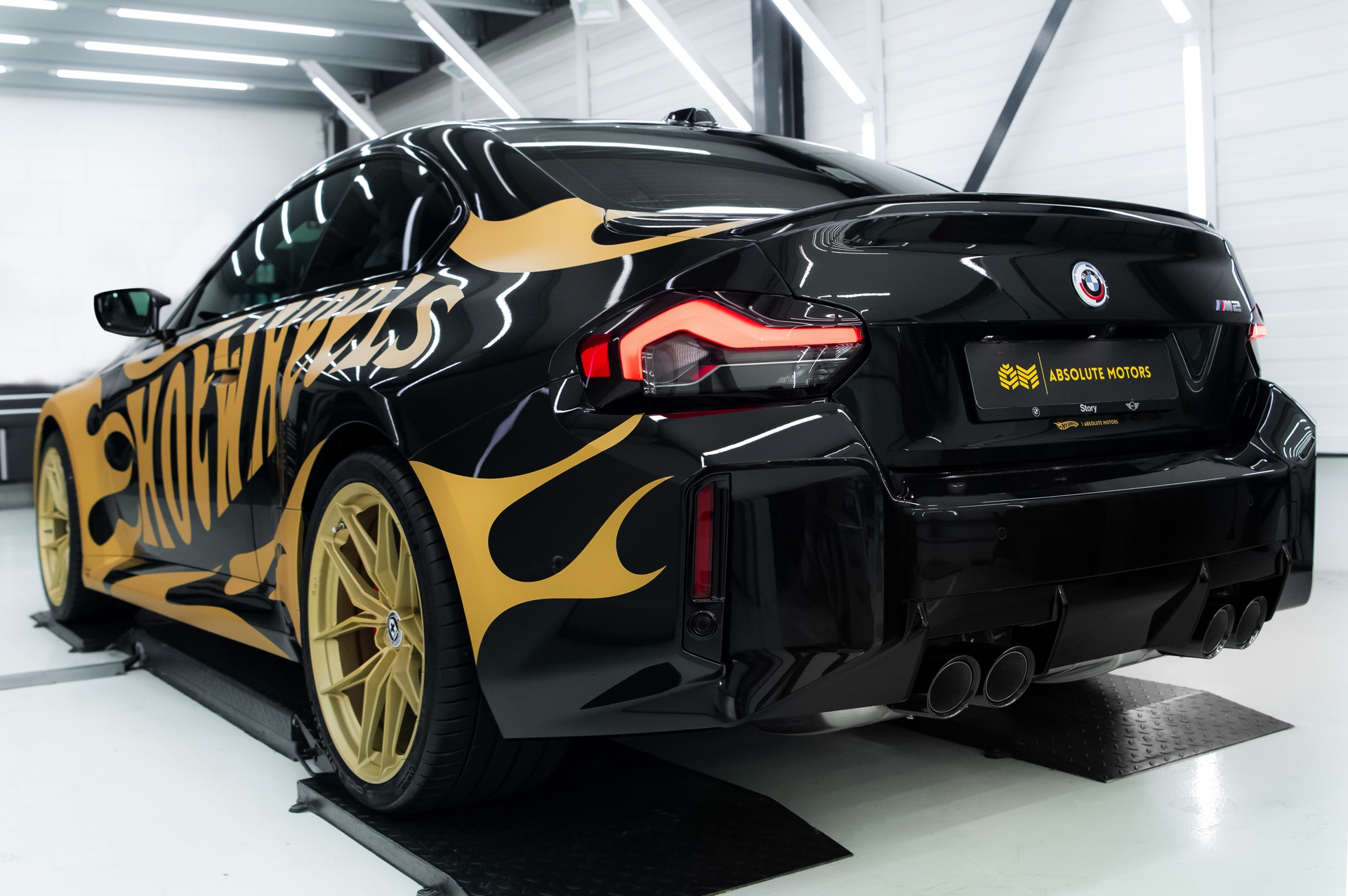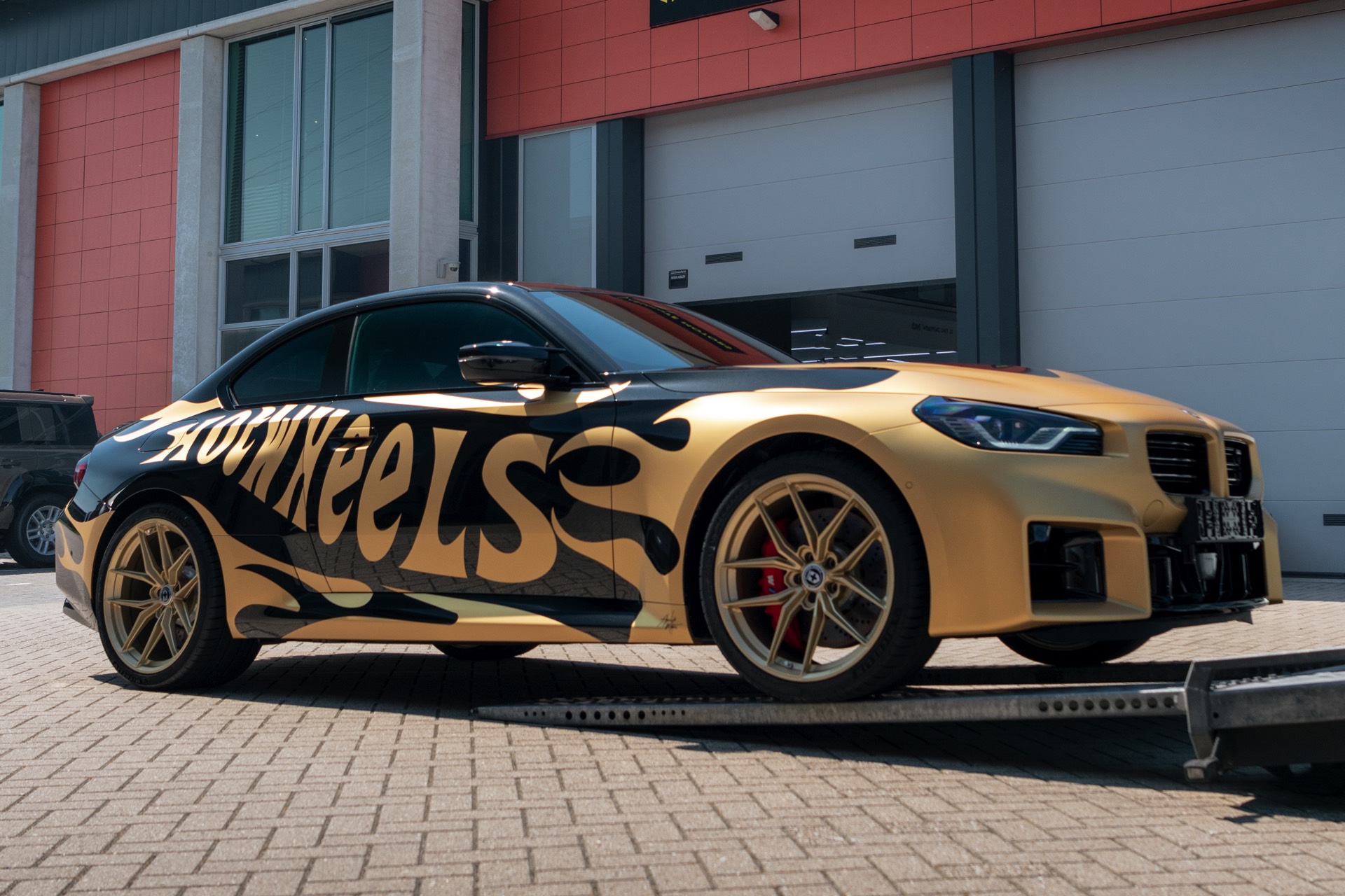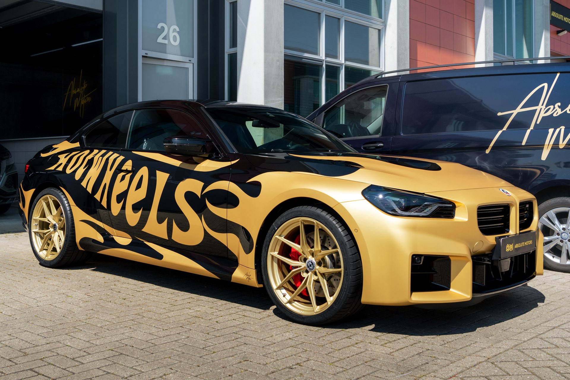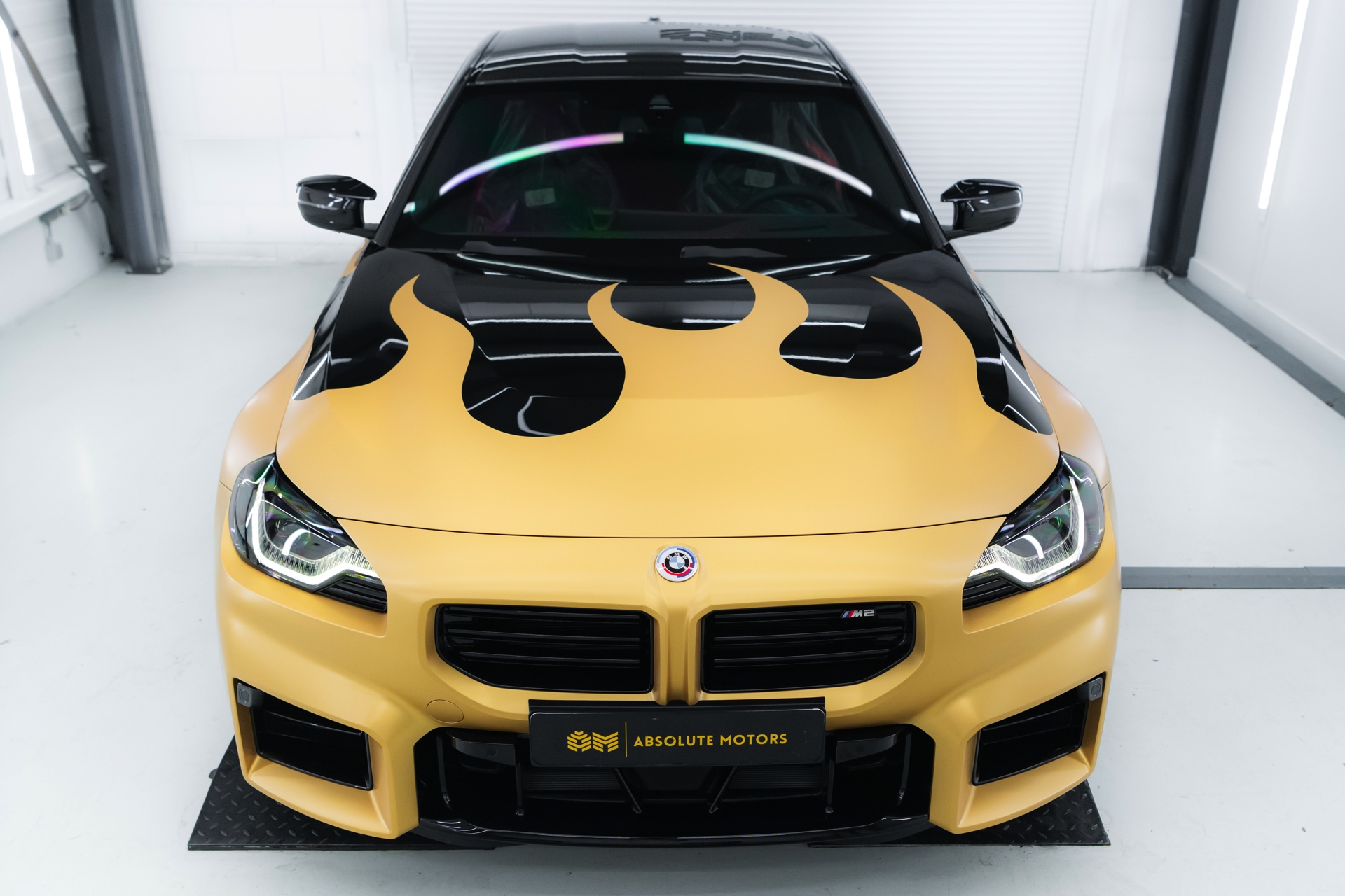 Realisiert wurde der “Hot Wheels”-M2 mit Hilfe einer Teil-Folierung in ‘Matt Pyrite Gold’, die für einen scharfen Kontrast zur Lackierung in Saphirschwarz sorgt und erstklassig zu den im wahrsten Sinne “heißen Rädern” des Fahrzeugs passt: In den Radhäusern sehen wir die vorne und hinten 20 Zoll großen HRE FlowForm Monoblock-Felgen im Design FF21. Für die Tuning-Felgen von HRE Performance Wheels stehen direkt ab Werk verschiedene Lackierung zur Wahl, darunter Gloss Gold und das hier gezeigte Satin Gold mit seidenmattem Finish.