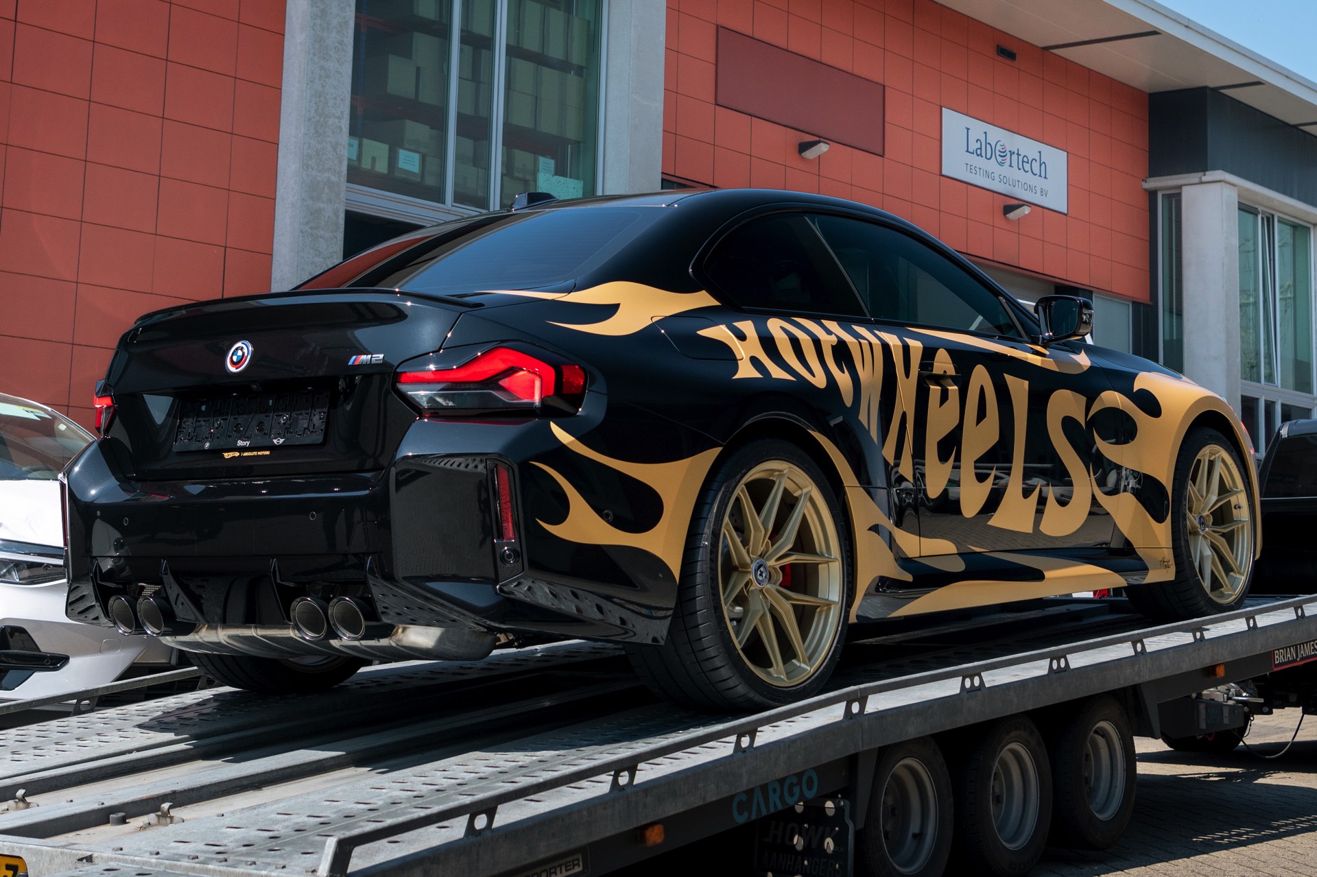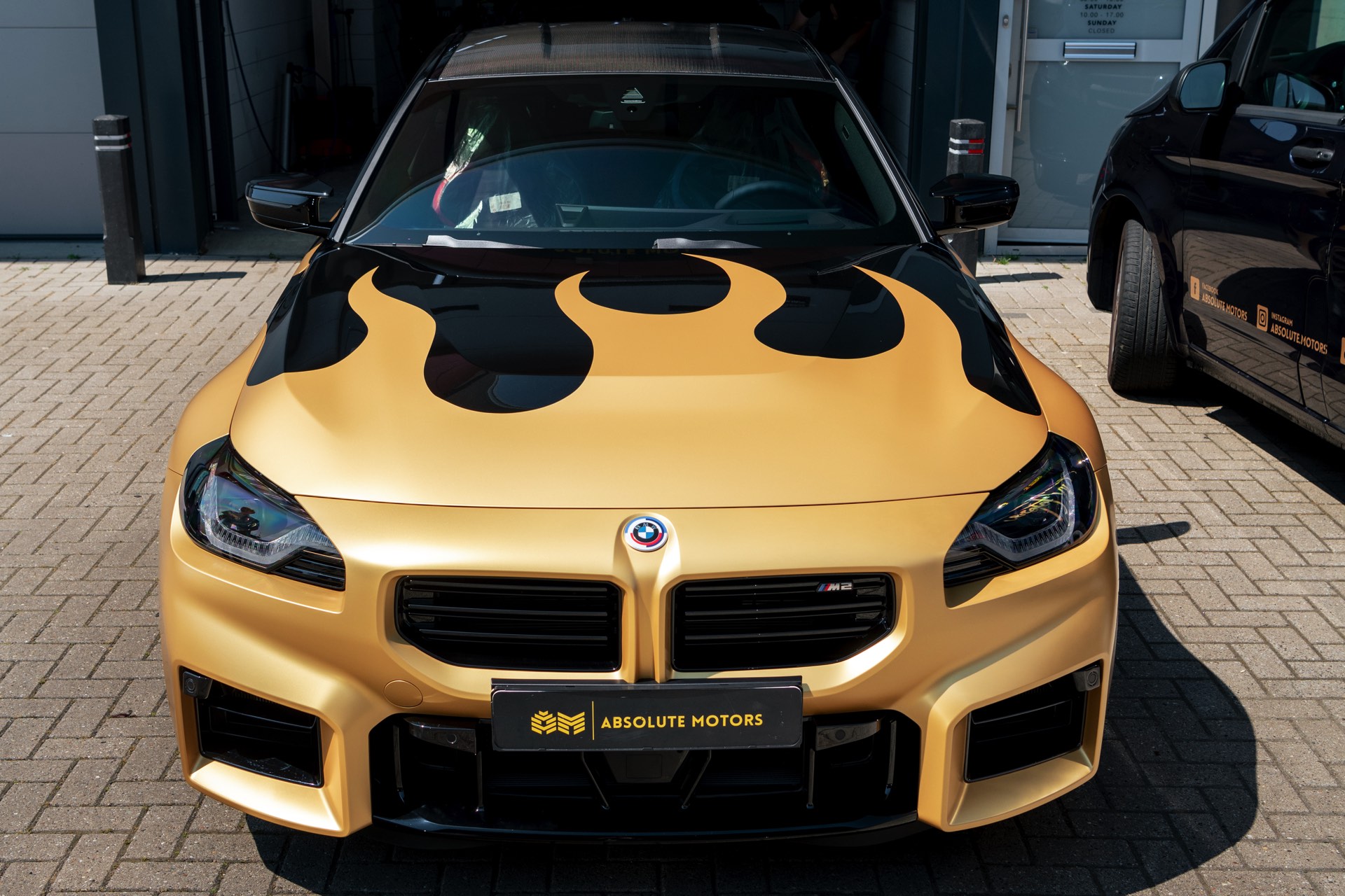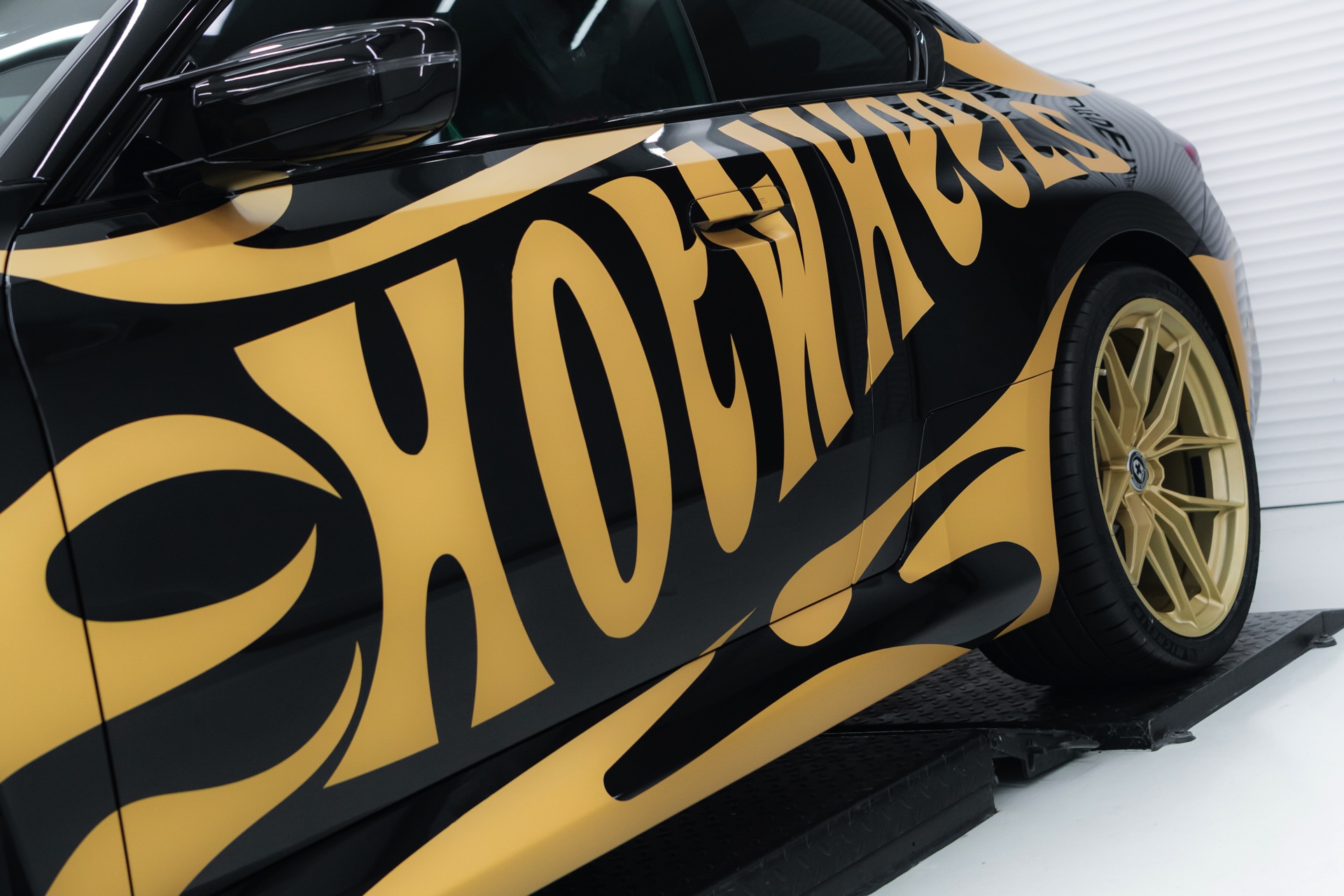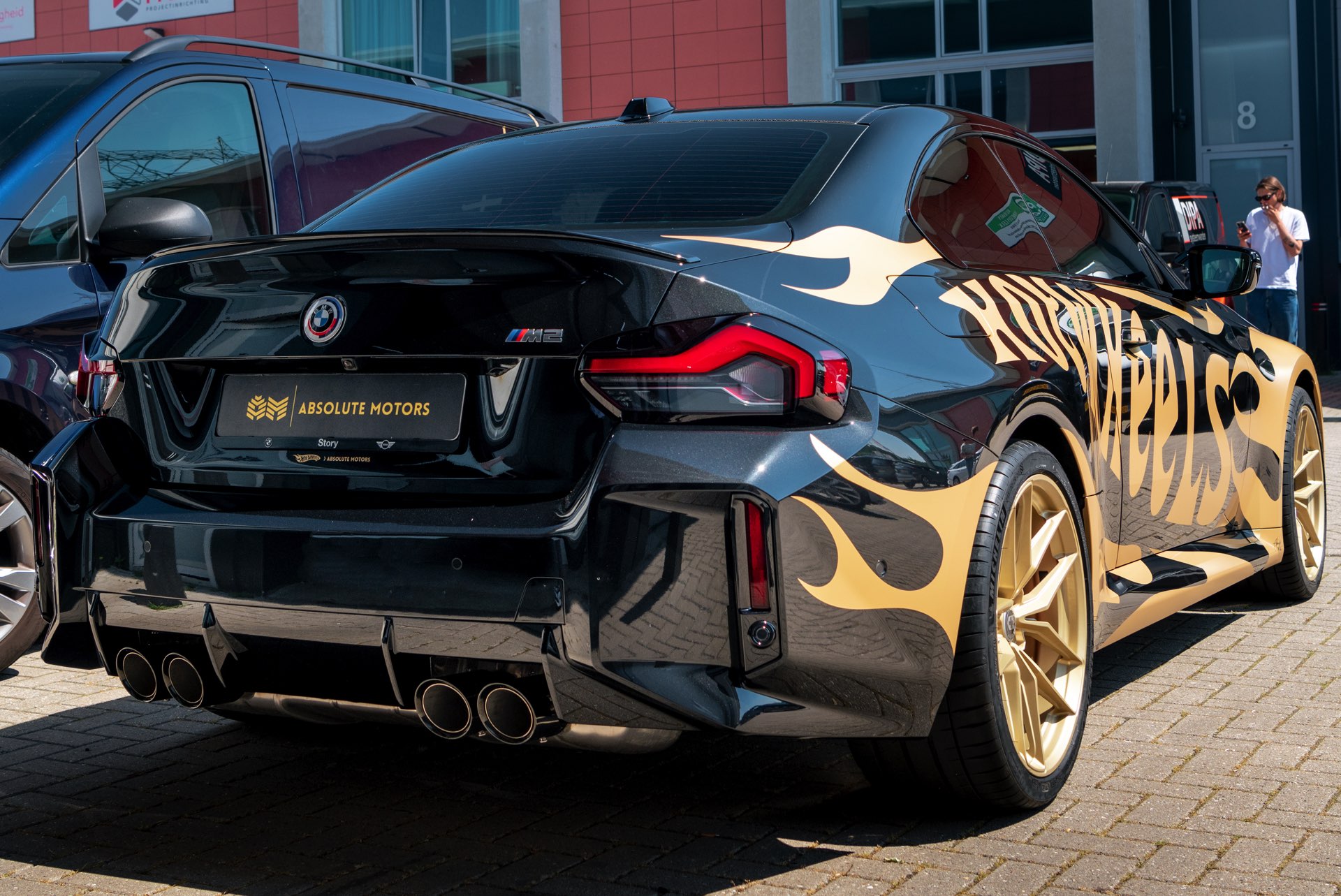 Realisiert wurde der “Hot Wheels”-M2 mit Hilfe einer Teil-Folierung in ‘Matt Pyrite Gold’, die für einen scharfen Kontrast zur Lackierung in Saphirschwarz sorgt und erstklassig zu den im wahrsten Sinne “heißen Rädern” des Fahrzeugs passt: In den Radhäusern sehen wir die vorne und hinten 20 Zoll großen HRE FlowForm Monoblock-Felgen im Design FF21. Für die Tuning-Felgen von HRE Performance Wheels stehen direkt ab Werk verschiedene Lackierung zur Wahl, darunter Gloss Gold und das hier gezeigte Satin Gold mit seidenmattem Finish.