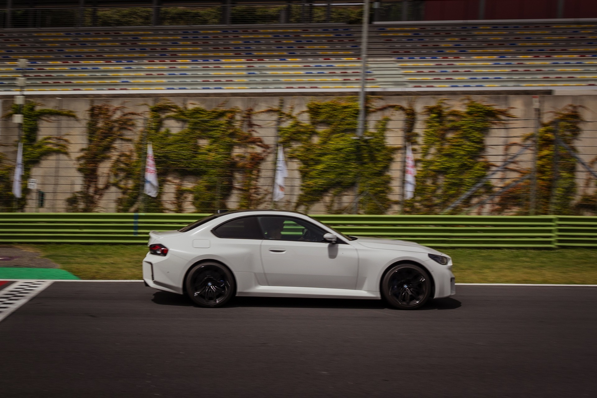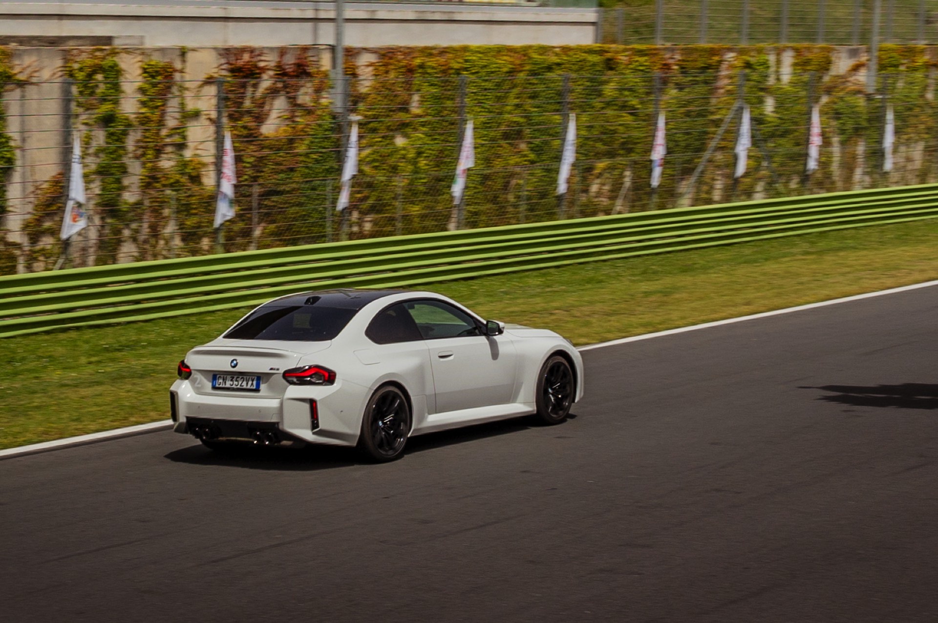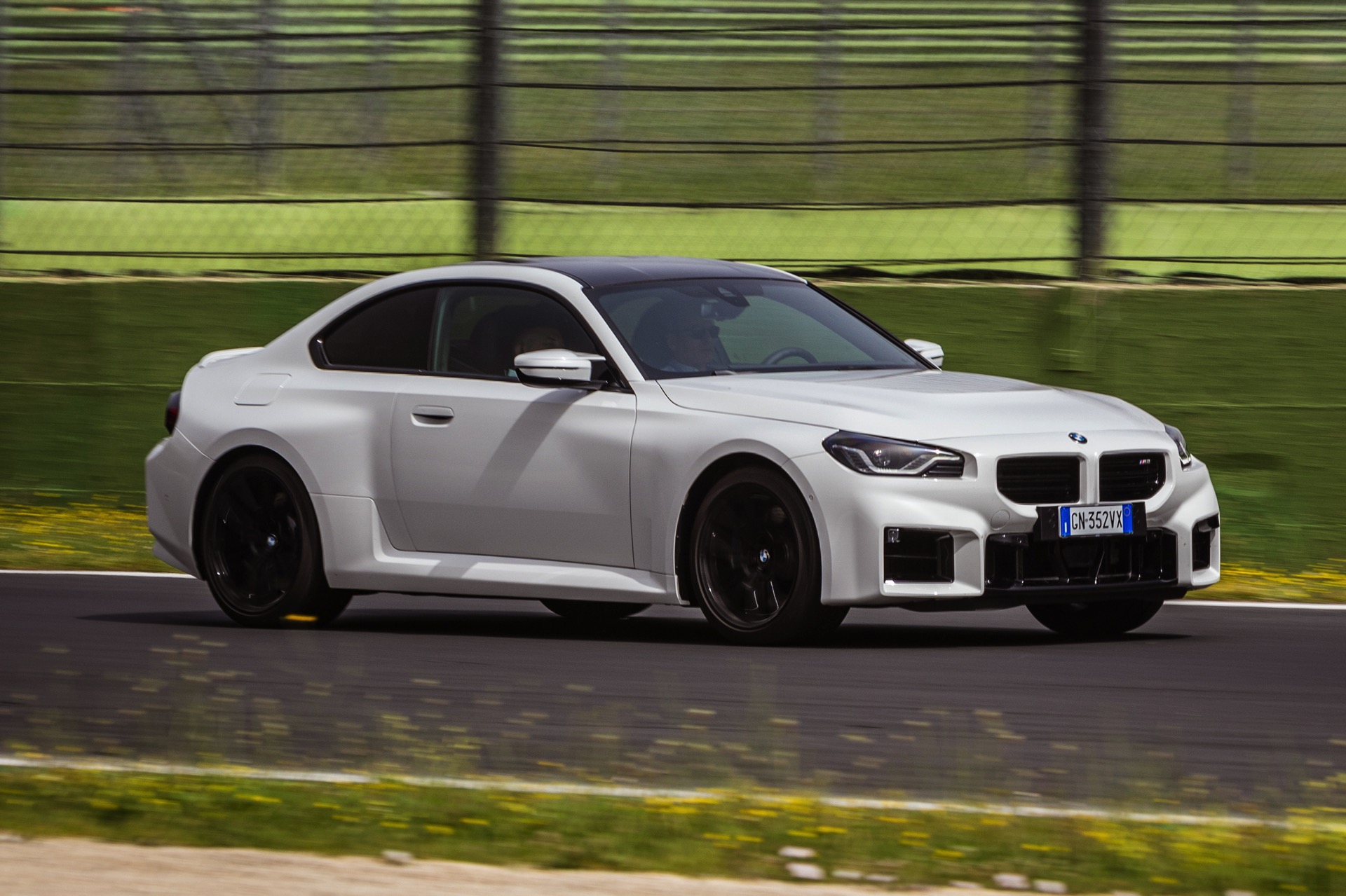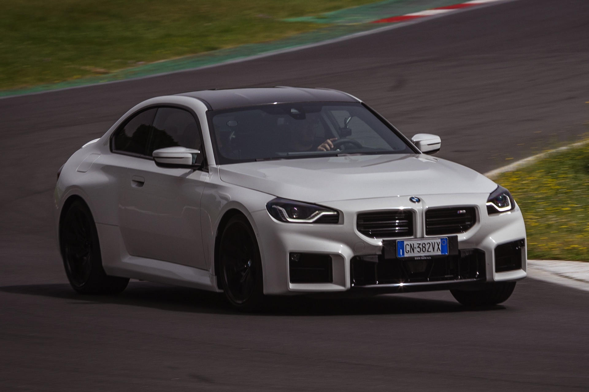 Auf den Fotos zum neuen BMW M2 (G87) standen bisher andere Farben als Alpinweiß im Fokus, aber dank der Präsentation für italienische Journalisten auf der Rennstrecke von Vallelunga gibt es nun auch einige Fotos der zweiten M2-Generation in Weiß. Mit der hellen Lackierung treten die muskulösen Formen des G87 noch stärker in Erscheinung, vor allem die vorne wie hinten deutlich verbreiterten Kotflügel und die Motorhaube mit ihrem kräftigen Powerdome. Für dunkle Akzente sorgen die vorne 19 und hinten 20 Zoll großen Leichtmetallräder Doppelspeiche 930 M in Schwarz und das optionale Carbon-Dach, das einzeln für 2.600 Euro Aufpreis oder als Bestandteil des 14.500 Euro teuren M Race Track-Pakets bestellt werden kann.