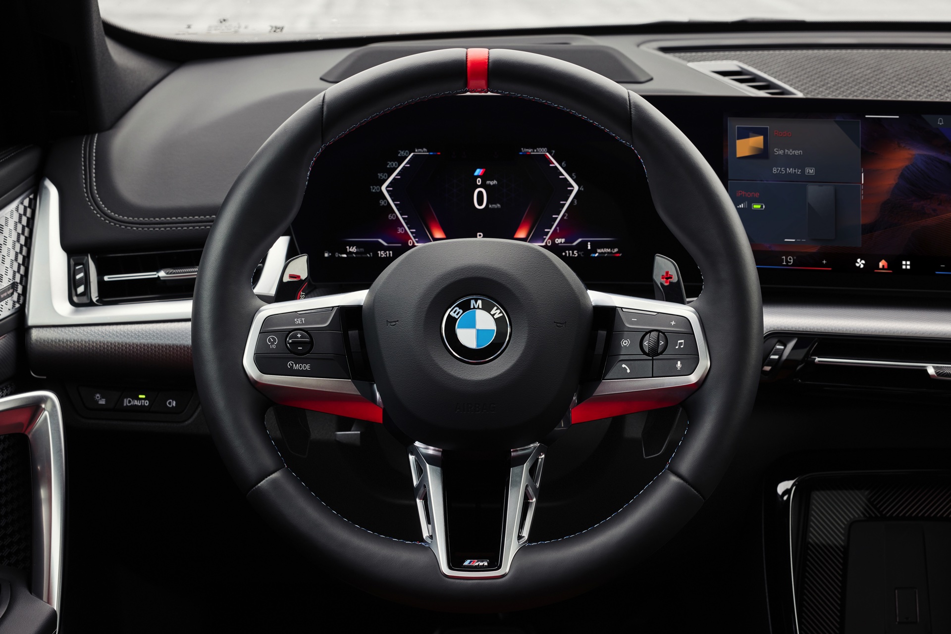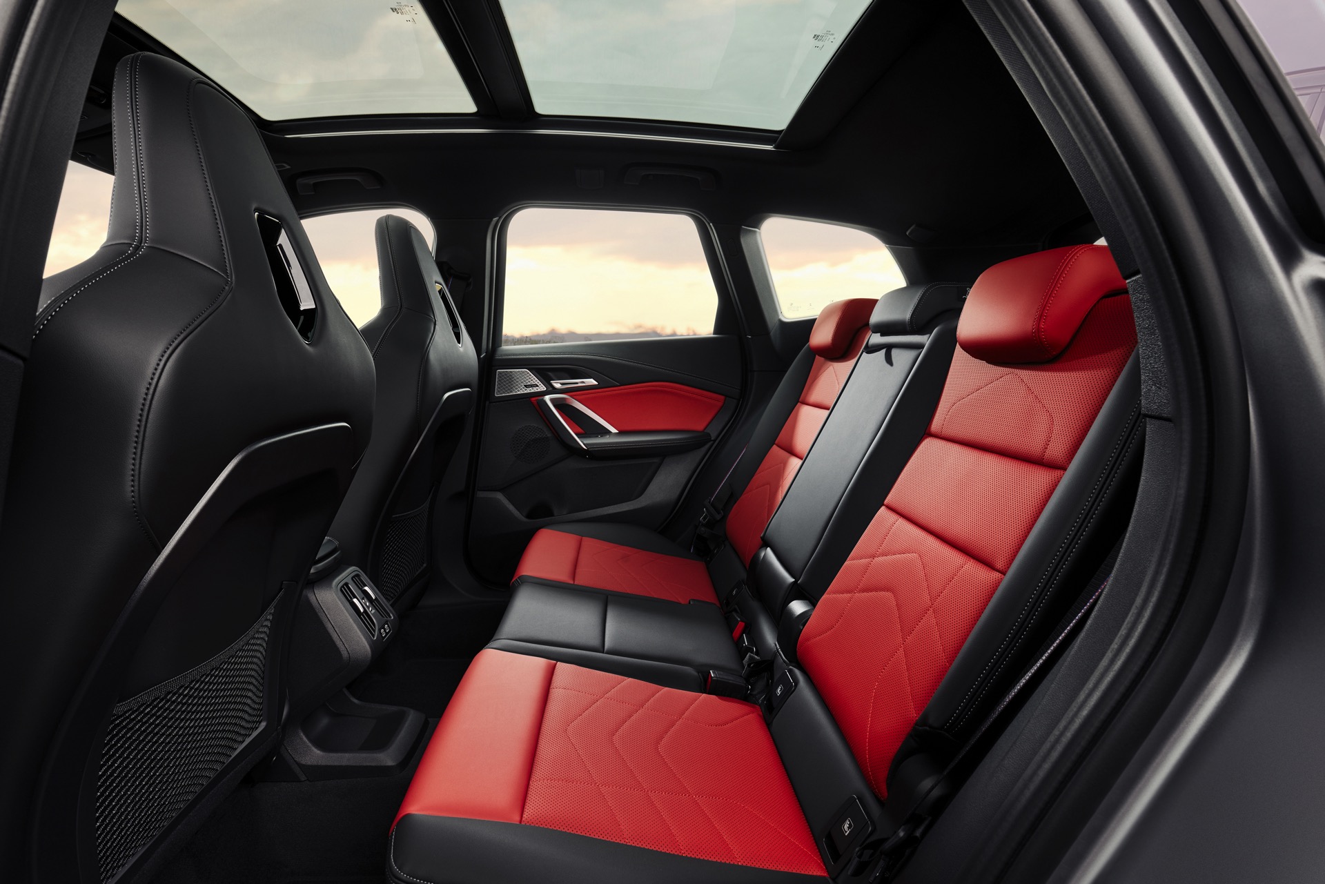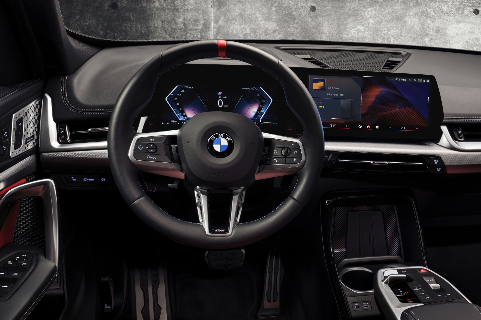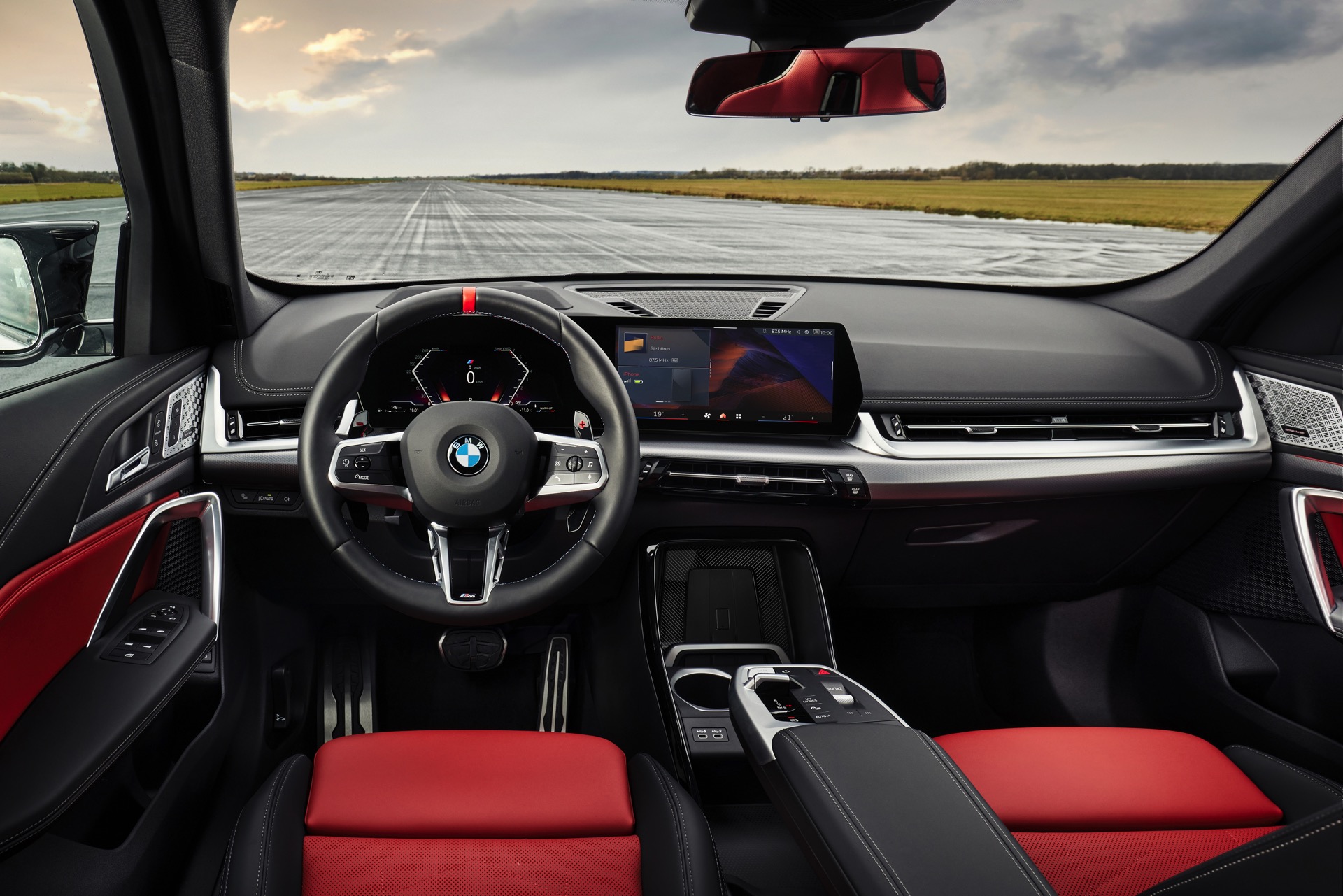 Im Innenraum setzt sich der X1 M35i auf Wusch mit M Sportsitzen samt beleuchtetem M-Logo und integrierten Kopfstützen von den übrigen X1 ab, auf den ersten Fotos sehen wir die neuen Sitze in einer auffälligen Farb-Kombination mit Schwarz und Rot. Auf dem Curved Display wird von Anfang an das Infotainment-System iDrive 9 mit überarbeitetem Einstiegsbildschirm als Hauptmenü und zusätzlichen QuickSelect-Shortcuts zum Einsatz kommen. Auf einen iDrive-Controller müssen X1-Kunden dabei auch weiterhin verzichten, die Bedienung erfolgt primär über Sprachsteuerung und Touchscreen.