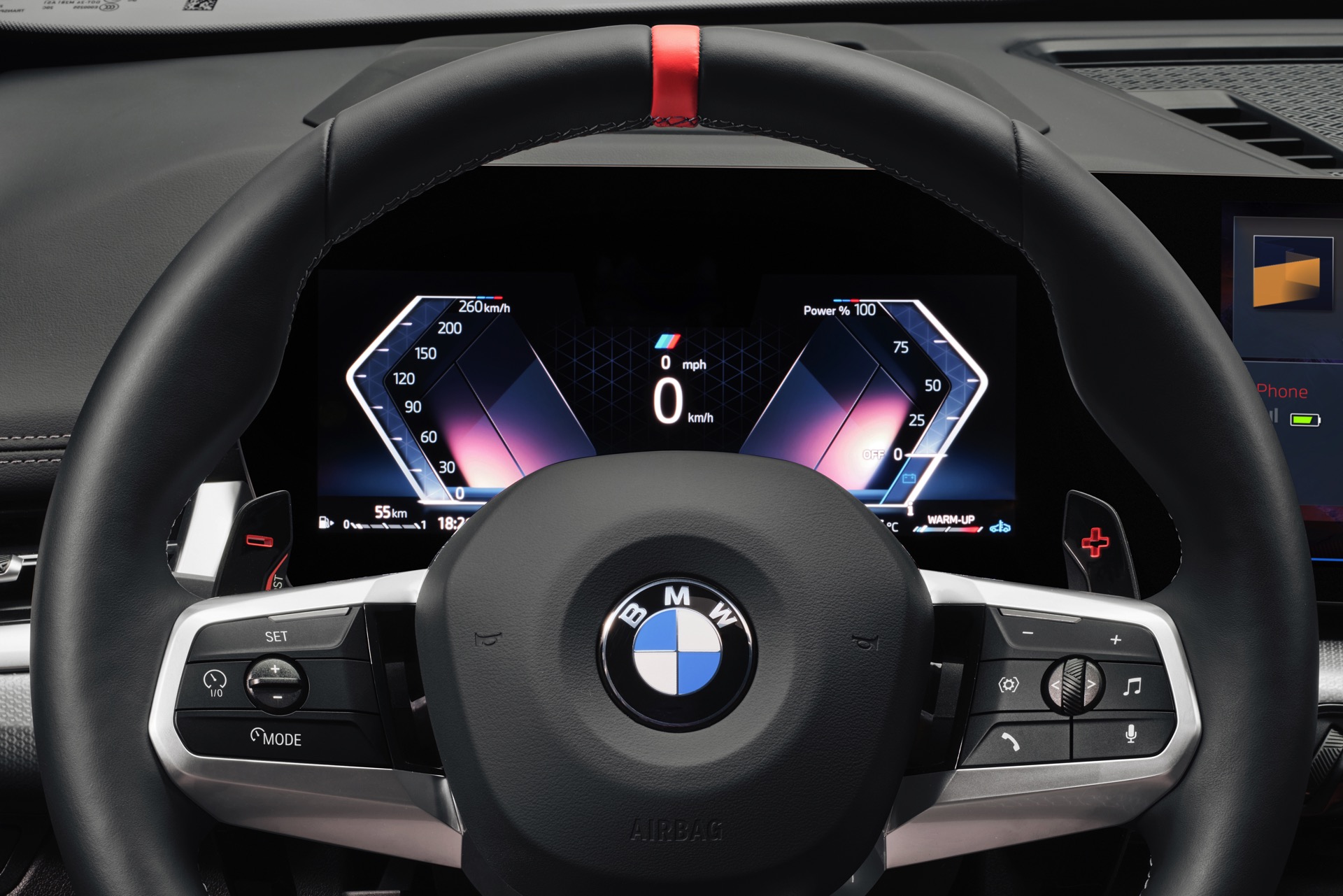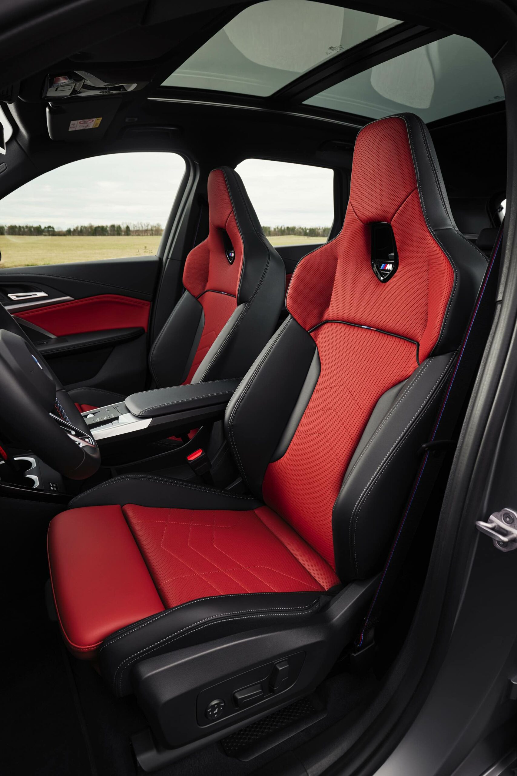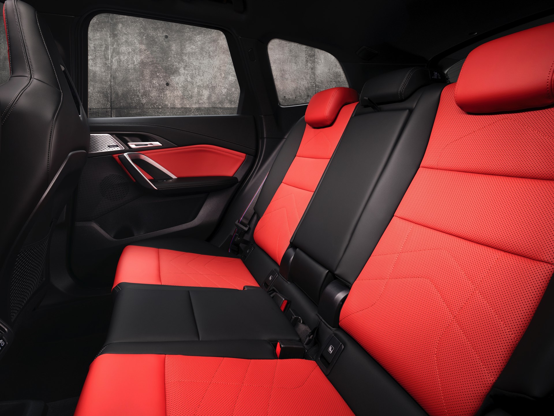 Im Innenraum setzt sich der X1 M35i auf Wusch mit M Sportsitzen samt beleuchtetem M-Logo und integrierten Kopfstützen von den übrigen X1 ab, auf den ersten Fotos sehen wir die neuen Sitze in einer auffälligen Farb-Kombination mit Schwarz und Rot. Auf dem Curved Display wird von Anfang an das Infotainment-System iDrive 9 mit überarbeitetem Einstiegsbildschirm als Hauptmenü und zusätzlichen QuickSelect-Shortcuts zum Einsatz kommen. Auf einen iDrive-Controller müssen X1-Kunden dabei auch weiterhin verzichten, die Bedienung erfolgt primär über Sprachsteuerung und Touchscreen.
