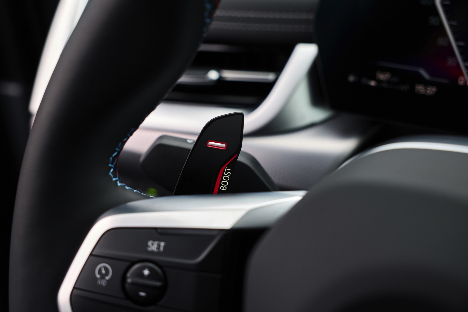 Als eines der letzten neuen M-Modelle setzt der BMW X1 M35i auf ein 7-Gang-DKG. Es ist mit der Funktion “M Sport Boost” ausgerüstet, bei der durch langes Ziehen des linken Schaltpaddles alle Systeme auf volle Beschleunigung justiert werden können. Die zu übertragende Kraft stammt vom 2,0 Liter großen Vierzylinder B48 mit angepasster Ladeluftkühlung, variabler Nockenwellensteuerung VANOS, vollvariabler Ventilsteuerung Valvetronic, Miller-Brennverfahren, robusterem Kurbeltrieb und optimierter Ölversorgung sowie Hauptlagerschalen und -Deckeln von aktuellen Reihensechszylinder-Motoren. Die resultierenden 300 PS stellt der Vierzylinder auf einem Plateau zwischen 5.750 und 6.500 U/min bereit, das maximale Drehmoment von 400 Newtonmeter liegt in einem breiten Fenster von 2.000 bis 4.500 U/min an.
