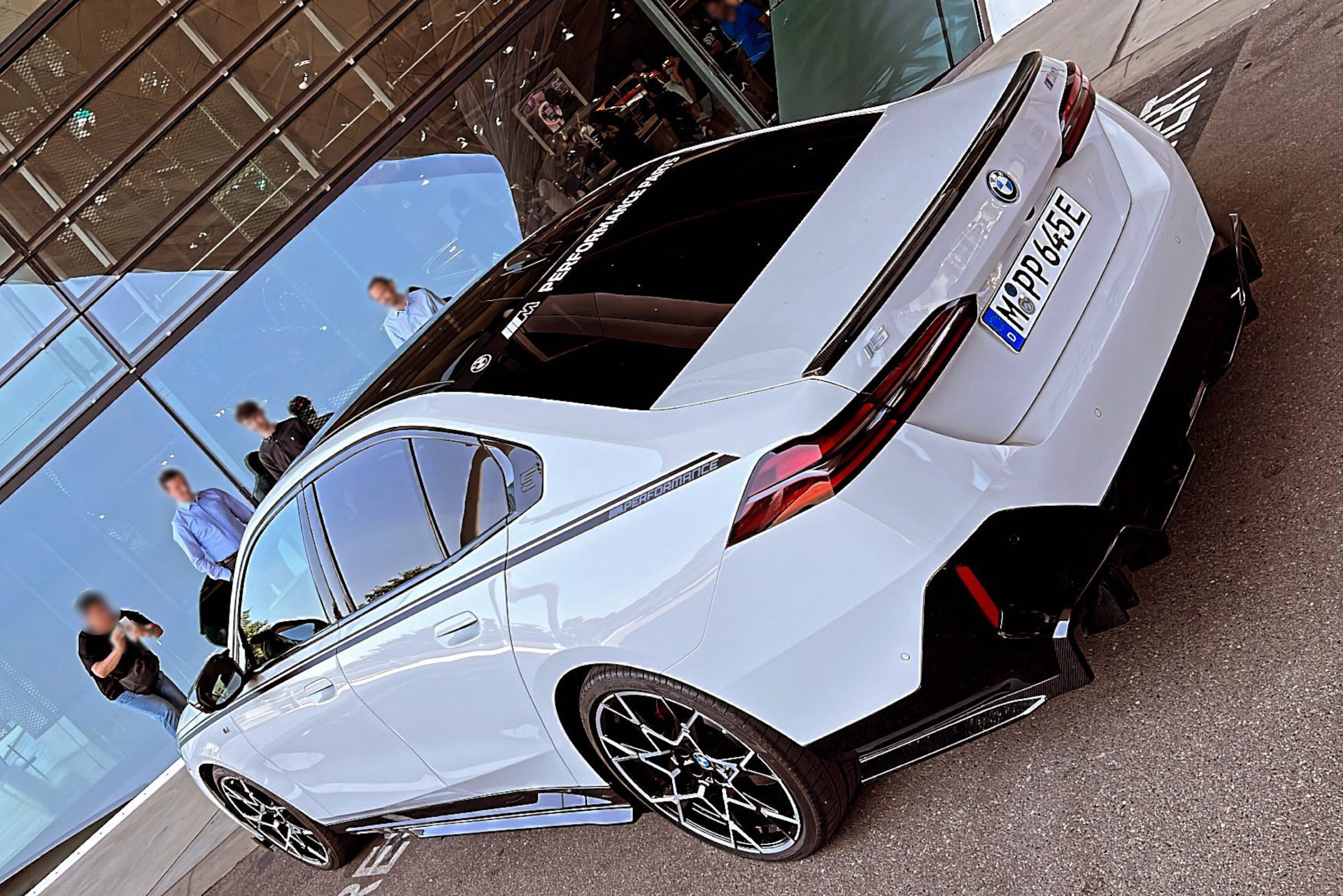 Das schwarze Dach erinnert zwar auf den ersten Blick an ein Carbon-Dach, es dürfte sich aber eher um das große Panorama-Glasdach als um die von Sportfahrern gewünschte Leichtbau-Maßnahme am höchsten Punkt des Fahrzeugs handeln. Unabhängig davon ist der 601 PS starke i5 M60 in der Lage, in nur 3,8 Sekunden von 0 auf 100 km/h zu sprinten und 230 km/h Höchstgeschwindigkeit zu erreichen. Auf kurvigen Strecken dürfte ihm der auch mit Panorama-Glasdach extrem niedrige Schwerpunkt helfen, schließlich befindet sich im Unterboden der schwere Lithium-Ionen-Akku. Neben einem tiefen Schwerpunkt sorgt der Akku auch dafür, dass zwischen zwei Ladestopps bis zu 516 Kilometer Elektro-Reichweite zur Verfügung stehen.