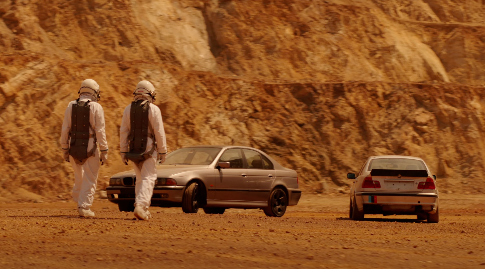 Wenn alle irdischen Strecken zum Driften bereits quer befahren wurden, muss man eben in die Ferne schweifen – und mit der BMW Mixed Reality ist unser Planet jedenfalls nur einer von vielen, der als Drift-Strecke genutzt werden kann! Im jüngsten Video mit den Red Bull Driftbrothers sehen wir jedenfalls, dass so auch die Mars-Oberfläche zur Drift-Kulisse werden kann, während statt einem typischen Mars-Rover etwas ältere BMW-Modelle zum Einsatz kommen: Elias und Johannes Hountondji dürfen im Raumanzug ans Steuer eines 3ers aus der Generation E46 und eines etwa gleichaltrigen 5er (E39) und mit den beiden bayerischen Limousinen im Duett durch den roten Mars-Sand driften – bis ein riesiger Radlader ins Bild fährt und offenbart, dass die Szenerie doch eher irdisch ist.