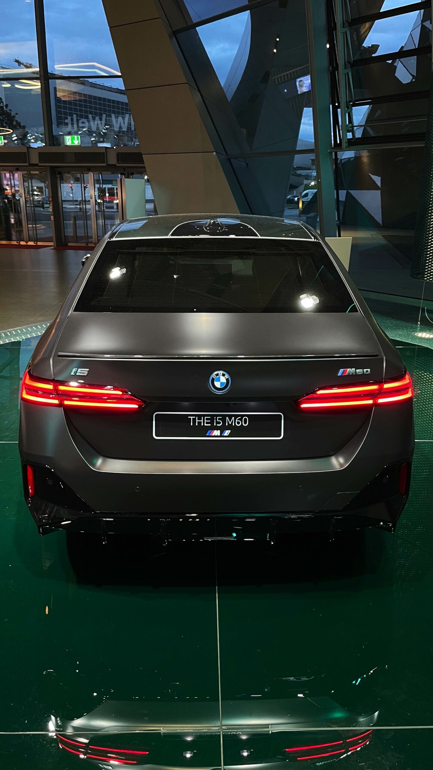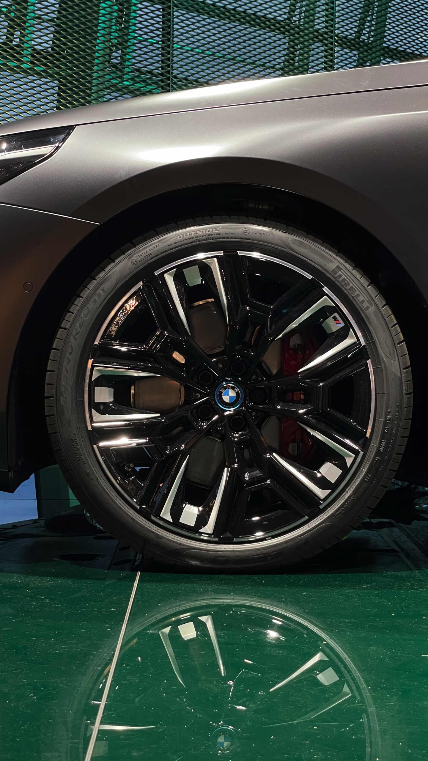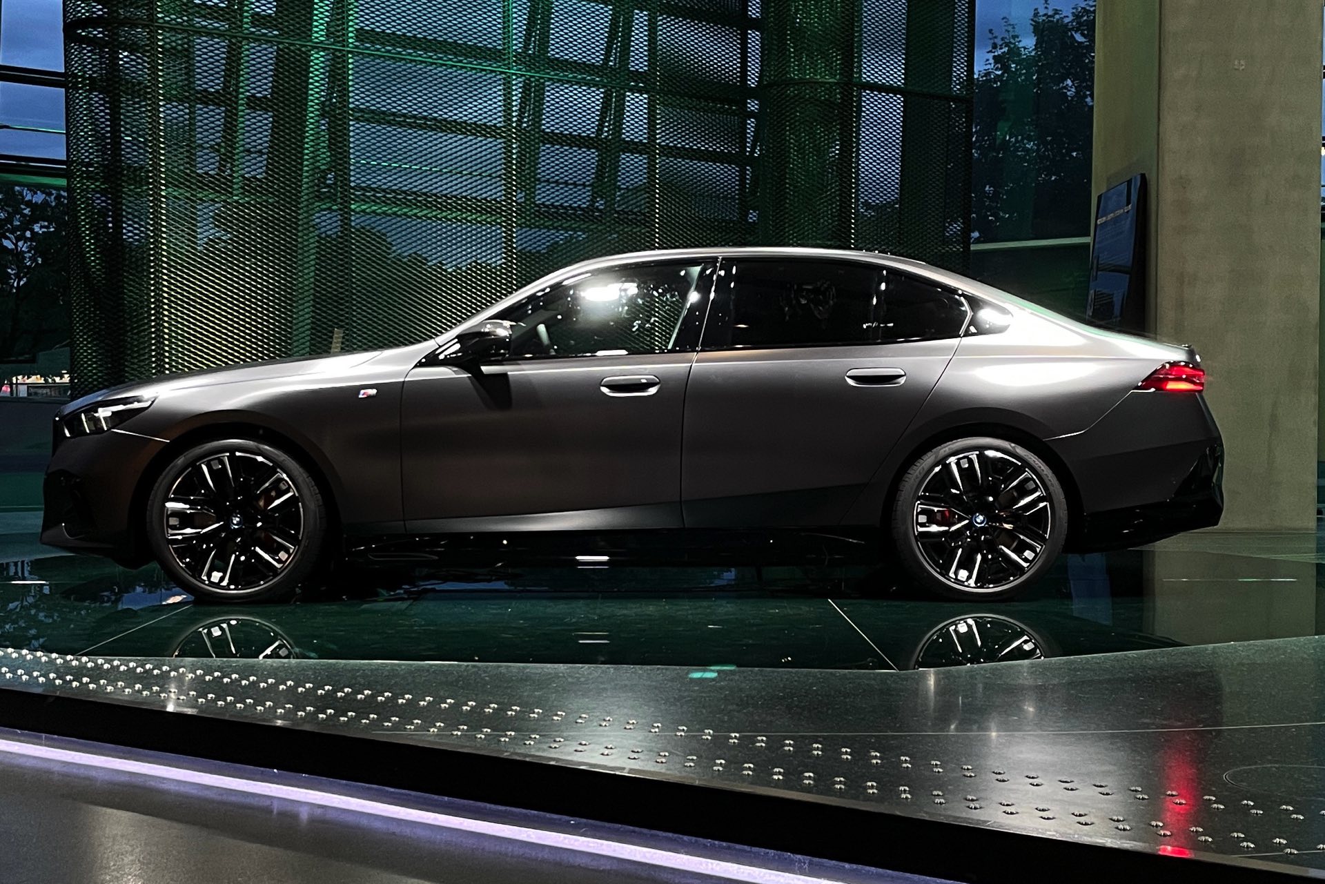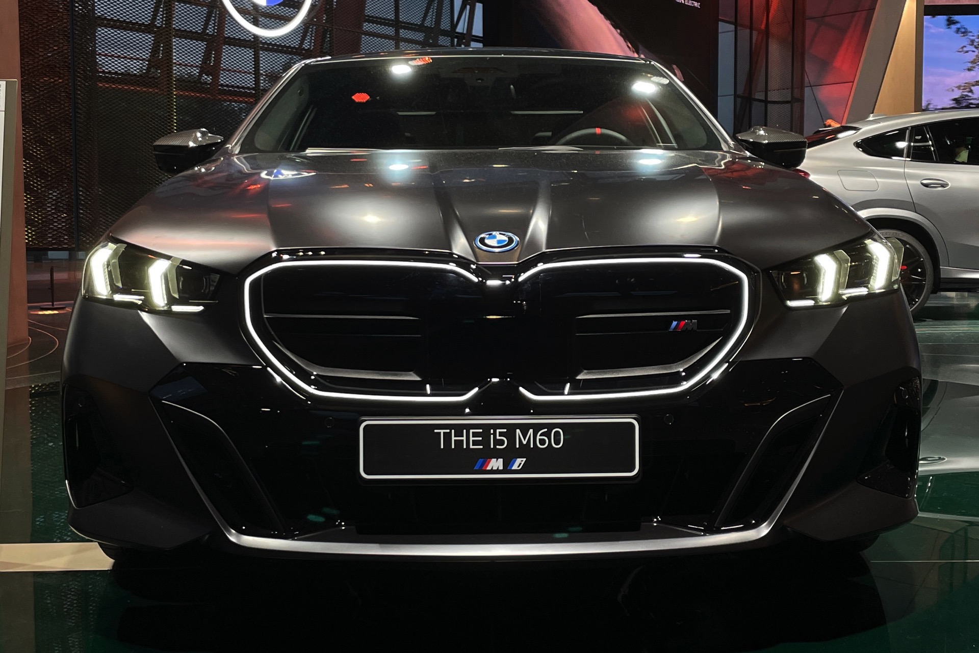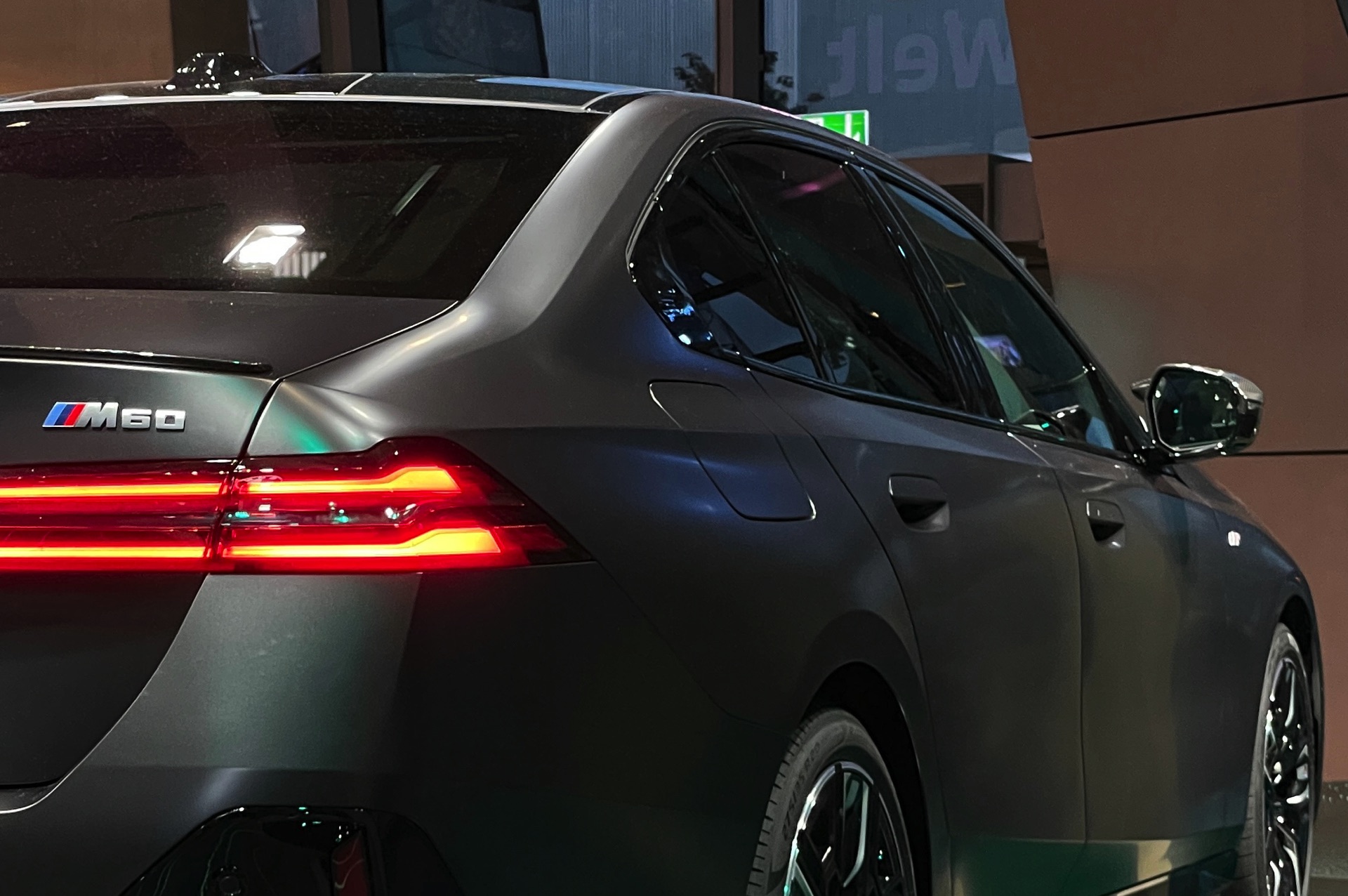 Wie schon der von uns vorgestellte BMW i5 M60 in Fire Red trägt auch das aktuelle Ausstellungsfahrzeug in der BMW Welt das M Sportpaket Pro und folglich die Nieren in Hochglanz-Schwarz. Serienmäßig ist die Nieren-Einfassung auch im Fall des BMW i5 M60 in Aluminium gehalten, aber in der M Sport Pro-Ausführung mit erweiterter Shadow Line bleibt der (vorerst) stärkste 5er (G60) konsequent auf der dunklen Seite. Weitere Bestandteile des M Sportpakets Pro sind unter anderem die M Leuchten Shadow Line mit dunklen Akzenten hinter der gläsernen Abdeckung, die M Heckspoiler-Lippe und die M Sportbremse mit roten Sätteln. Letztere sind auf den Live-Fotos aus der BMW Welt lediglich zu erahnen, weil die 20 Zoll großen Aerodynamikräder 940 M Bicolor Jetblack für einen möglichst geringen Luftwiderstand größtenteils geschlossen sind.