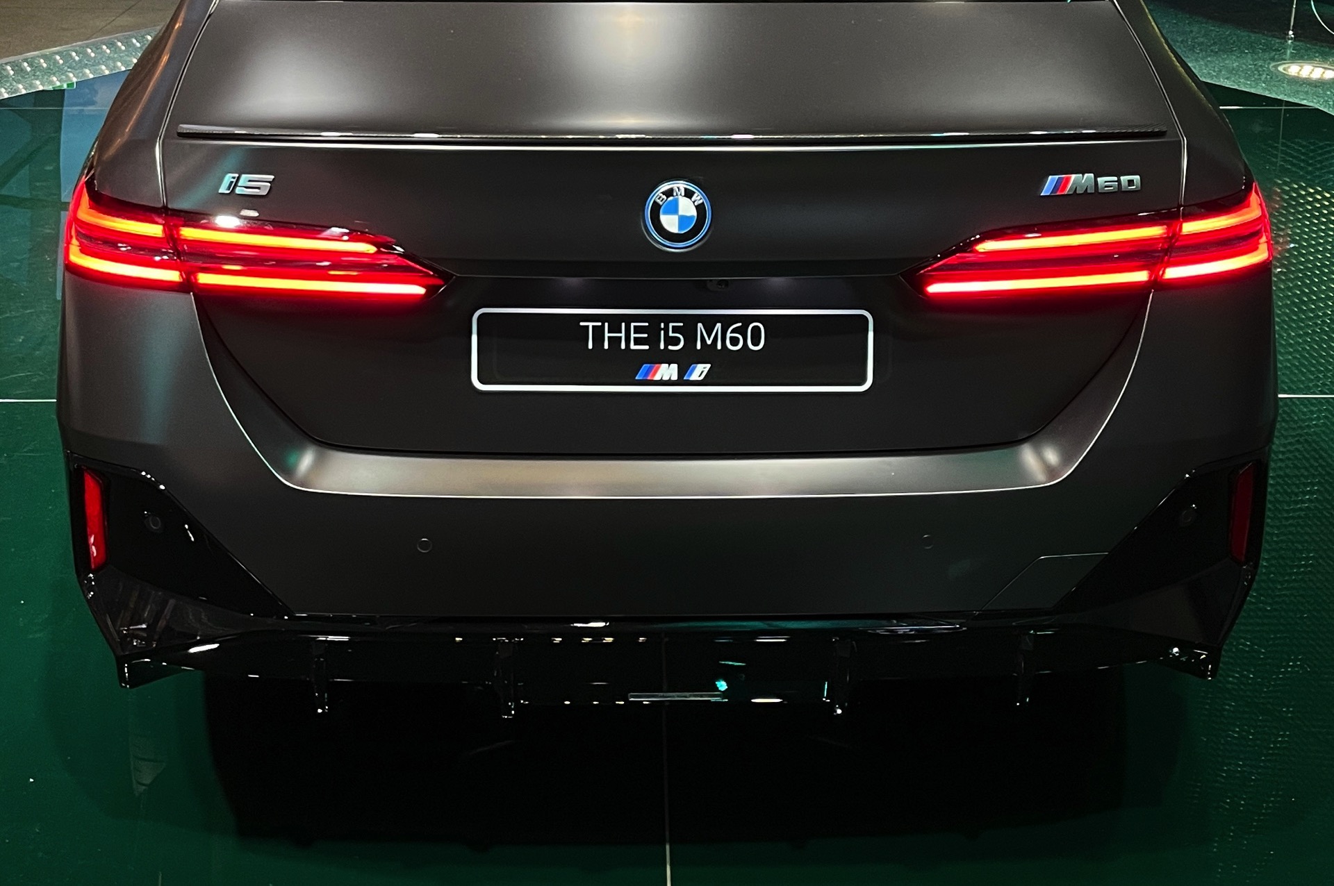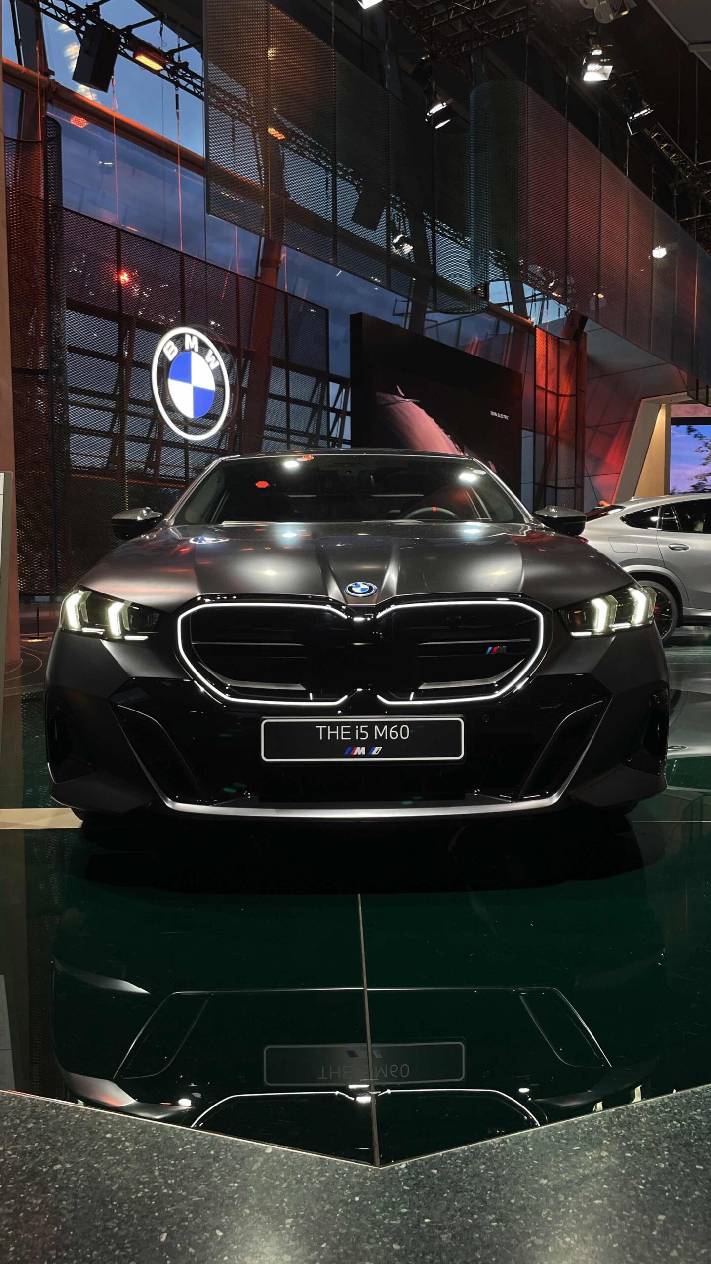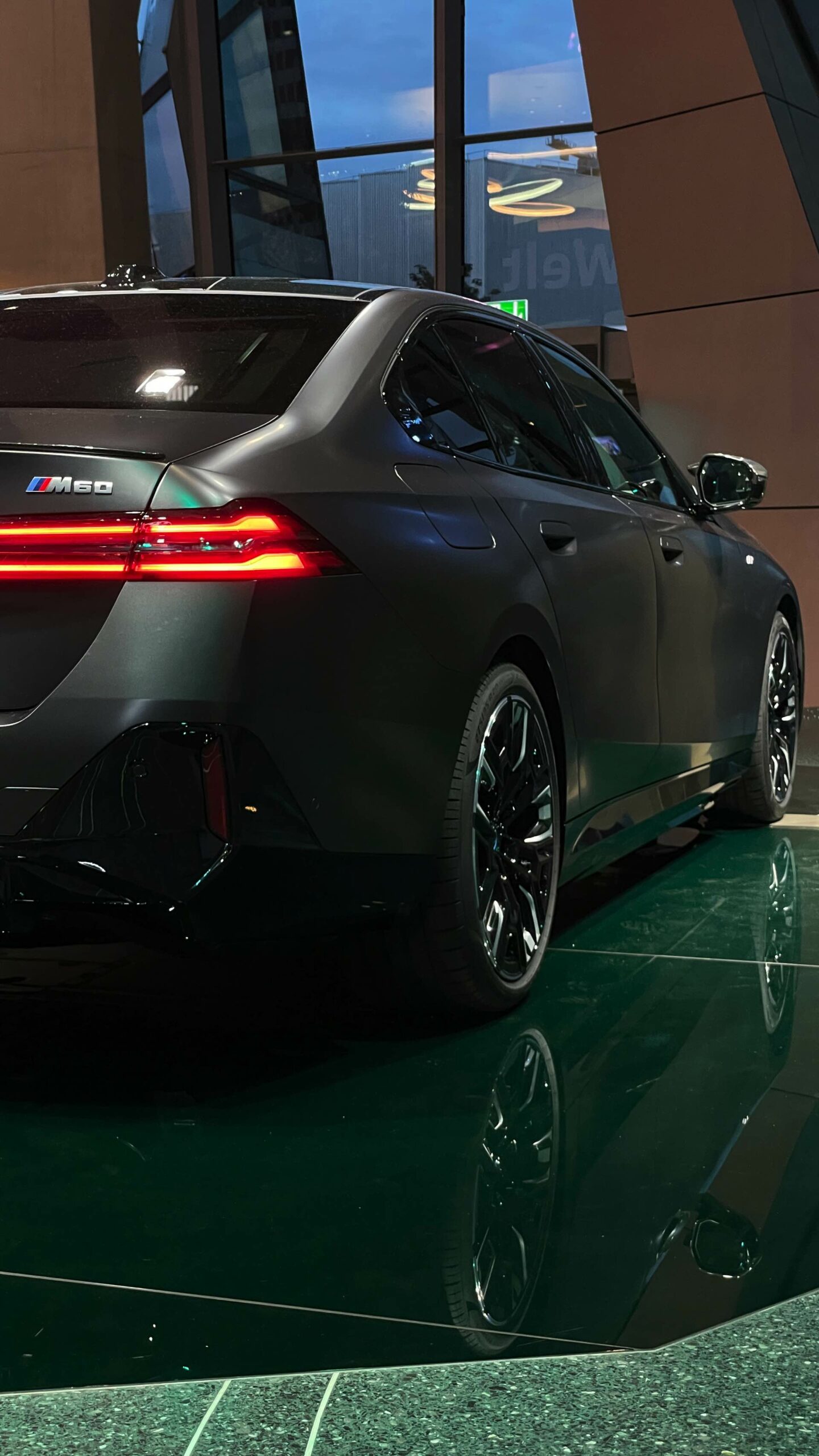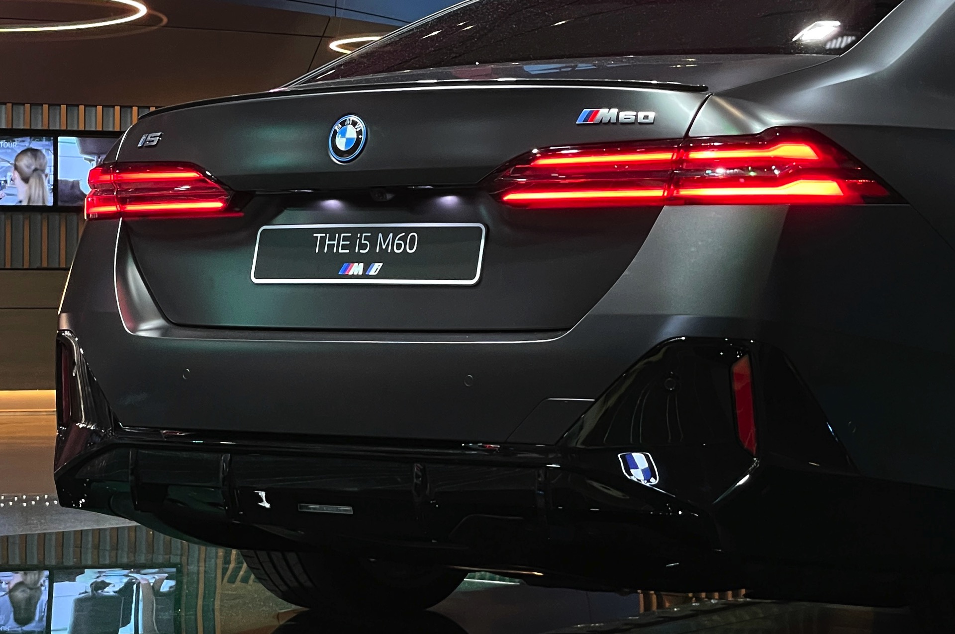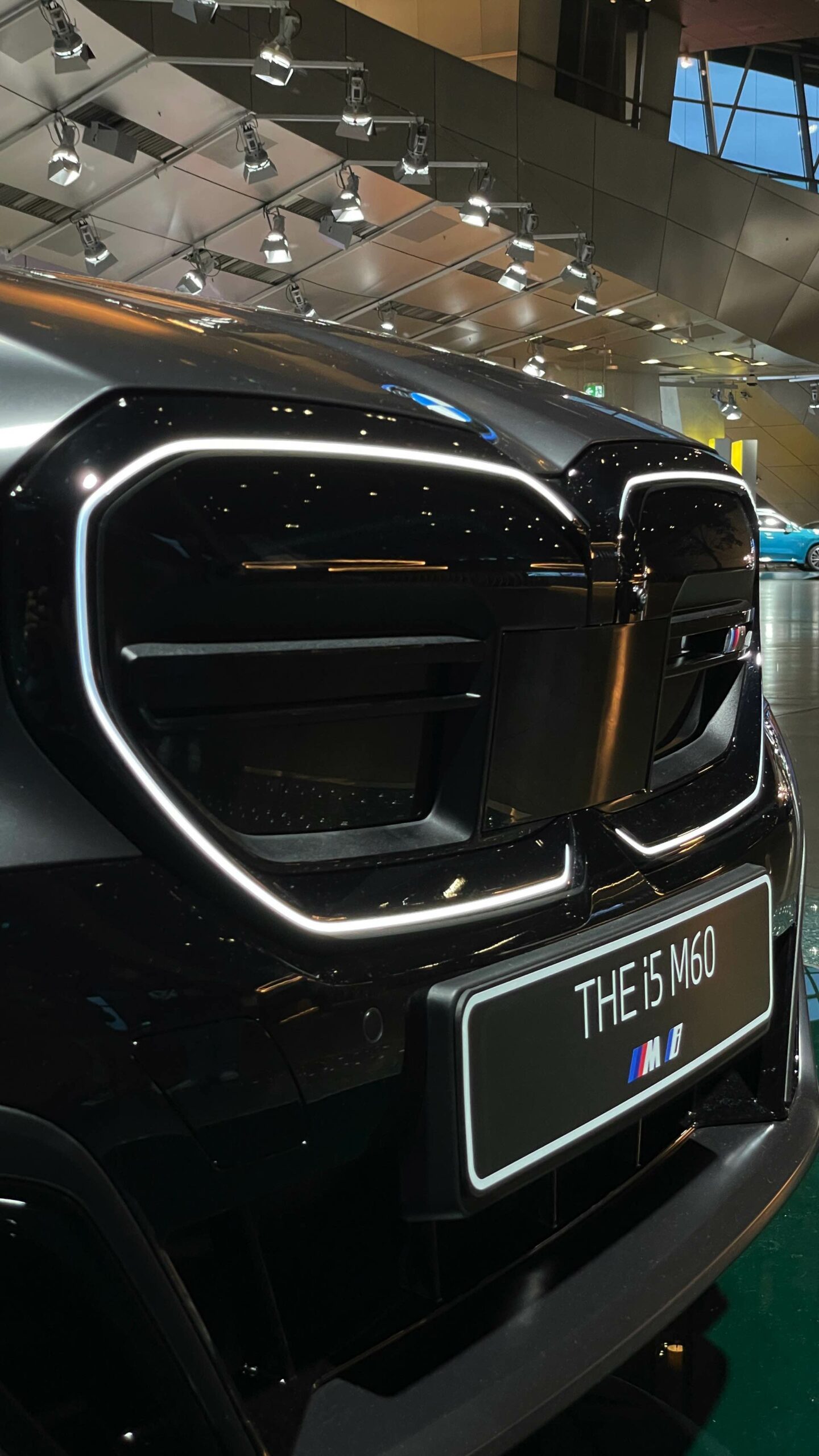 Wie schon der von uns vorgestellte BMW i5 M60 in Fire Red trägt auch das aktuelle Ausstellungsfahrzeug in der BMW Welt das M Sportpaket Pro und folglich die Nieren in Hochglanz-Schwarz. Serienmäßig ist die Nieren-Einfassung auch im Fall des BMW i5 M60 in Aluminium gehalten, aber in der M Sport Pro-Ausführung mit erweiterter Shadow Line bleibt der (vorerst) stärkste 5er (G60) konsequent auf der dunklen Seite. Weitere Bestandteile des M Sportpakets Pro sind unter anderem die M Leuchten Shadow Line mit dunklen Akzenten hinter der gläsernen Abdeckung, die M Heckspoiler-Lippe und die M Sportbremse mit roten Sätteln. Letztere sind auf den Live-Fotos aus der BMW Welt lediglich zu erahnen, weil die 20 Zoll großen Aerodynamikräder 940 M Bicolor Jetblack für einen möglichst geringen Luftwiderstand größtenteils geschlossen sind.