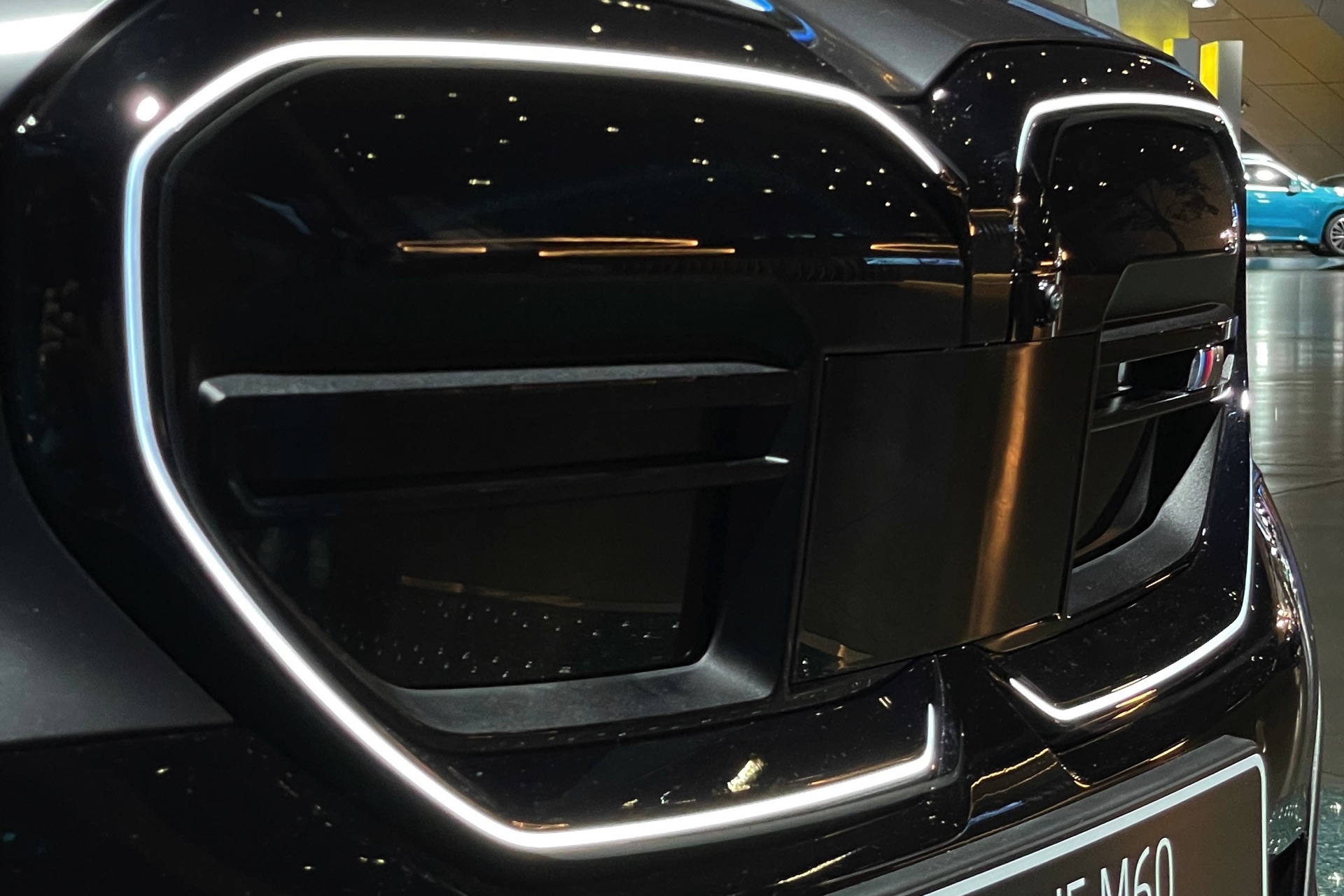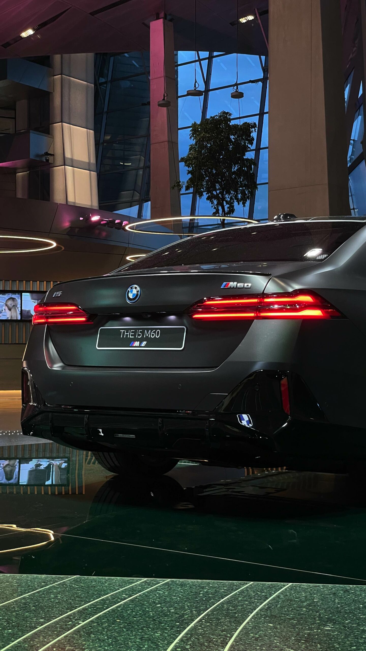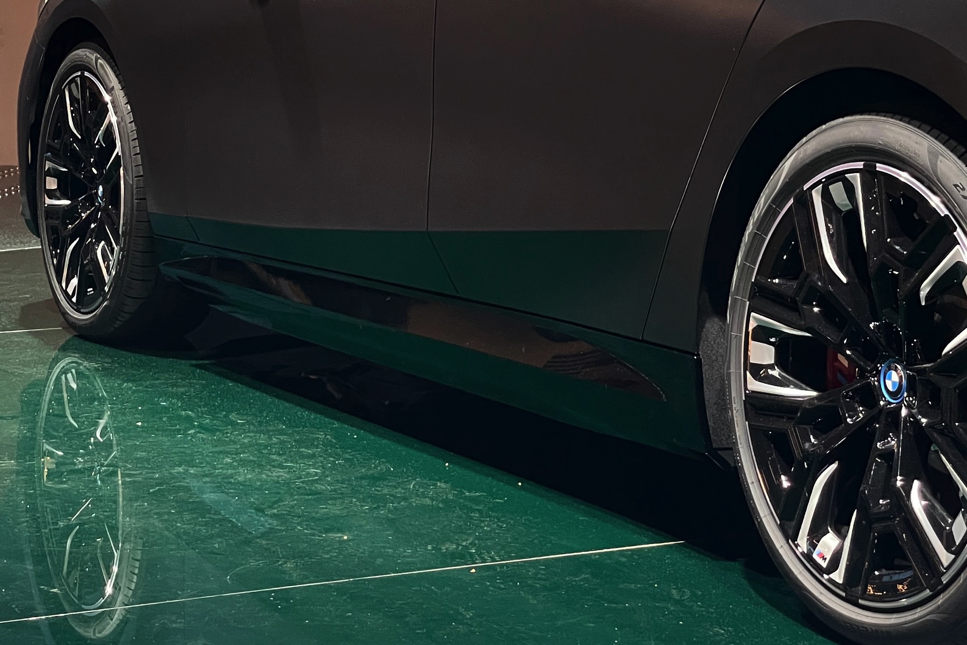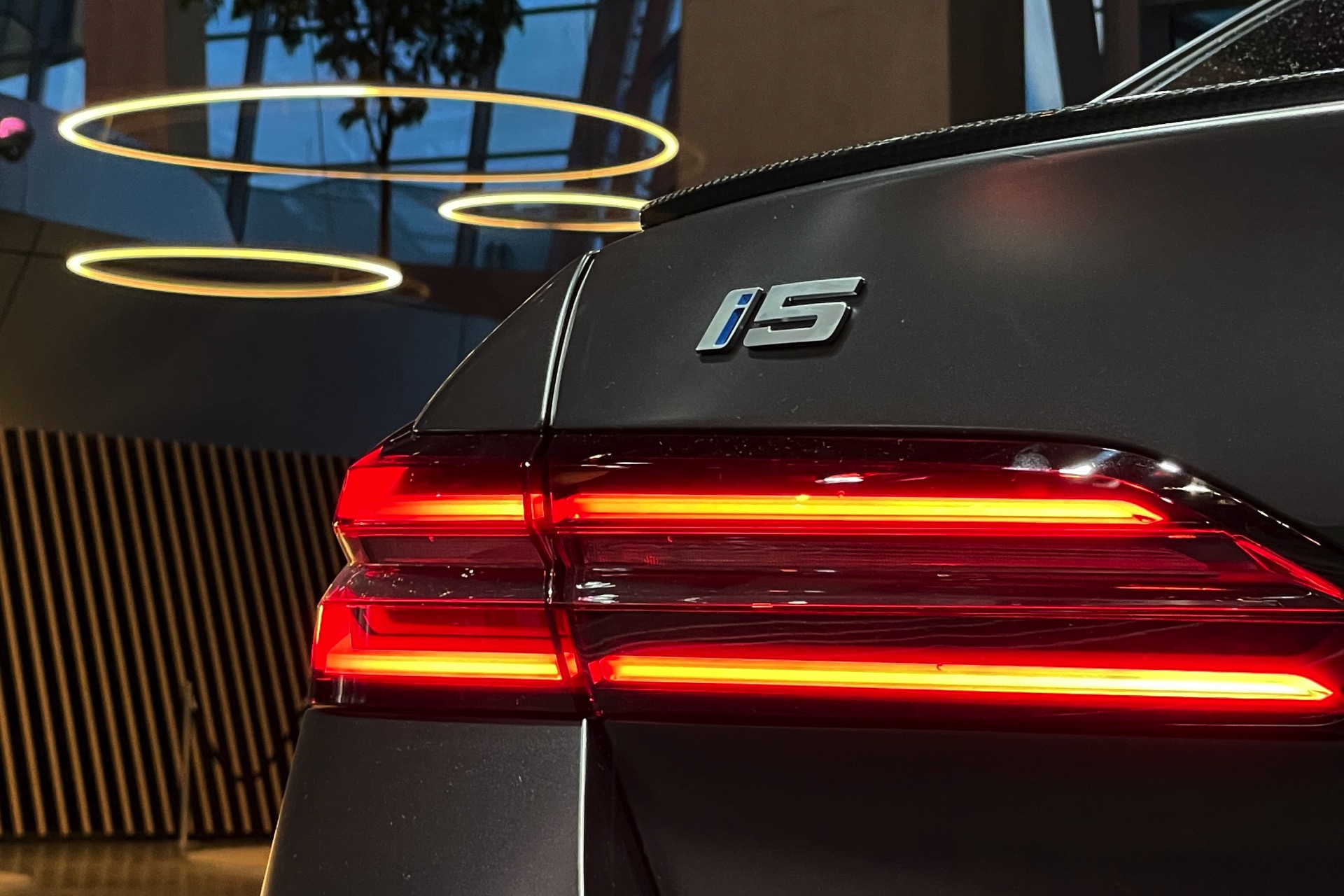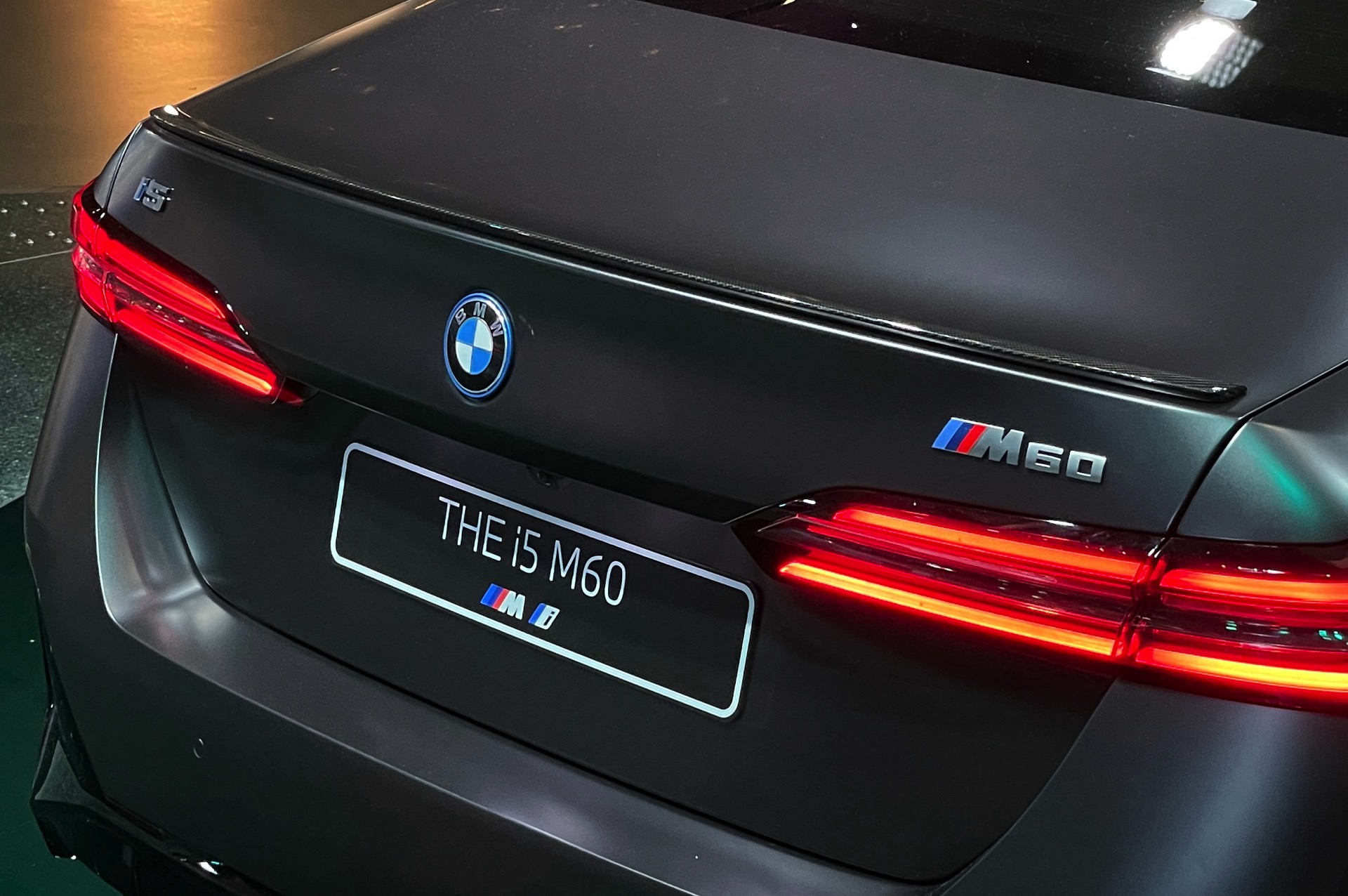Wie schon der von uns vorgestellte BMW i5 M60 in Fire Red trägt auch das aktuelle Ausstellungsfahrzeug in der BMW Welt das M Sportpaket Pro und folglich die Nieren in Hochglanz-Schwarz. Serienmäßig ist die Nieren-Einfassung auch im Fall des BMW i5 M60 in Aluminium gehalten, aber in der M Sport Pro-Ausführung mit erweiterter Shadow Line bleibt der (vorerst) stärkste 5er (G60) konsequent auf der dunklen Seite. Weitere Bestandteile des M Sportpakets Pro sind unter anderem die M Leuchten Shadow Line mit dunklen Akzenten hinter der gläsernen Abdeckung, die M Heckspoiler-Lippe und die M Sportbremse mit roten Sätteln. Letztere sind auf den Live-Fotos aus der BMW Welt lediglich zu erahnen, weil die 20 Zoll großen Aerodynamikräder 940 M Bicolor Jetblack für einen möglichst geringen Luftwiderstand größtenteils geschlossen sind.