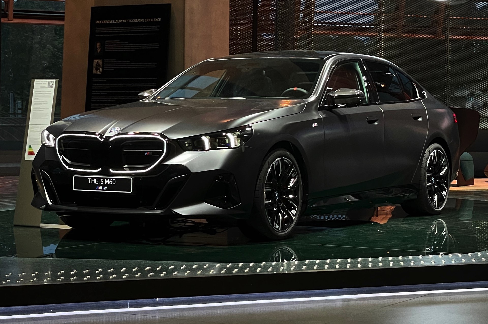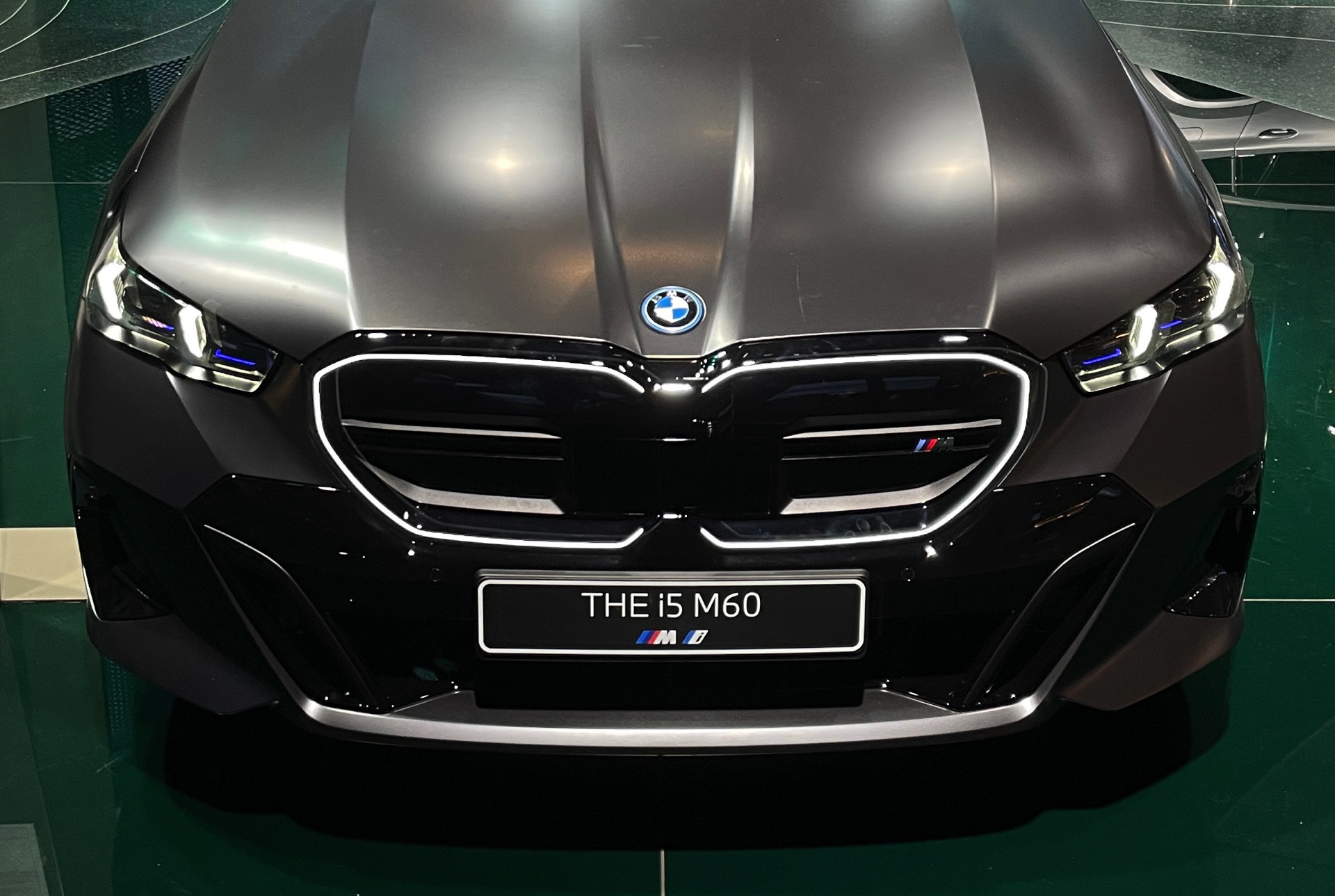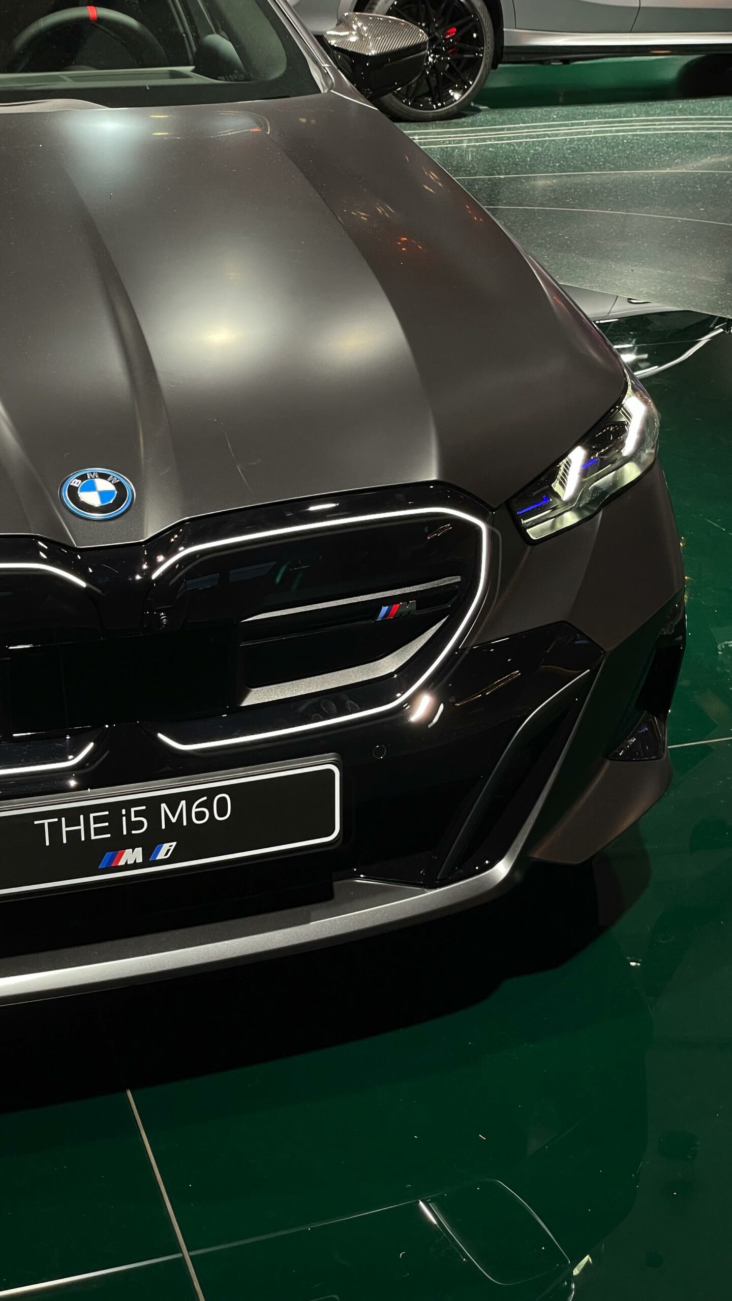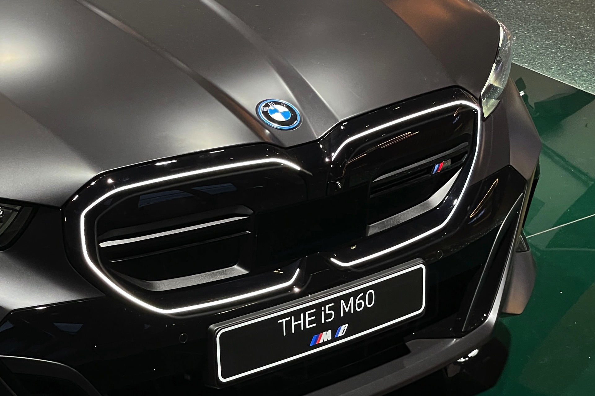 Bis zum Marktstart des neuen BMW i5 M60 und auch der übrigen Varianten der neuen 5er-Generation G60 ist noch etwas Geduld gefragt, aber in der BMW Welt München kann die Business-Limousine schon jetzt betrachtet werden. ChrisM2F87 hat die Gelegenheit genutzt und liefert uns einige der ersten Live-Fotos vom neuen Elektro-5er in Frozen Deep Grey: Die matte Individual-Lackierung in Dunkelgrau betont die Formen des i5 und hebt auch die beleuchteten Elemente besonders hervor. Das gilt nicht nur für die klassische Lichttechnik an Front und Heck, sondern auch für die beleuchteten Iconic Glow-Nieren, die dank der dezent illuminierten Einfassung für eine unverwechselbare Nachtoptik sorgen.