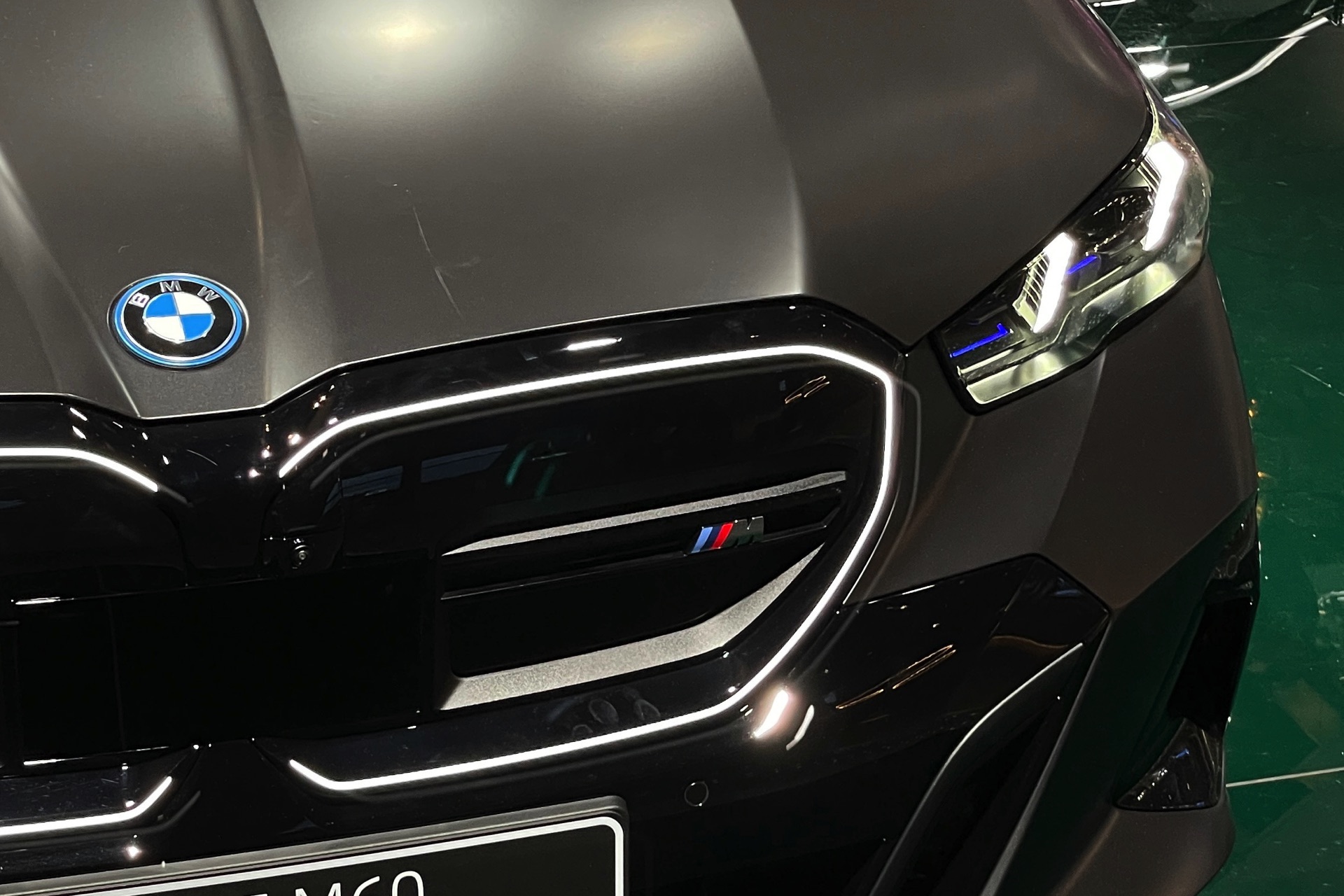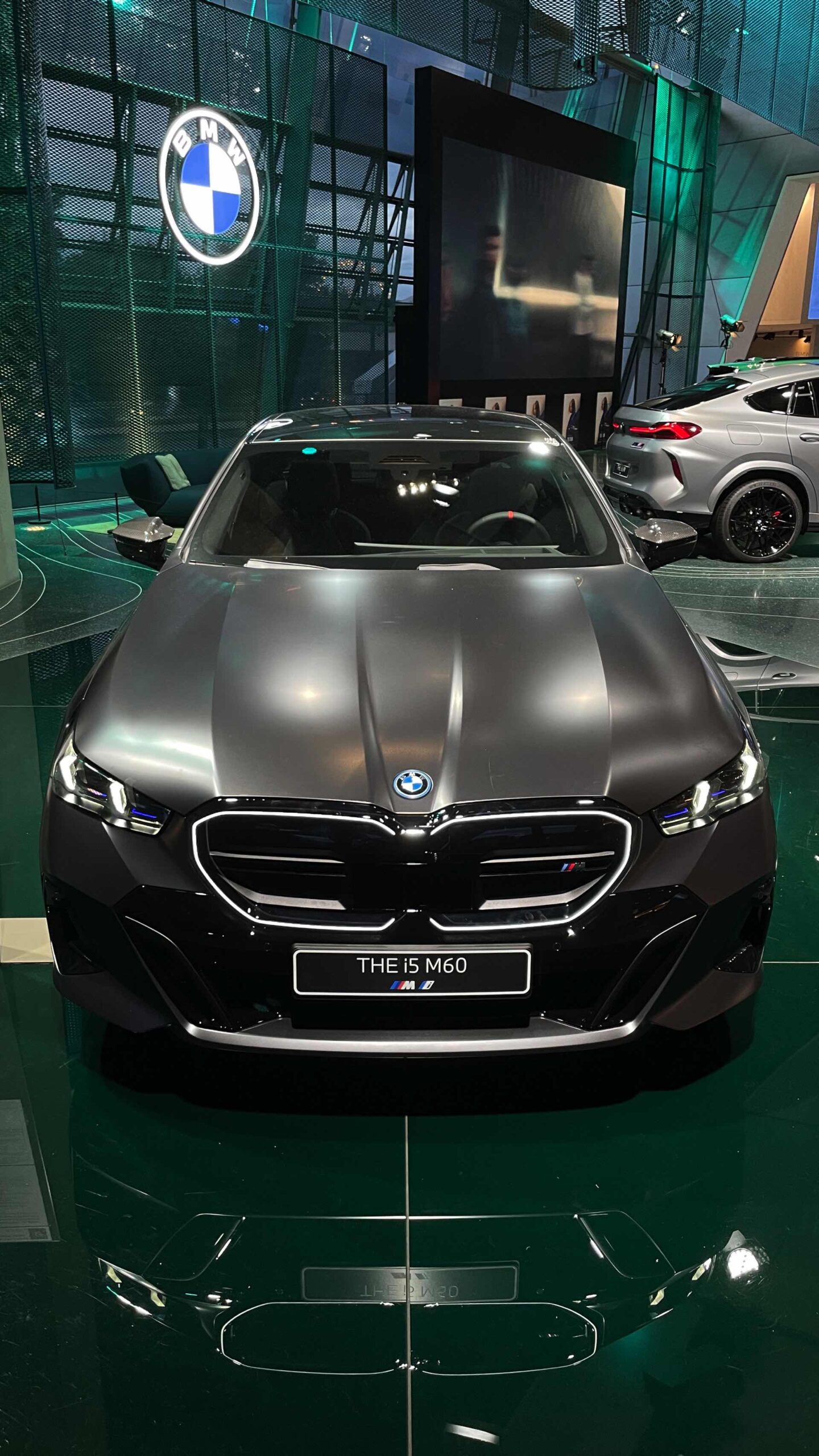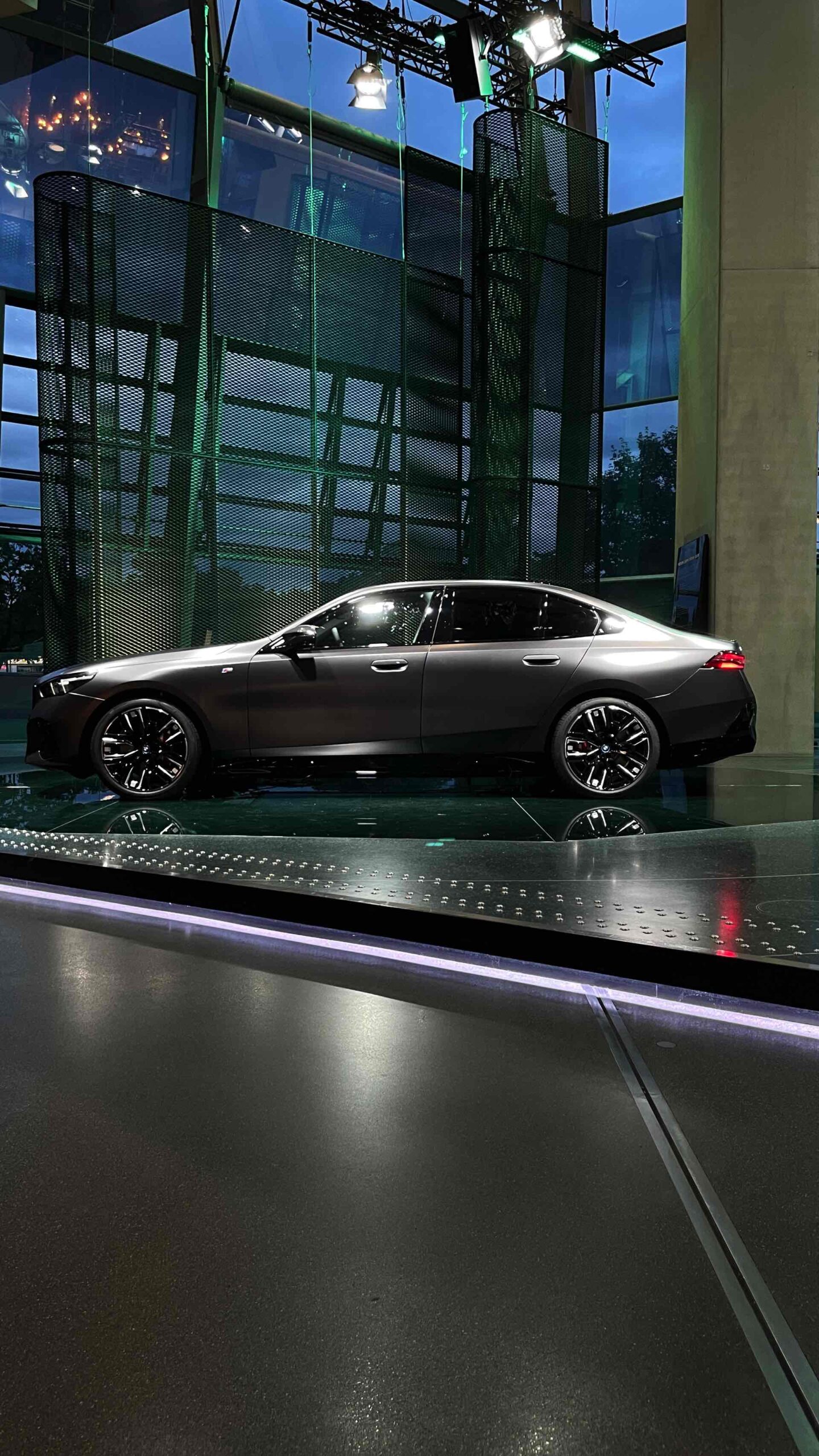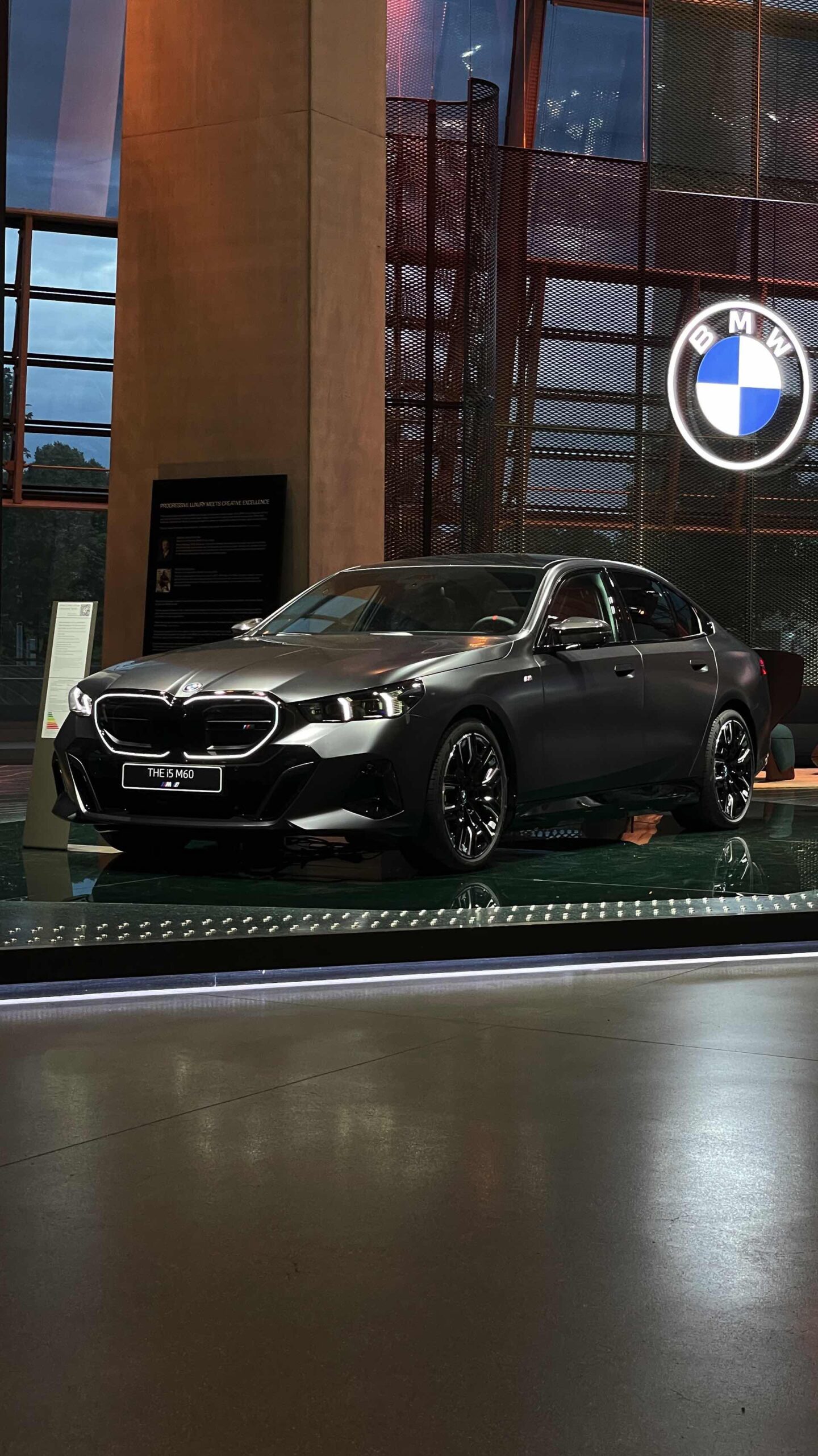 Bis zum Marktstart des neuen BMW i5 M60 und auch der übrigen Varianten der neuen 5er-Generation G60 ist noch etwas Geduld gefragt, aber in der BMW Welt München kann die Business-Limousine schon jetzt betrachtet werden. ChrisM2F87 hat die Gelegenheit genutzt und liefert uns einige der ersten Live-Fotos vom neuen Elektro-5er in Frozen Deep Grey: Die matte Individual-Lackierung in Dunkelgrau betont die Formen des i5 und hebt auch die beleuchteten Elemente besonders hervor. Das gilt nicht nur für die klassische Lichttechnik an Front und Heck, sondern auch für die beleuchteten Iconic Glow-Nieren, die dank der dezent illuminierten Einfassung für eine unverwechselbare Nachtoptik sorgen.