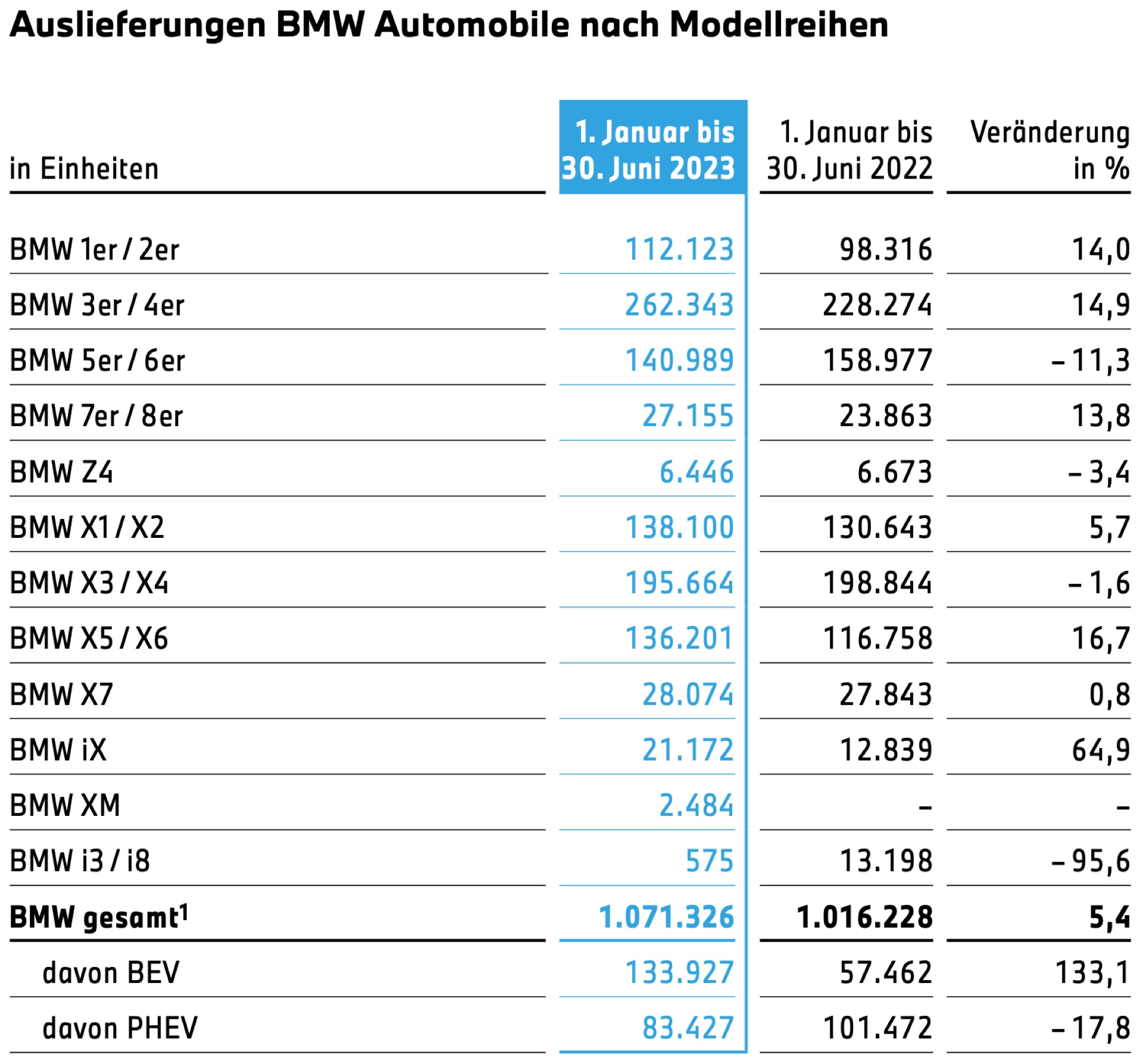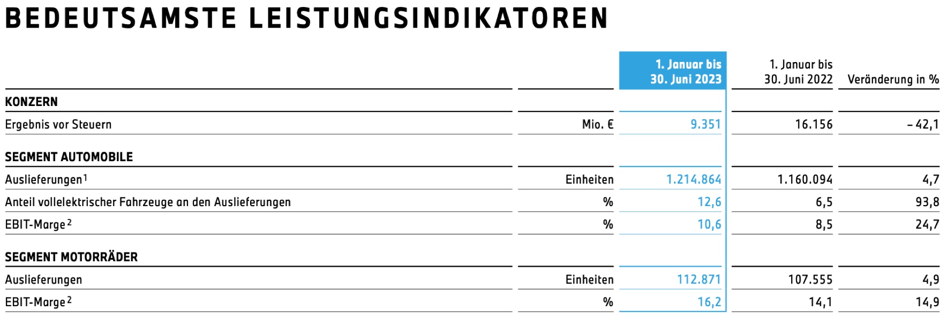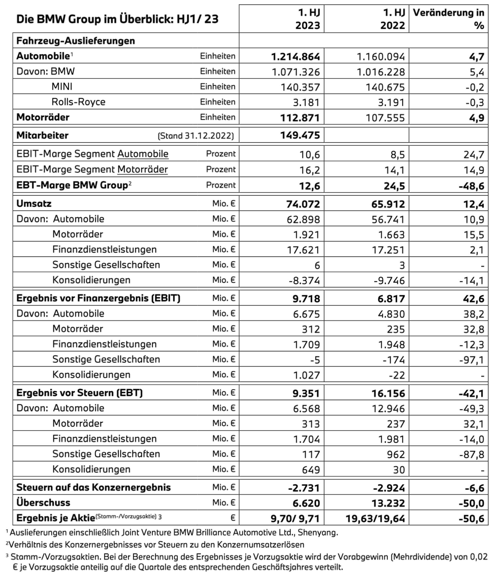 Auf der Basis einer stabilen Nachfrage kann die BMW Group wie angekündigt starke Halbjahres-Zahlen vermelden. In den ersten sechs Monaten konnten die Automobil-Auslieferungen um 4,7 Prozent auf 1.214.864 Einheiten gesteigert werden. Noch wichtiger ist aber, dass der Umsatz parallel um 12,4 Prozent gesteigert werden und folglich auch die EBIT-Marge deutlich zulegen konnte: Waren es im Vorjahr noch 8,5 Prozent, sind es im ersten Halbjahr 2023 deutlich höhere 10,6 Prozent. Zwar fiel die Marge im zweiten Quartal schwächer als im ersten aus, sie bewegte sich mit 9,2 Prozent aber weiterhin deutlich über Vorjahr und auf unstrittig hohem Niveau.