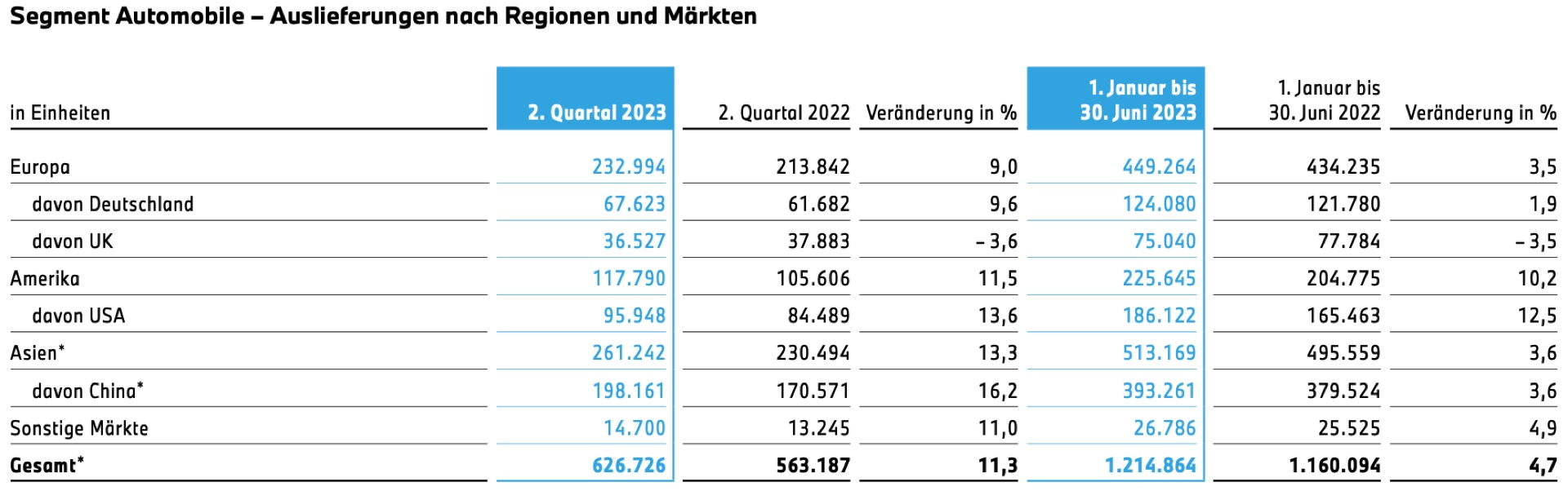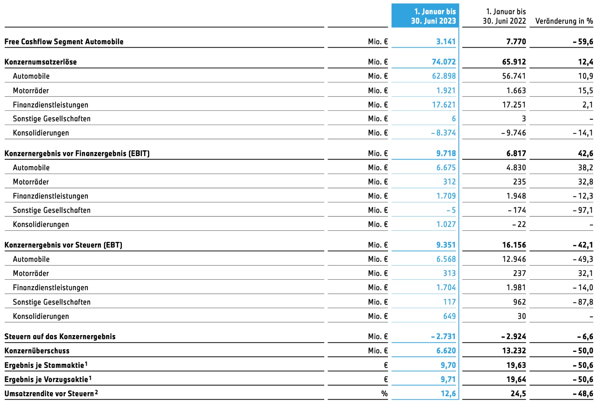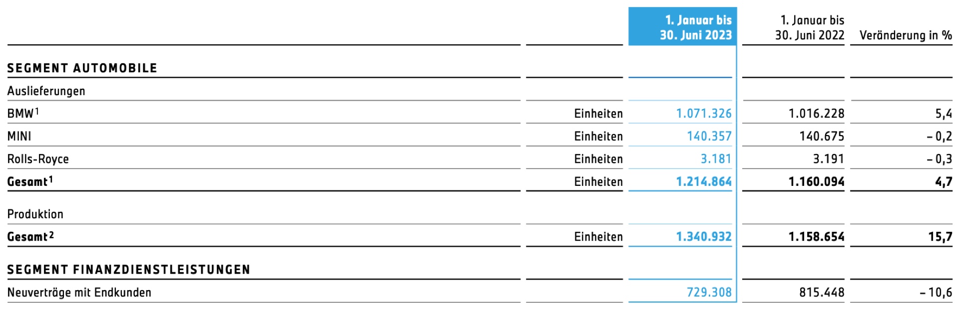 Auf der Basis einer stabilen Nachfrage kann die BMW Group wie angekündigt starke Halbjahres-Zahlen vermelden. In den ersten sechs Monaten konnten die Automobil-Auslieferungen um 4,7 Prozent auf 1.214.864 Einheiten gesteigert werden. Noch wichtiger ist aber, dass der Umsatz parallel um 12,4 Prozent gesteigert werden und folglich auch die EBIT-Marge deutlich zulegen konnte: Waren es im Vorjahr noch 8,5 Prozent, sind es im ersten Halbjahr 2023 deutlich höhere 10,6 Prozent. Zwar fiel die Marge im zweiten Quartal schwächer als im ersten aus, sie bewegte sich mit 9,2 Prozent aber weiterhin deutlich über Vorjahr und auf unstrittig hohem Niveau.