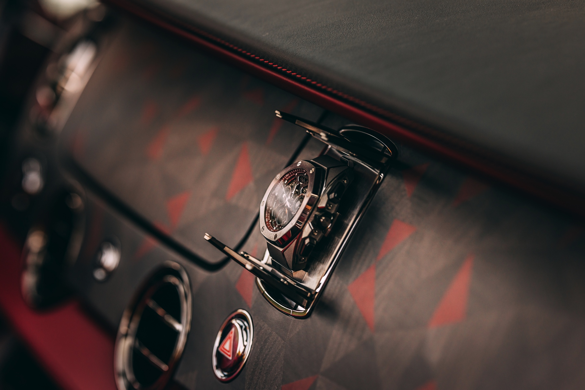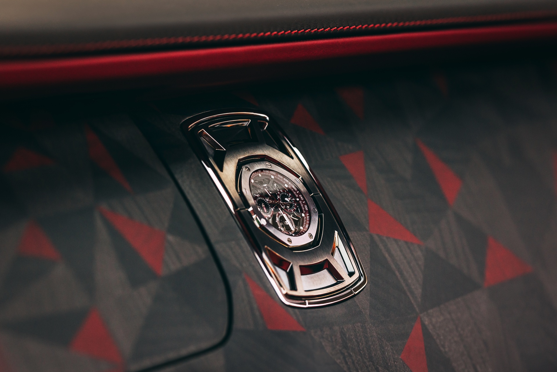 Dass im Innenraum ausschließlich feinste Materialien zum Einsatz kommen und Geld weder bei der Materialauswahl noch bei der Perfektion der Verarbeitung eine Rolle spielen, versteht sich selbst. Dass die Designer dem La Rose Noire aber auch eine völlig eigenständige Cockpit-Gestaltung spendiert haben, hebt die Exklusivität auf ein noch höheres Level. Highlight des Interieurs ist eine in aufwändigster Handarbeit entstandene Uhr von Audemars Piguet, die sich einerseits perfekt in die Armaturentafel einsetzen lässt – die aber auch herausgenommen und am Arm getragen werden kann.