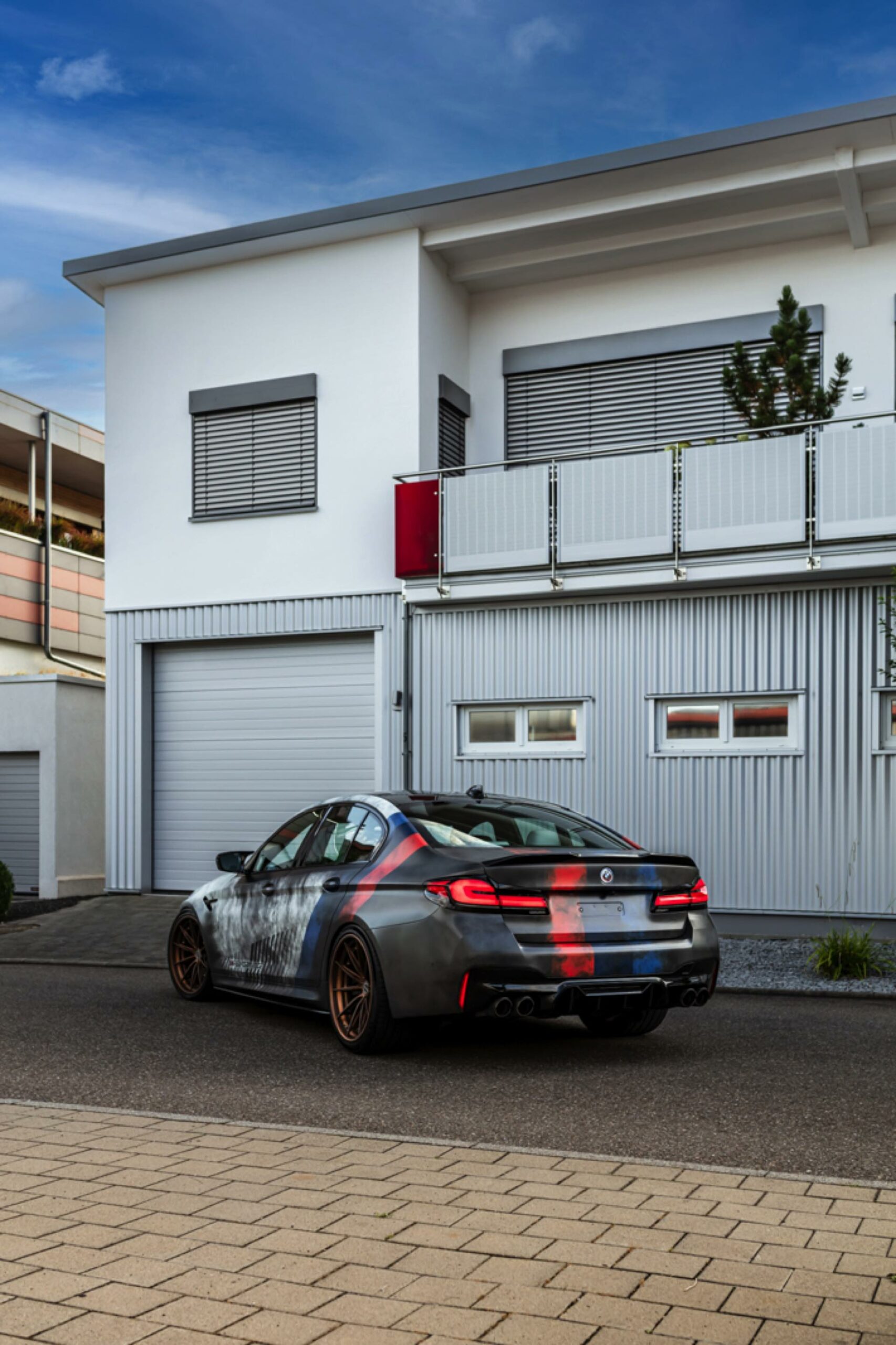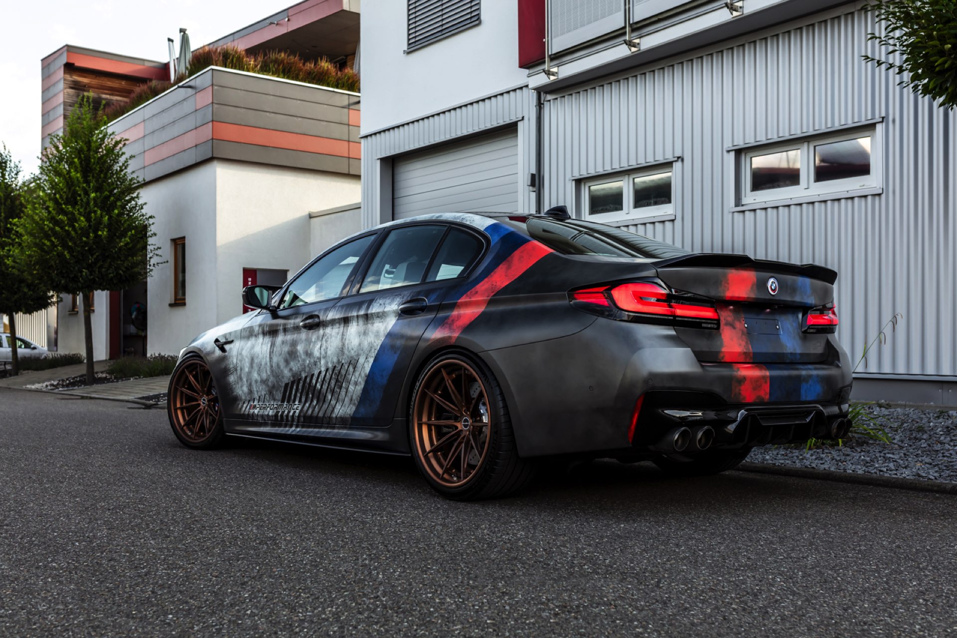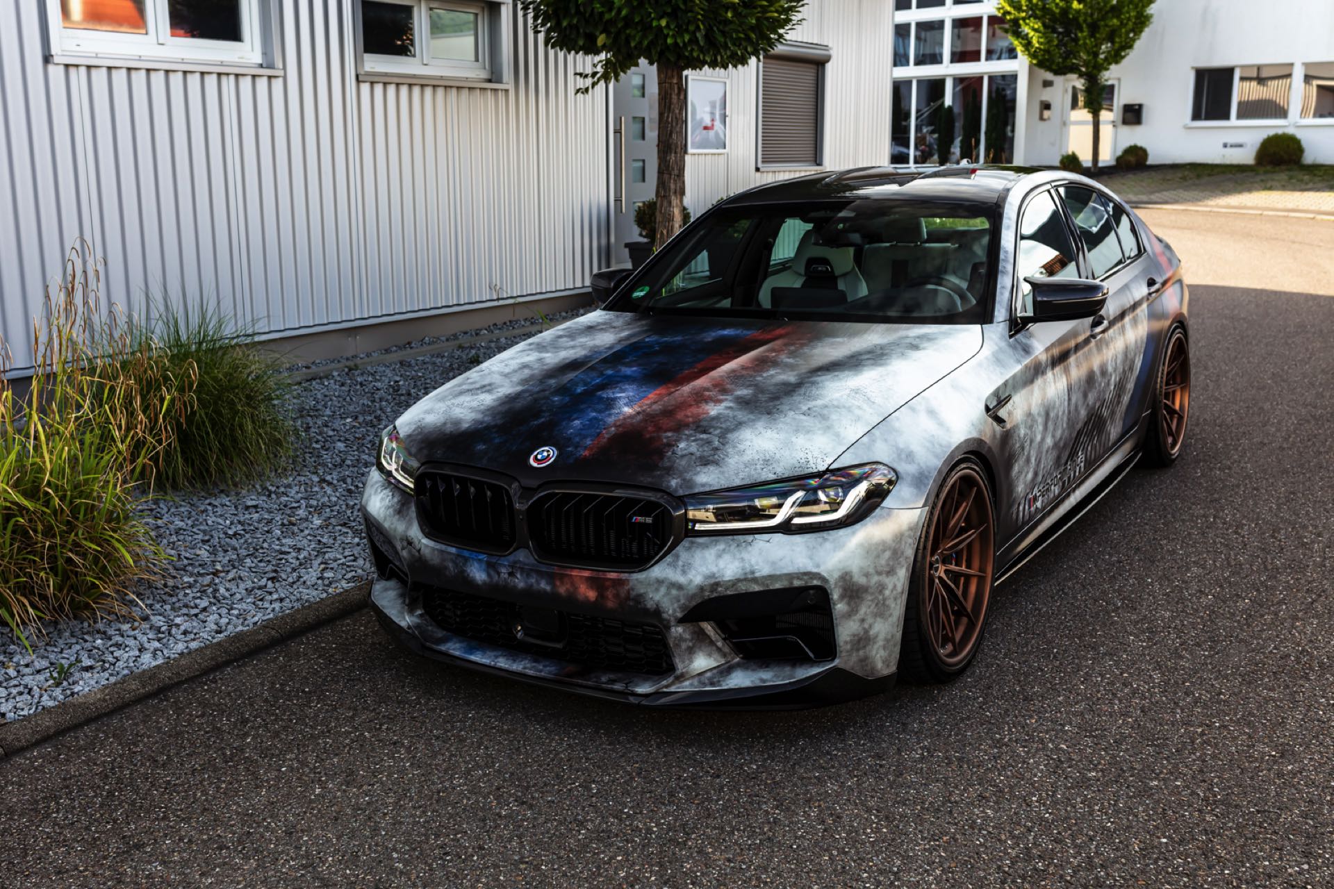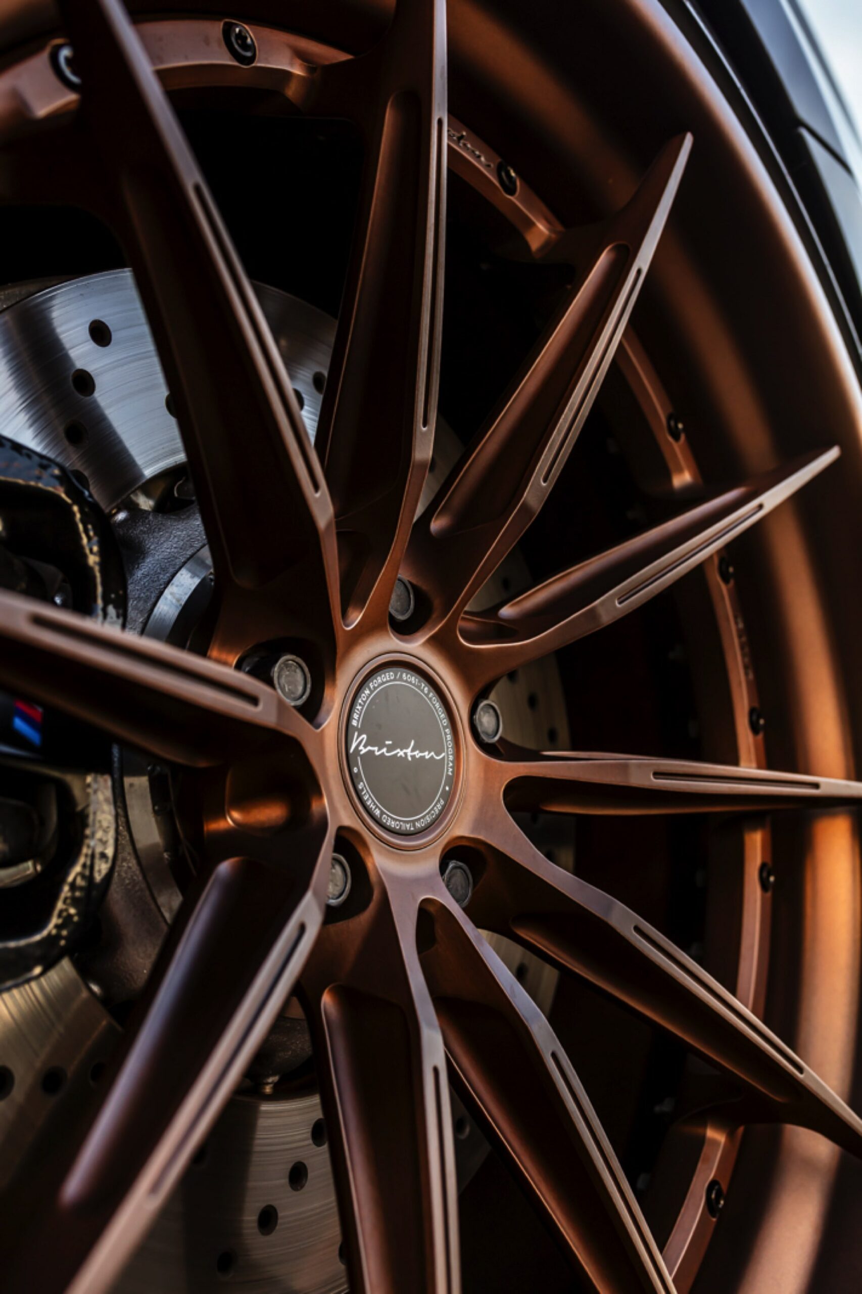 Dass der gezeigte BMW M5 Competition strahlend sauber ist, offenbart sich beim Blick auf die Felgen: Mit ihrem Finish in Bronze glänzen hier die Brixton R11-R Ultrasport-Felgen, die den unverwechselbaren Auftritt der 625 PS starken Power-Limousine gemeinsam mit einer Spoiler-Lippe auf der Kofferraum-Haube und den Jubiläums-Logos zum 50. Geburtstag der M GmbH kraftvoll abrunden.