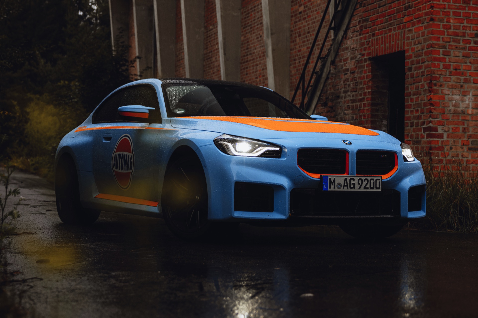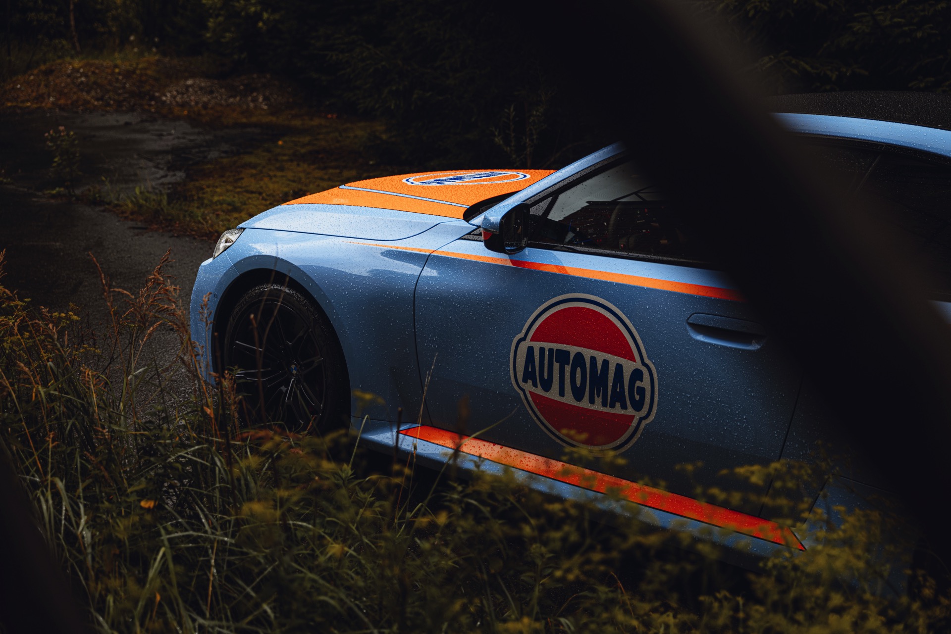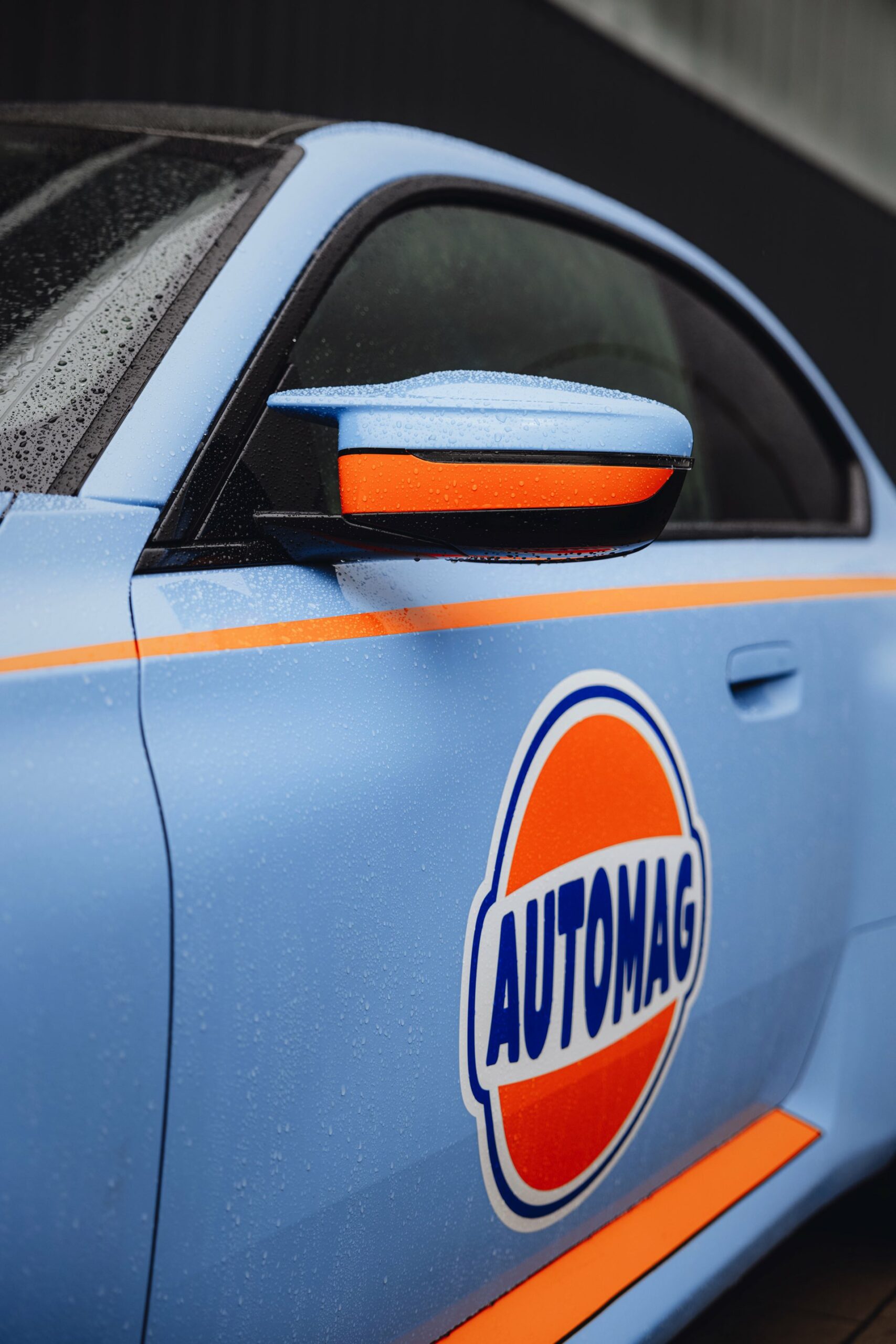 Wie überzeugend der Gulf-Look auf dem BMW M2 (G87) selbst dann aussehen kann, wenn der Name von Gulf Oil nirgendwo als Schriftzug auftaucht, zeigt ein aktuelles Foto-Set von Michi Rieperdinger. Er hat einen entsprechend folierten M2 des Münchner BMW-Händlers Automag fotografiert und dabei trotz verregnetem Wetter stark in Szene gesetzt. Dass auf Motorhaube und Türen statt dem Gulf-Logo ein ganz ähnlich gestalteter Automag-Schriftzug platziert wurde, dürfte so manchem Betrachter frühestens auf den zweiten Blick auffallen. "