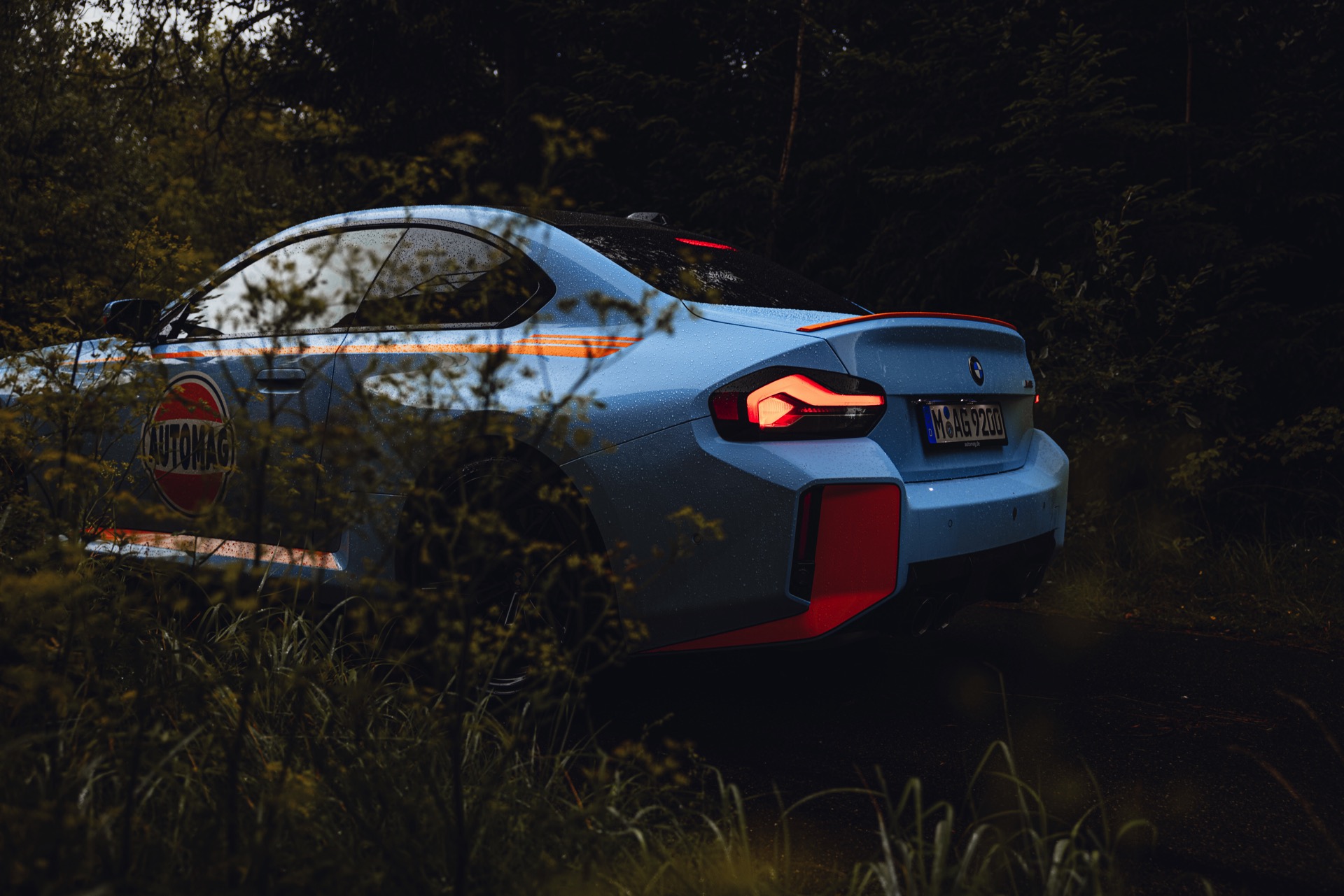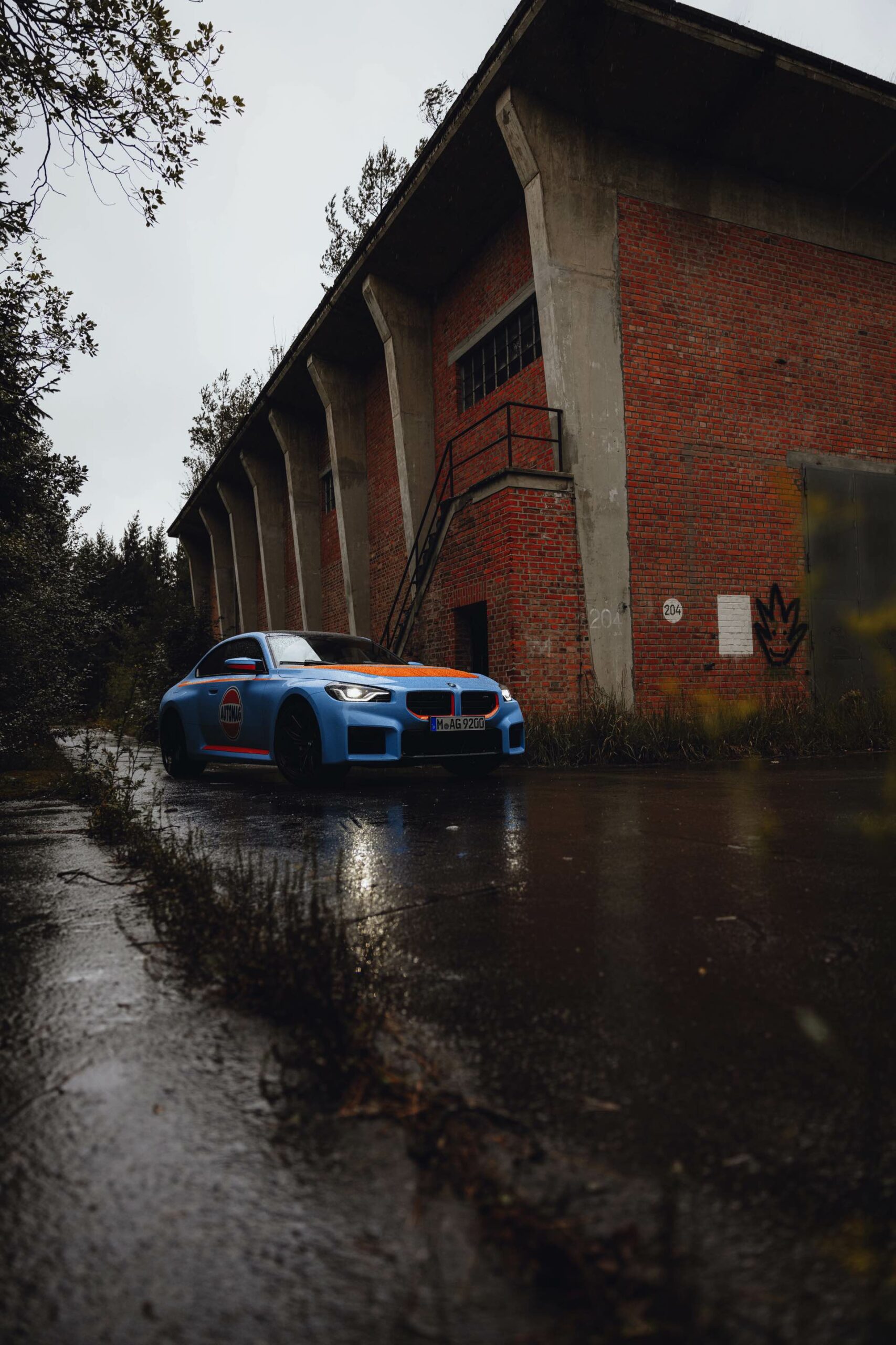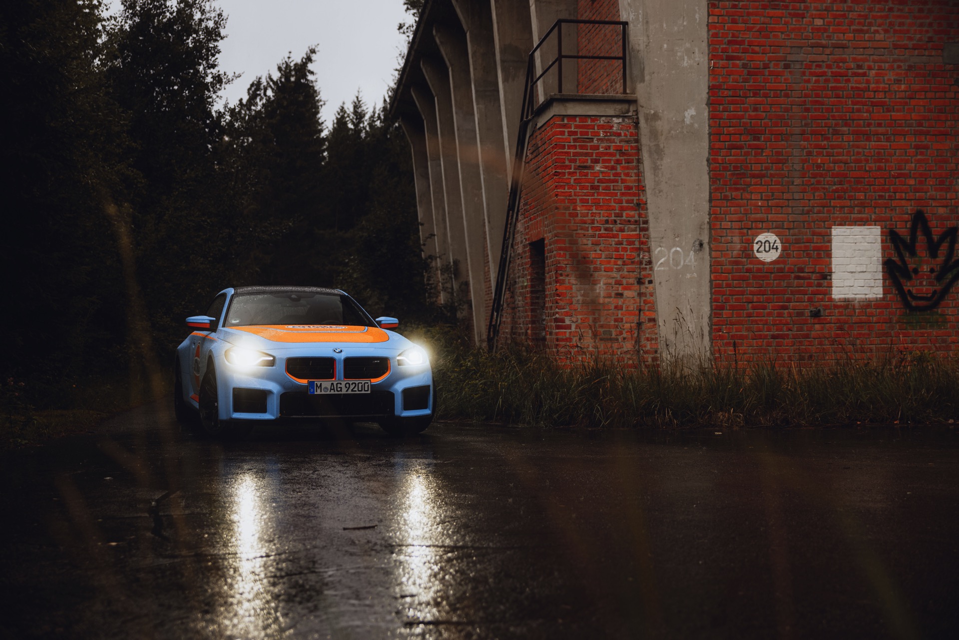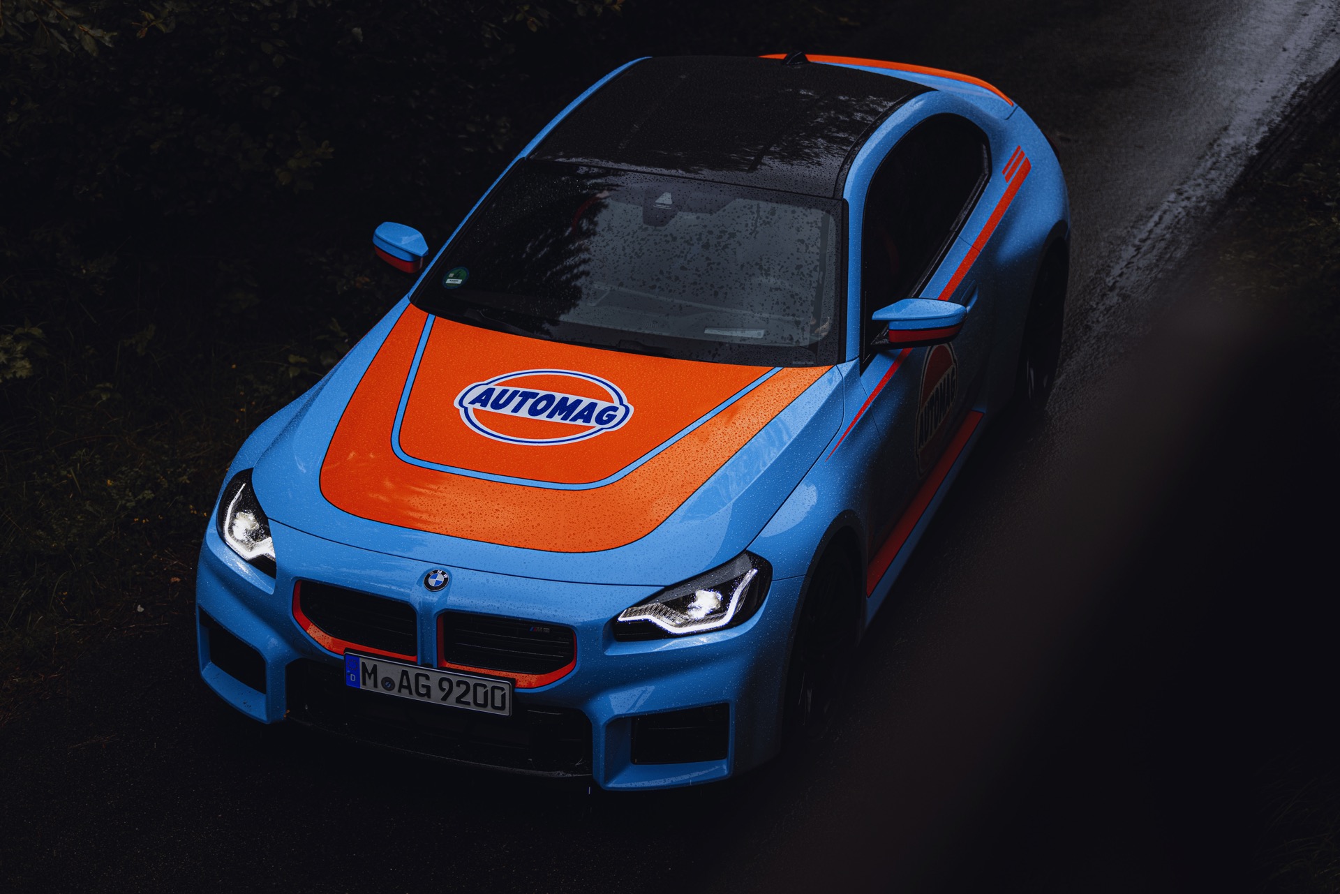 Wie überzeugend der Gulf-Look auf dem BMW M2 (G87) selbst dann aussehen kann, wenn der Name von Gulf Oil nirgendwo als Schriftzug auftaucht, zeigt ein aktuelles Foto-Set von Michi Rieperdinger. Er hat einen entsprechend folierten M2 des Münchner BMW-Händlers Automag fotografiert und dabei trotz verregnetem Wetter stark in Szene gesetzt. Dass auf Motorhaube und Türen statt dem Gulf-Logo ein ganz ähnlich gestalteter Automag-Schriftzug platziert wurde, dürfte so manchem Betrachter frühestens auf den zweiten Blick auffallen. "