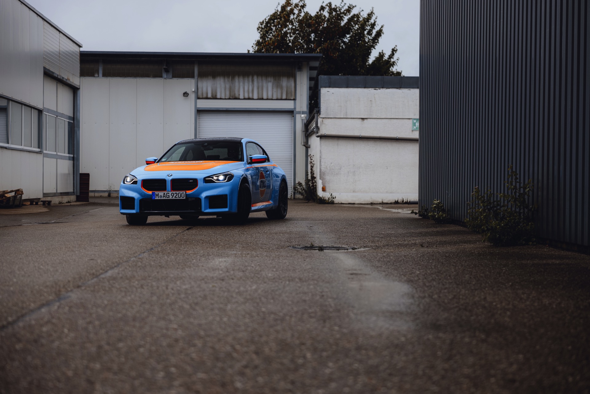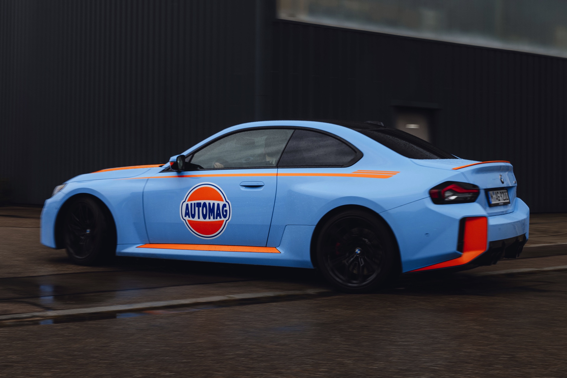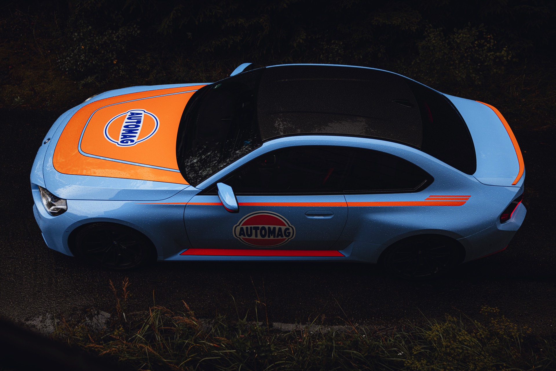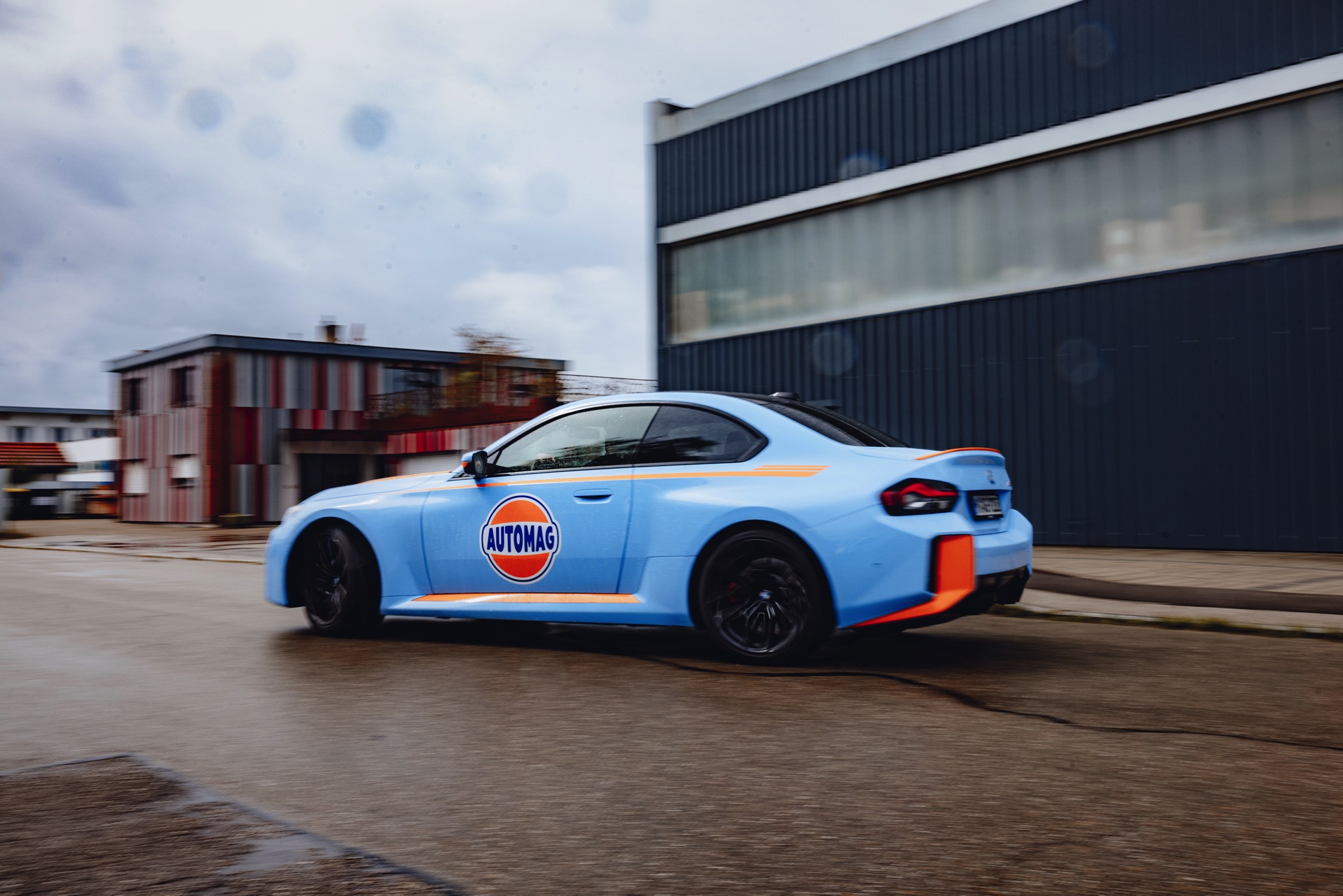 Auto-Fans in aller Welt geraten beim Anblick eines Sportwagens in Hellblau und Orange ins Schwärmen: Das charakteristische Gulf-Design war seit den 1960er-Jahren ein Hingucker auf unzähligen Rennstrecken und lebt in verschiedenen Neuinterpretationen bis heute fort. Per Folierung kommt nun auch der neue BMW M2 (G87) in den Genuss des ikonischen Designs – und das mit vergleichsweise wenig Aufwand und entsprechend günstig, denn zumindest in Verbindung mit der Launch-Farbe Zandvoort Blau muss dabei keinesfalls das gesamte Fahrzeug foliert werden.