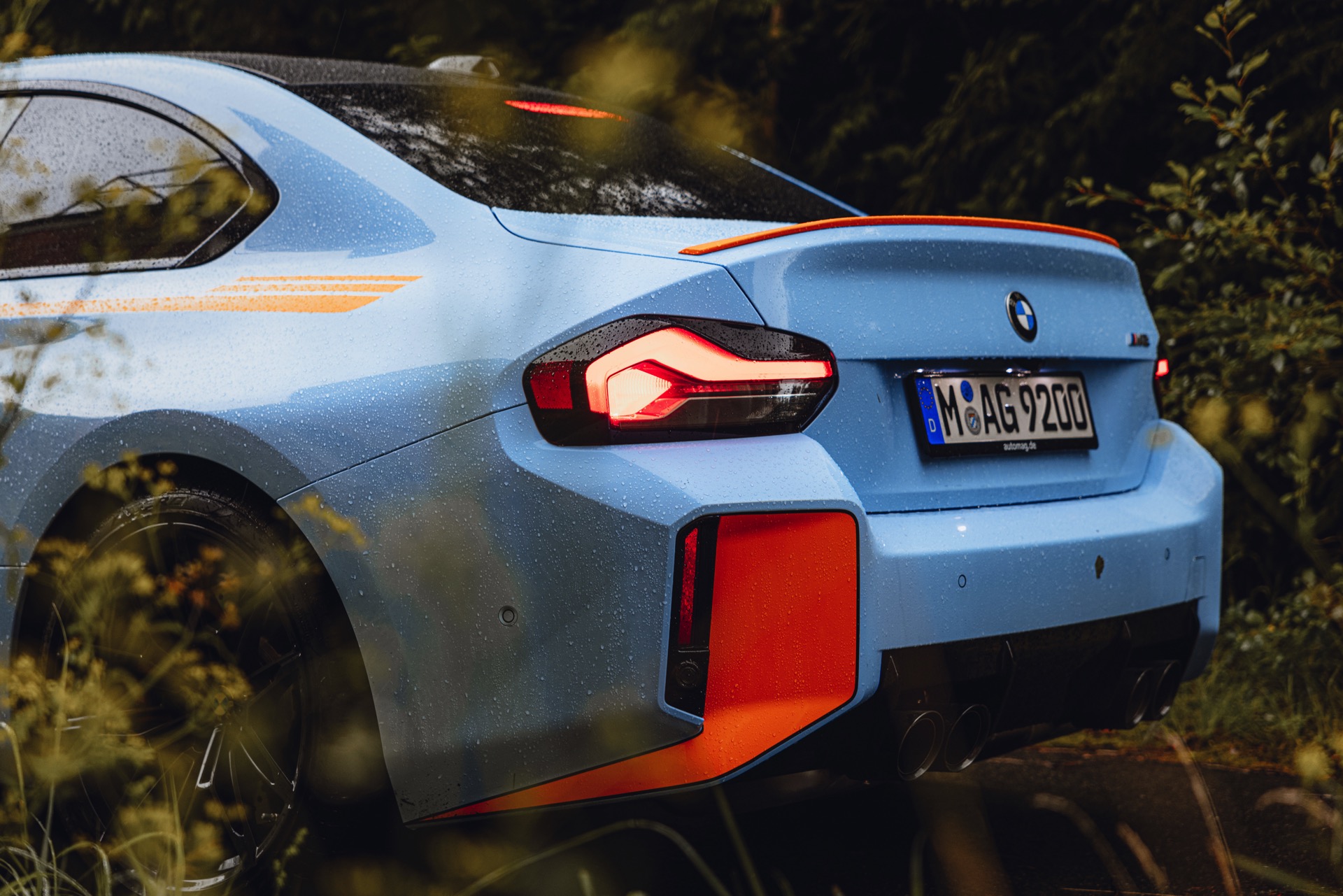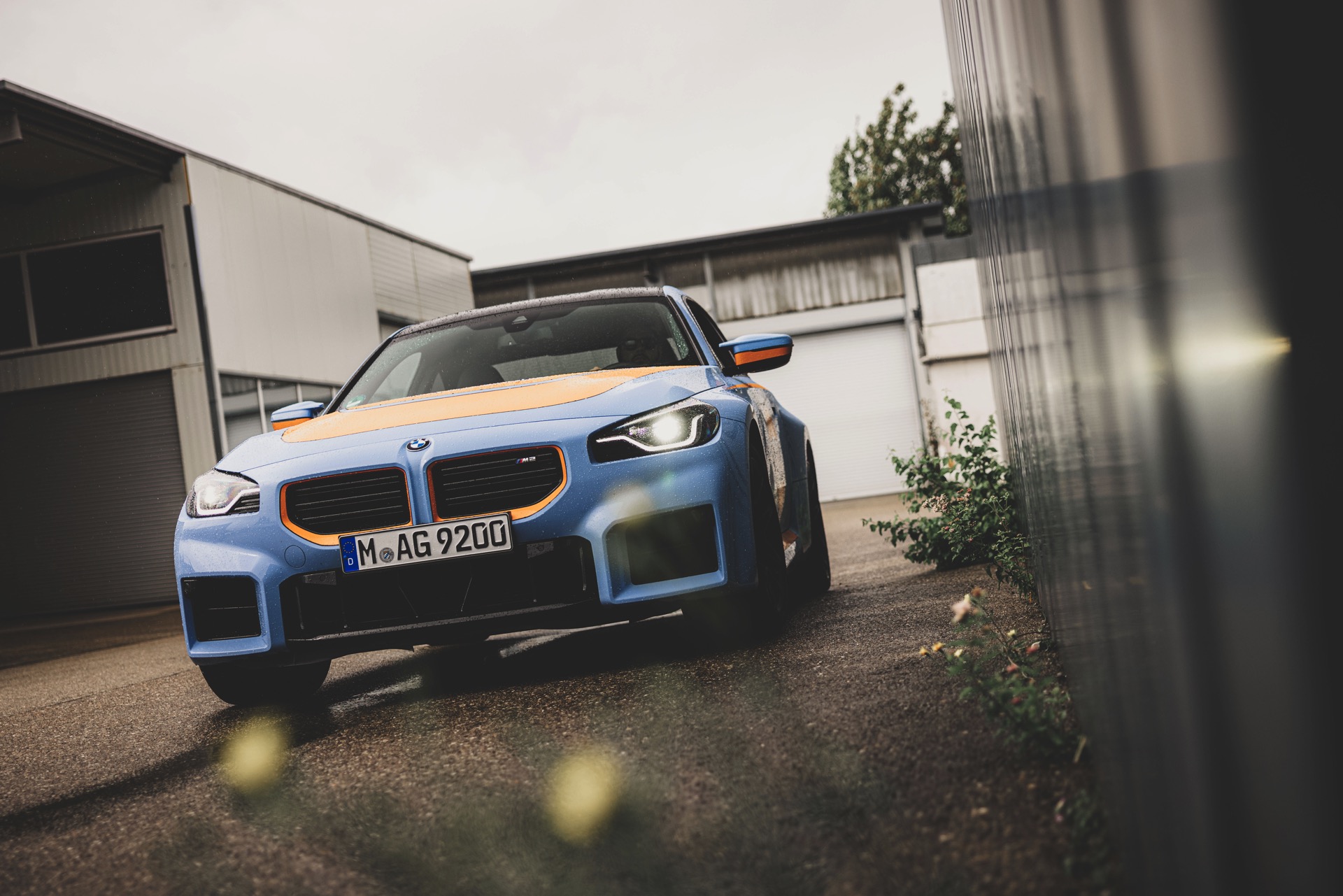 Die leuchtend-orangen Details heben den ohnehin markanten BMW M2 noch stärker aus der Masse heraus und sind aus jedem Blickwinkel unübersehbar: Neben der großflächig orange folierten Motorhaube finden sich weitere Akzente an den Nieren, den Außenspiegeln, am unteren Rand der Türen sowie auf Höhe der Schulterlinie. Am Heck sind nicht nur die seitlichen Elemente der Heckschürze in Orange foliert, auch die Spoiler-Lippe auf der Kofferraum-Haube trägt ihren Teil zum Gulf-Design bei.