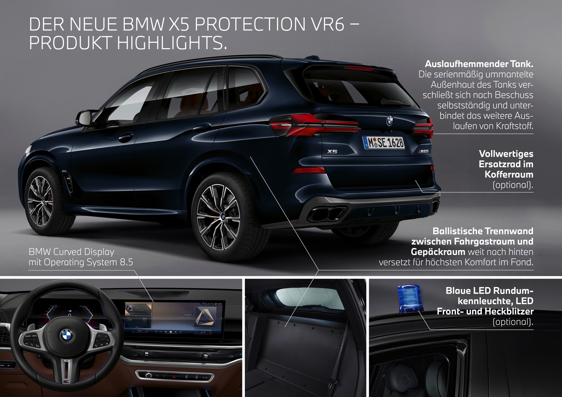 Der Fokus der Panzerung liegt klar auf dem Innenraum, der für maximal vier Insassen konzipiert ist. Die Fahrgastzelle ist mit zahlreichen Stahlelementen verstärkt, hinzu kommt eine Sicherheitsverglasung. Gegen Aufpreis sind eine erweiterte Unterbodenpanzerung und eine verstärkte Dach-Panzerung – etwa gegen Angriffe mit Drohnen – erhältlich. Gemäß der Schutzklasse VR6 schützt der BMW X5 Protection seine Insassen vor einem Beschuss mit Waffen bis zum Kaliber 7,62 x 39 Millimeter, womit unter anderem die AK-47 einen Teil ihres Schreckens verliert. Wie ein X5 VR6 nach dem Beschusstest aussieht, konnten wir bereits 2019 zeigen.