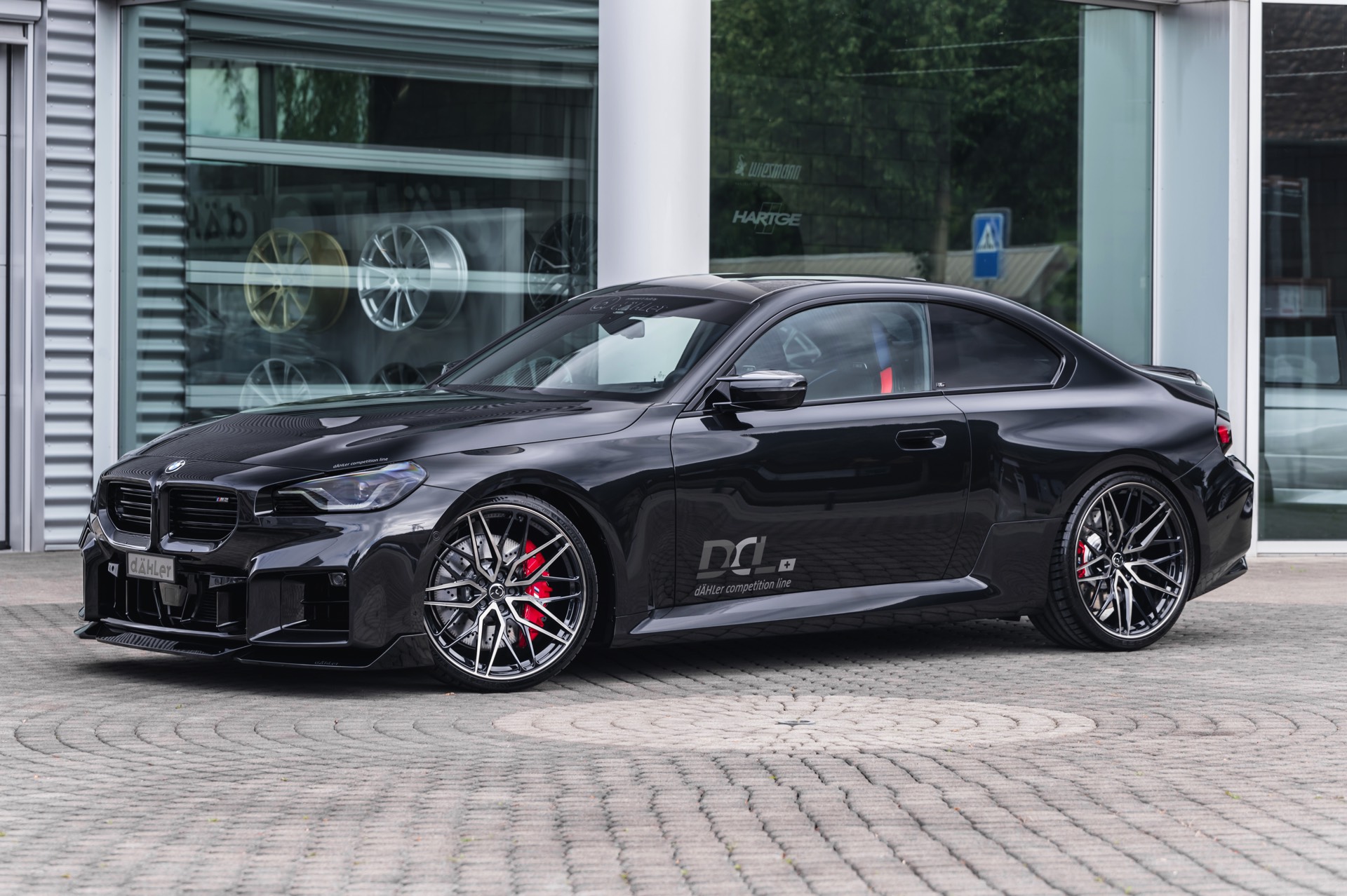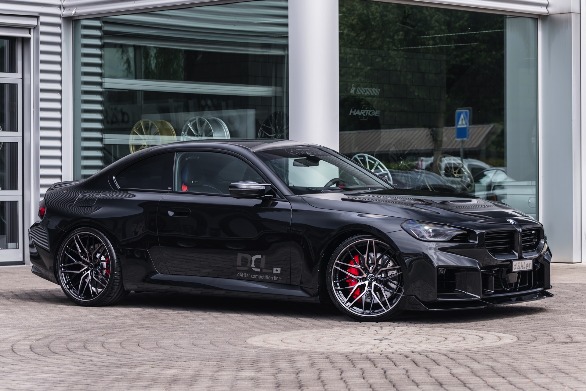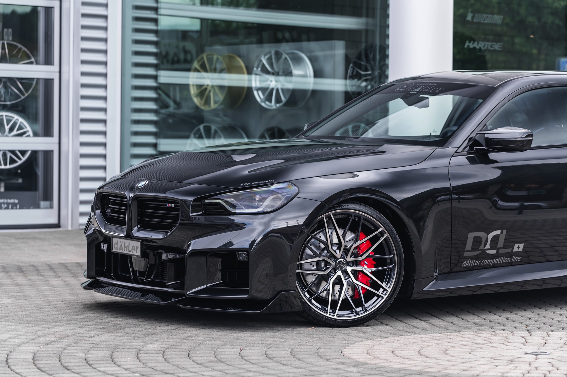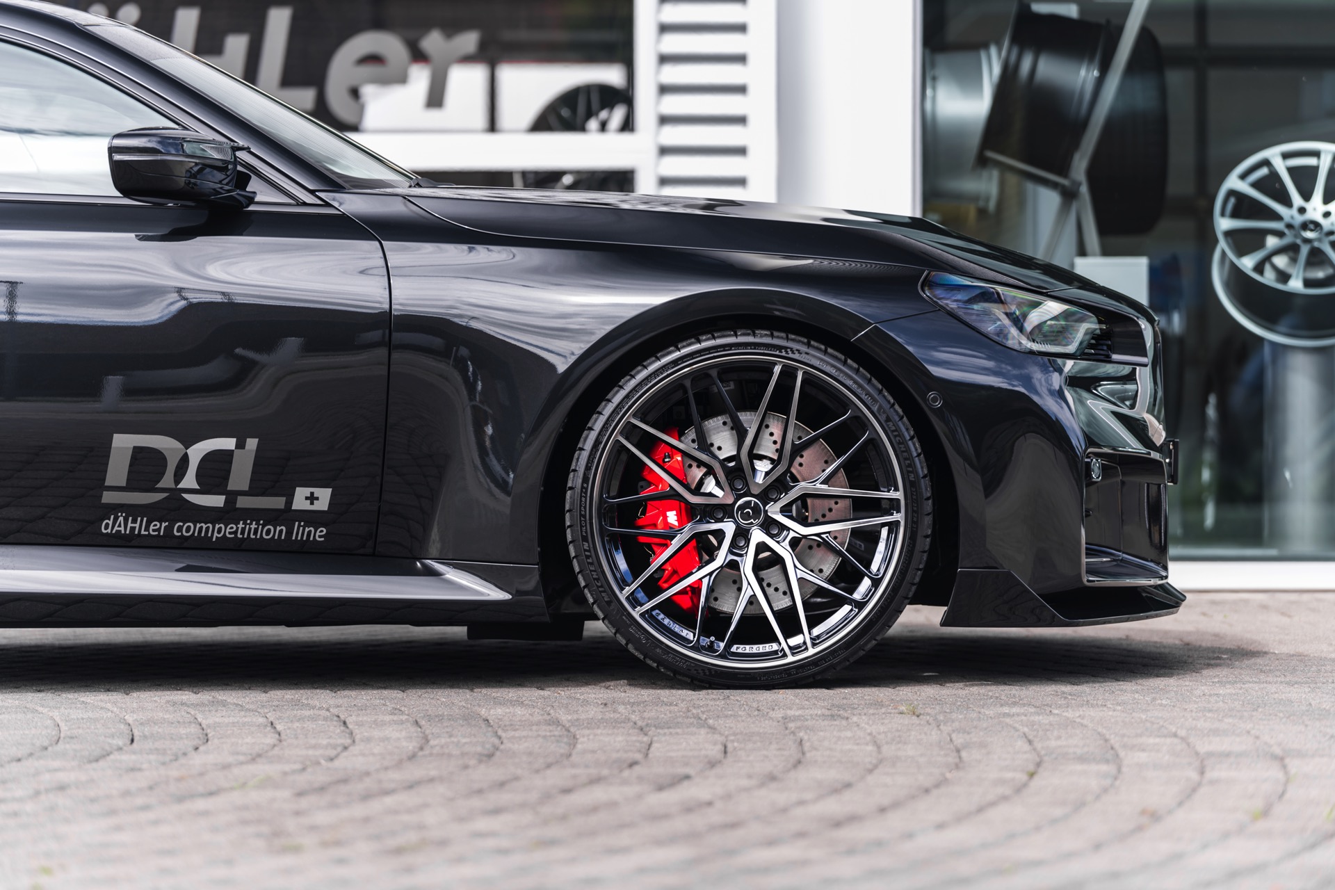 In den breit ausgestellten Radhäusern des BMW M2 (G87) kommen vorne wie hinten 21 Zoll große Schmiede-Felgen im CDC2-Design von Dähler zum Einsatz, darauf arbeiten vorn 275 Millimeter breite Michelin Pilot Sport 4 S und hinten sogar die 305 Millimeter breite Ausführung der bewährten Sportreifen. Abgerundet wird der brutale Auftritt des auf 552 PS erstarkten M2 mit einem Frontsplitter, der sowohl in Sicht-Carbon als auch mit Lackierung in Wagenfarbe bestellt werden kann.