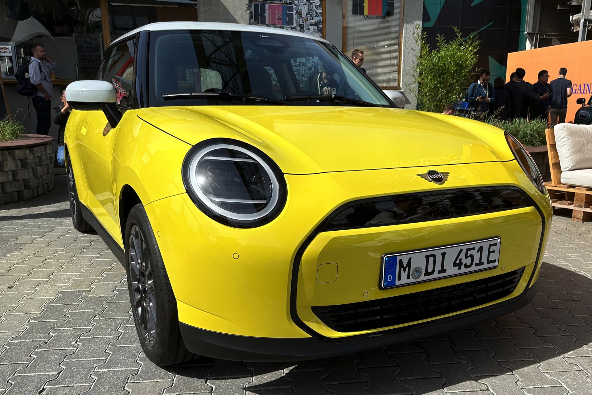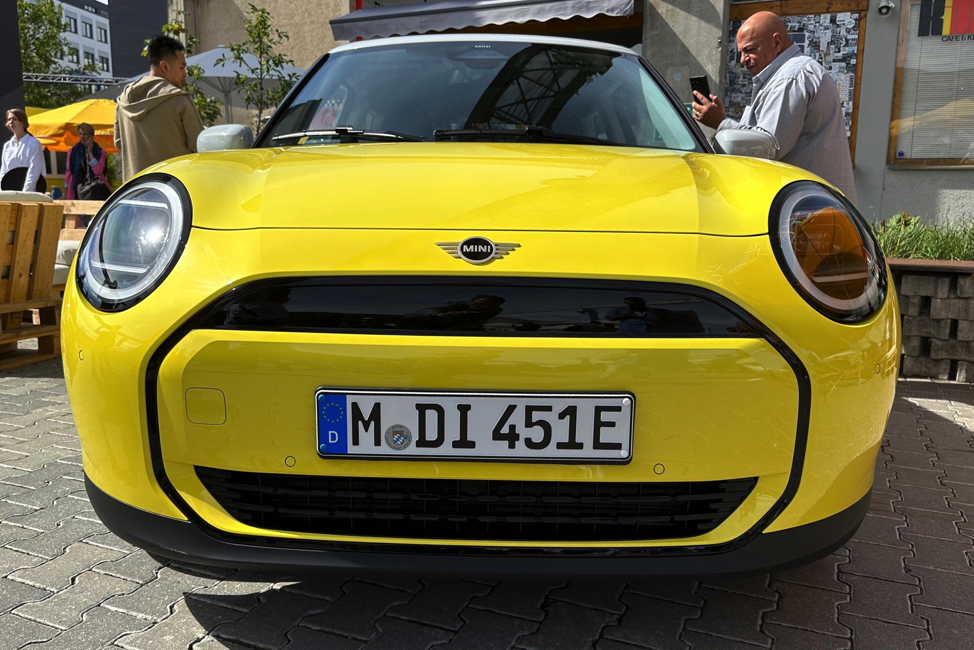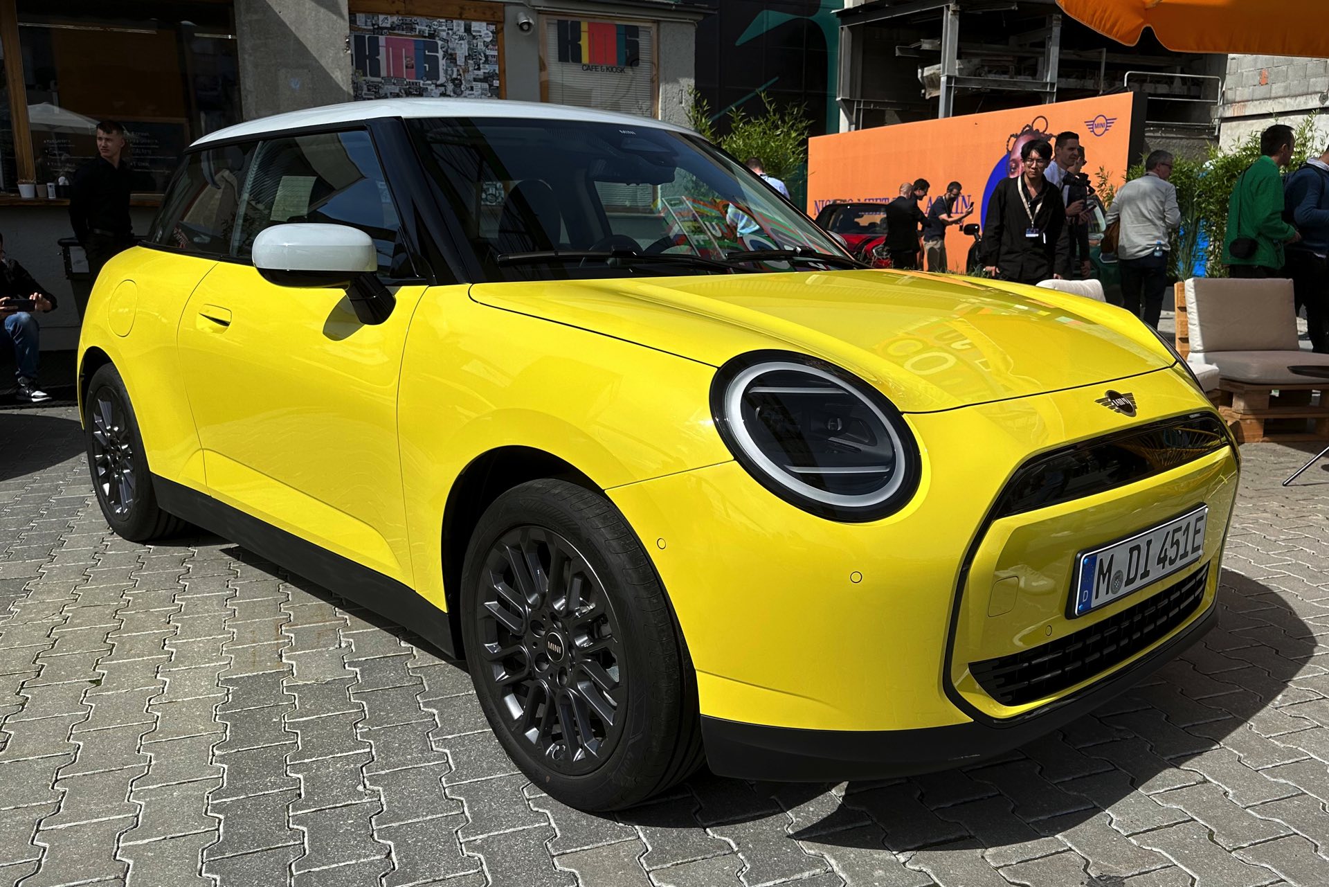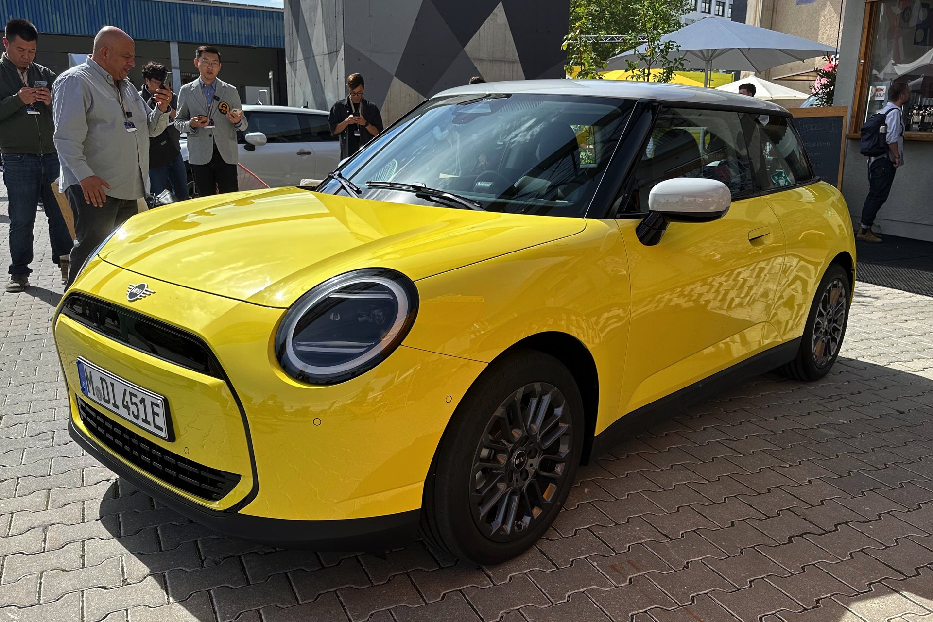 Auch in strahlendem Sunny Side Yellow feiert der neue MINI Cooper (J01) in diesen Minuten seine Weltpremiere in München. Während auf den ersten Fotos ein der Cooper SE in Blazing Blue zu sehen ist, sehen wir das Elektroauto auf unseren Live-Fotos in Form der Einstiegs-Variante Cooper E in leuchtendem Gelb: Die kleinere der beiden Elektro-Varianten ist mit 184 PS kaum schwächer und benötigt mit 7,3 Sekunden auch nur sechs Zehntel länger für den Standardsprint, mit einem Preis von 32.900 Euro ist sie aber volle 4.000 Euro günstiger als das Topmodell.