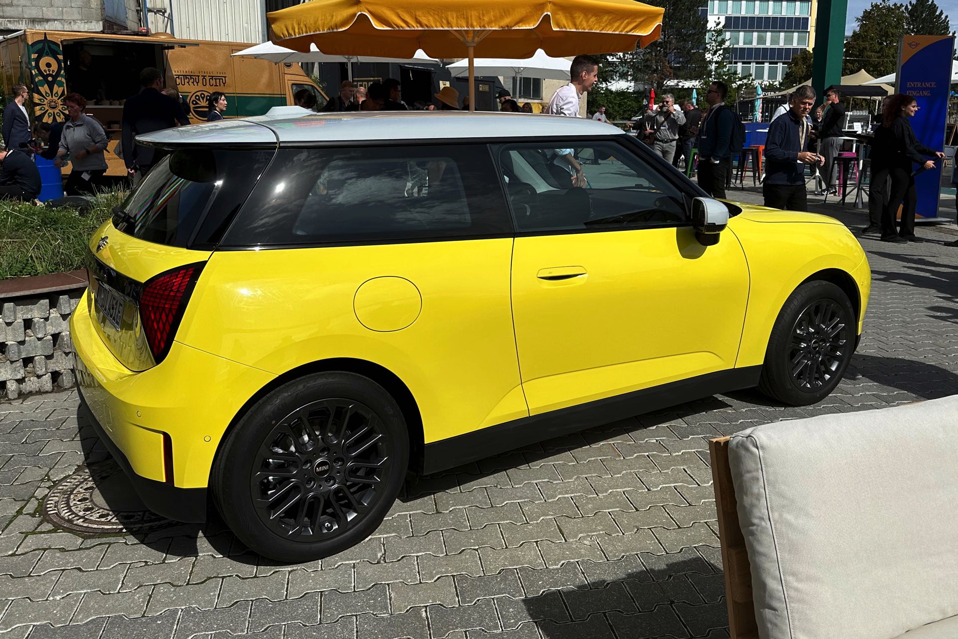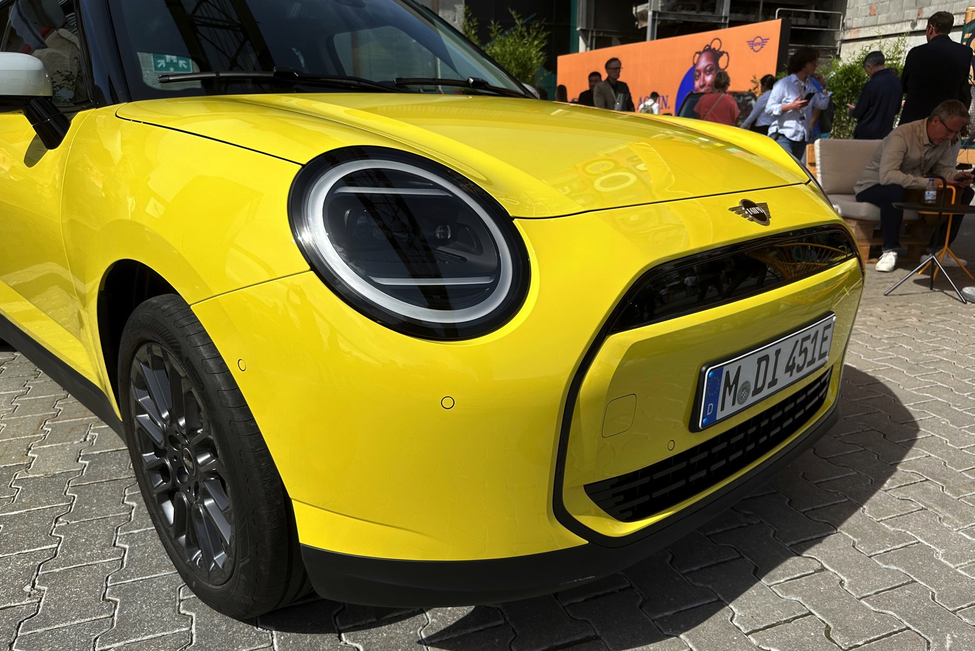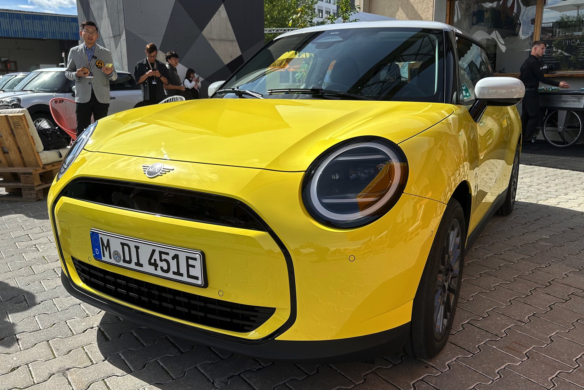 Auch in strahlendem Sunny Side Yellow feiert der neue MINI Cooper (J01) in diesen Minuten seine Weltpremiere in München. Während auf den ersten Fotos ein der Cooper SE in Blazing Blue zu sehen ist, sehen wir das Elektroauto auf unseren Live-Fotos in Form der Einstiegs-Variante Cooper E in leuchtendem Gelb: Die kleinere der beiden Elektro-Varianten ist mit 184 PS kaum schwächer und benötigt mit 7,3 Sekunden auch nur sechs Zehntel länger für den Standardsprint, mit einem Preis von 32.900 Euro ist sie aber volle 4.000 Euro günstiger als das Topmodell.