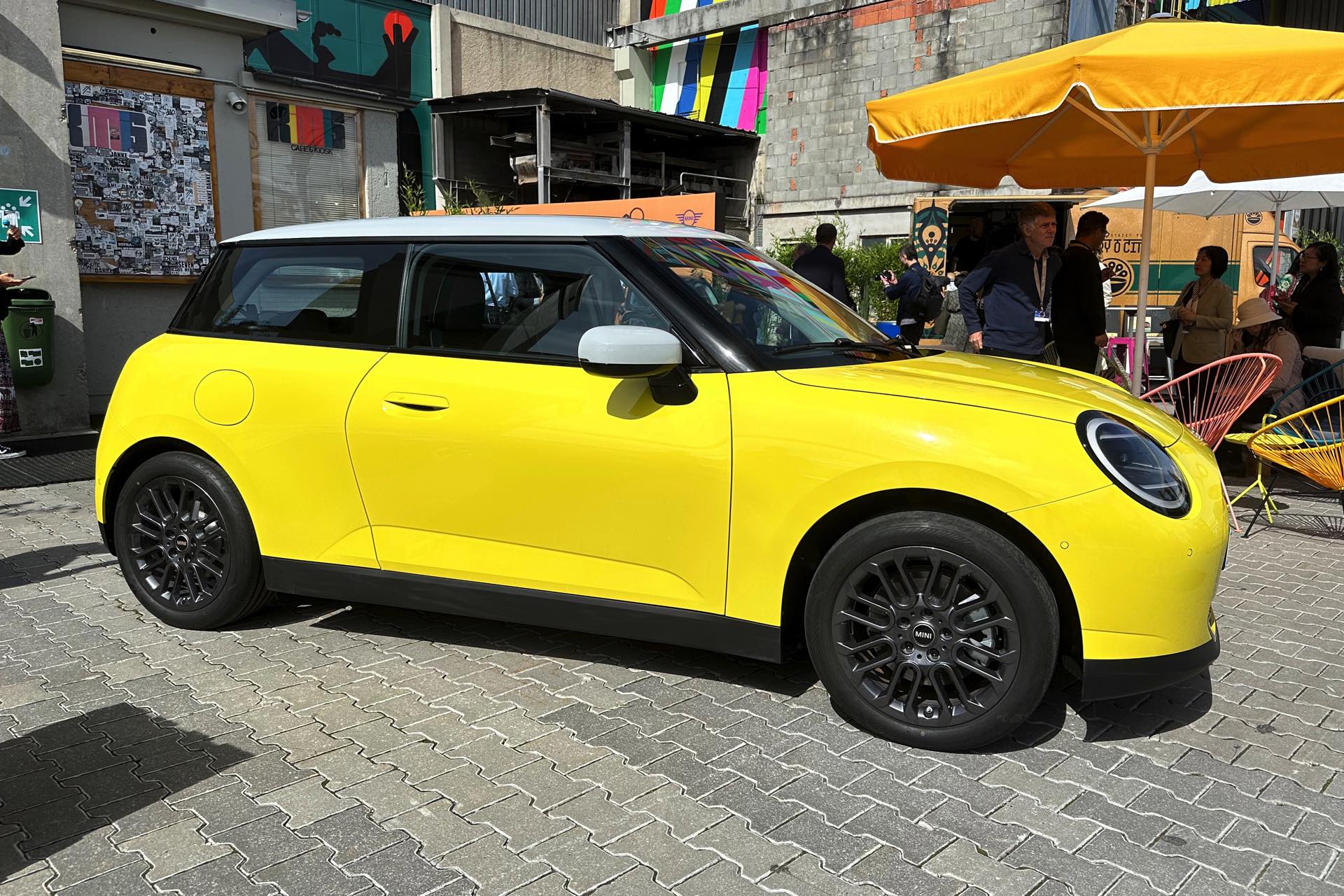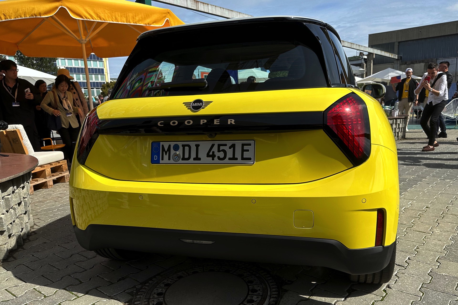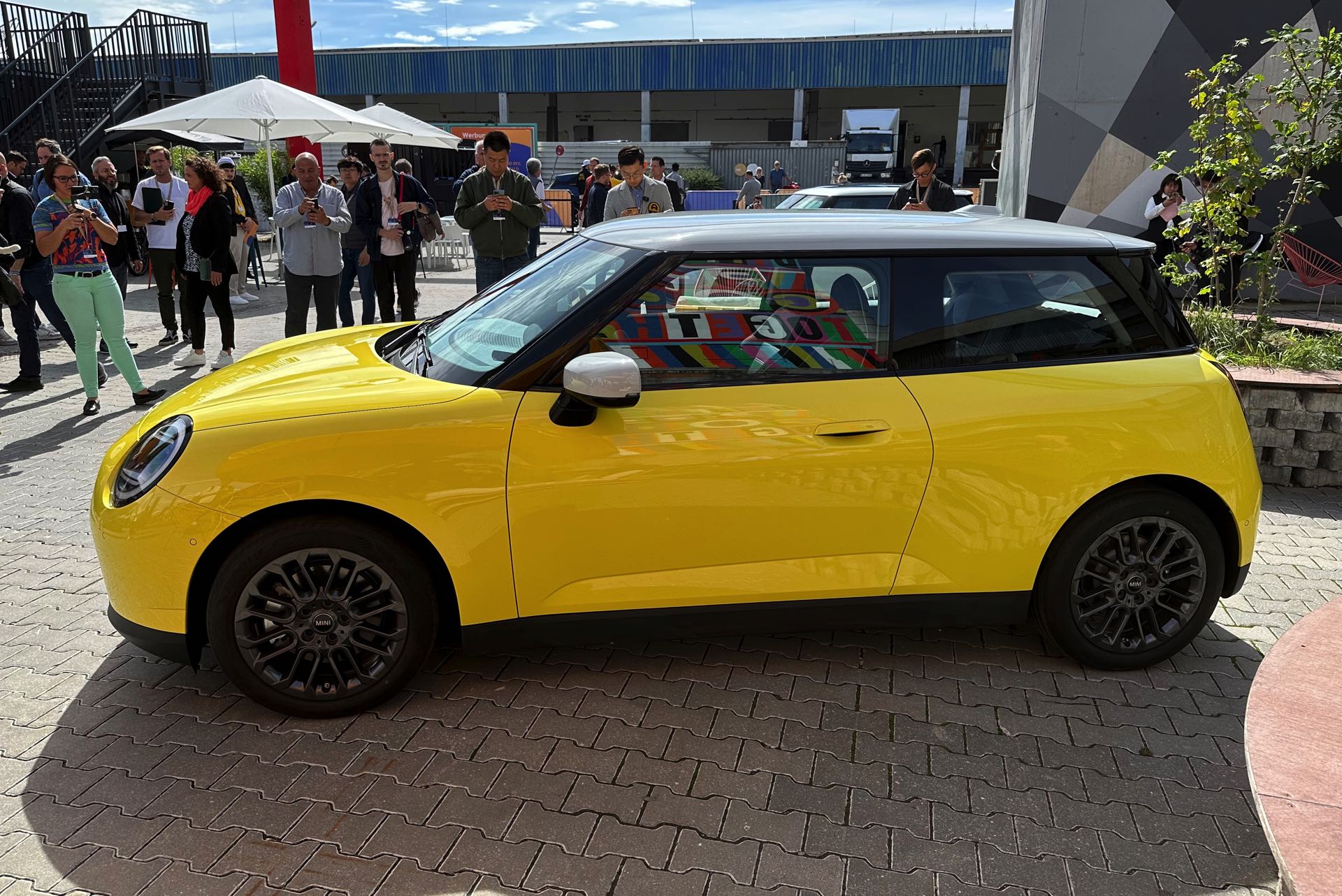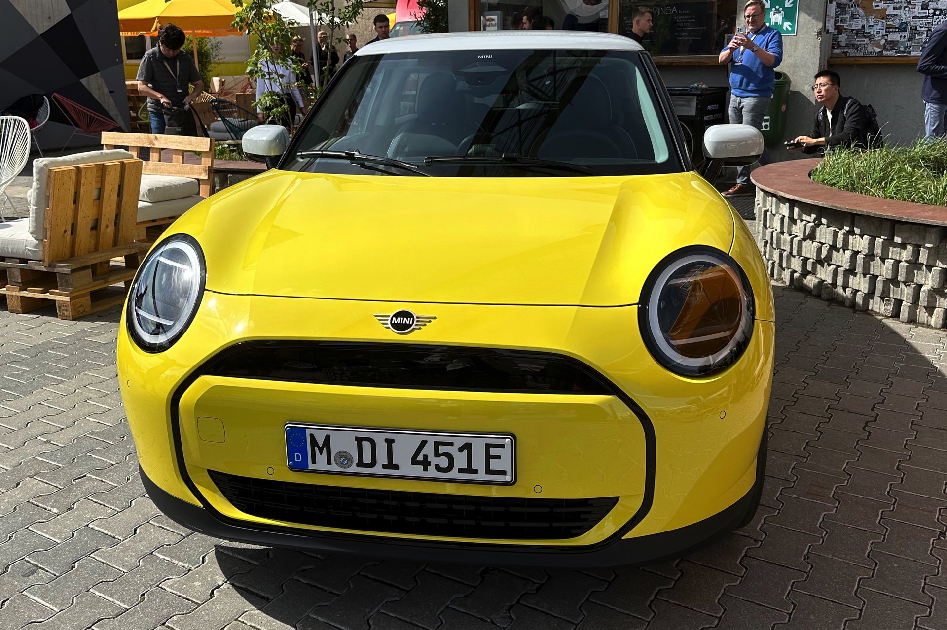 Auch in strahlendem Sunny Side Yellow feiert der neue MINI Cooper (J01) in diesen Minuten seine Weltpremiere in München. Während auf den ersten Fotos ein der Cooper SE in Blazing Blue zu sehen ist, sehen wir das Elektroauto auf unseren Live-Fotos in Form der Einstiegs-Variante Cooper E in leuchtendem Gelb: Die kleinere der beiden Elektro-Varianten ist mit 184 PS kaum schwächer und benötigt mit 7,3 Sekunden auch nur sechs Zehntel länger für den Standardsprint, mit einem Preis von 32.900 Euro ist sie aber volle 4.000 Euro günstiger als das Topmodell.