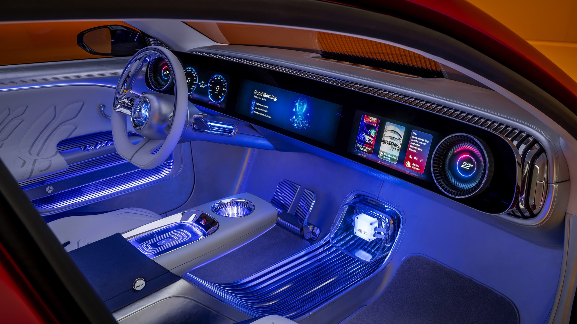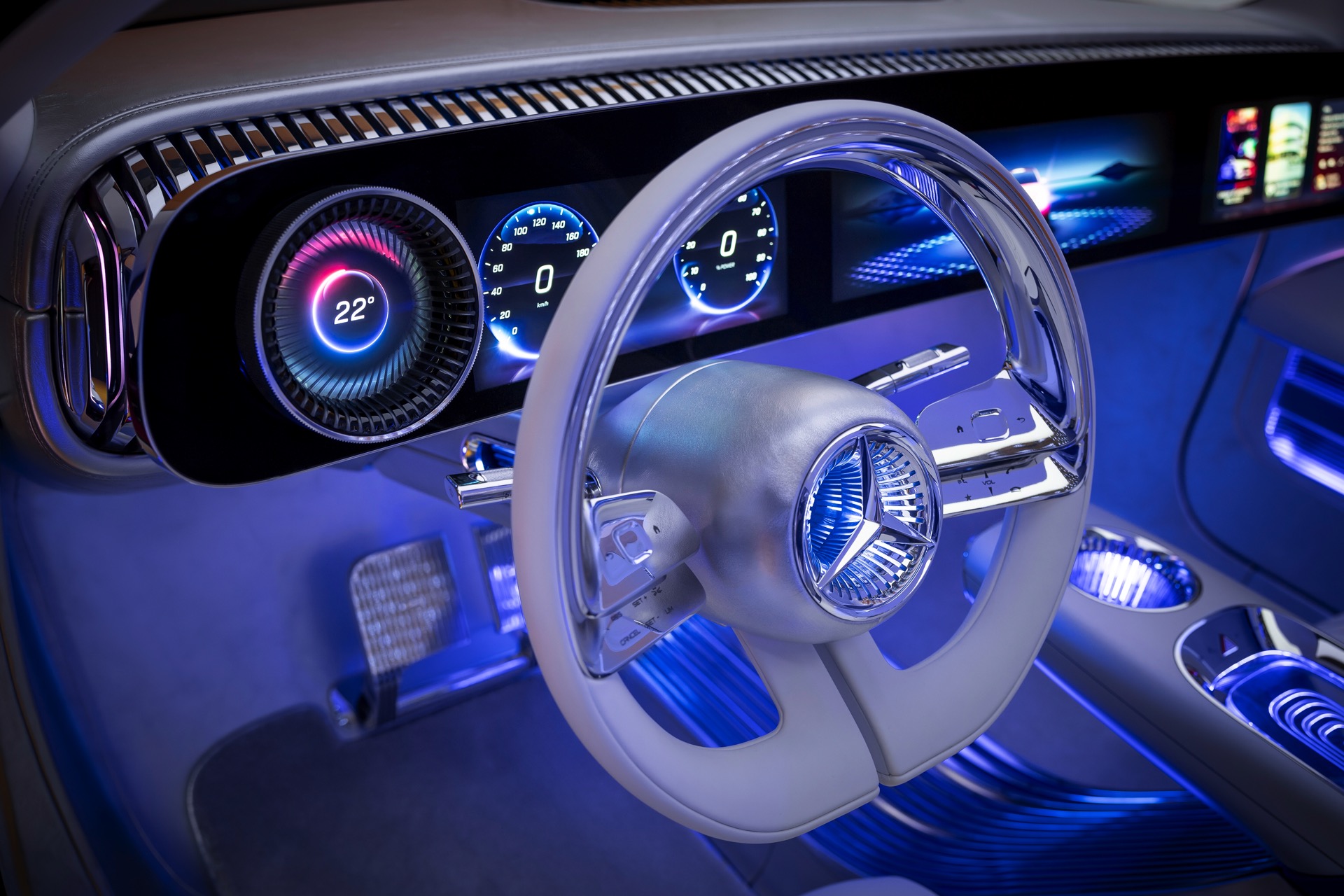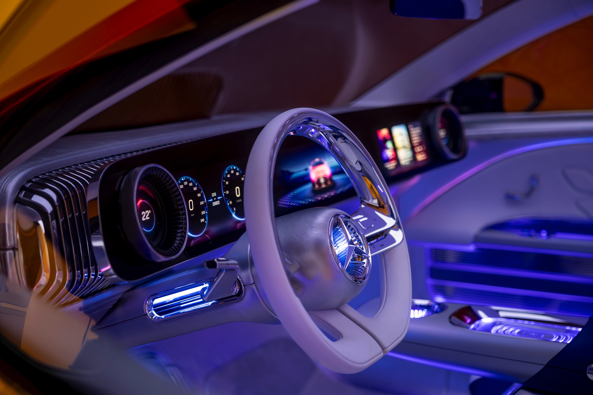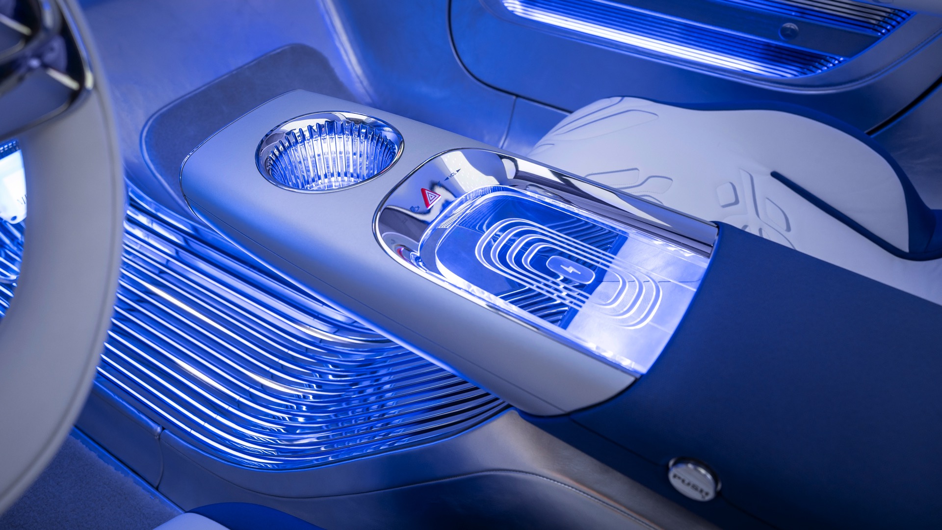 Zu den optischen Highlights zählt ganz klar die umfassend illuminierte Frontmaske, die das Markenlogo mit einer Vielzahl von Sternen aufgreift. Die Position des früheren “Kühlergrills” wird so zur Bühne für eine Lightshow, die dank LED-Technik mit sehr geringem Energieverbrauch realisiert werden kann. Die nach vorne geneigte Front erzeugt in der Seitenansicht eine “Shark Nose”, die gemeinsam mit der fließenden Dachlinie und den 21 Zoll-Felgen für einen charakteristischen Auftritt sorgen. Am Heck zitieren auch die Rückleuchten den Mercedes-Stern, sodass auch aus dieser Perspektive keine Fragen zur Herkunft des Fahrzeugs aufkommen dürften.