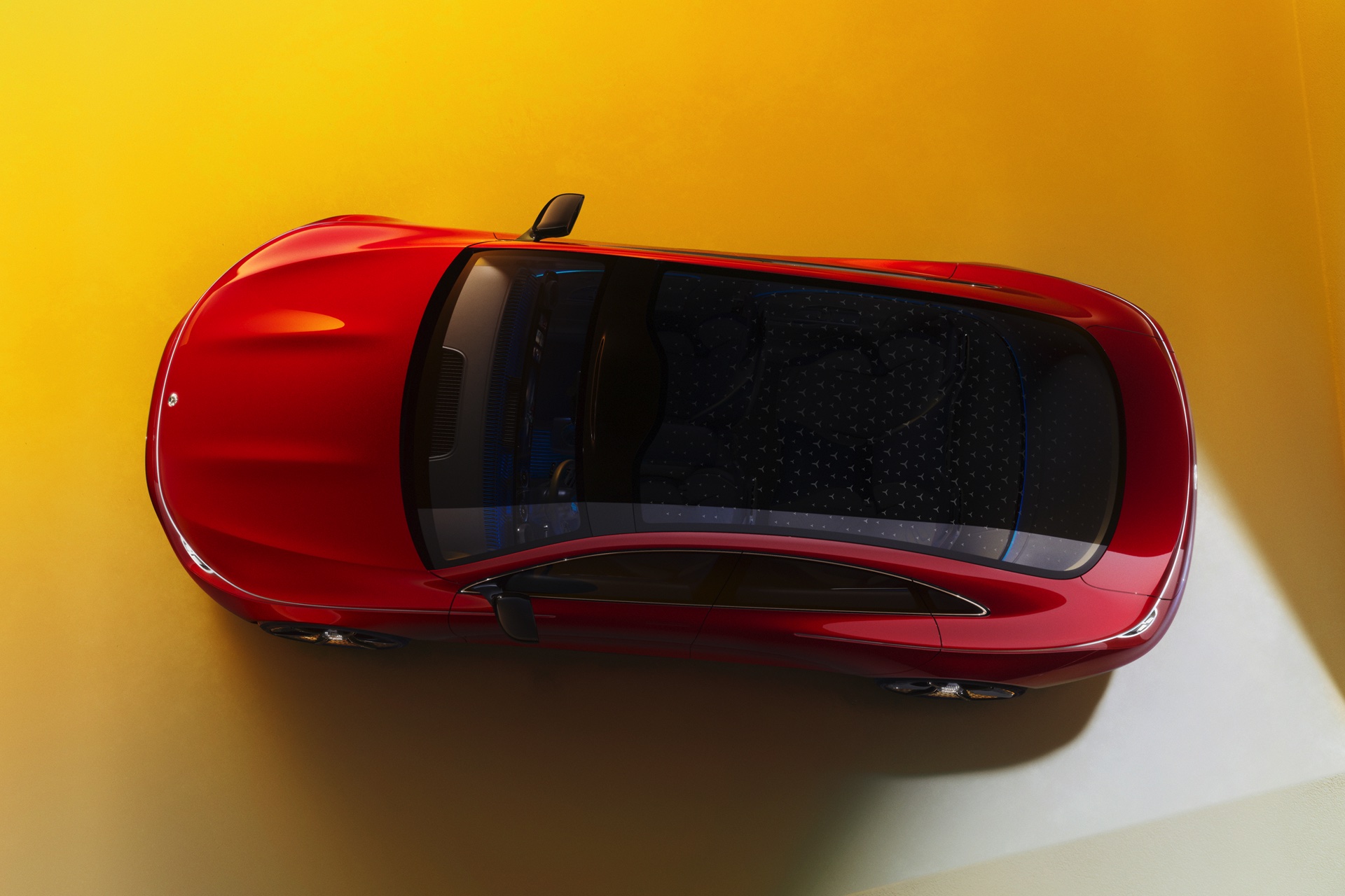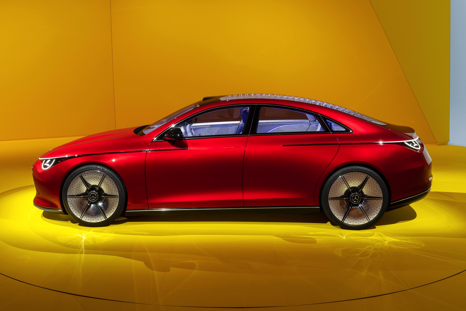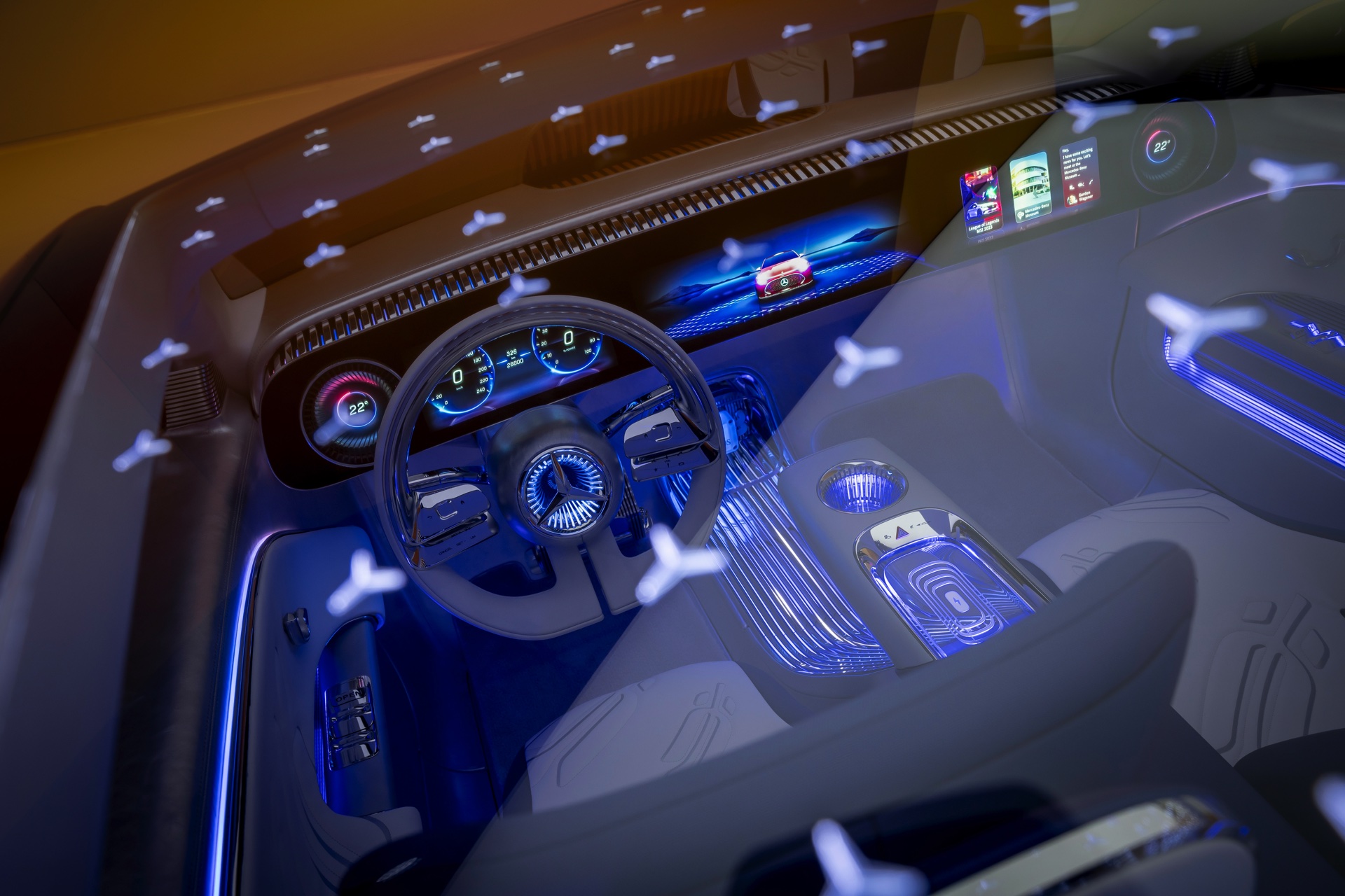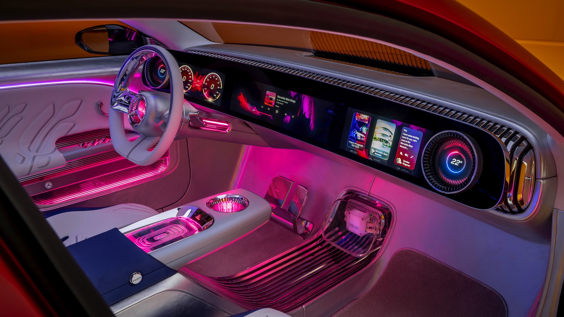 Zu den optischen Highlights zählt ganz klar die umfassend illuminierte Frontmaske, die das Markenlogo mit einer Vielzahl von Sternen aufgreift. Die Position des früheren “Kühlergrills” wird so zur Bühne für eine Lightshow, die dank LED-Technik mit sehr geringem Energieverbrauch realisiert werden kann. Die nach vorne geneigte Front erzeugt in der Seitenansicht eine “Shark Nose”, die gemeinsam mit der fließenden Dachlinie und den 21 Zoll-Felgen für einen charakteristischen Auftritt sorgen. Am Heck zitieren auch die Rückleuchten den Mercedes-Stern, sodass auch aus dieser Perspektive keine Fragen zur Herkunft des Fahrzeugs aufkommen dürften.