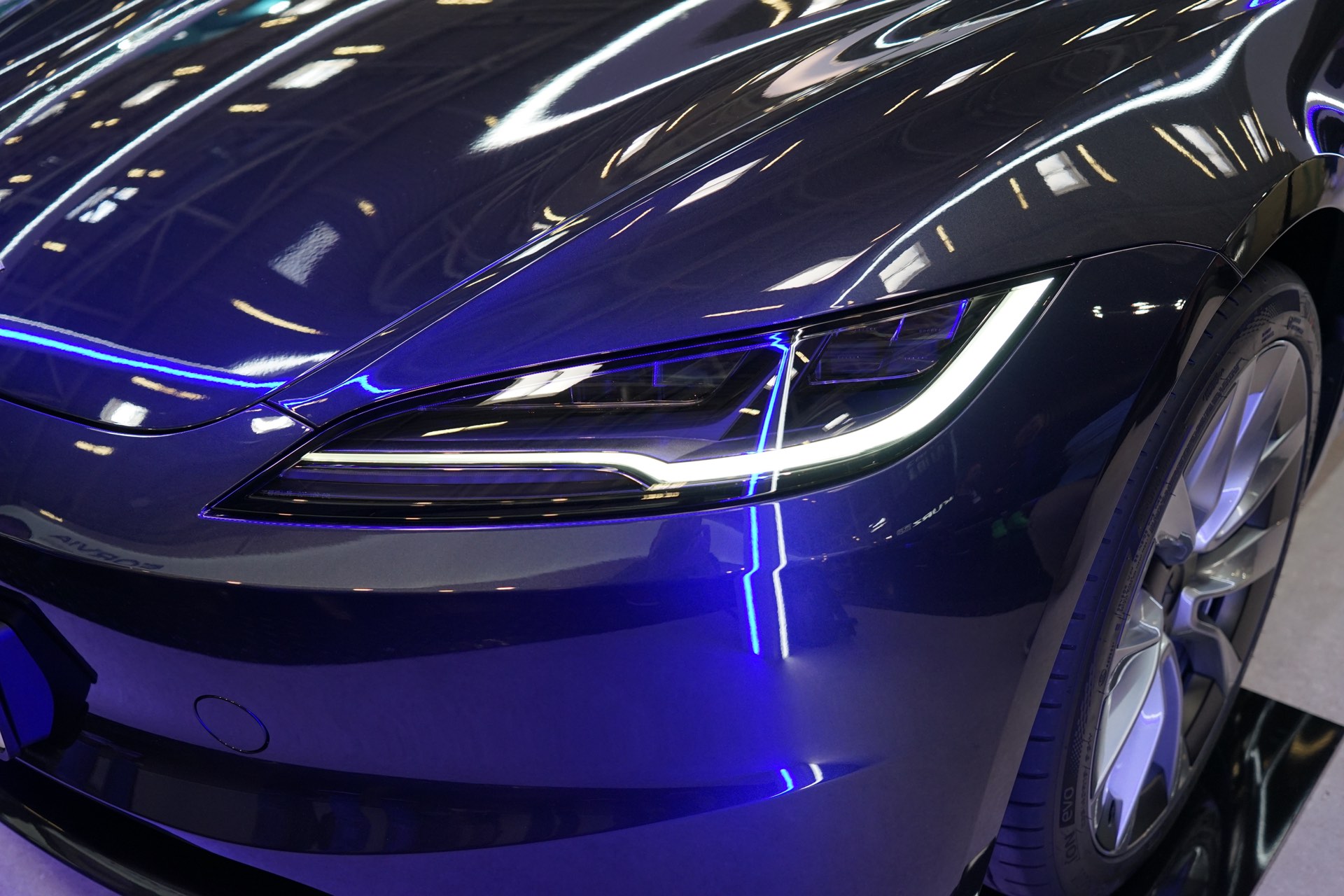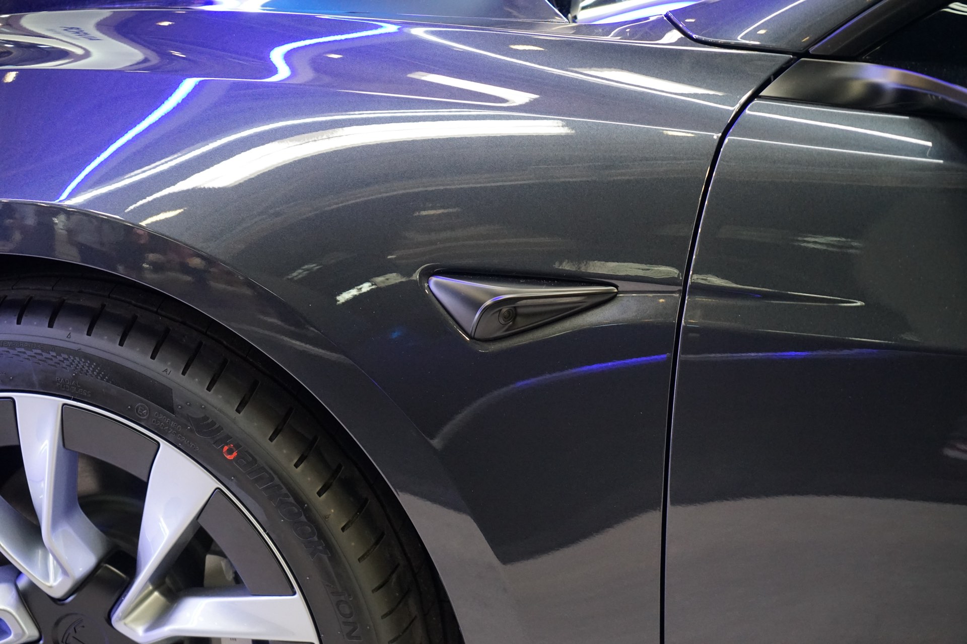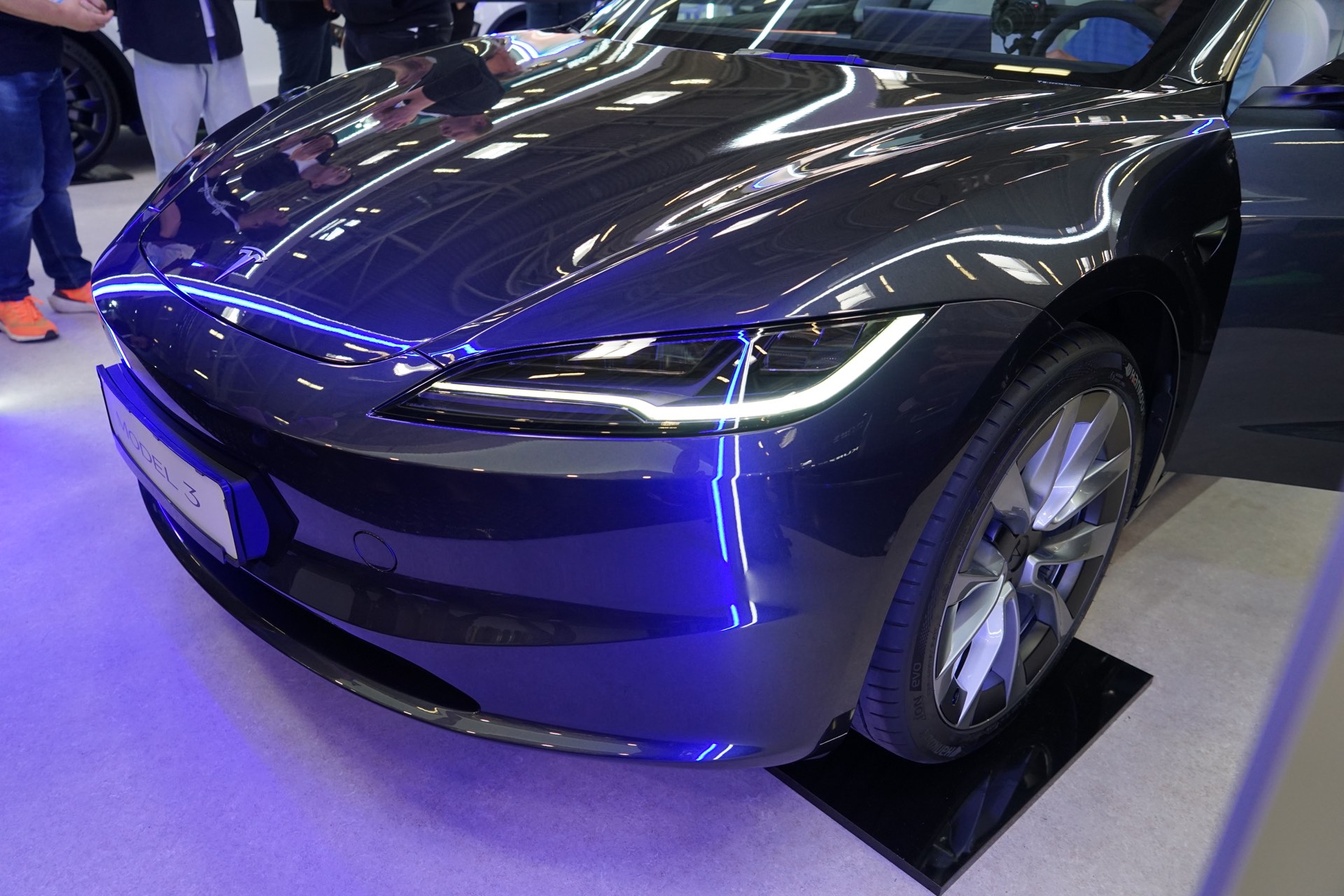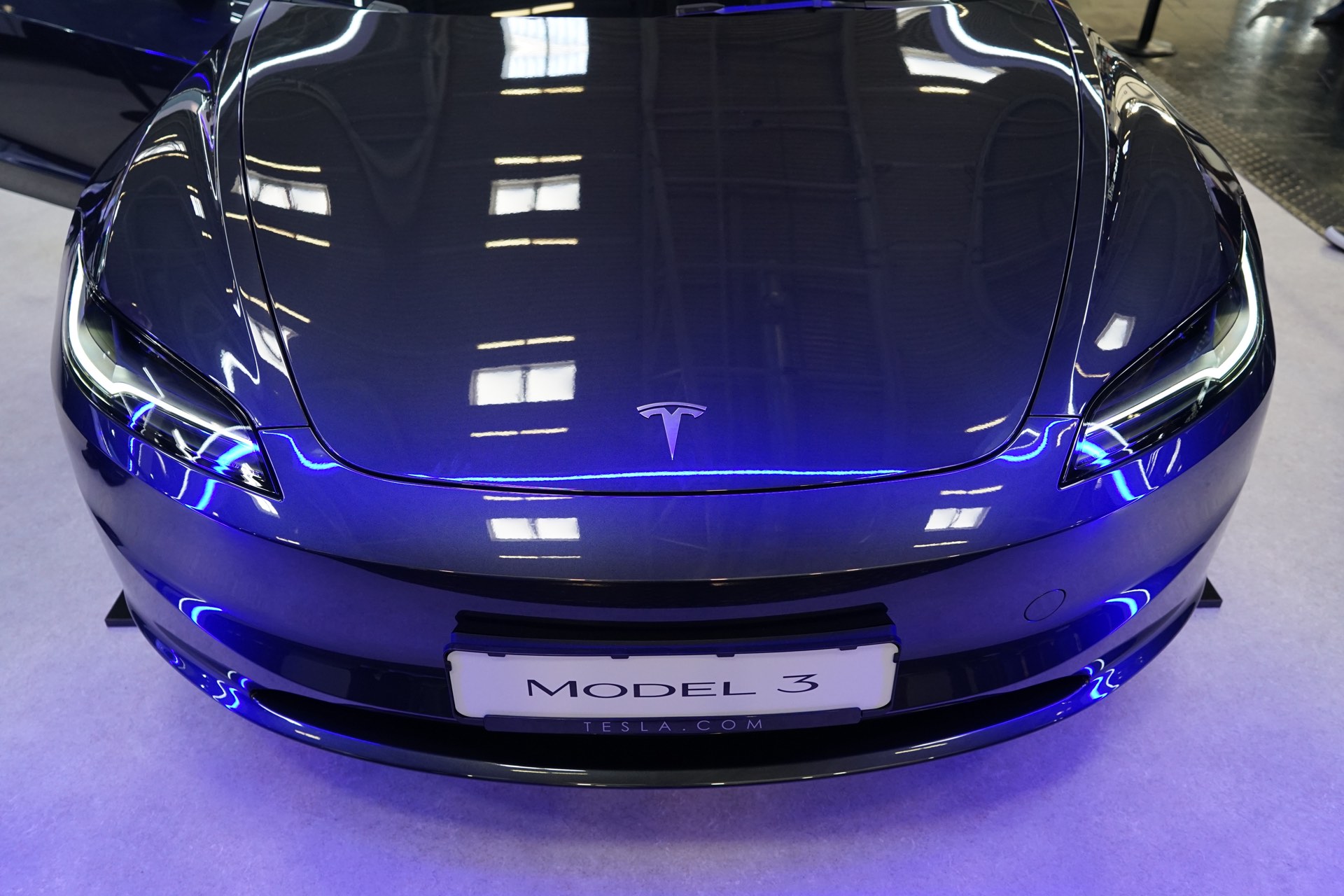 Mit Abstand wichtigstes Erkennungszeichen des Tesla Model 3 Facelift sind die neu gestalteten Scheinwerfer, die deutlich flacher als bisher ausgeführt sind. Ein schmales LED-Band am unteren Rand übernimmt die Funktion des Tagfahrlichts und sorgt für eine frische Optik, darunter wurde die komplett geschlossene Front aerodynamisch weiter optimiert.