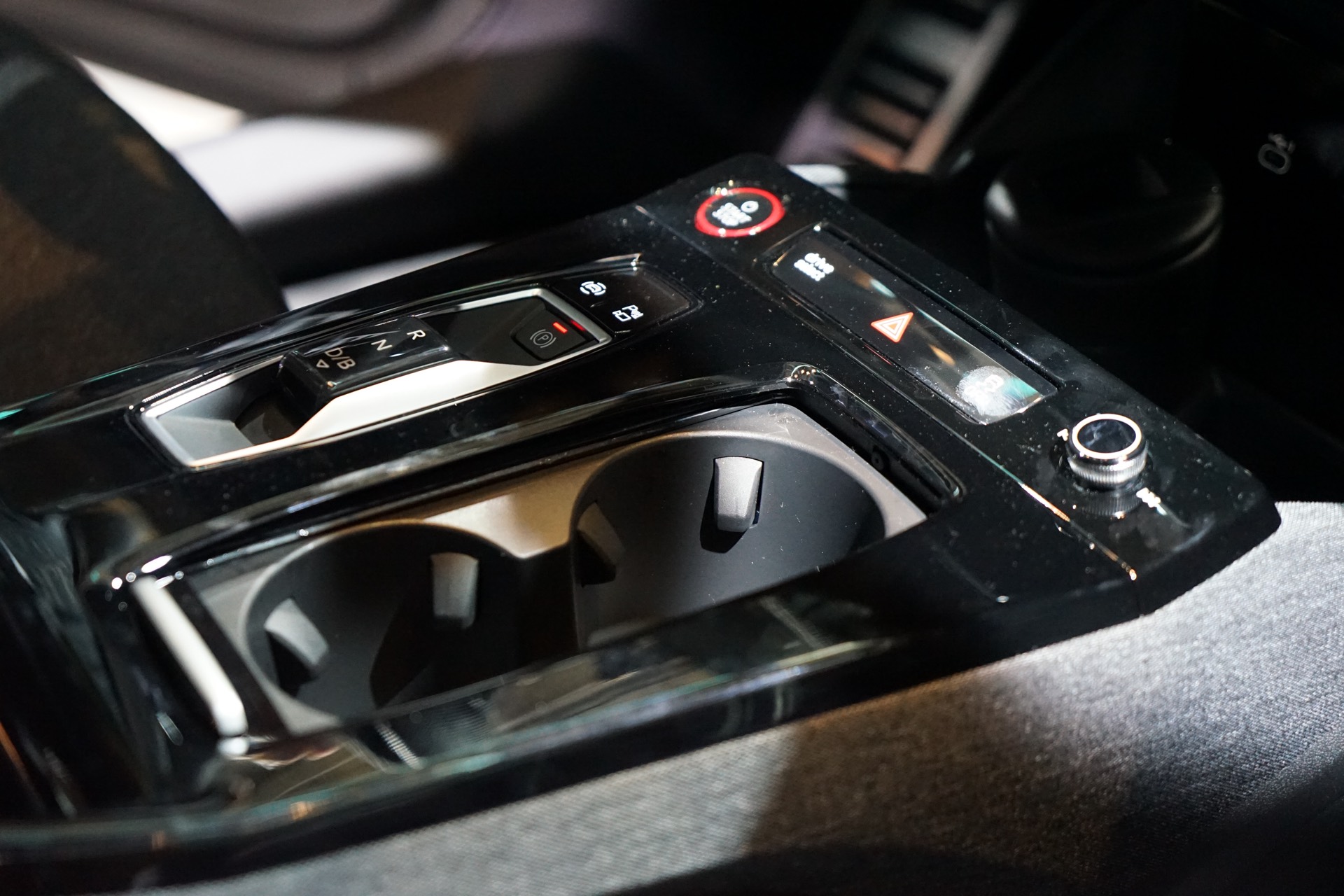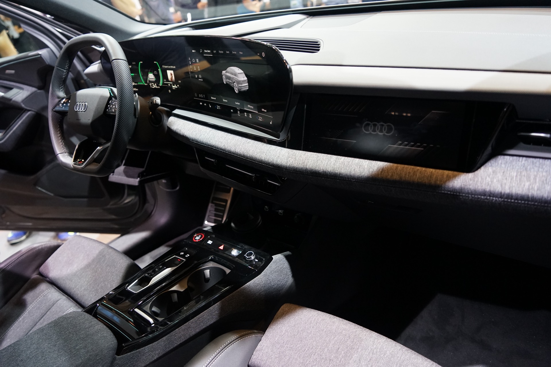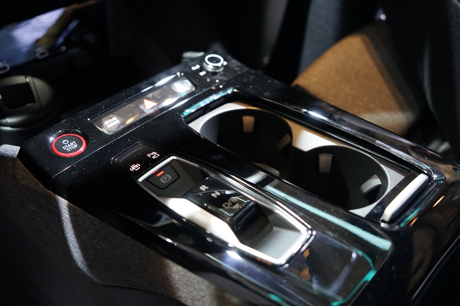 Konventionelle Knöpfe und Schalter finden sich am Armaturenbrett kaum, der Fokus der Bedienung liegt ganz klar auf Touchscreen und Sprachsteuerung. Wer klassische Knöpfe sucht, wird vor allem auf dem Mitteltunnel fündig: Neben Start-Stopp-Knopf und einer Auswahl für die Fahrstufe finden sich hier auch ein Lautstärkeregler für das Radio sowie zwei Cupholder, einen MMI-Controller als alternative Eingabemethode sucht man allerdings vergebens. "