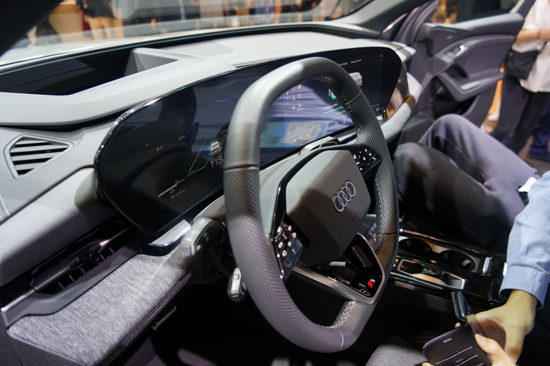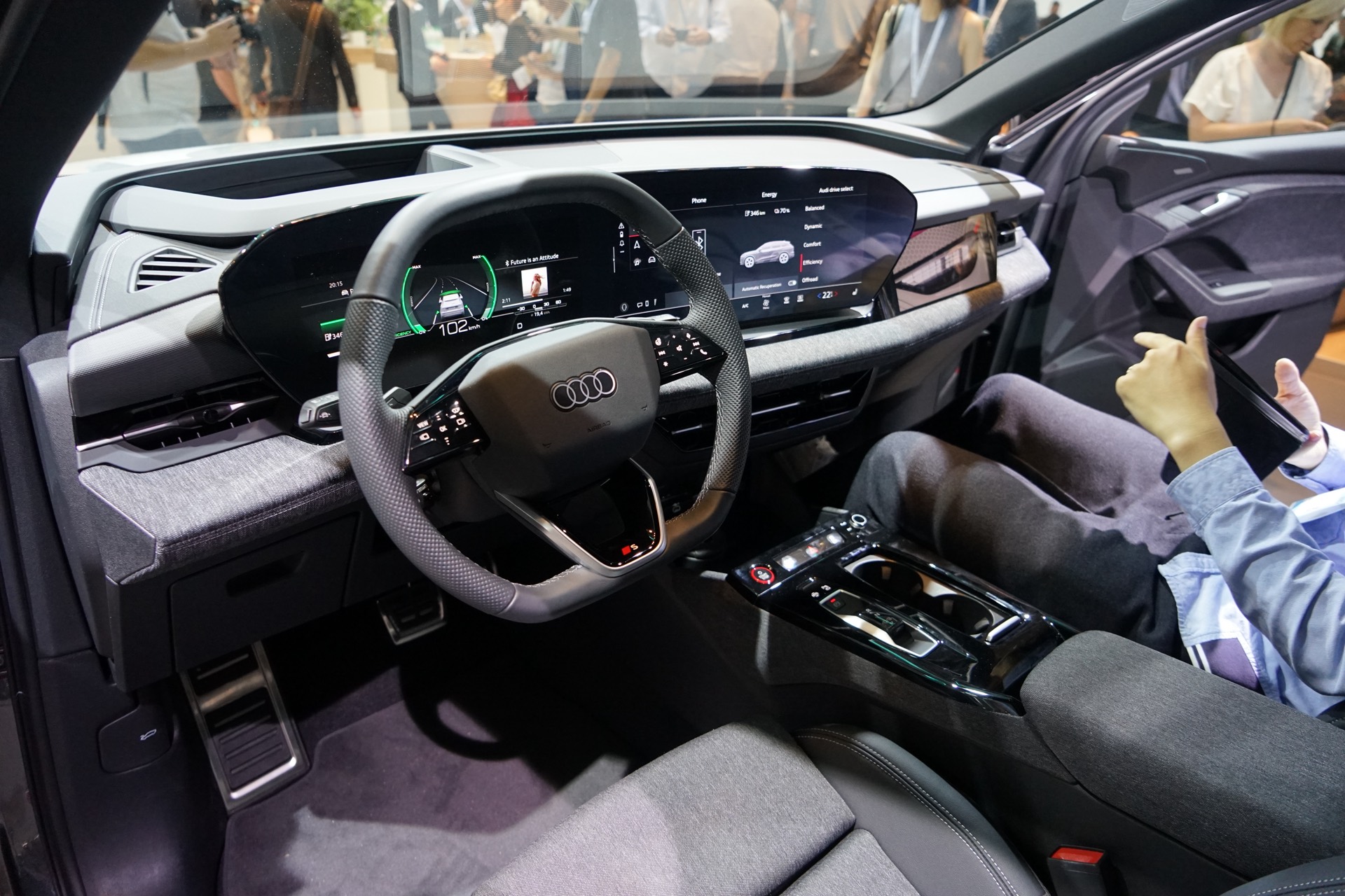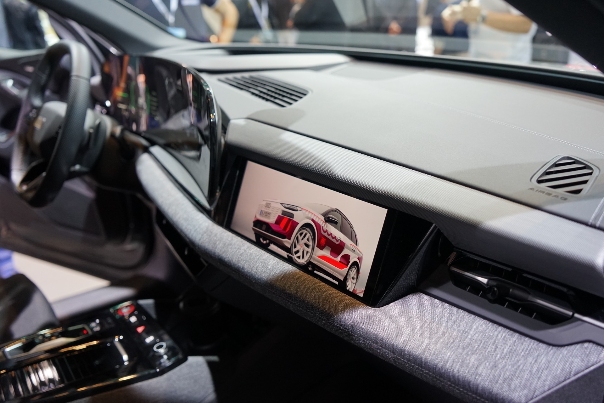 Konventionelle Knöpfe und Schalter finden sich am Armaturenbrett kaum, der Fokus der Bedienung liegt ganz klar auf Touchscreen und Sprachsteuerung. Wer klassische Knöpfe sucht, wird vor allem auf dem Mitteltunnel fündig: Neben Start-Stopp-Knopf und einer Auswahl für die Fahrstufe finden sich hier auch ein Lautstärkeregler für das Radio sowie zwei Cupholder, einen MMI-Controller als alternative Eingabemethode sucht man allerdings vergebens. "