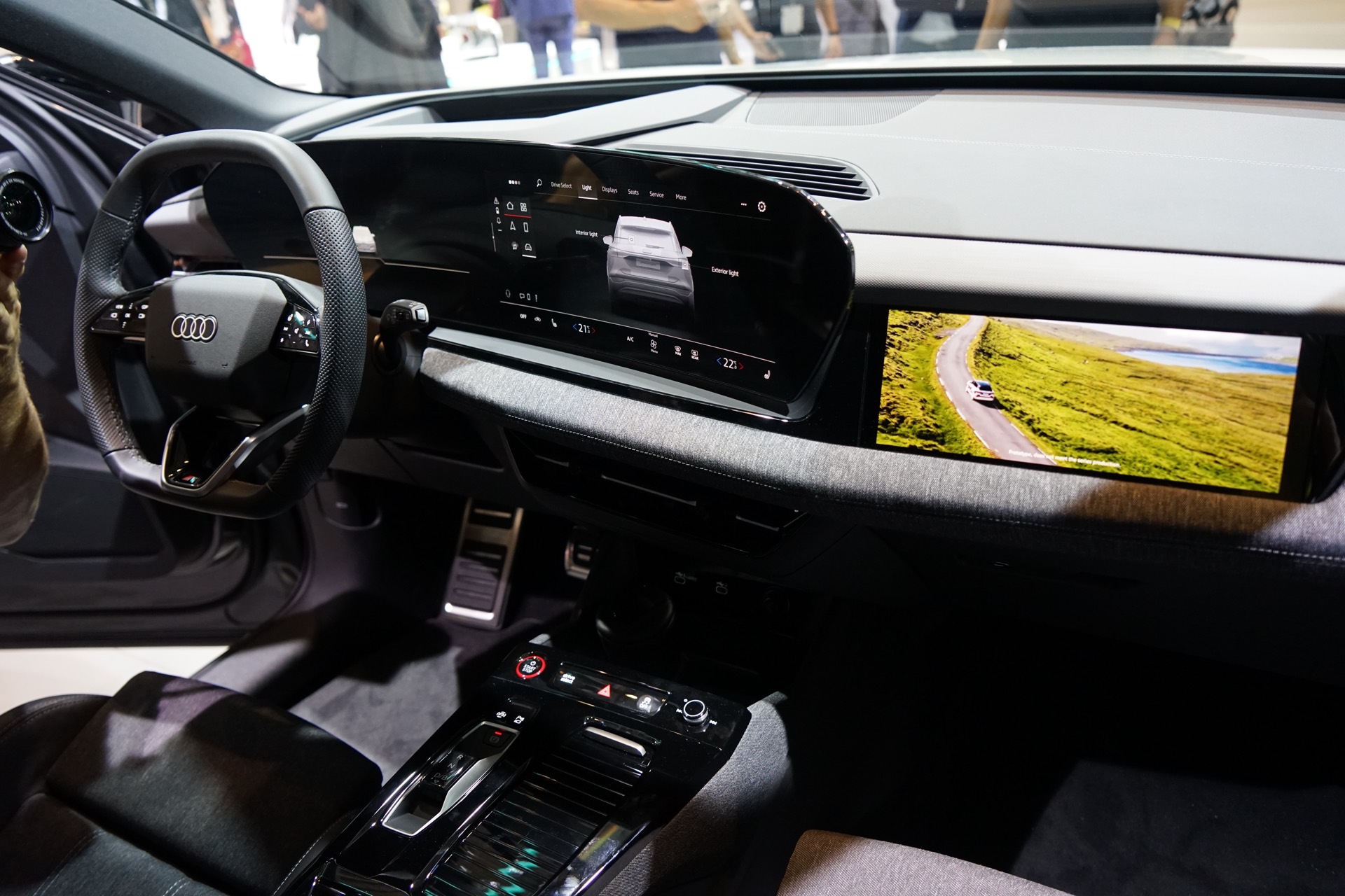 Dass sich der Audi Q6 e-tron die Split-Headlights mit der Luxusklasse von BMW teilen würde, war bereits seit längerem klar. Auf der IAA 2023 enthüllen die Ingolstädter nun, dass ihr kommender iX3-Rivale auch ein Curved-Display erhalten wird. Rechts vom geschwungenen Display-Verbund für Instrumenten- und Infotainment-Anzeigen platziert Audi allerdings noch ein weiteres Display, das ausschließlich zur Unterhaltung des Beifahrers dienen soll und für den Fahrer vom Curved-Display verdeckt wird. Ergänzt wird dieses Display-Trio im oberen Bereich der Armaturentafel von einem Head-up-Display, das die Realität für den Fahrer auf riesigen 88 Zoll theoretischer Diagonale mit Informationen anreichern soll.