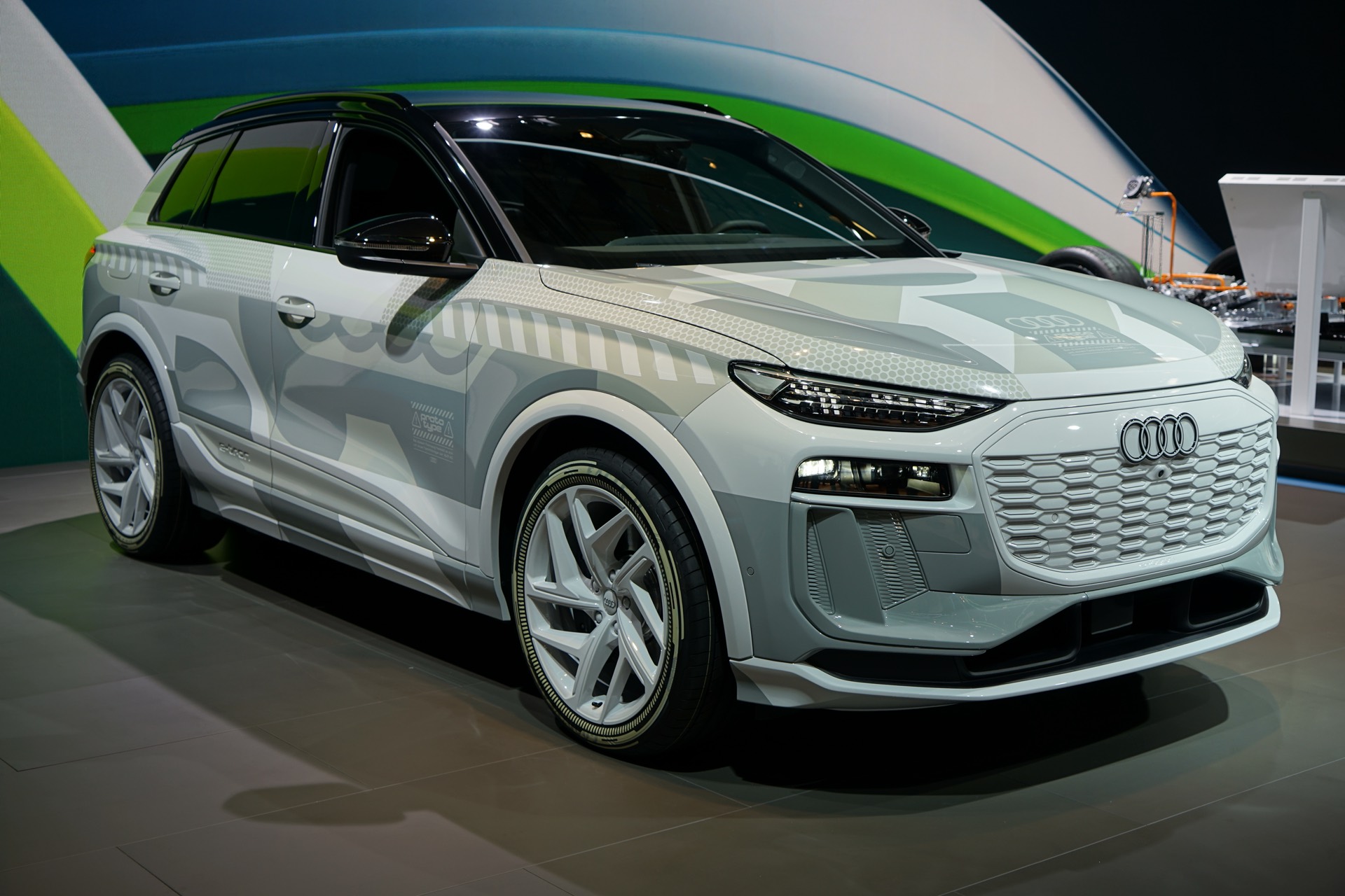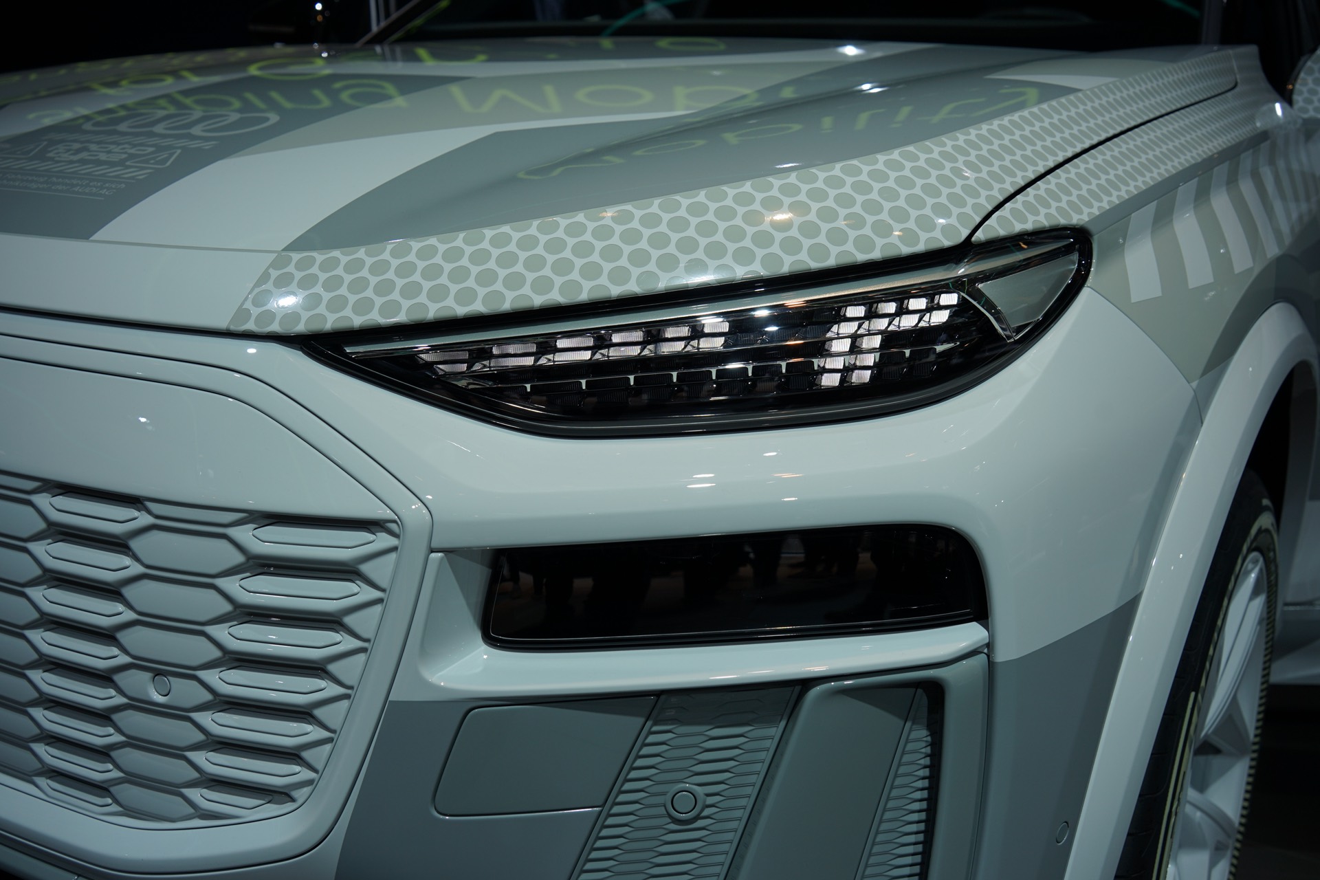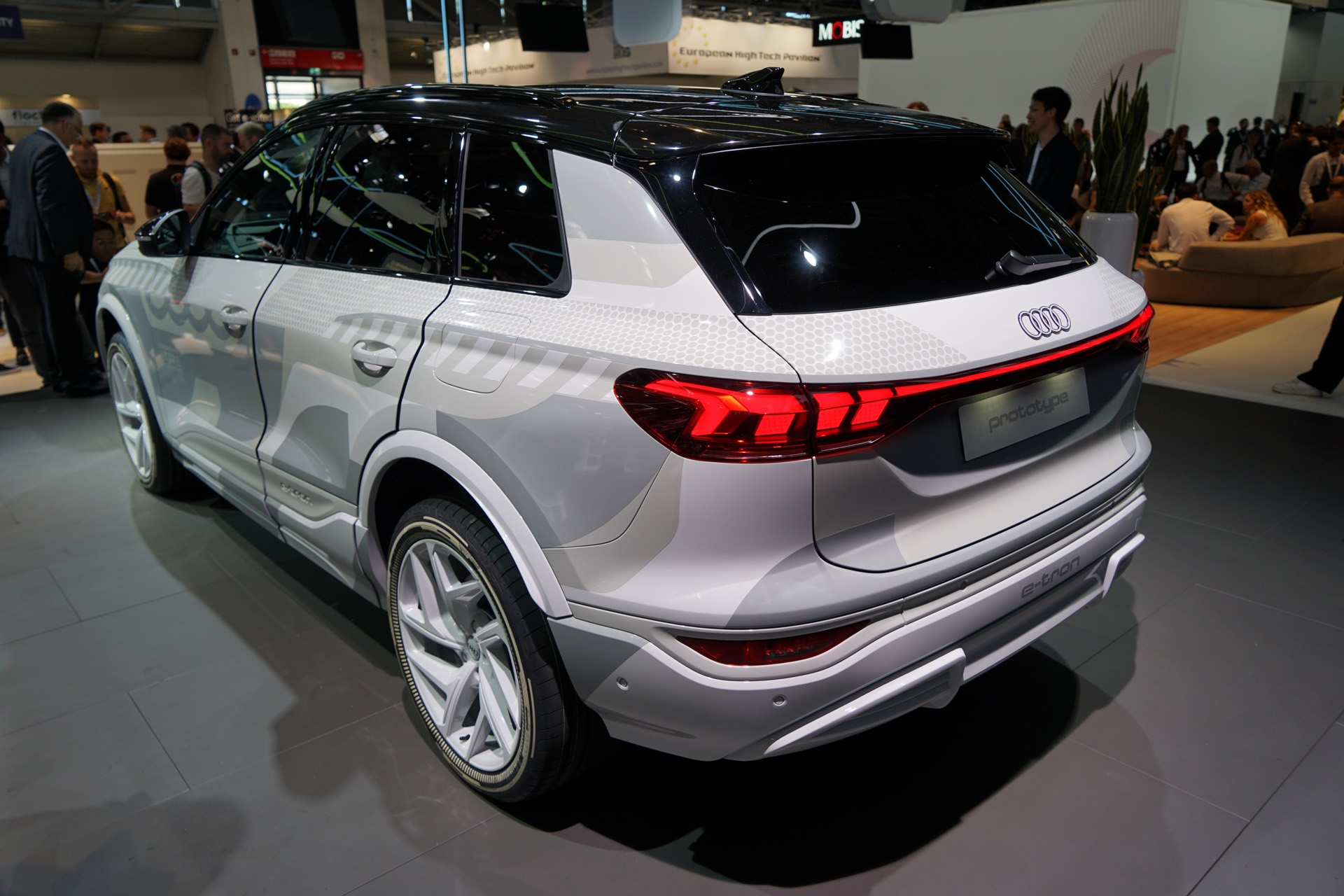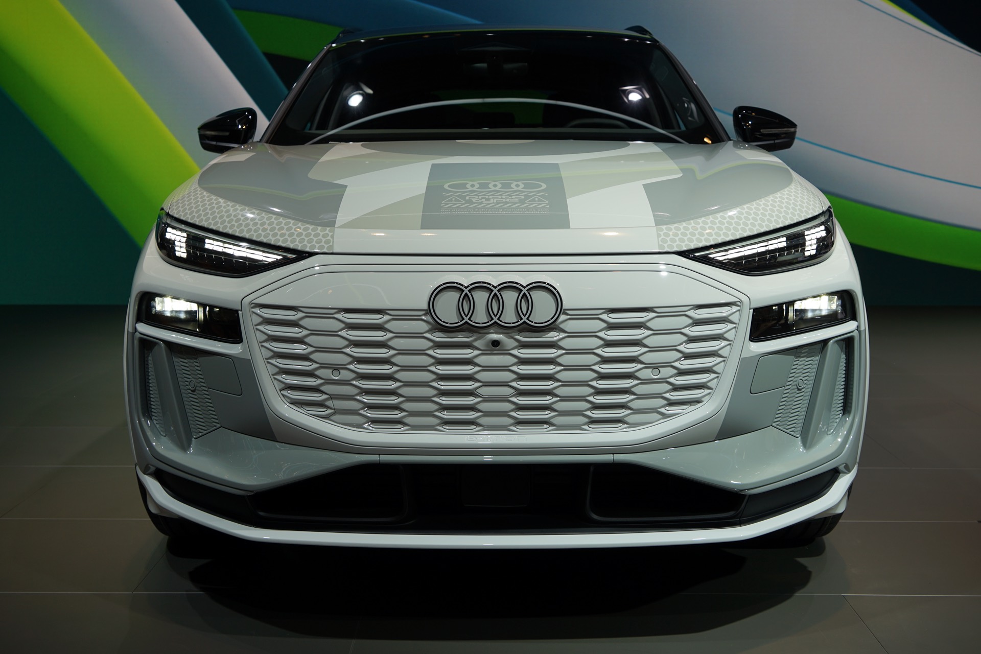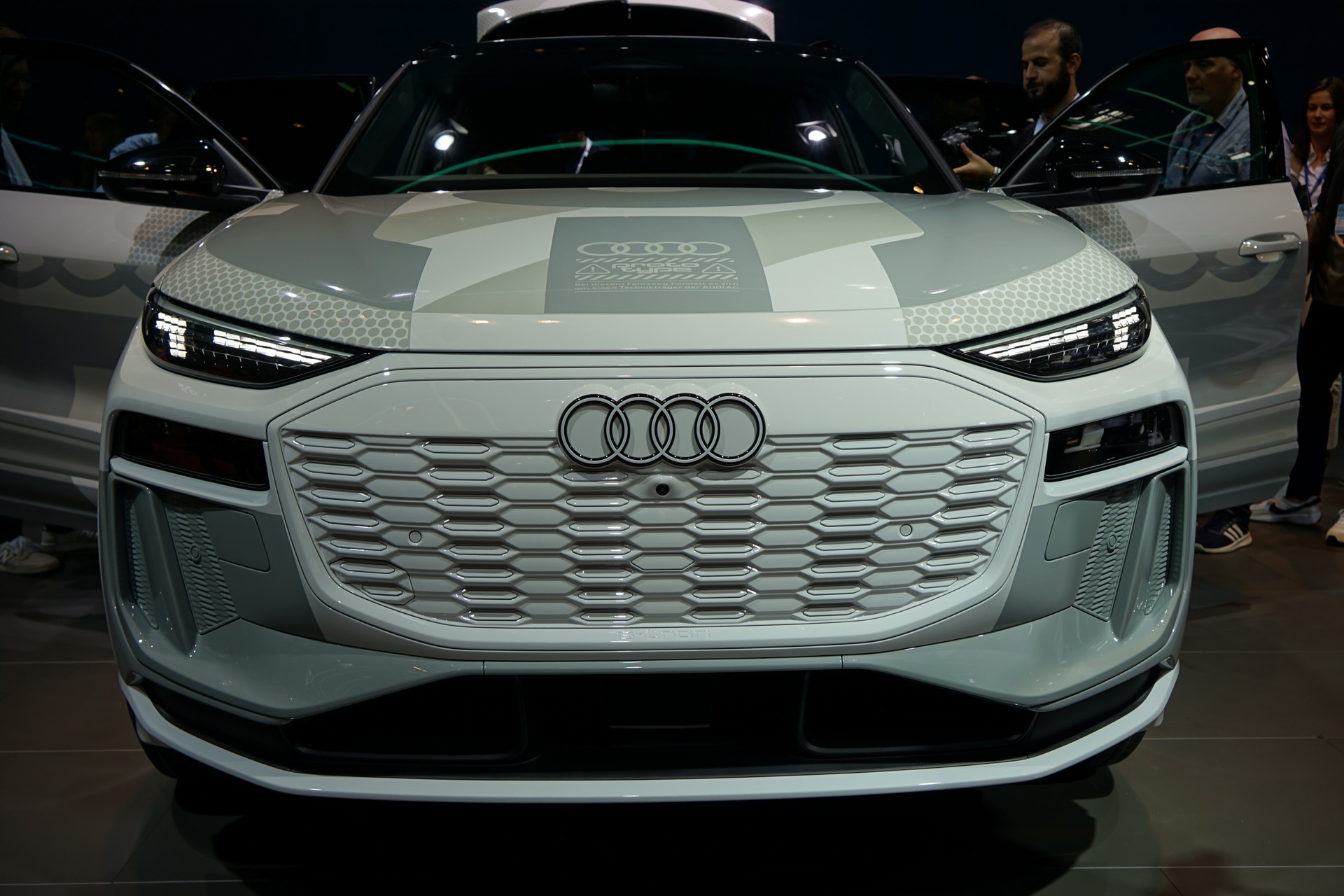 Rein äußerlich bleibt der Audi Q6 e-tron auf der IAA 2023 noch leicht getarnt, einige Details des Exterieur-Designs lassen sich aber dennoch gut erkennen. Hierzu zählen die schon erwähnten Frontscheinwerfer mit horizontaler Teilung, der große Kühlergrill und auch die bereits vollständig enttarnten Heckleuchten mit einem durchgehenden roten Leuchtenband am Heck.