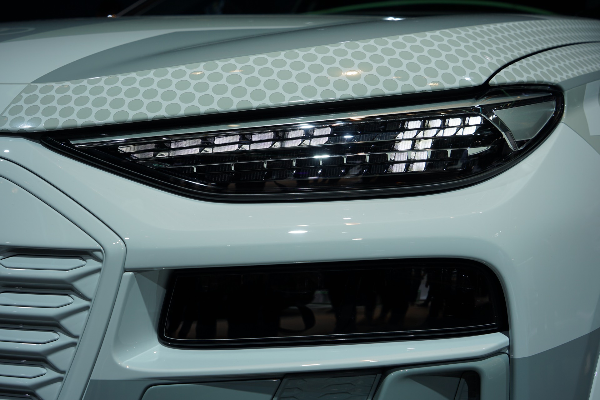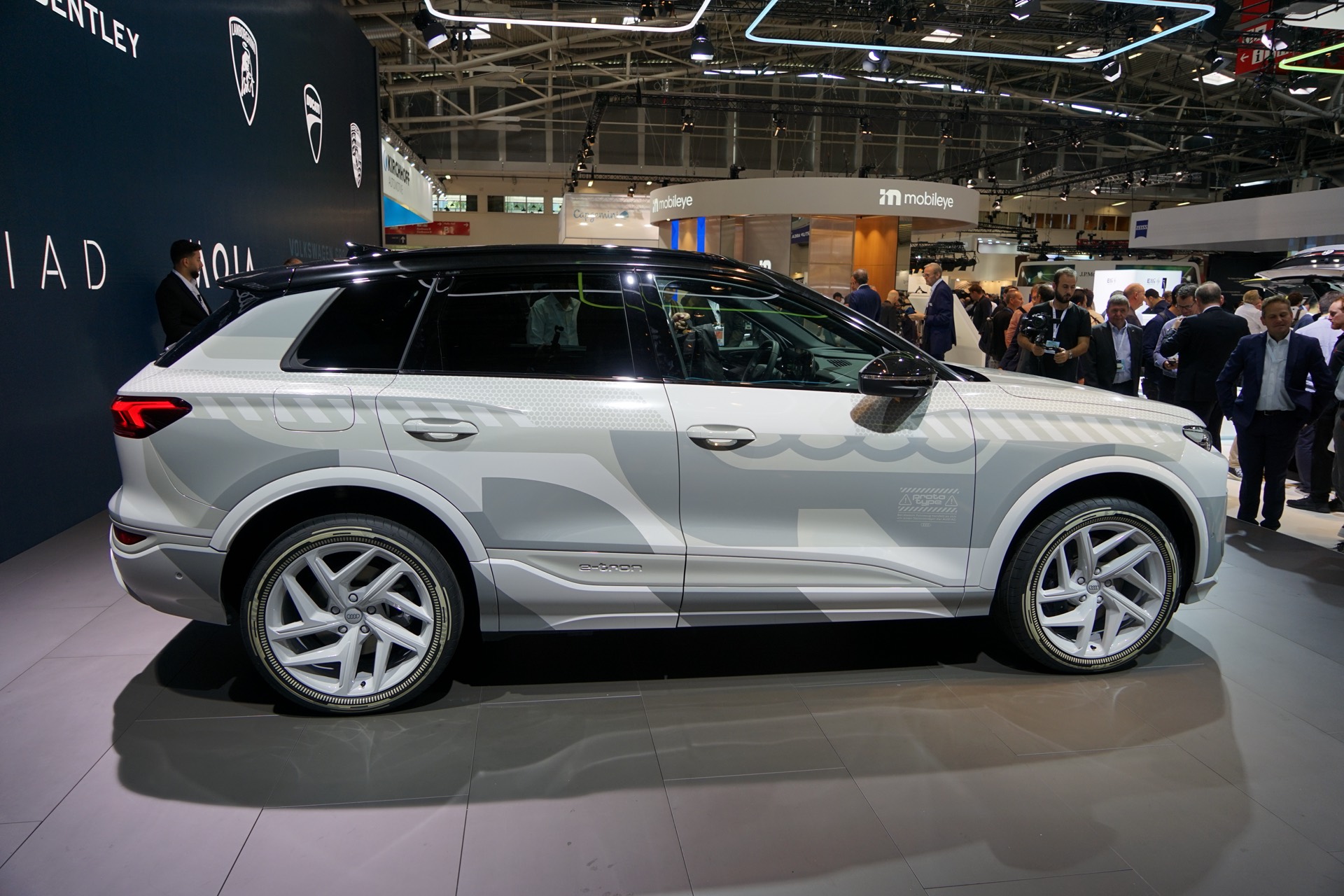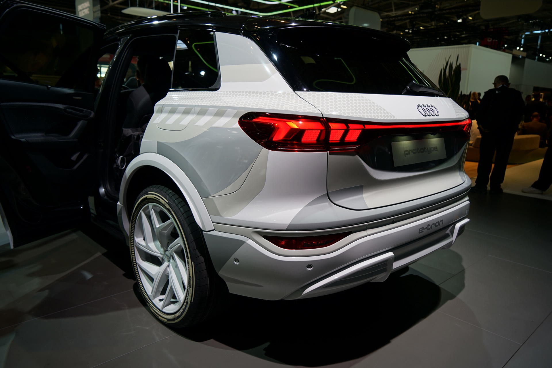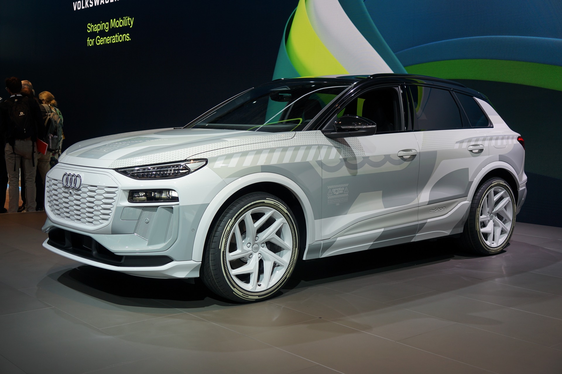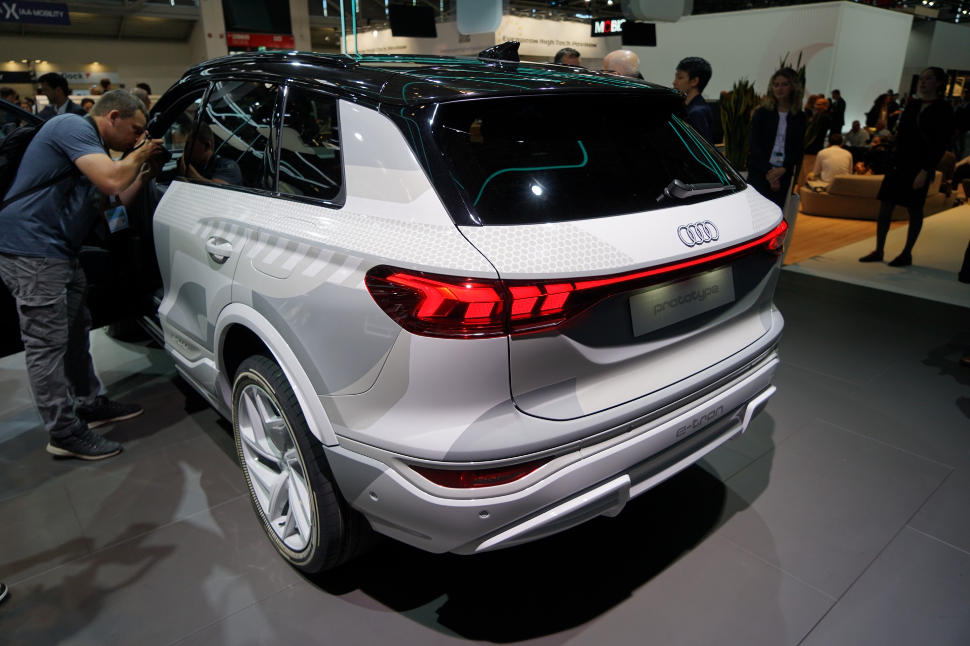 Rein äußerlich bleibt der Audi Q6 e-tron auf der IAA 2023 noch leicht getarnt, einige Details des Exterieur-Designs lassen sich aber dennoch gut erkennen. Hierzu zählen die schon erwähnten Frontscheinwerfer mit horizontaler Teilung, der große Kühlergrill und auch die bereits vollständig enttarnten Heckleuchten mit einem durchgehenden roten Leuchtenband am Heck.