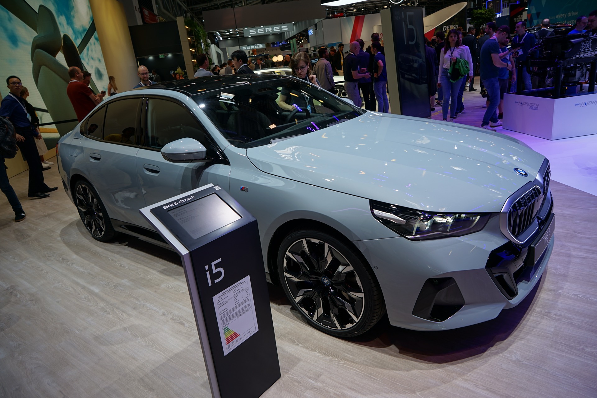 Da es sich bei einem Großteil der diesjährigen IAA-Neuheiten um Studien und Showcars handelt, zählt der neue BMW i5 zu den wichtigsten Serienfahrzeugen der Messe: Der Elektro-5er kommt noch in diesem Herbst in den Handel, konkret sollen die ersten Kunden ihre Fahrzeuge im Oktober 2023 erhalten. Zum Heimspiel auf der IAA 2023 präsentieren die Münchner den neuen BMW i5 eDrive40 mit M Sport-Paket und Lackierung in Brooklyn Grey – ein Paket, das optisch und technisch wohldosierte Dynamik bietet und gleichzeitig einen realistischen Eindruck vom regulären 5er (G60) vermittelt, denn auch die Varianten mit Verbrennungsmotor sehen praktisch identisch aus.