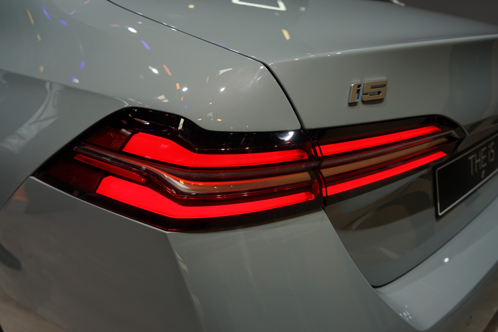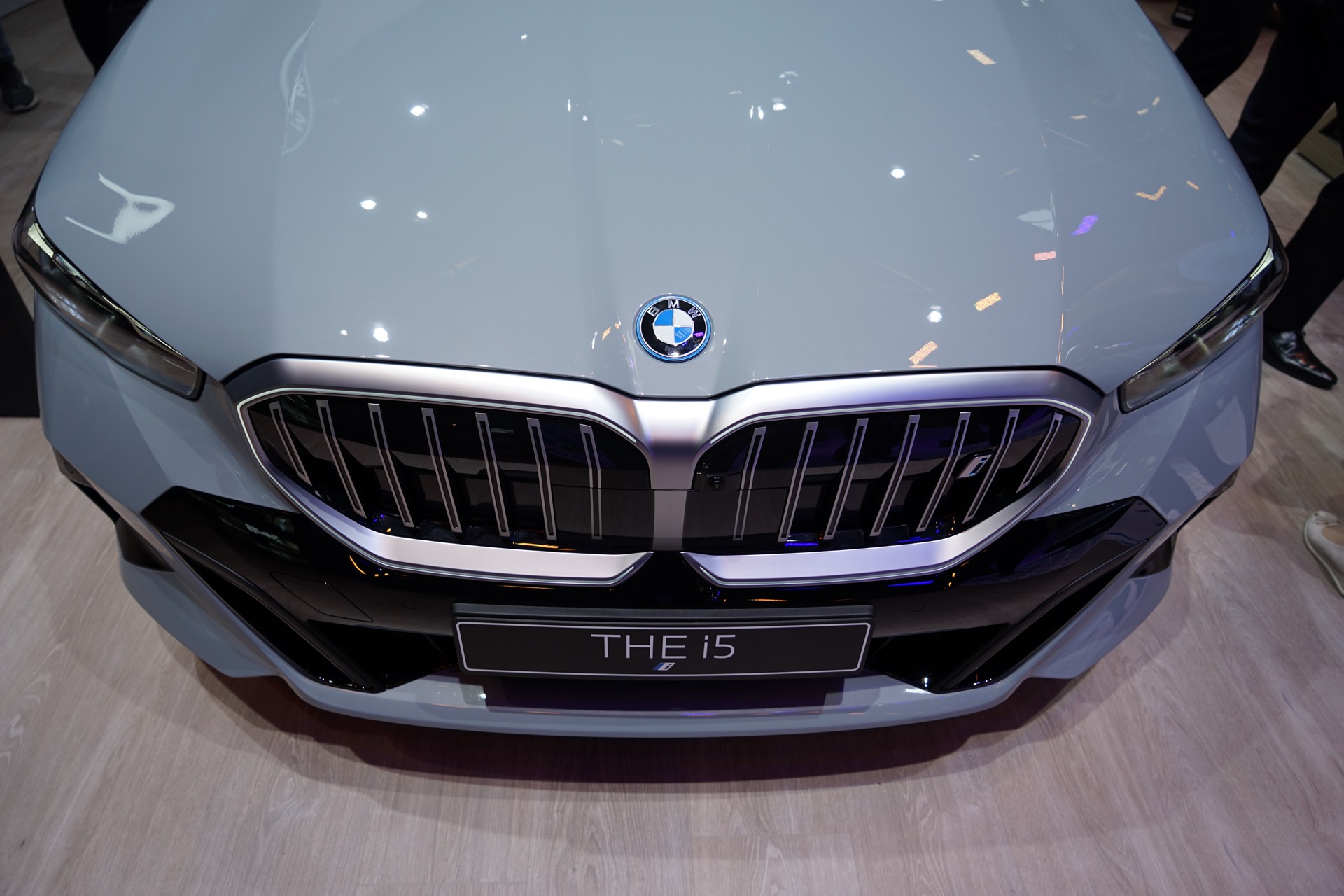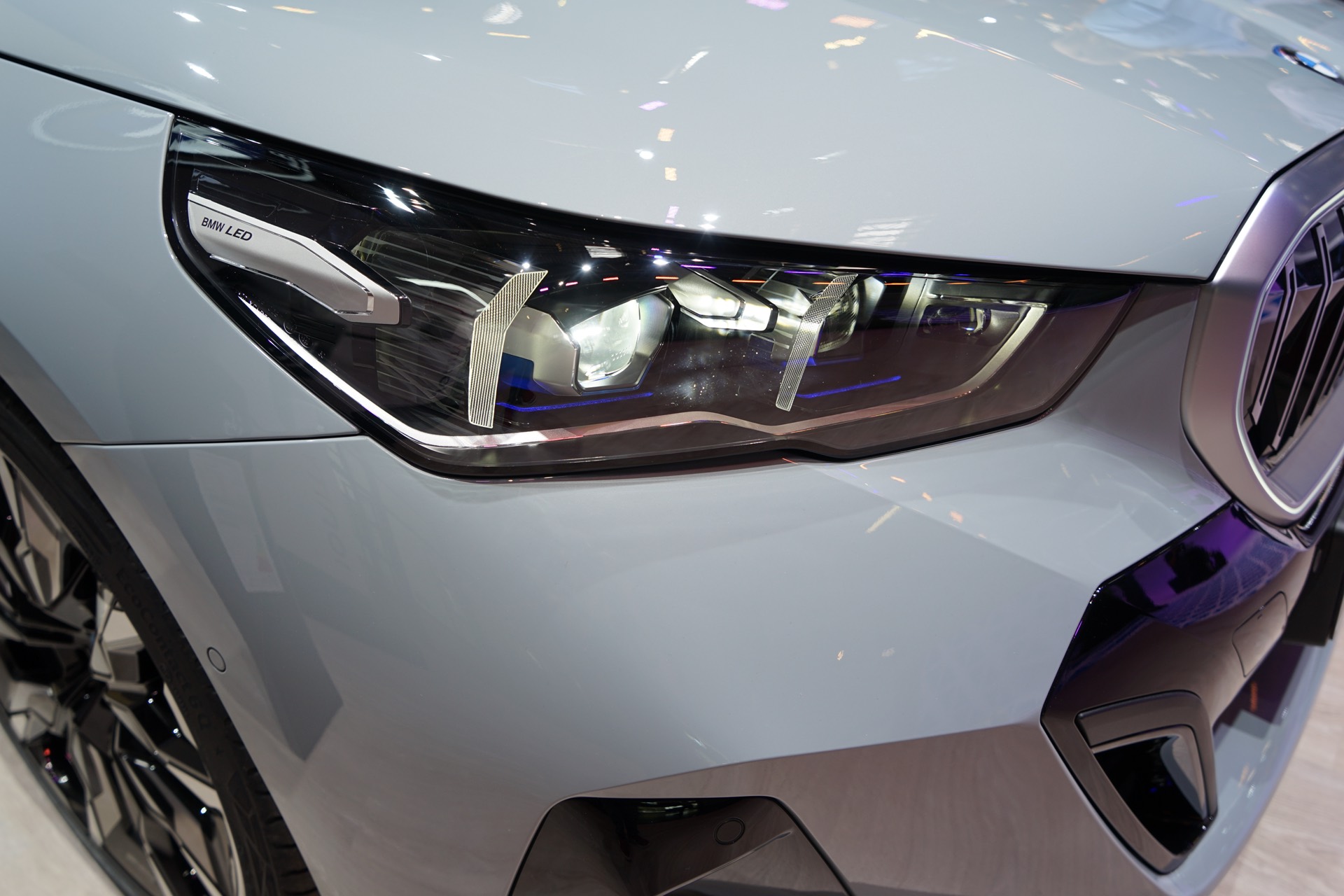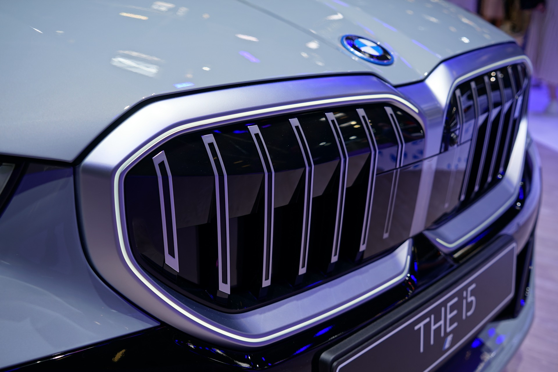 An der Front trägt der gezeigte BMW i5 eine praktisch vollständig geschlossene Niere, die aber dank ihrer Gestaltung mit angedeuteten Streben sehr klassisch wirkt. Dass die Nieren-Einfassung über ein dünnes LED-Band verfügt und damit für eine markante Nacht-Optik sorgen kann, sieht man in hellerer Umgebung kaum. Dank des M Sport-Pakets wird der Bereich unterhalb der Niere von großen schwarzen Flächen dominiert, die zu Teil geschlossen sind und zum Teil als Lufteinlass für die Kühlung diverser Komponenten dienen. Am äußersten Rand der Frontschürze finden sich außerdem die Öffnungen für die Air Curtains, die eine aerodynamisch optimale Umströmung der Vorderräder sicherstellen sollen.