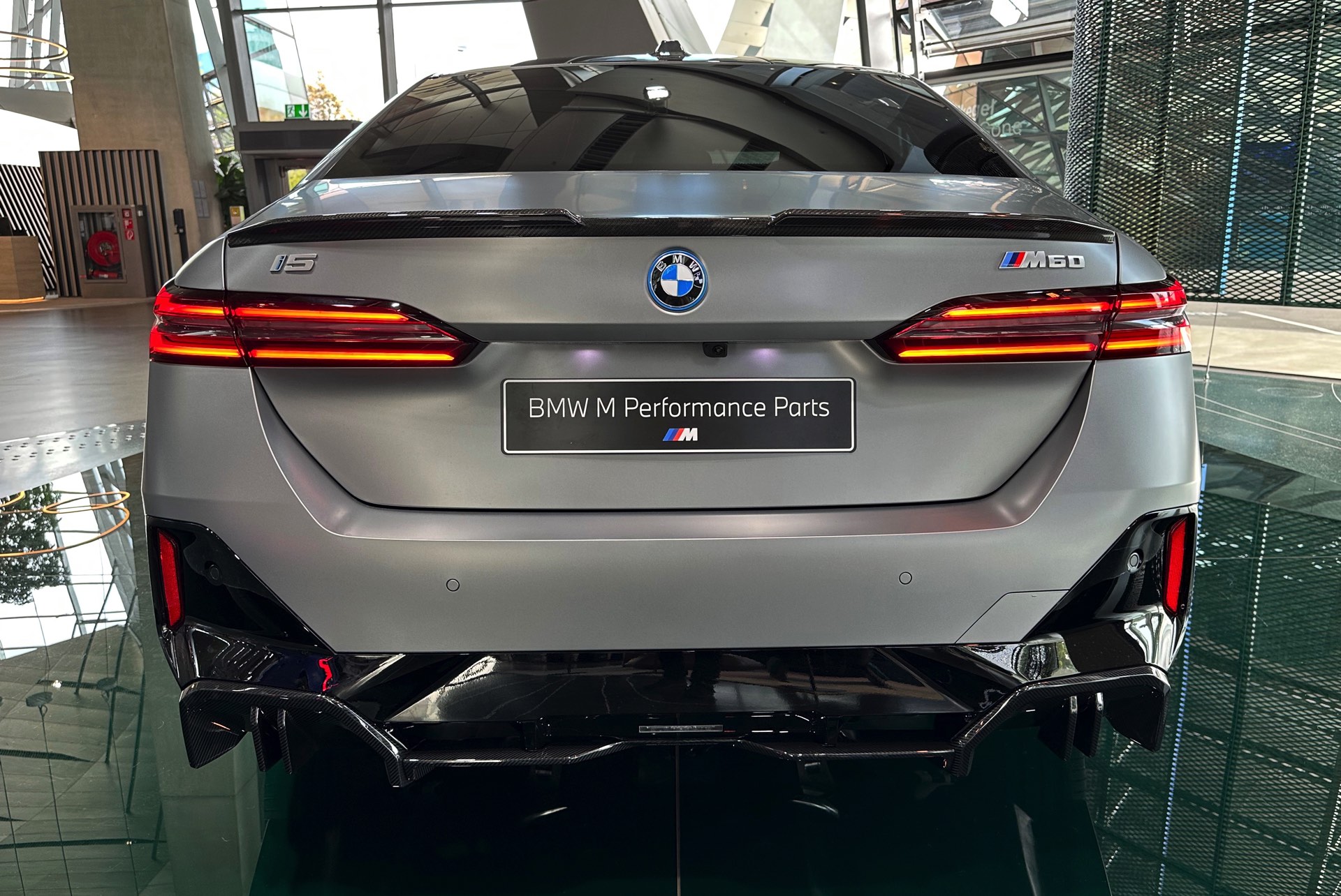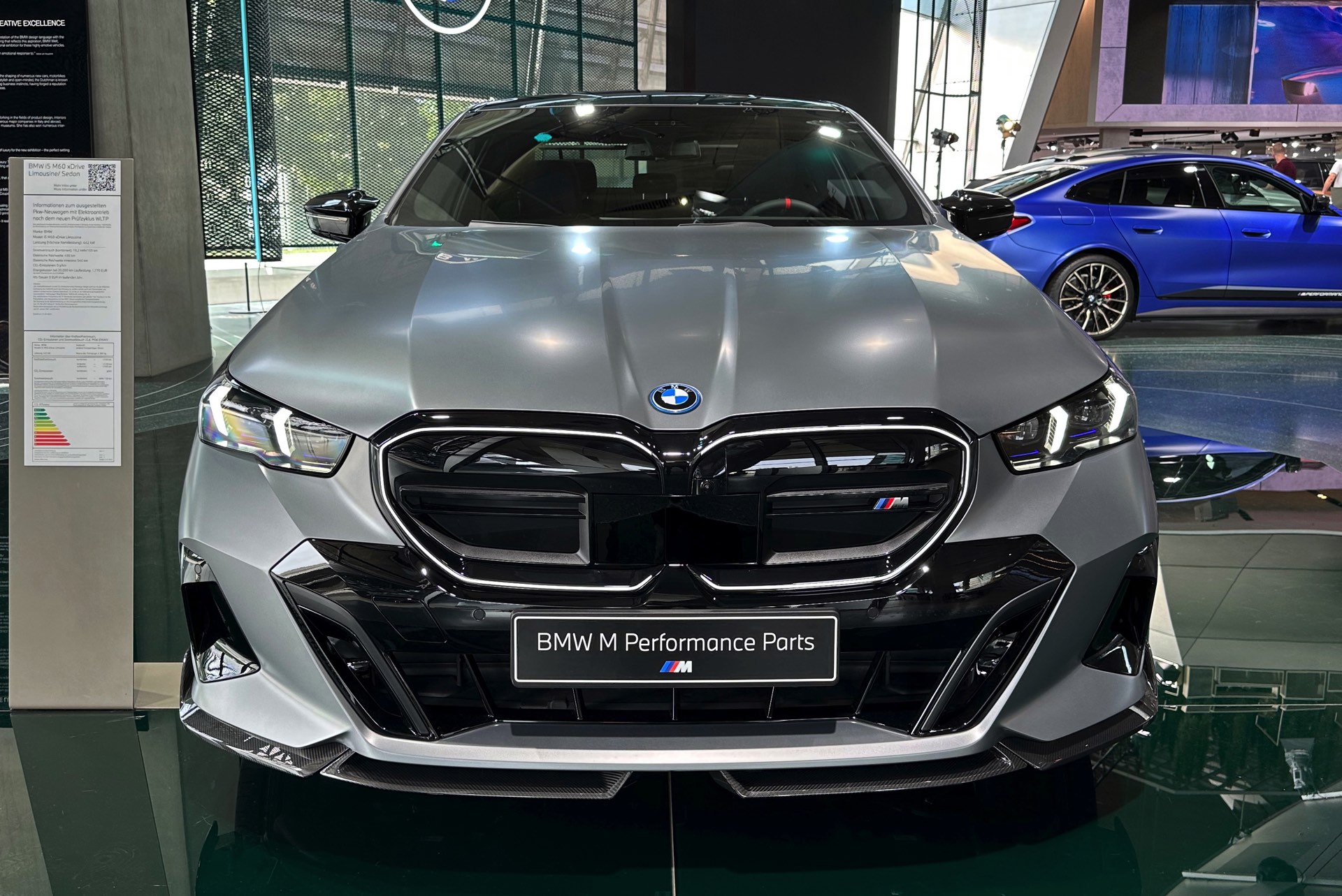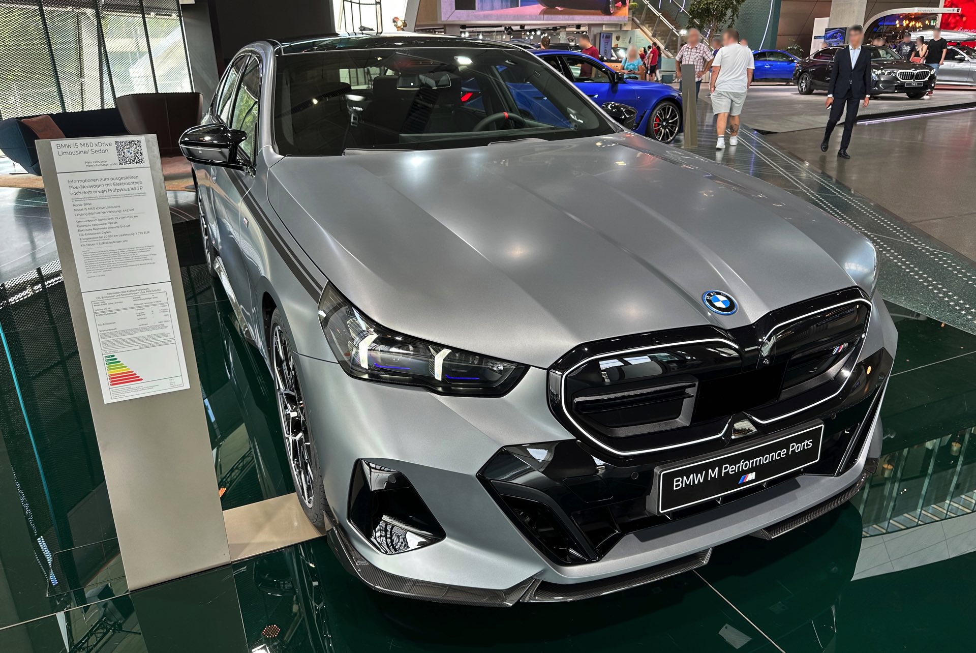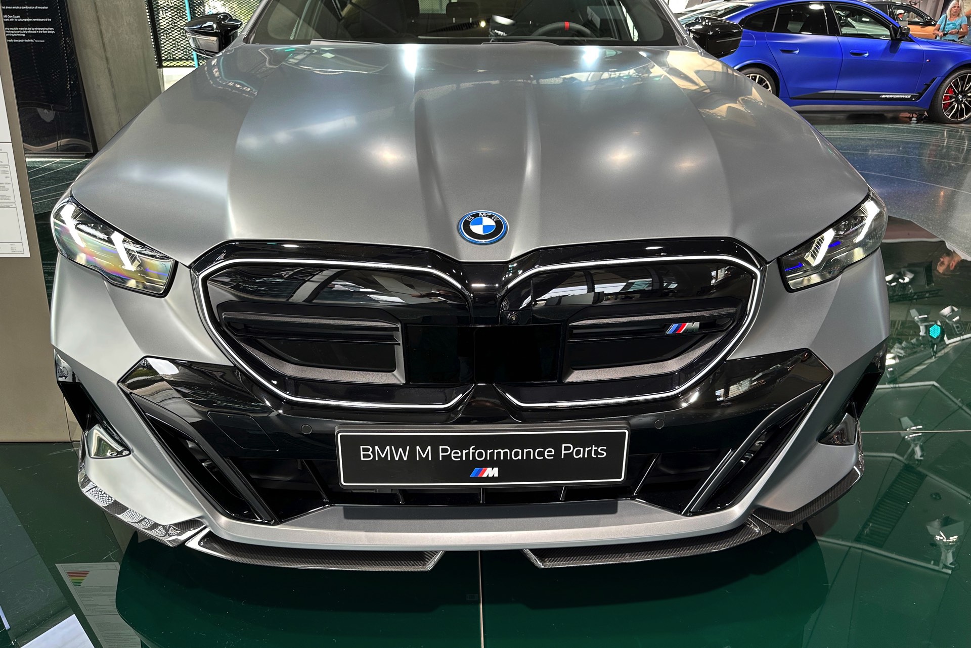 Der 81,2 kWh große Akku des BMW i5 M60 genügt für 455 bis 516 Kilometer Elektro-Reichweite gemäß WLTP, die gezeigte Konfiguration bewegt sich dabei mit Sicherheit im untersten Bereich dieser Angabe. Klar ist auch, dass die nachträglich installierten Carbon-Teile aus dem M Performance-Programm den ohnehin schon sechsstelligen Preis weiter in die Höhe treiben: Schon der Grundpreis liegt bei 99.500 Euro, sodass schon die 3.750 Euro teure Lackierung in Frozen Pure Grey für den Schritt in den sechsstelligen Bereich genügt. Was die Kunden dafür bekommen, zeigen unsere Fotos aus der BMW Welt: