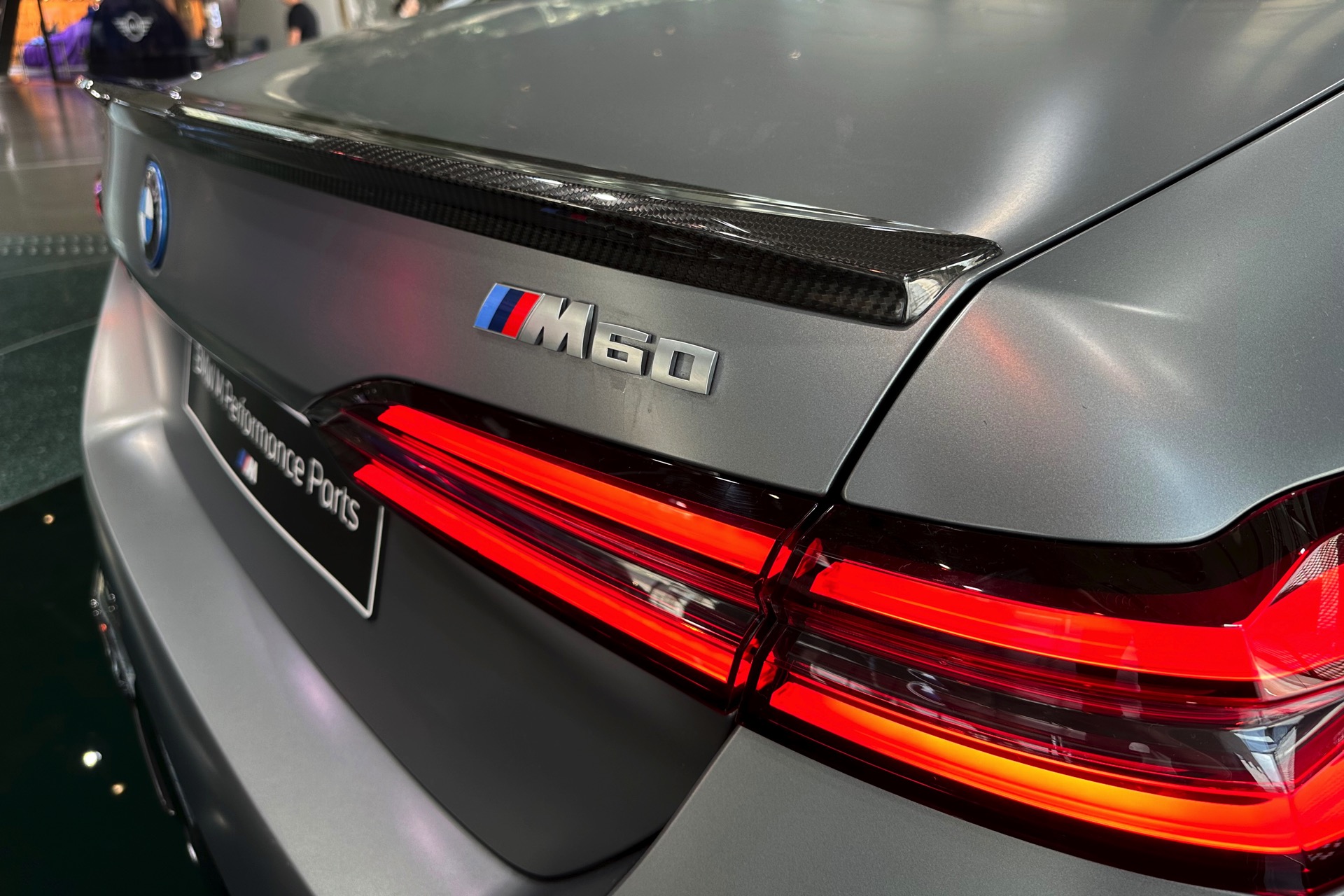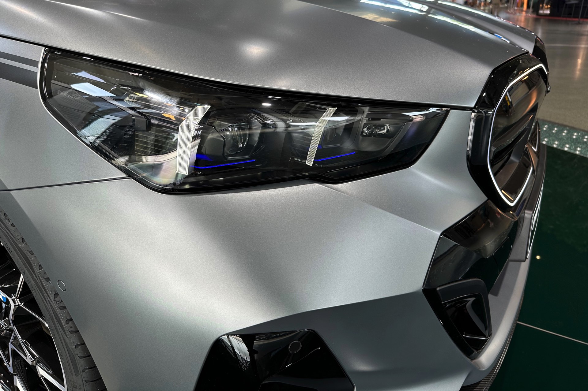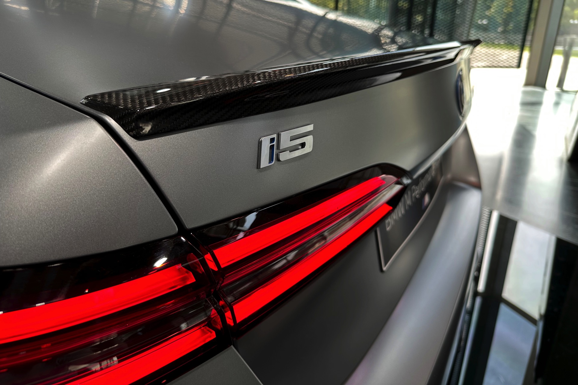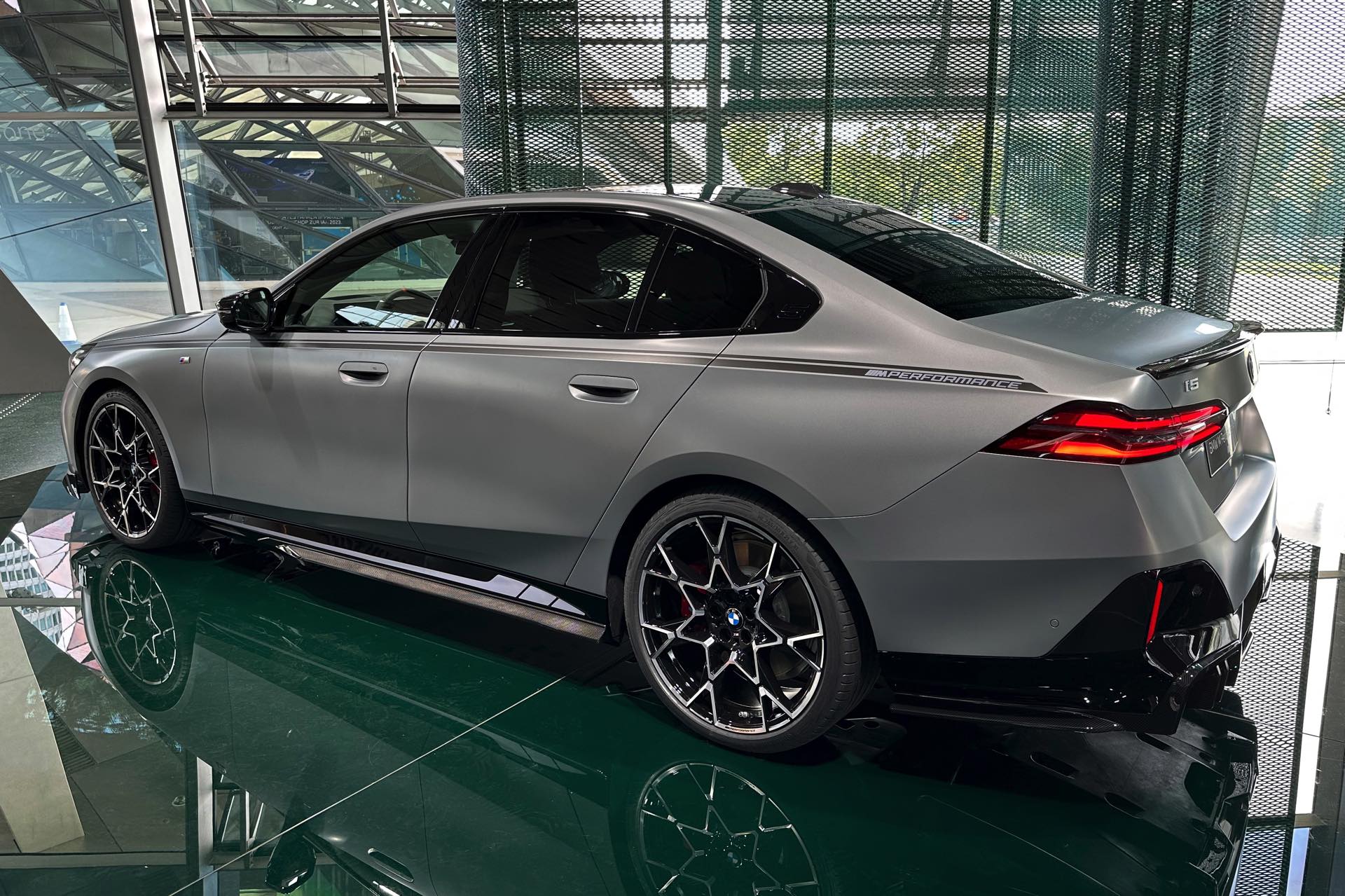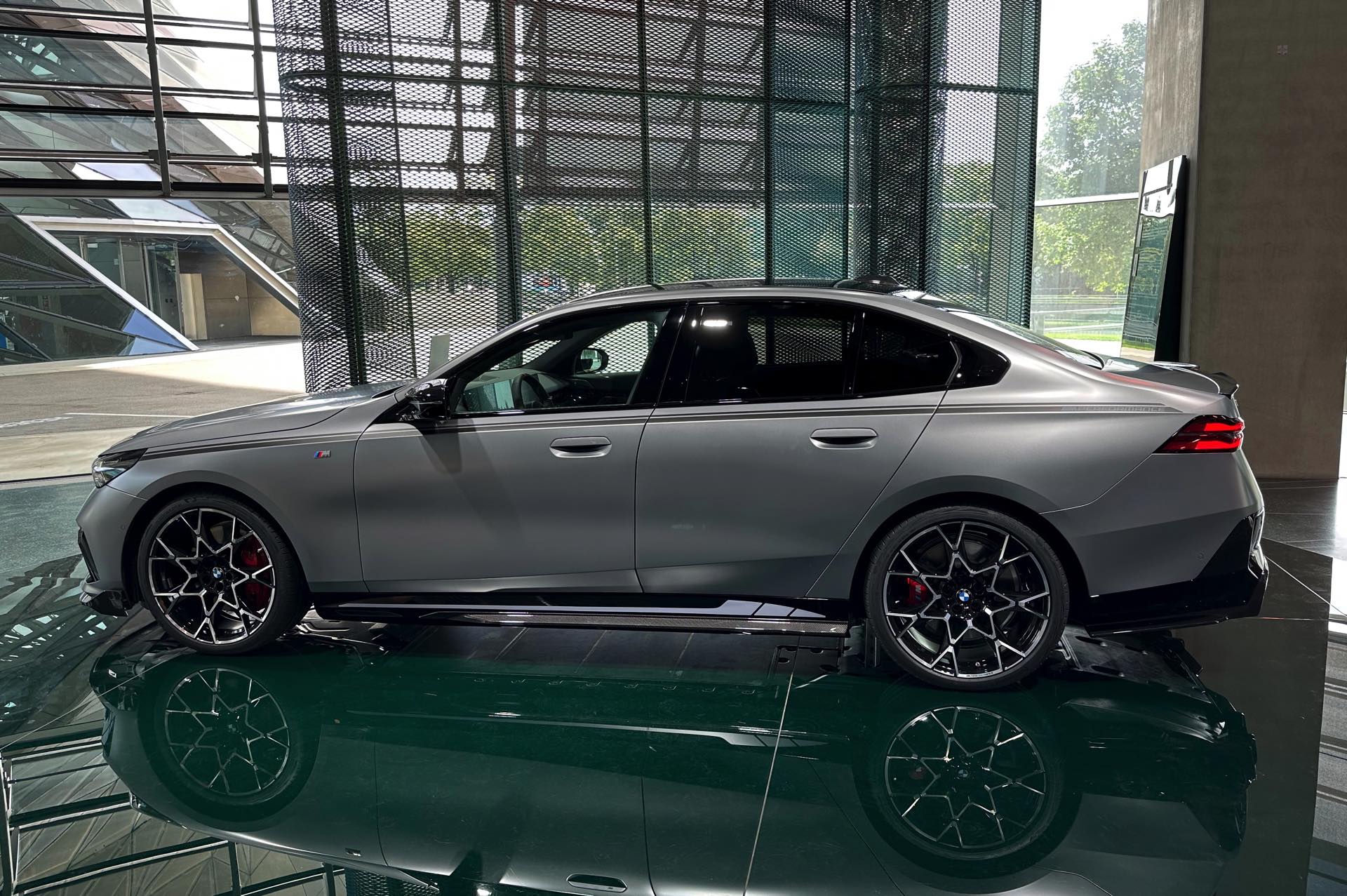 Der 81,2 kWh große Akku des BMW i5 M60 genügt für 455 bis 516 Kilometer Elektro-Reichweite gemäß WLTP, die gezeigte Konfiguration bewegt sich dabei mit Sicherheit im untersten Bereich dieser Angabe. Klar ist auch, dass die nachträglich installierten Carbon-Teile aus dem M Performance-Programm den ohnehin schon sechsstelligen Preis weiter in die Höhe treiben: Schon der Grundpreis liegt bei 99.500 Euro, sodass schon die 3.750 Euro teure Lackierung in Frozen Pure Grey für den Schritt in den sechsstelligen Bereich genügt. Was die Kunden dafür bekommen, zeigen unsere Fotos aus der BMW Welt: